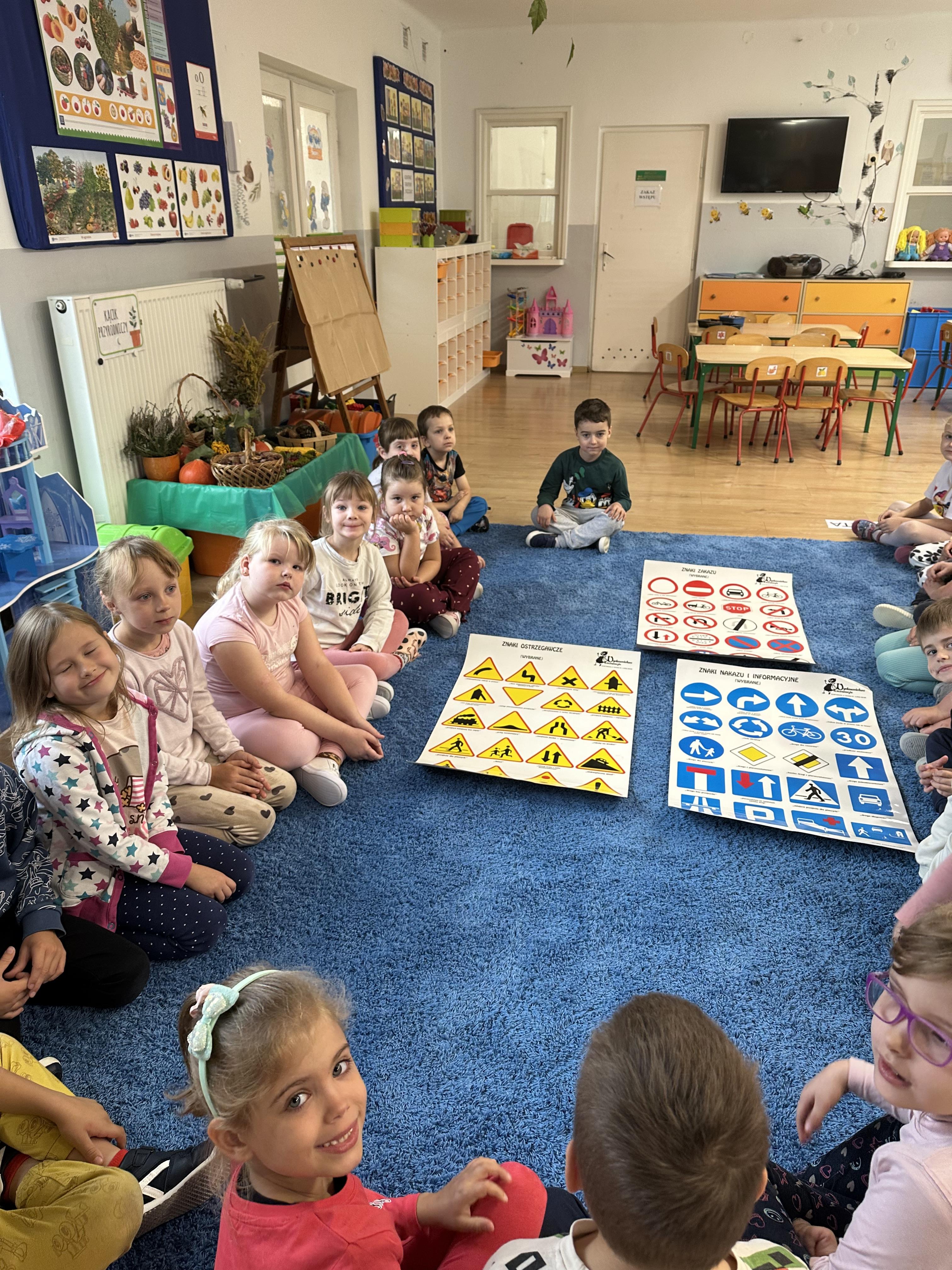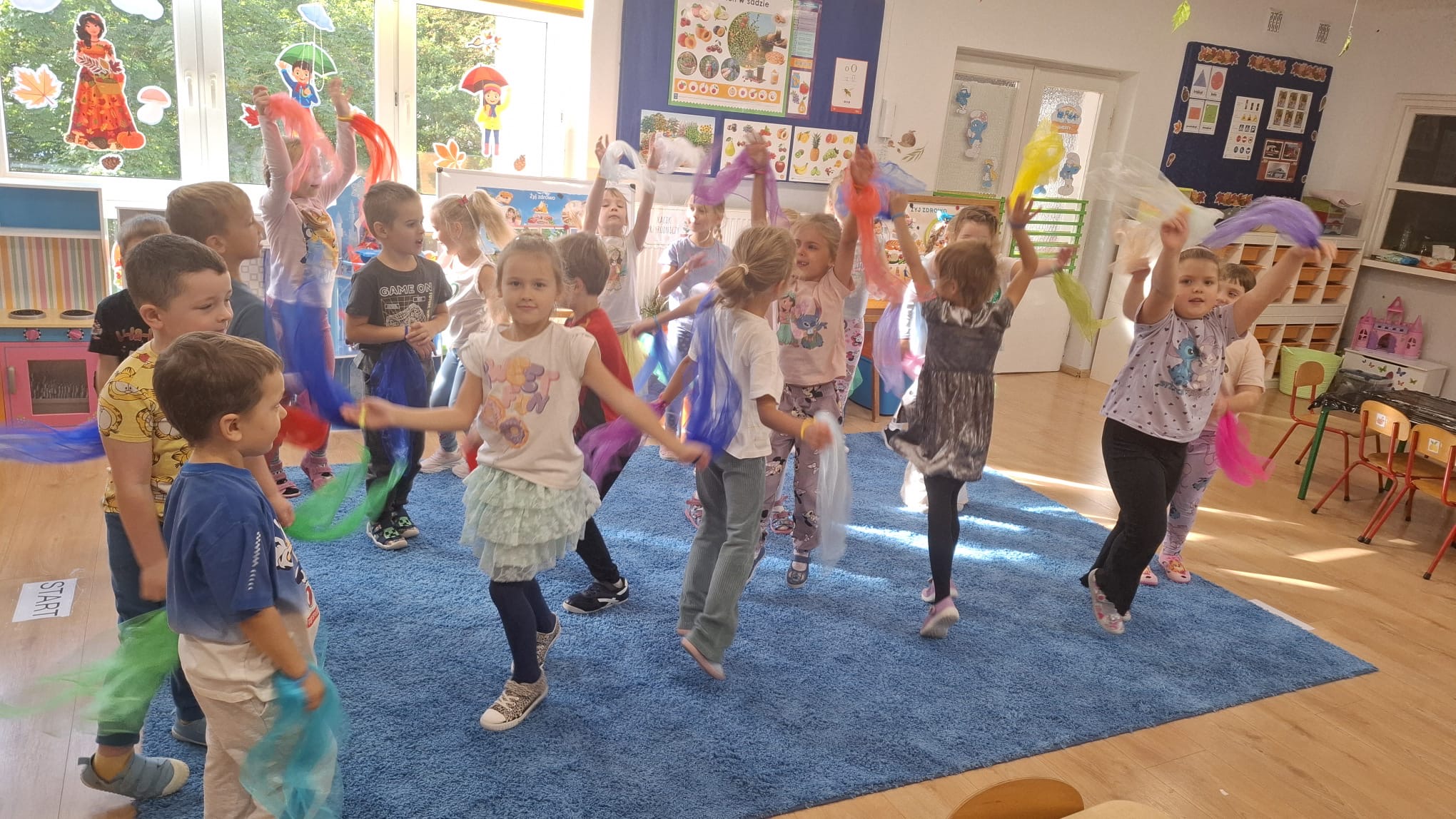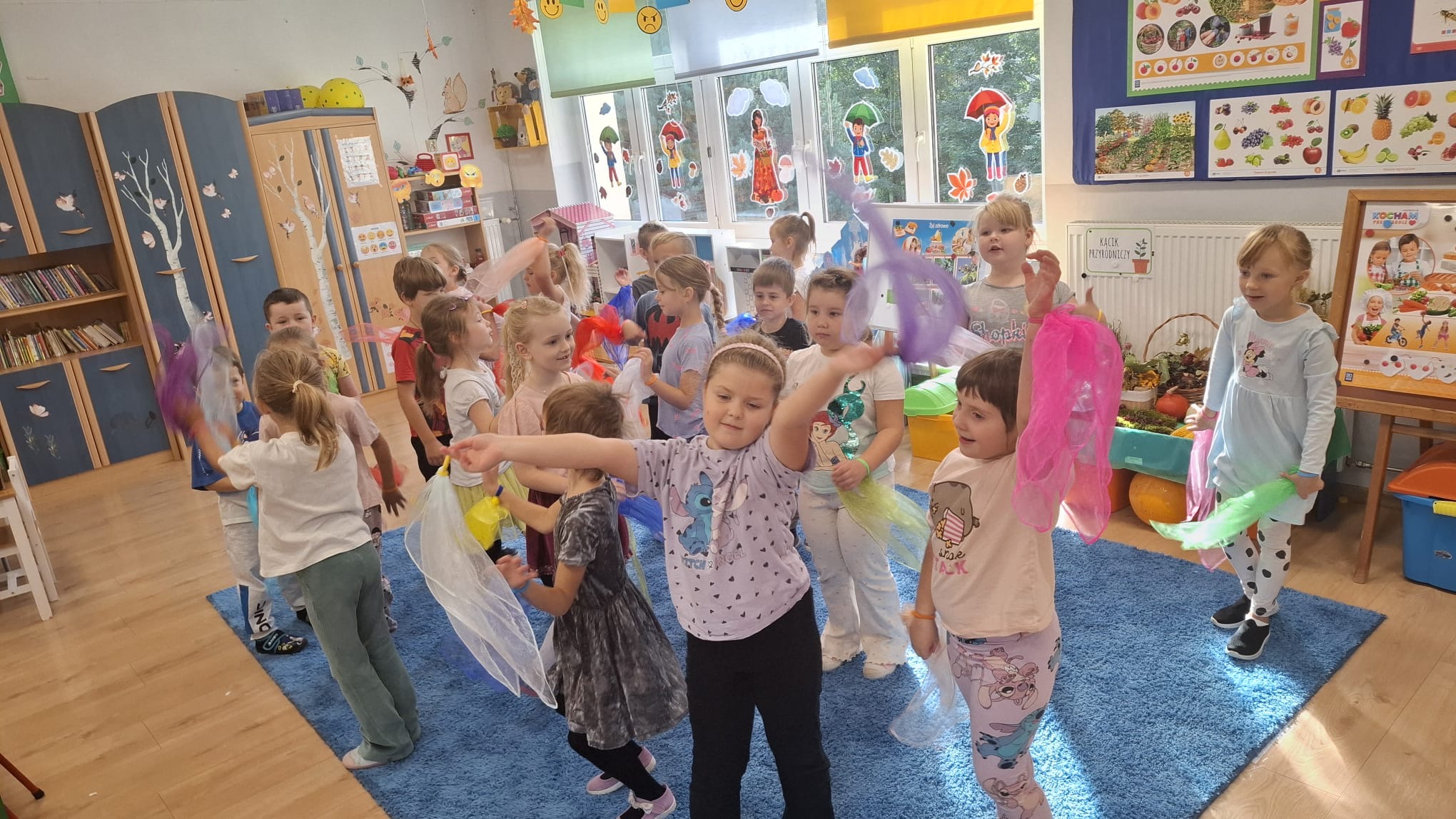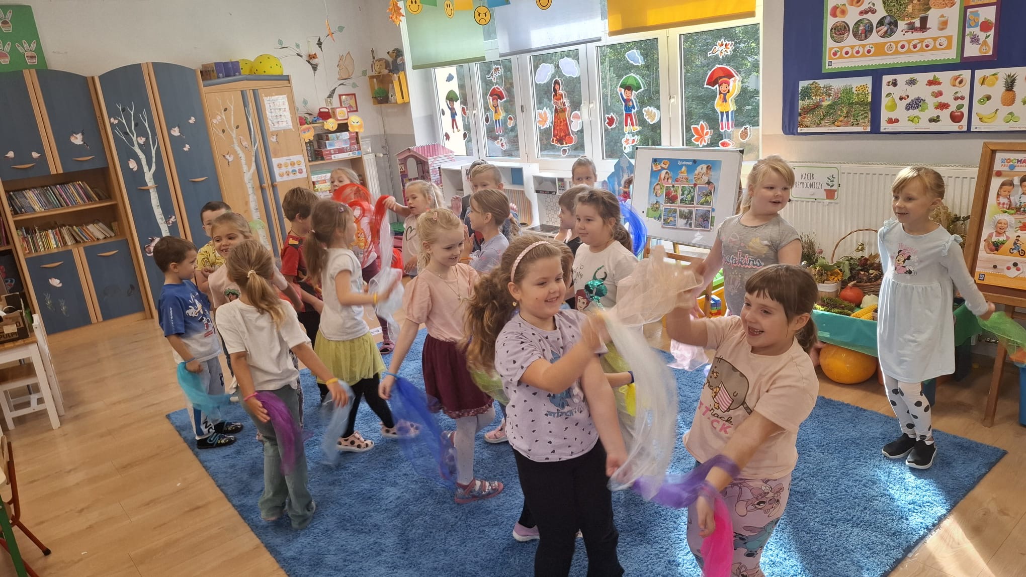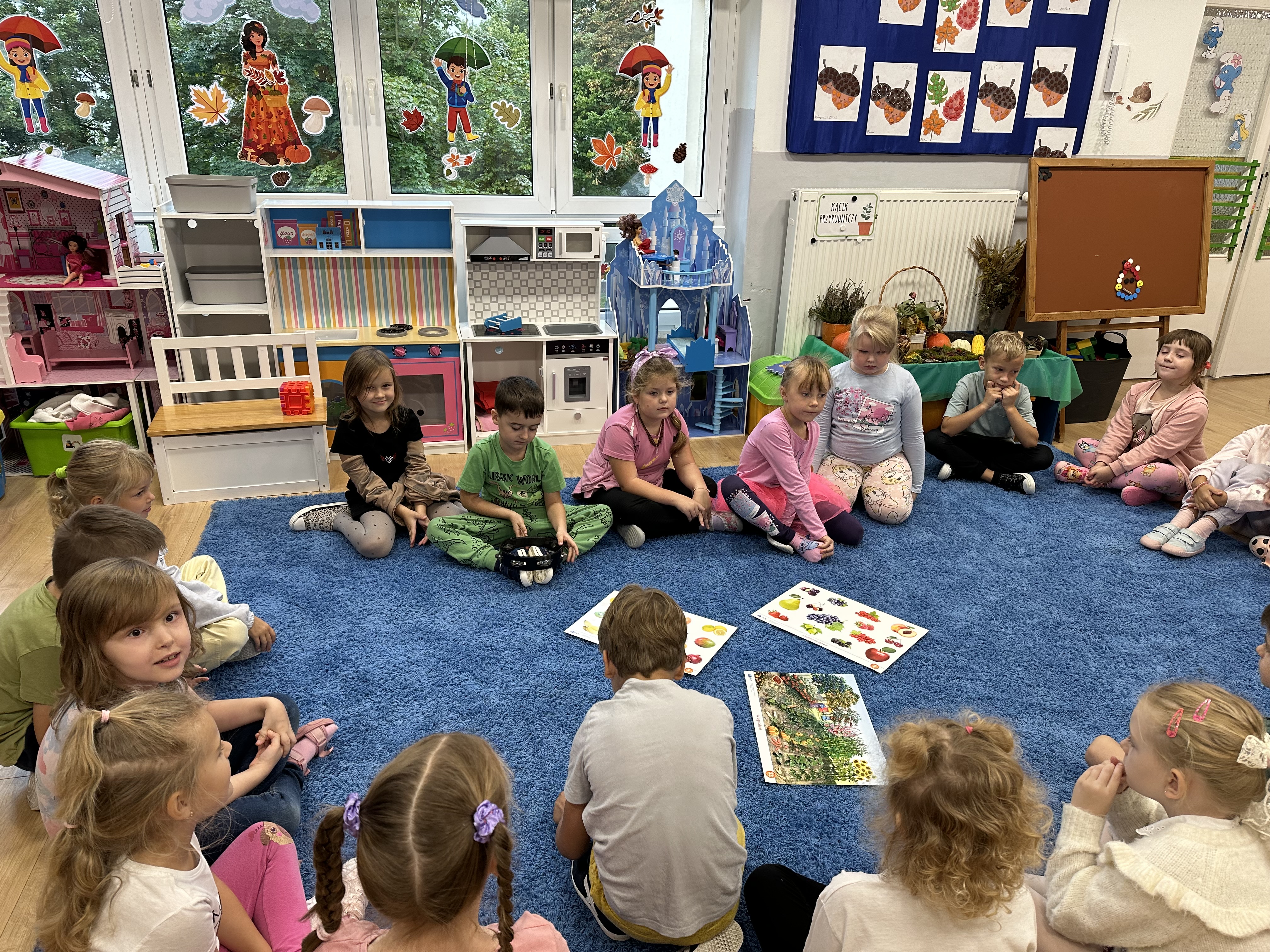 Za nami już czwarty tydzień w przedszkolu. W tym czasie dzieci zwracały szczególną uwagę na zmianę pory roku w złotą jesień, zapoznały się ze znakami drogowymi i ich kształtami oraz poznały nowe słówka w języku angielskim. Codziennie rano przedszkolaki śpiewały piosenkę ,,Jesień w naszej okolicy” i ilustrowały ją ruchem.