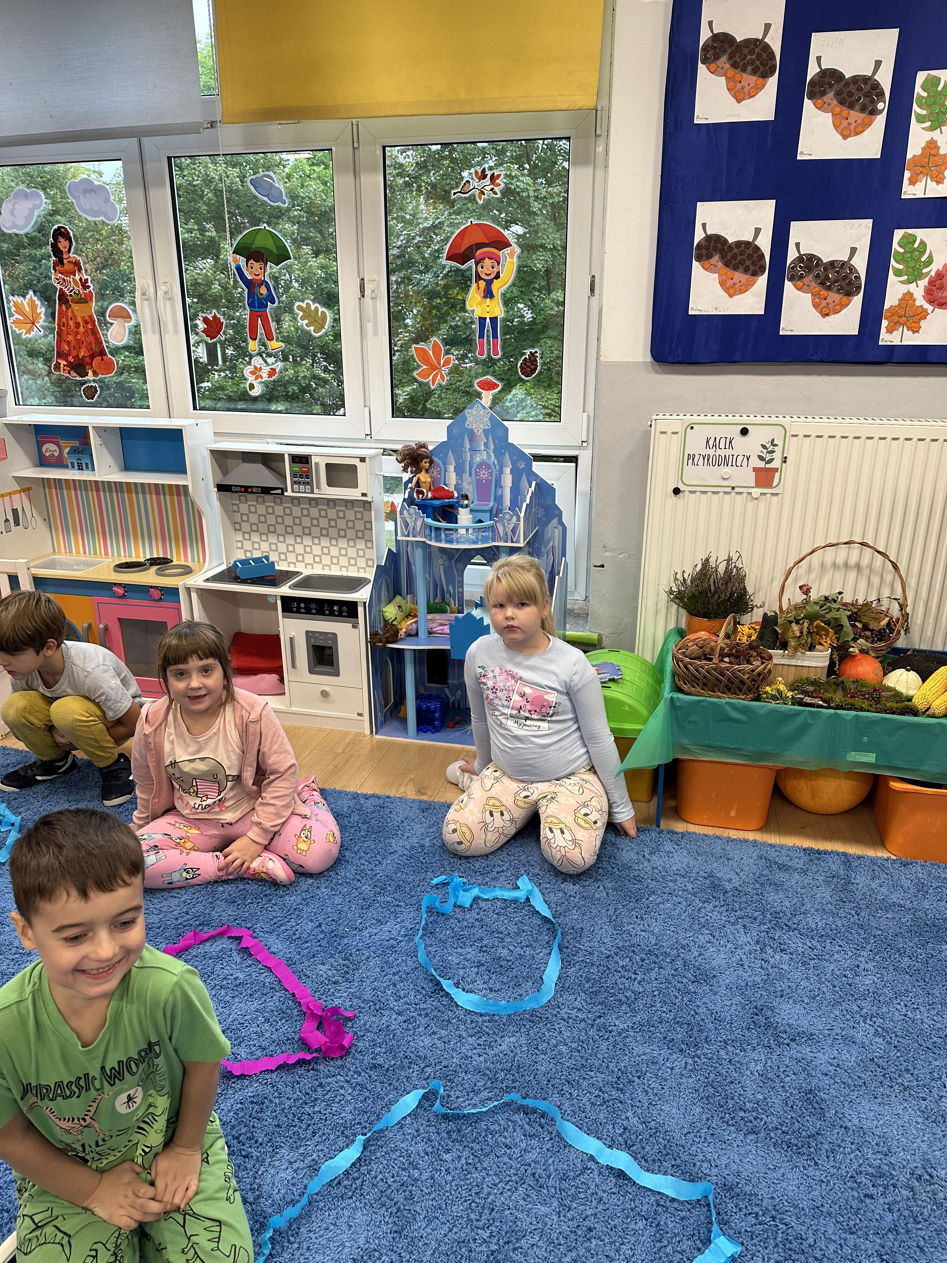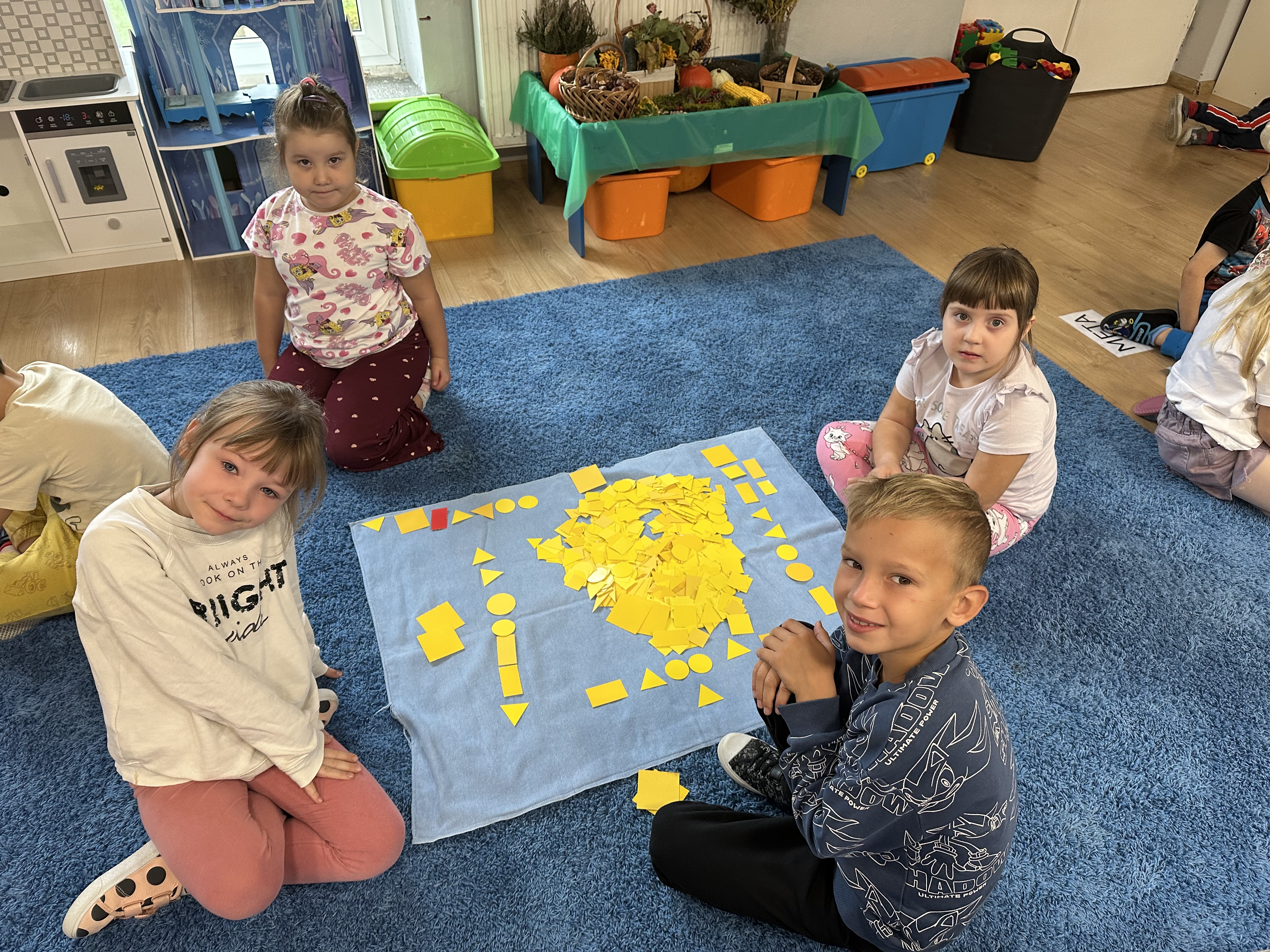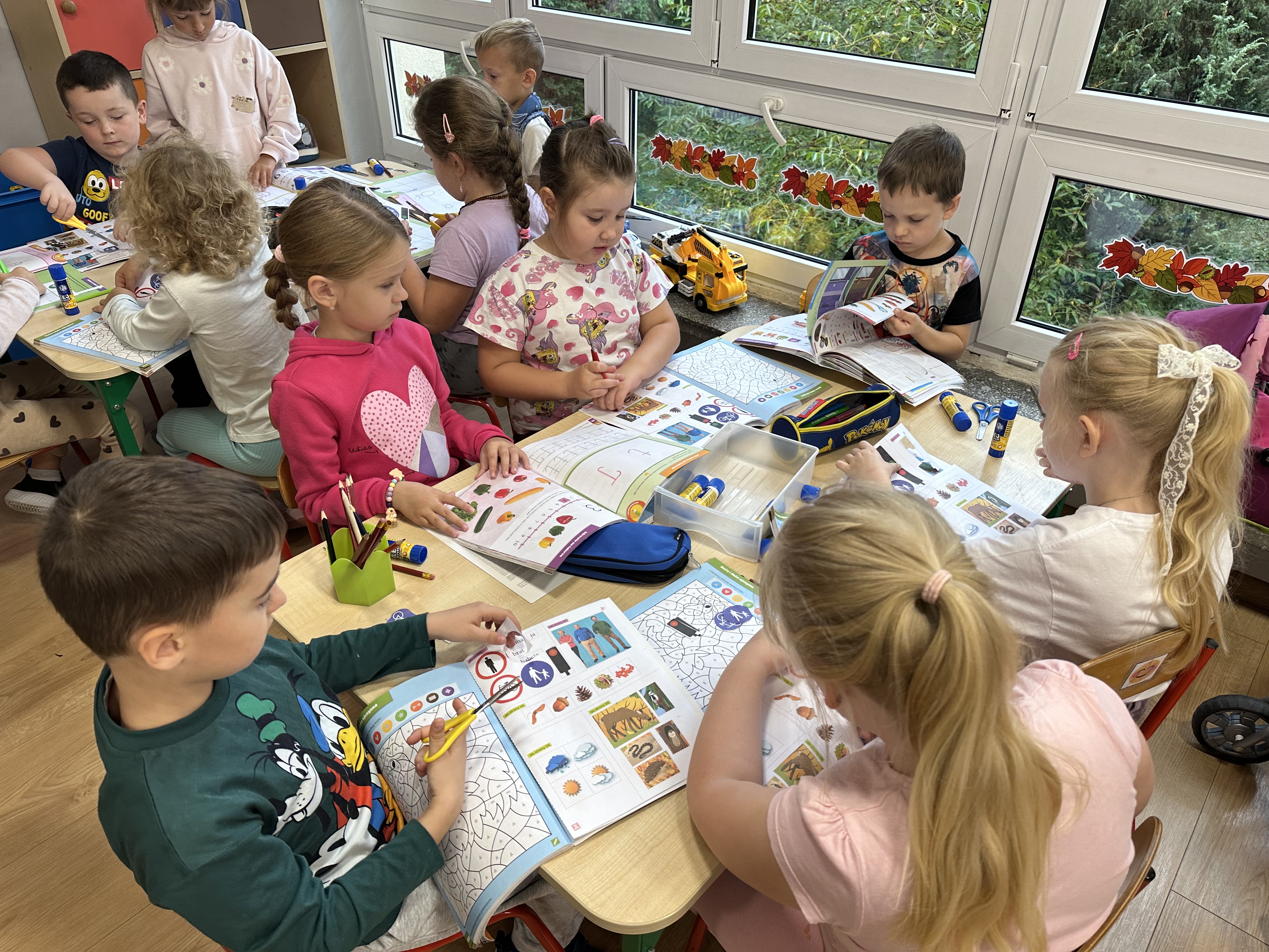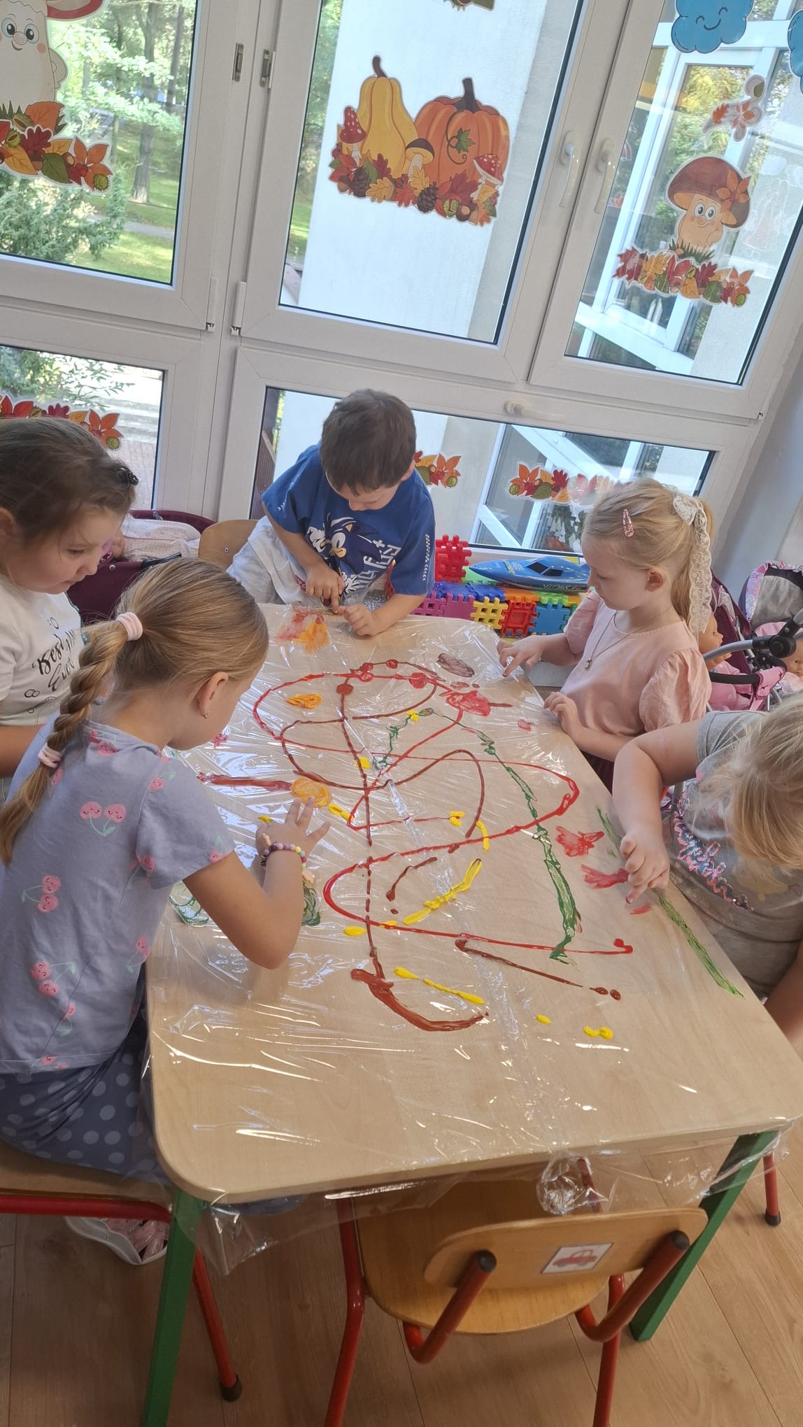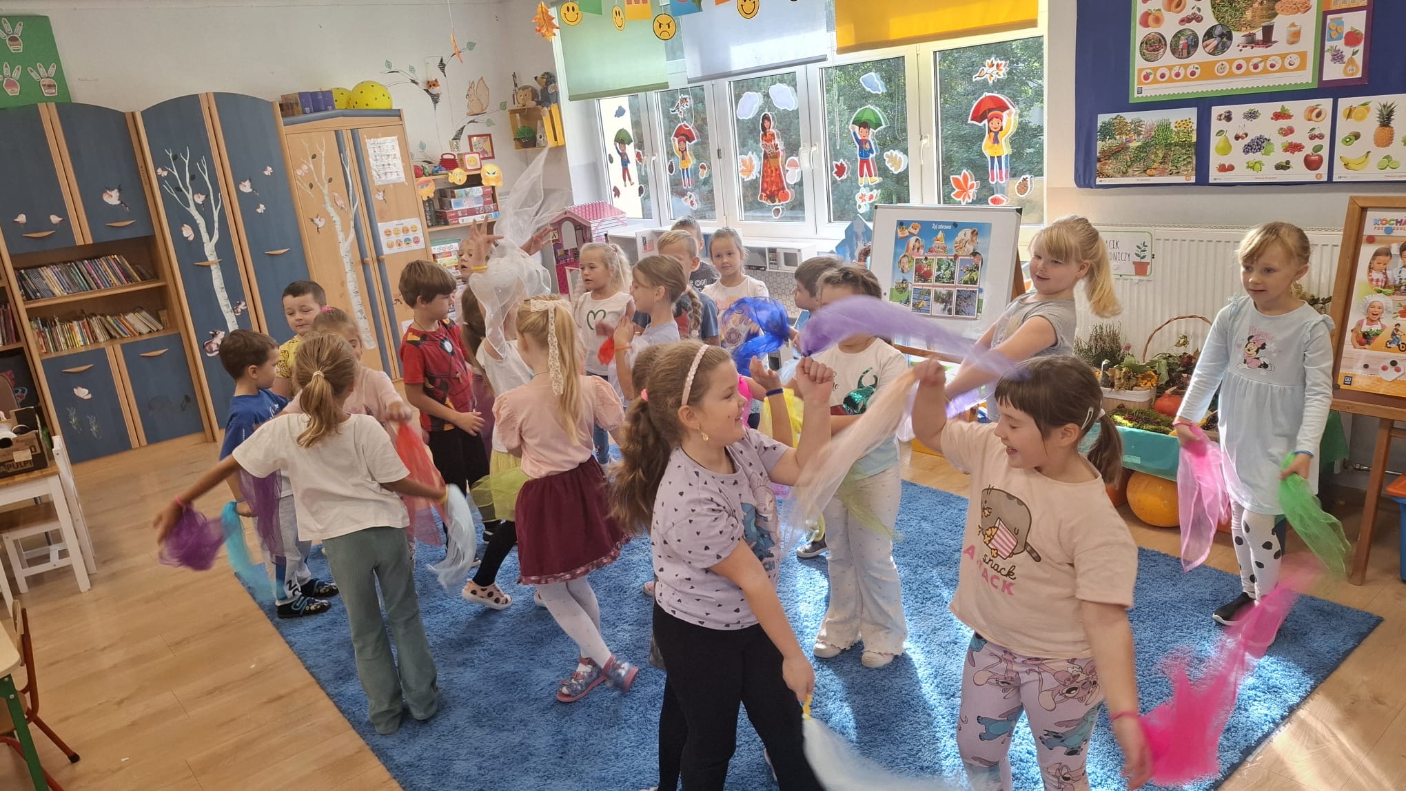 Za nami już czwarty tydzień w przedszkolu. W tym czasie dzieci zwracały szczególną uwagę na zmianę pory roku w złotą jesień, zapoznały się ze znakami drogowymi i ich kształtami oraz poznały nowe słówka w języku angielskim. Codziennie rano przedszkolaki śpiewały piosenkę ,,Jesień w naszej okolicy” i ilustrowały ją ruchem.
