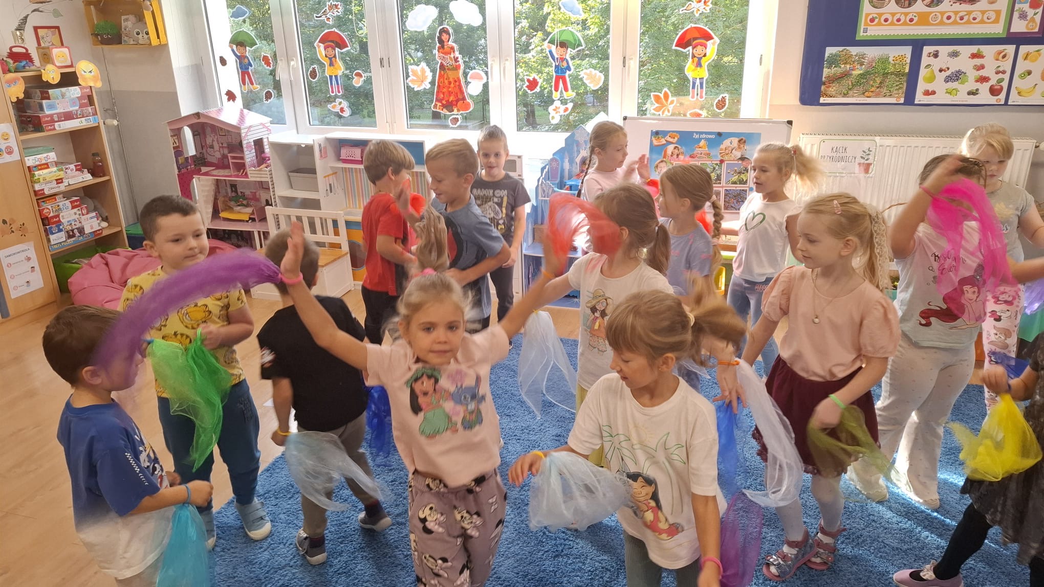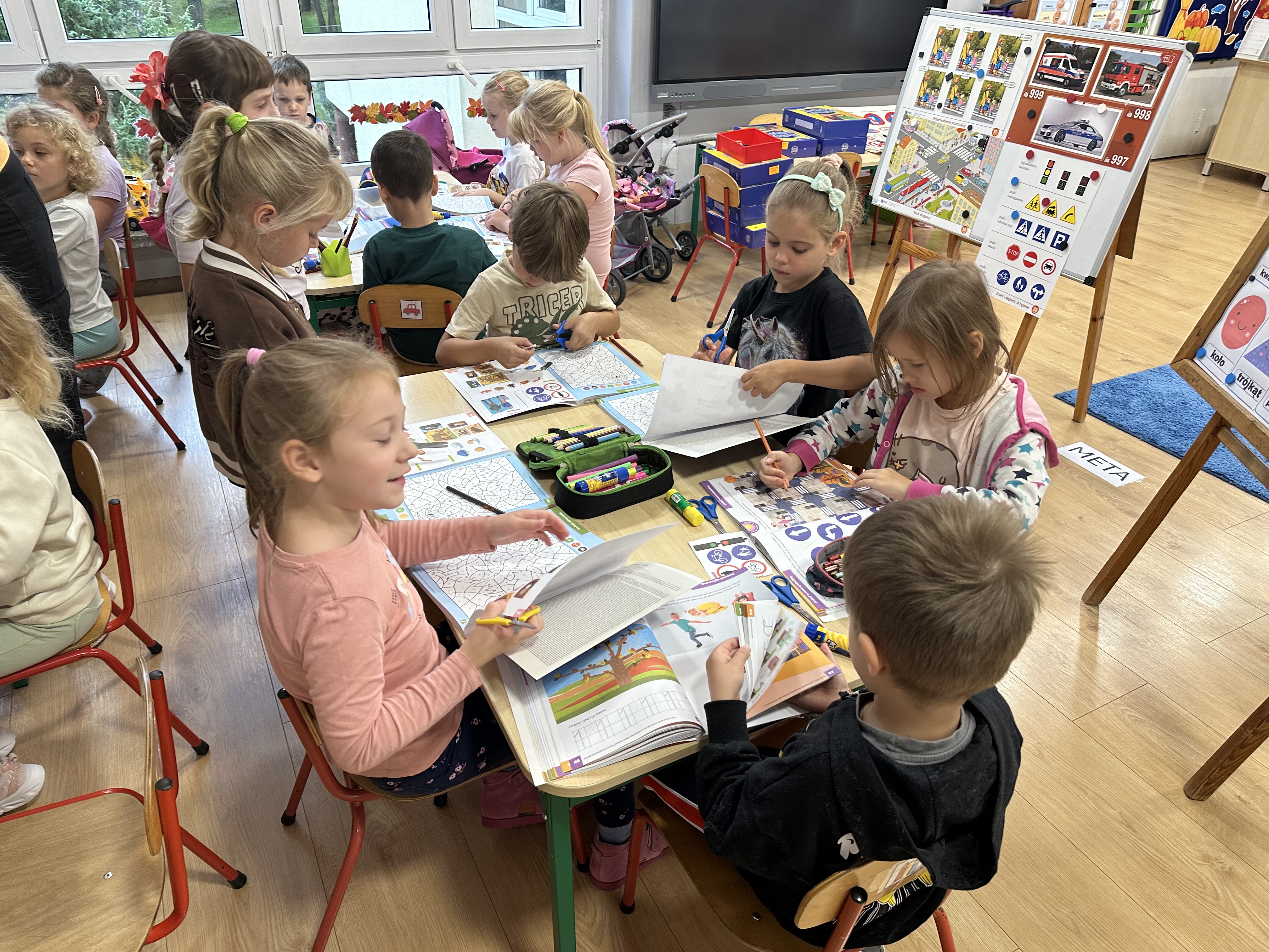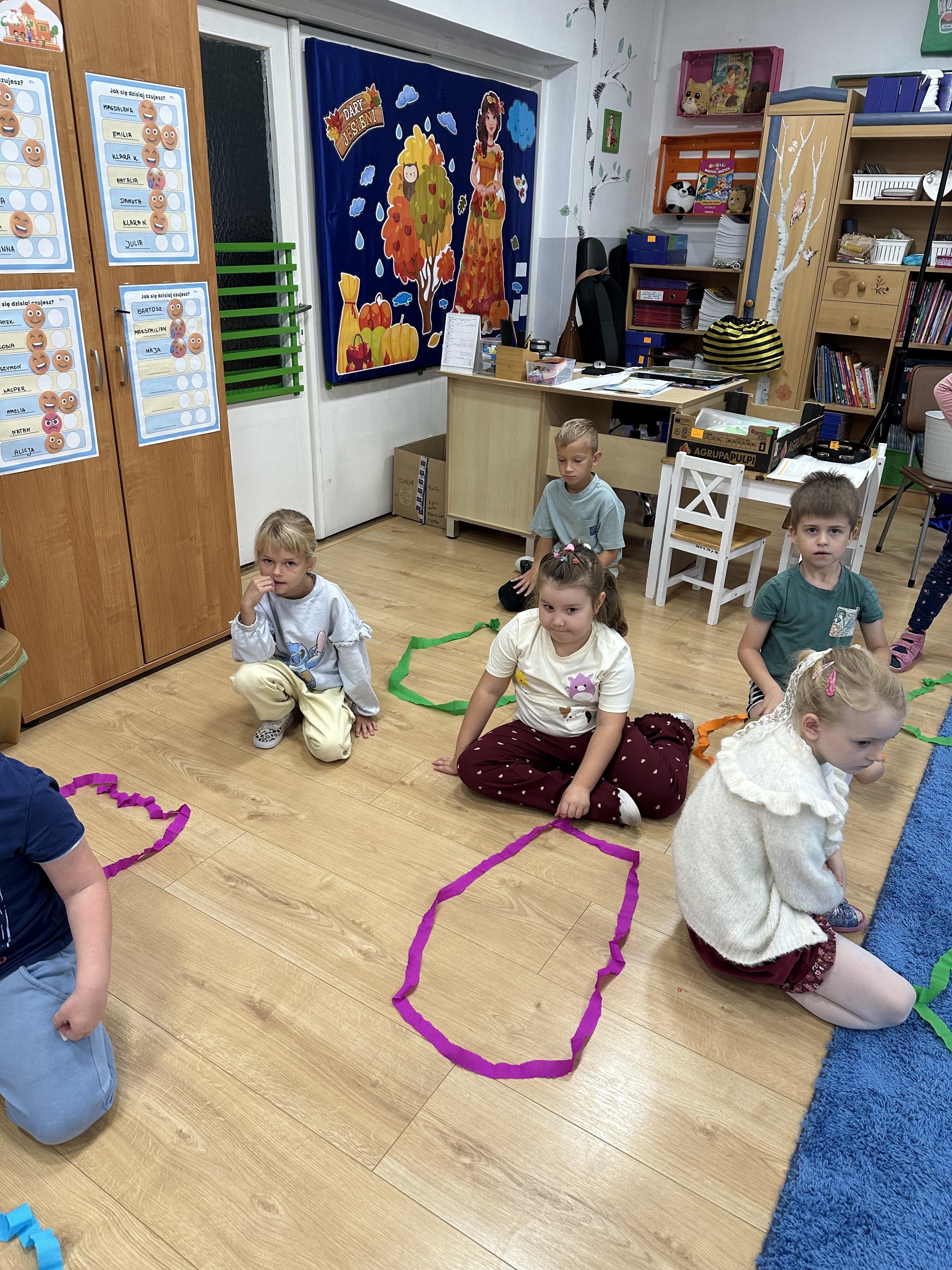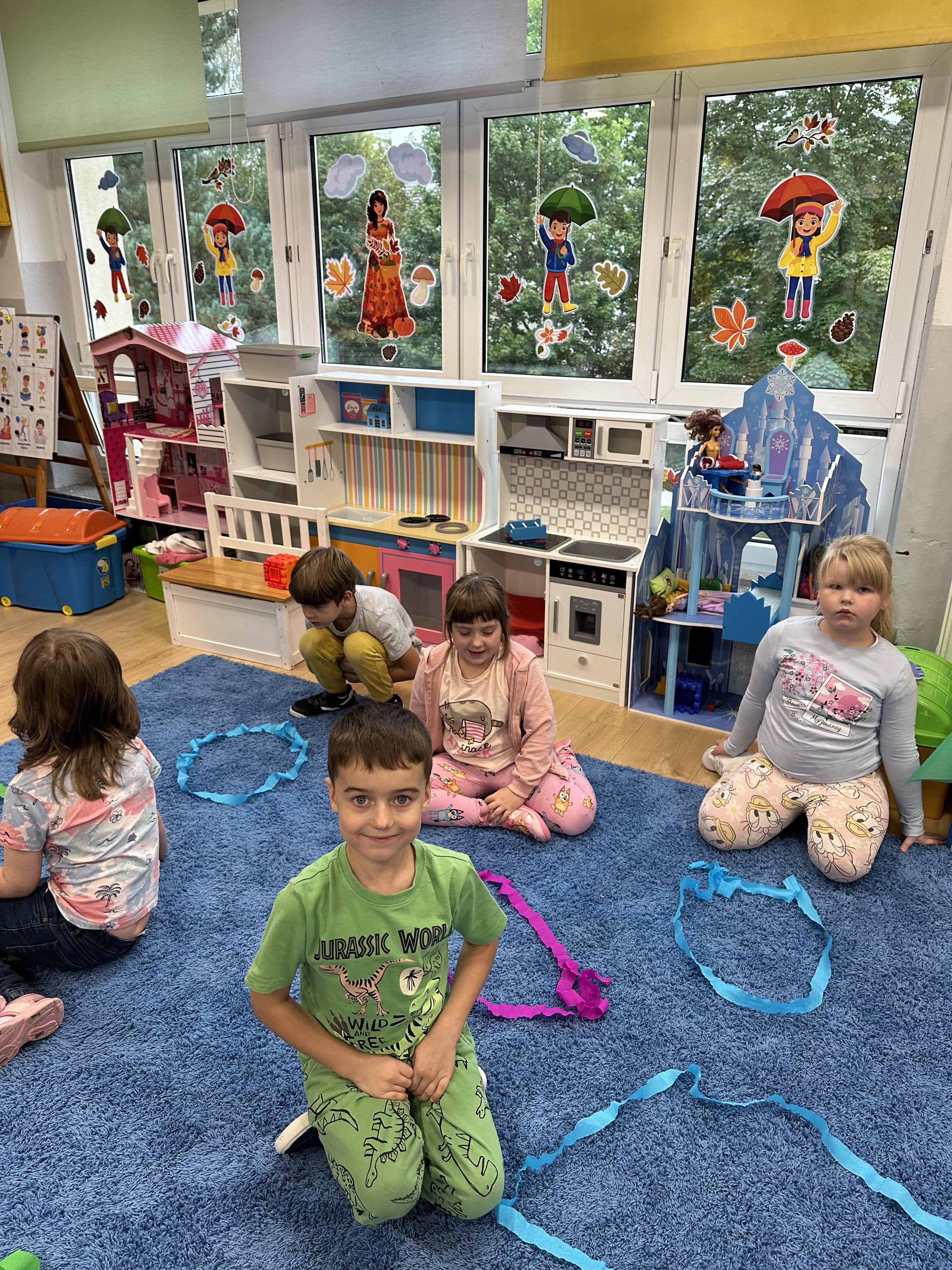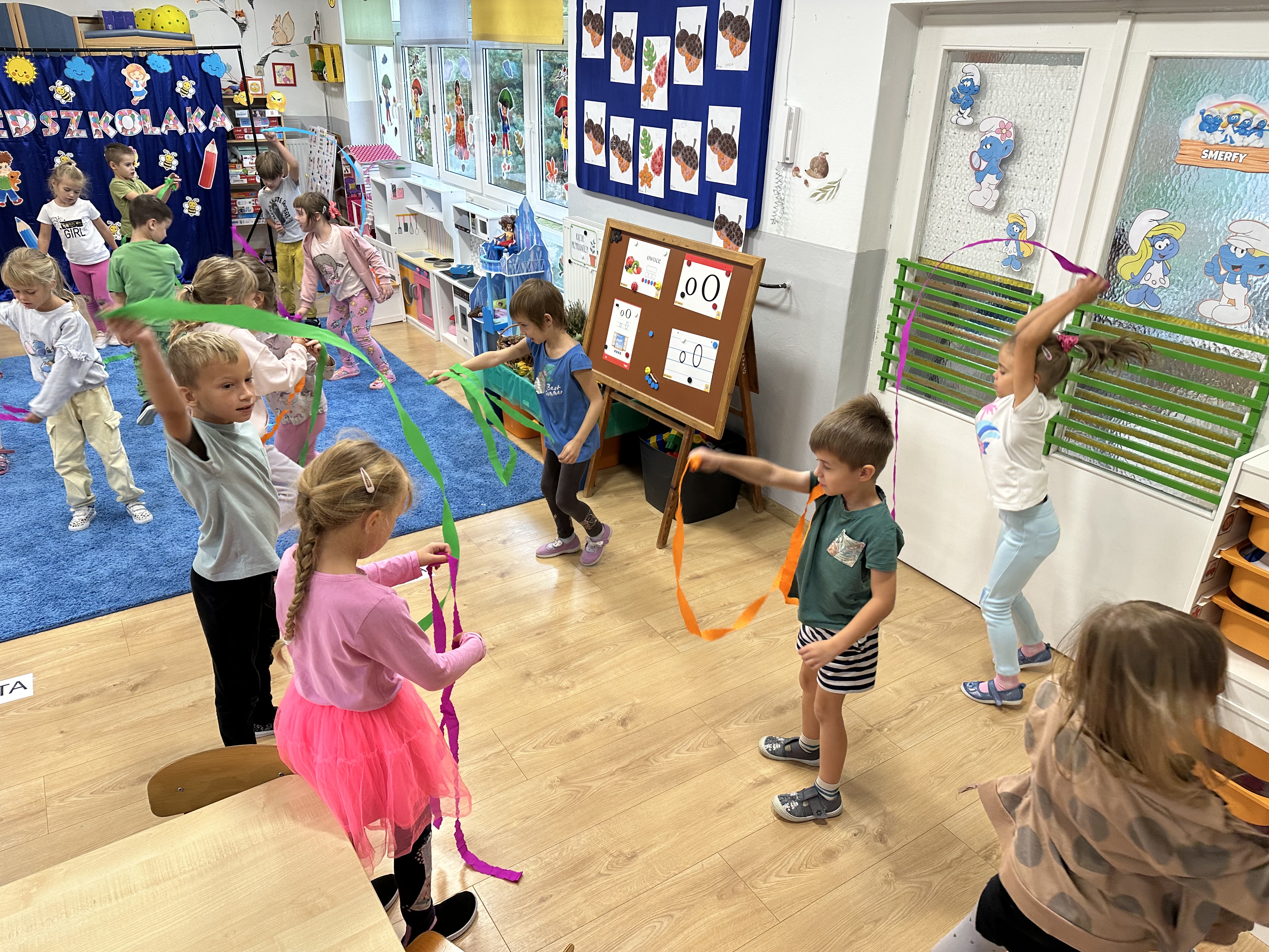 Za nami już czwarty tydzień w przedszkolu. W tym czasie dzieci zwracały szczególną uwagę na zmianę pory roku w złotą jesień, zapoznały się ze znakami drogowymi i ich kształtami oraz poznały nowe słówka w języku angielskim. Codziennie rano przedszkolaki śpiewały piosenkę ,,Jesień w naszej okolicy” i ilustrowały ją ruchem.