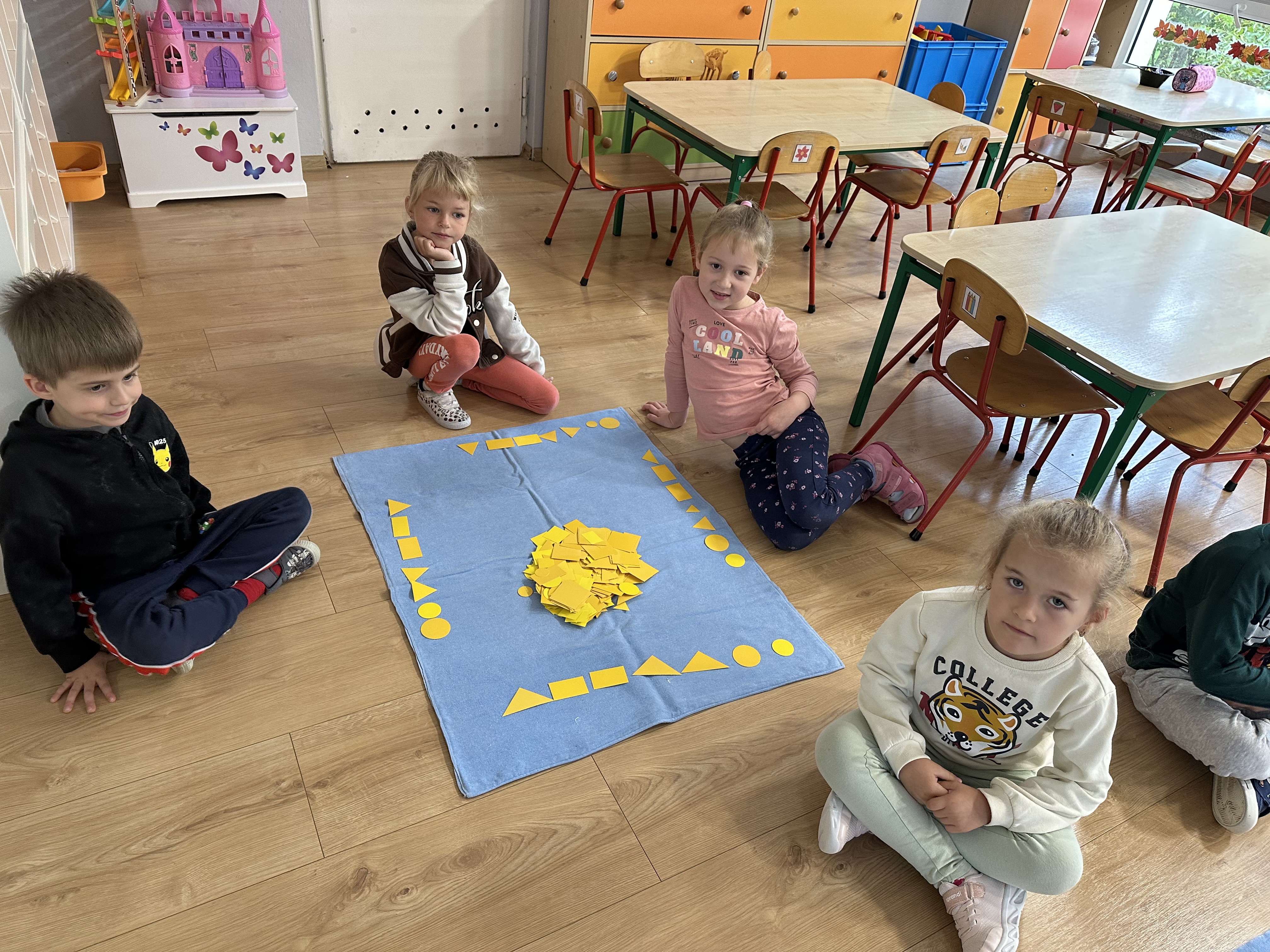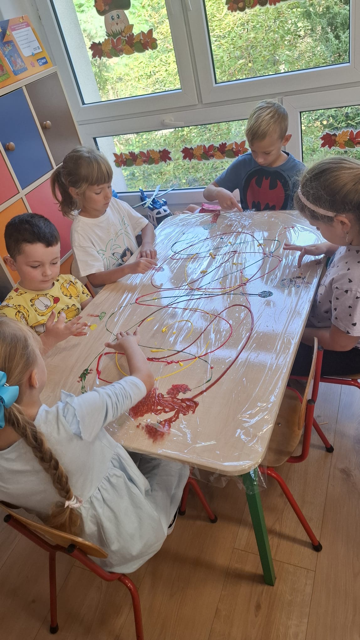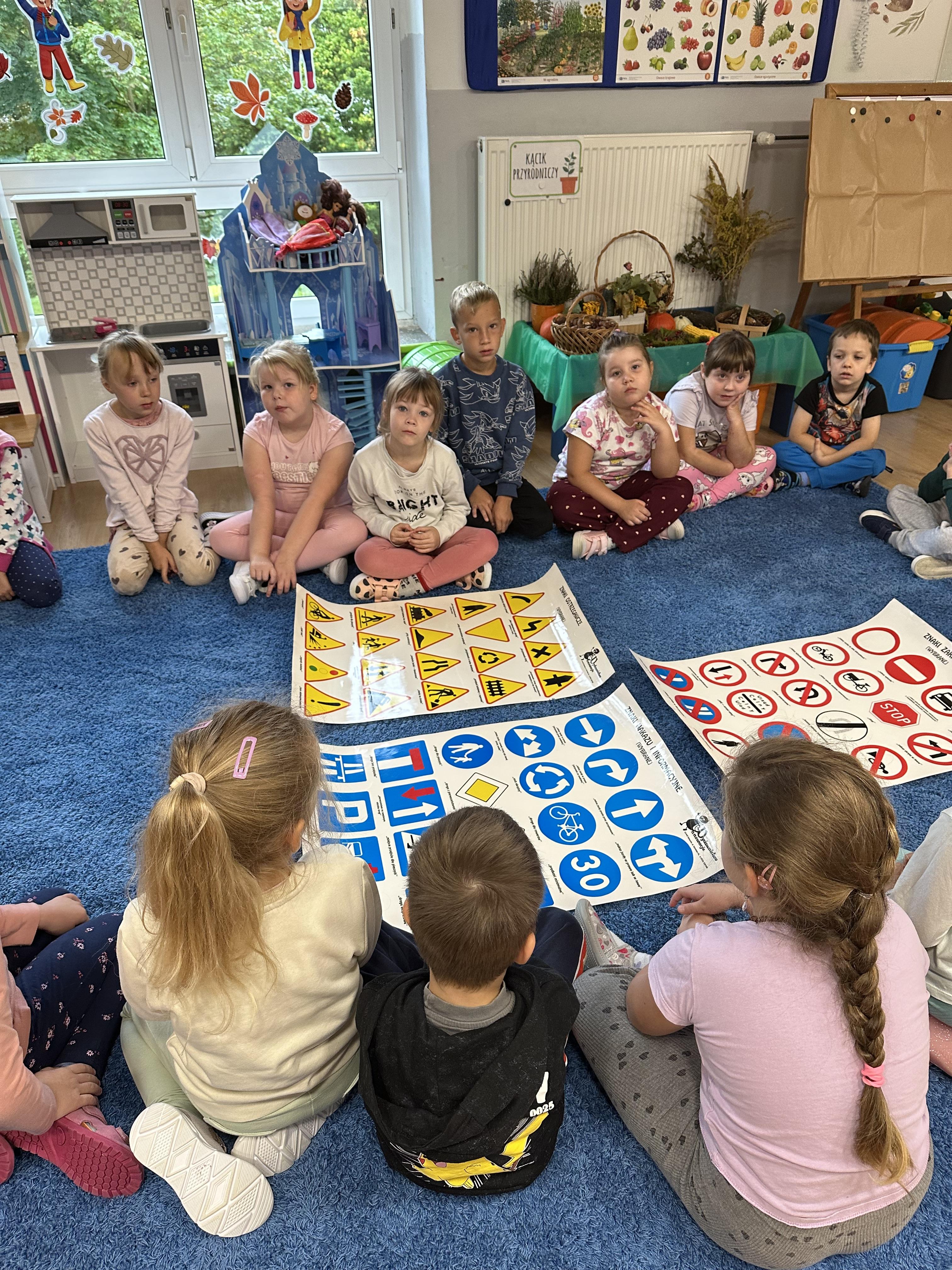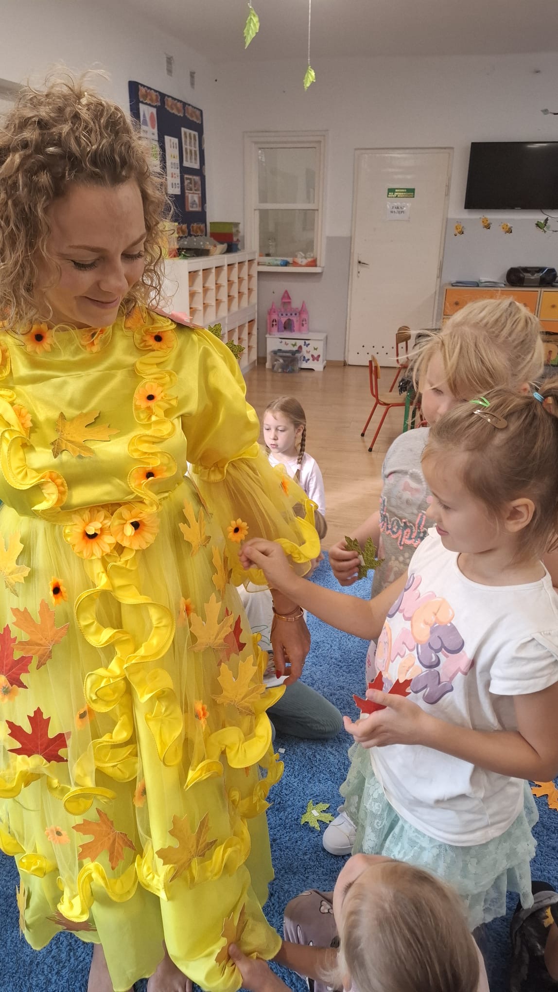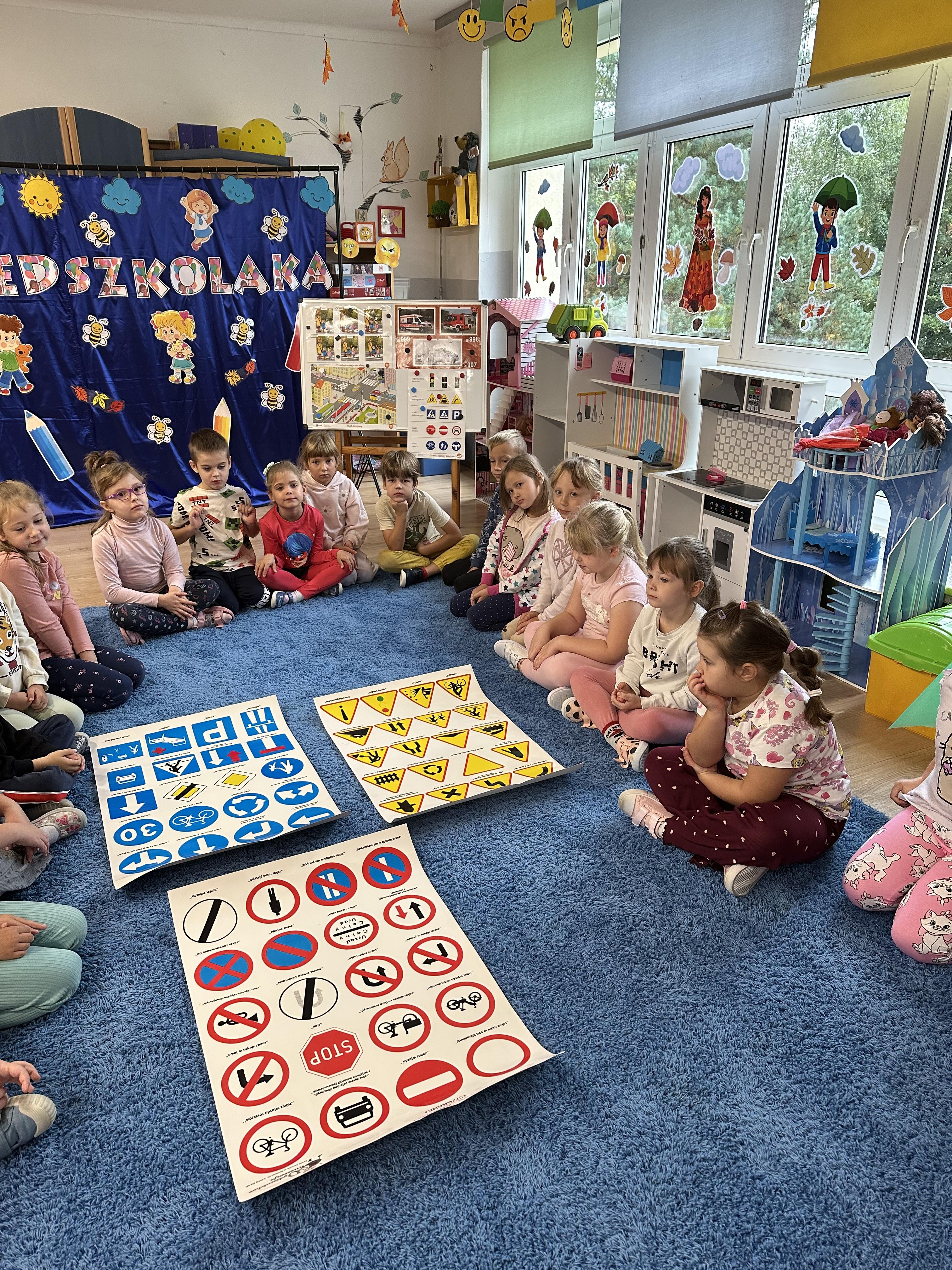 Za nami już czwarty tydzień w przedszkolu. W tym czasie dzieci zwracały szczególną uwagę na zmianę pory roku w złotą jesień, zapoznały się ze znakami drogowymi i ich kształtami oraz poznały nowe słówka w języku angielskim. Codziennie rano przedszkolaki śpiewały piosenkę ,,Jesień w naszej okolicy” i ilustrowały ją ruchem.