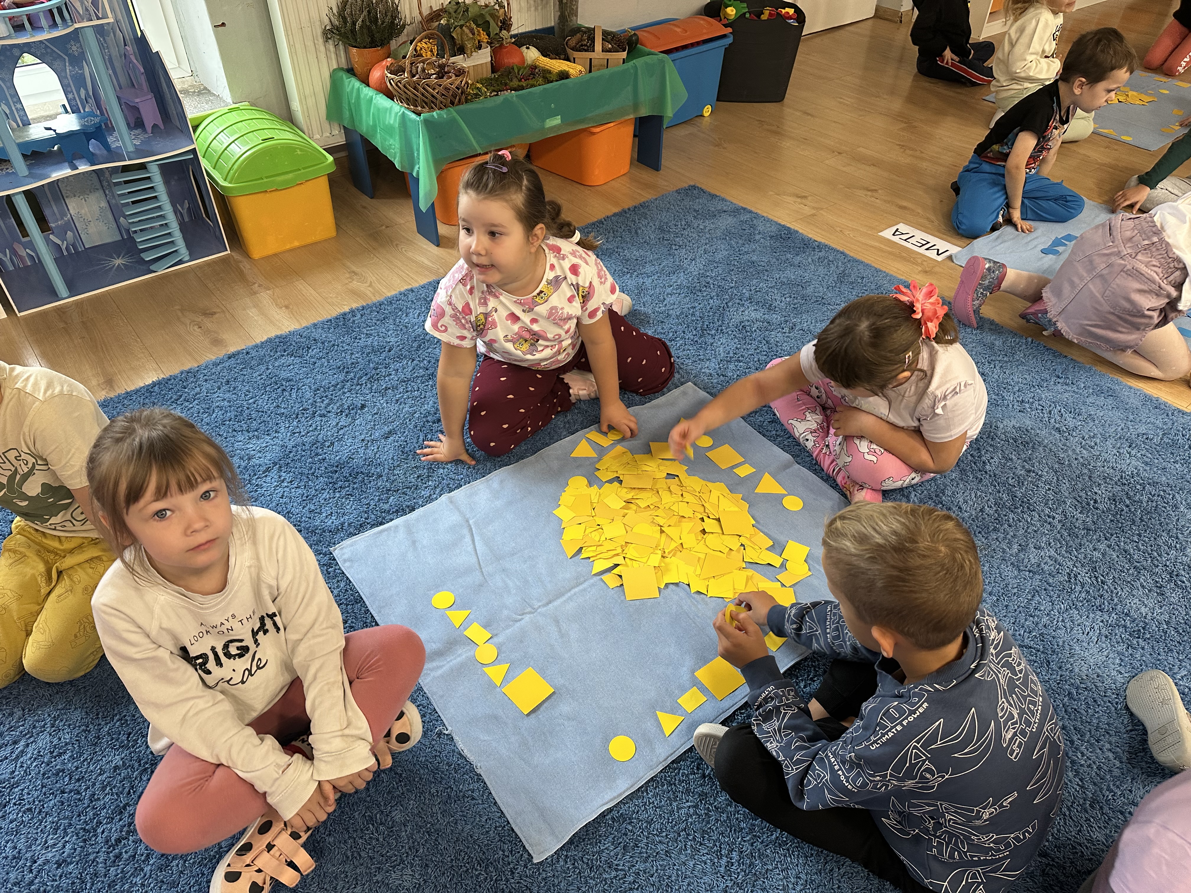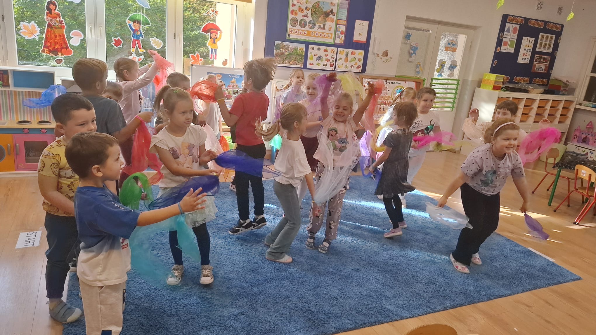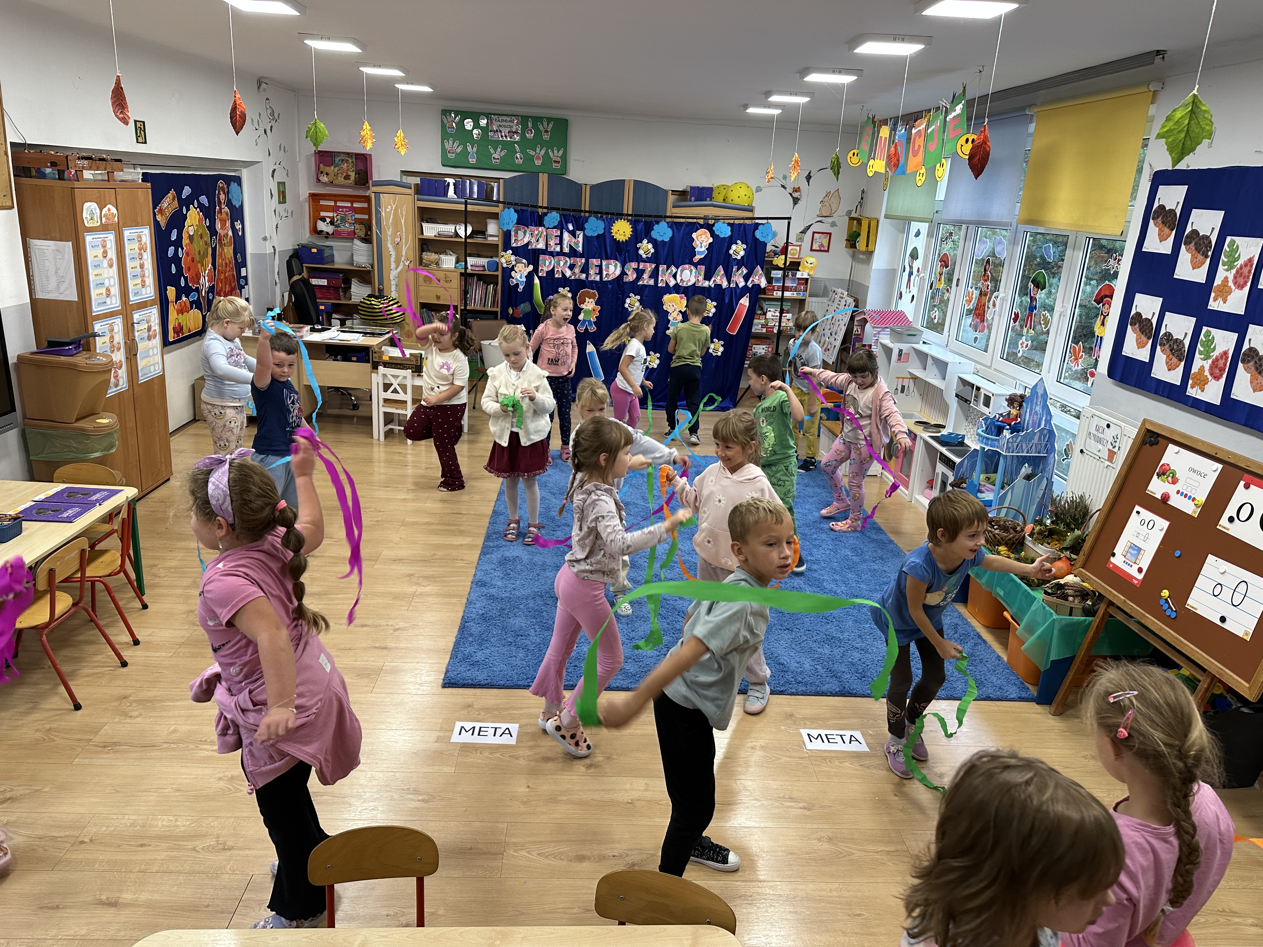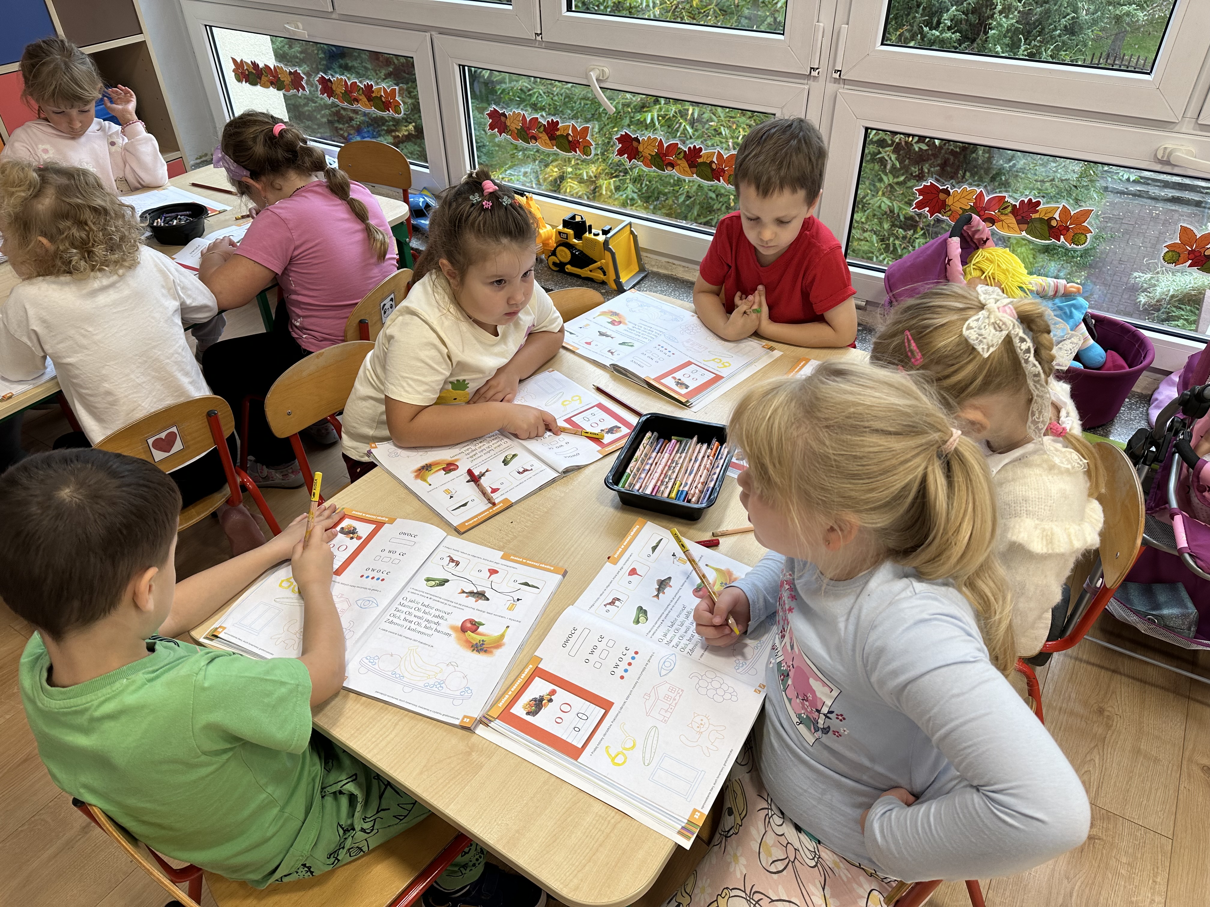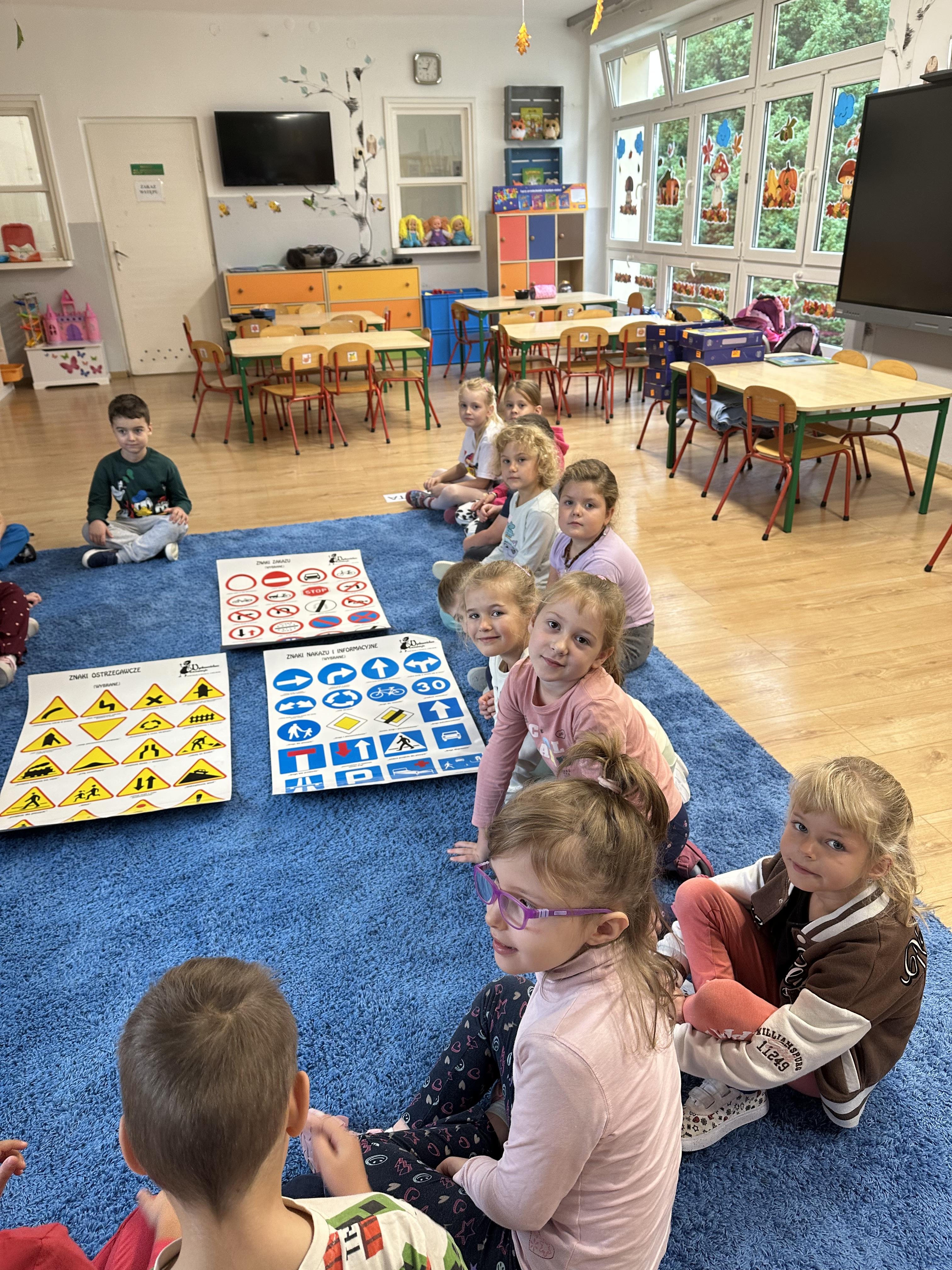 Za nami już czwarty tydzień w przedszkolu. W tym czasie dzieci zwracały szczególną uwagę na zmianę pory roku w złotą jesień, zapoznały się ze znakami drogowymi i ich kształtami oraz poznały nowe słówka w języku angielskim. Codziennie rano przedszkolaki śpiewały piosenkę ,,Jesień w naszej okolicy” i ilustrowały ją ruchem.