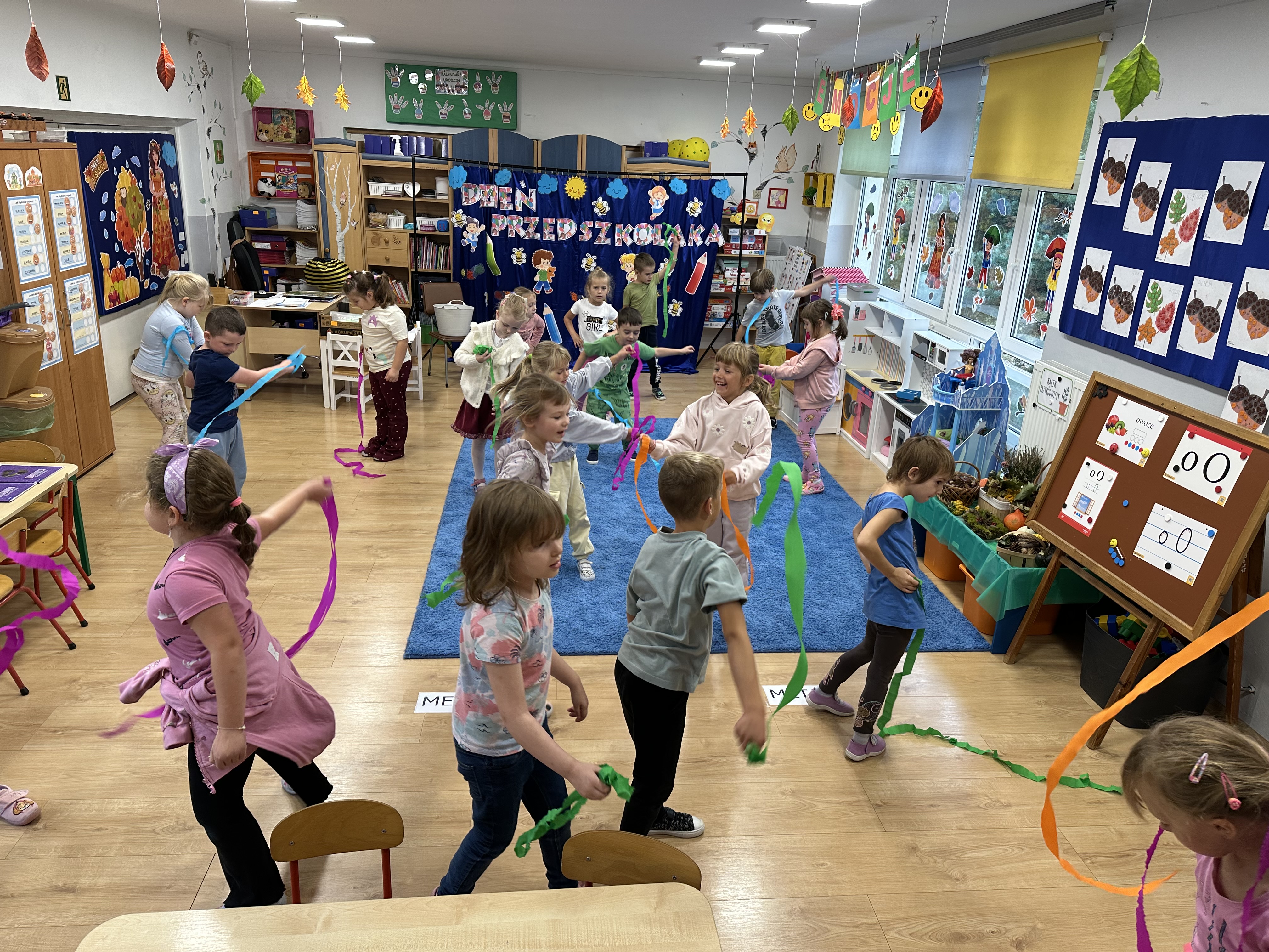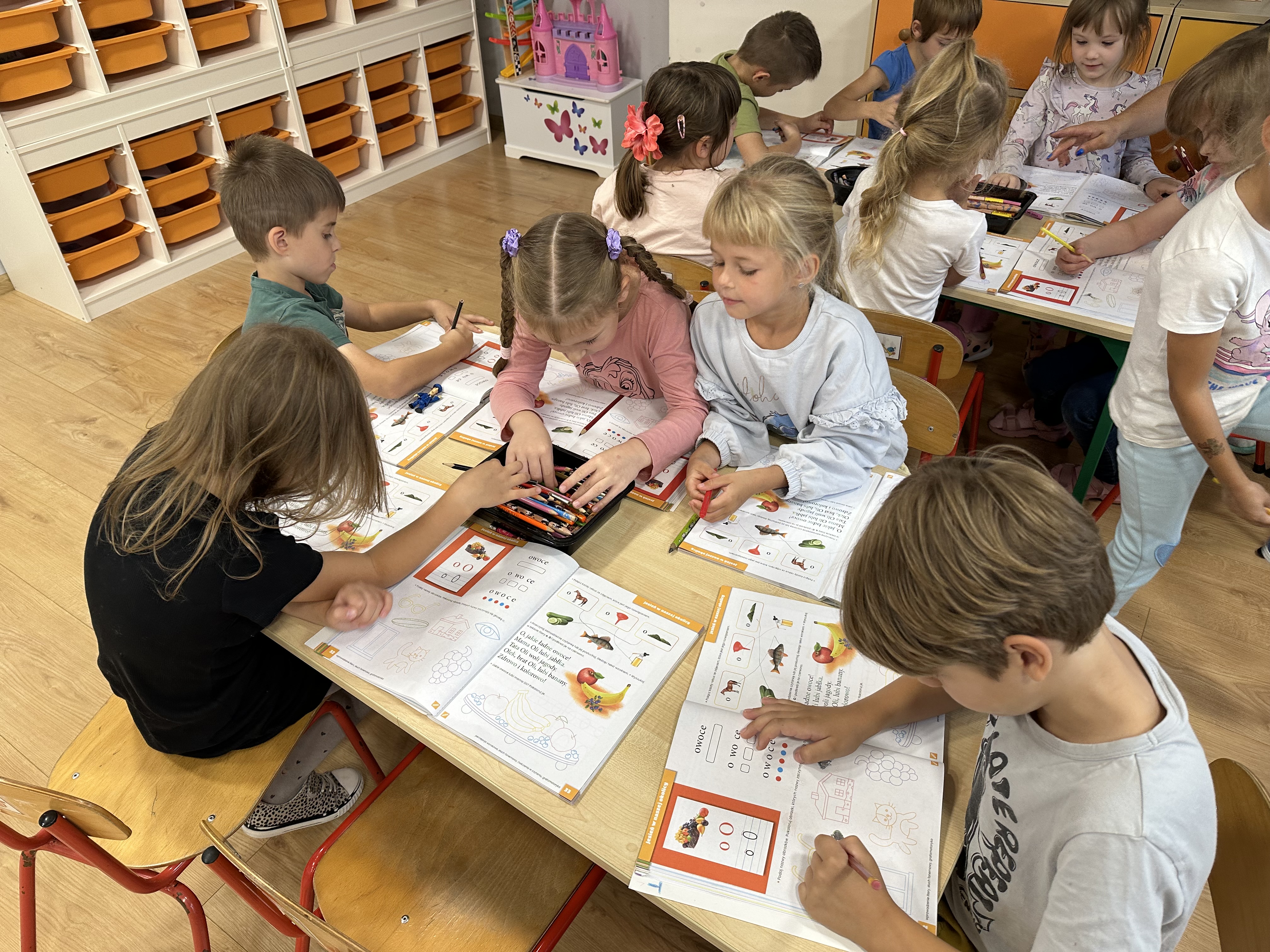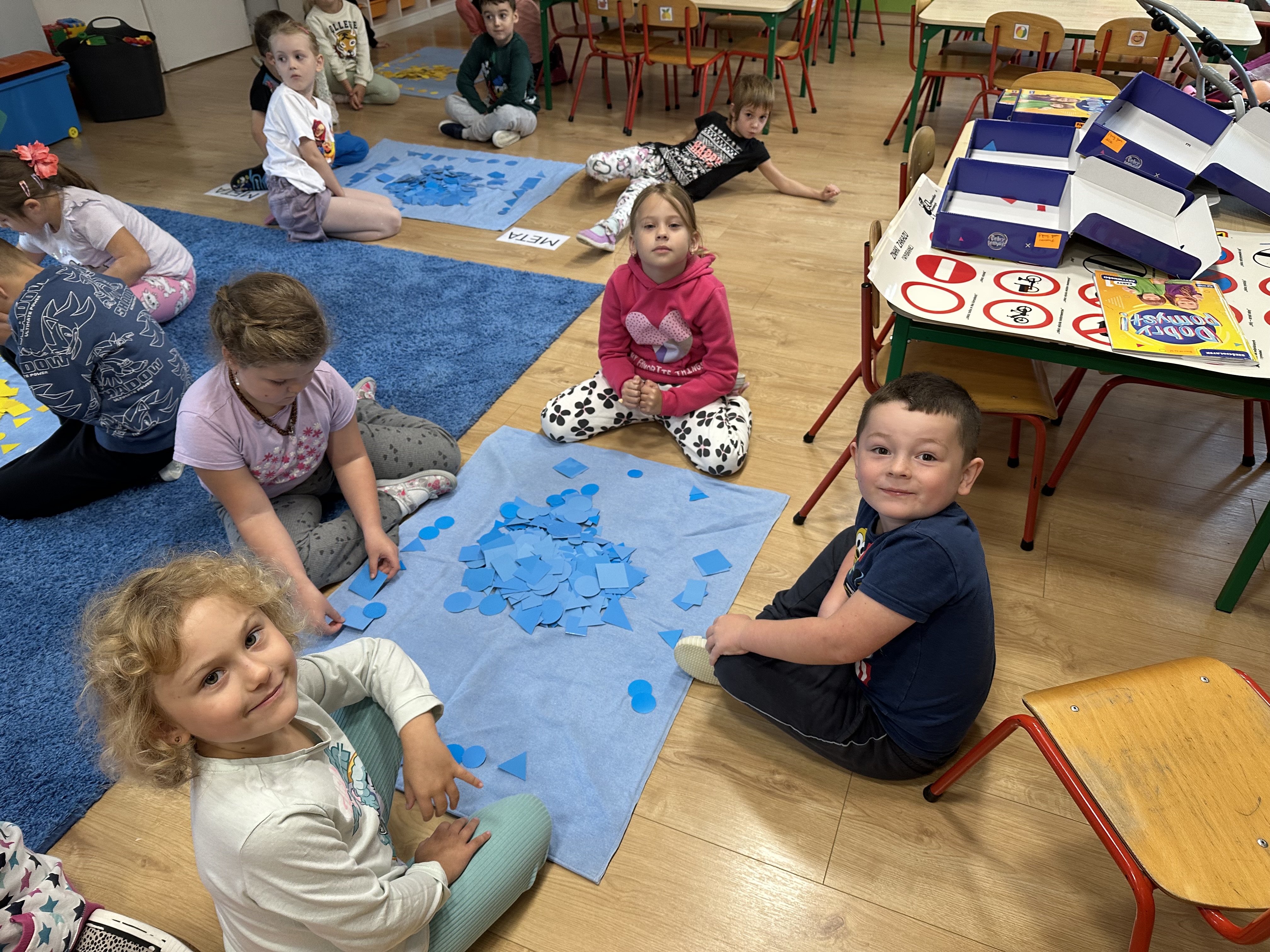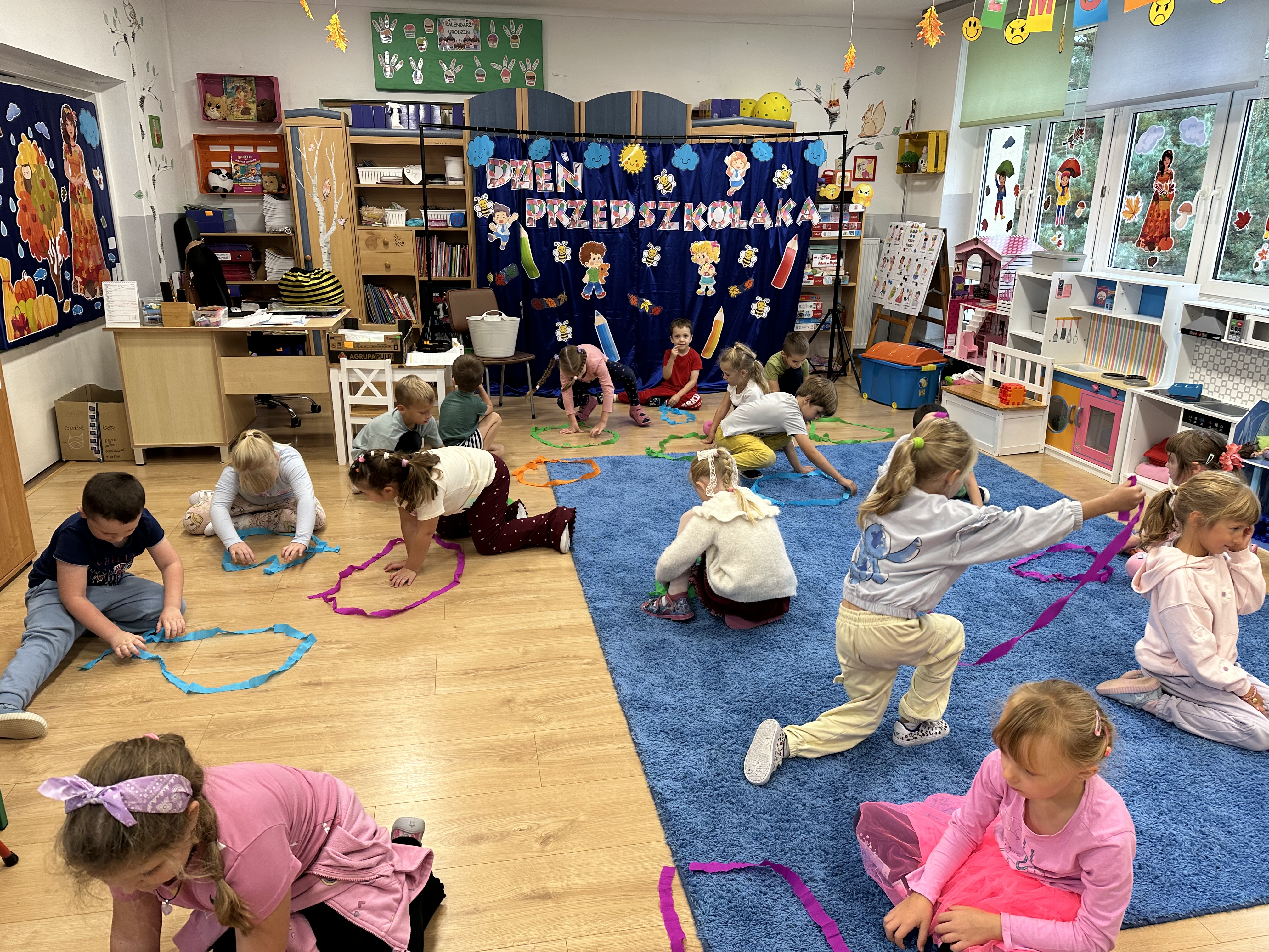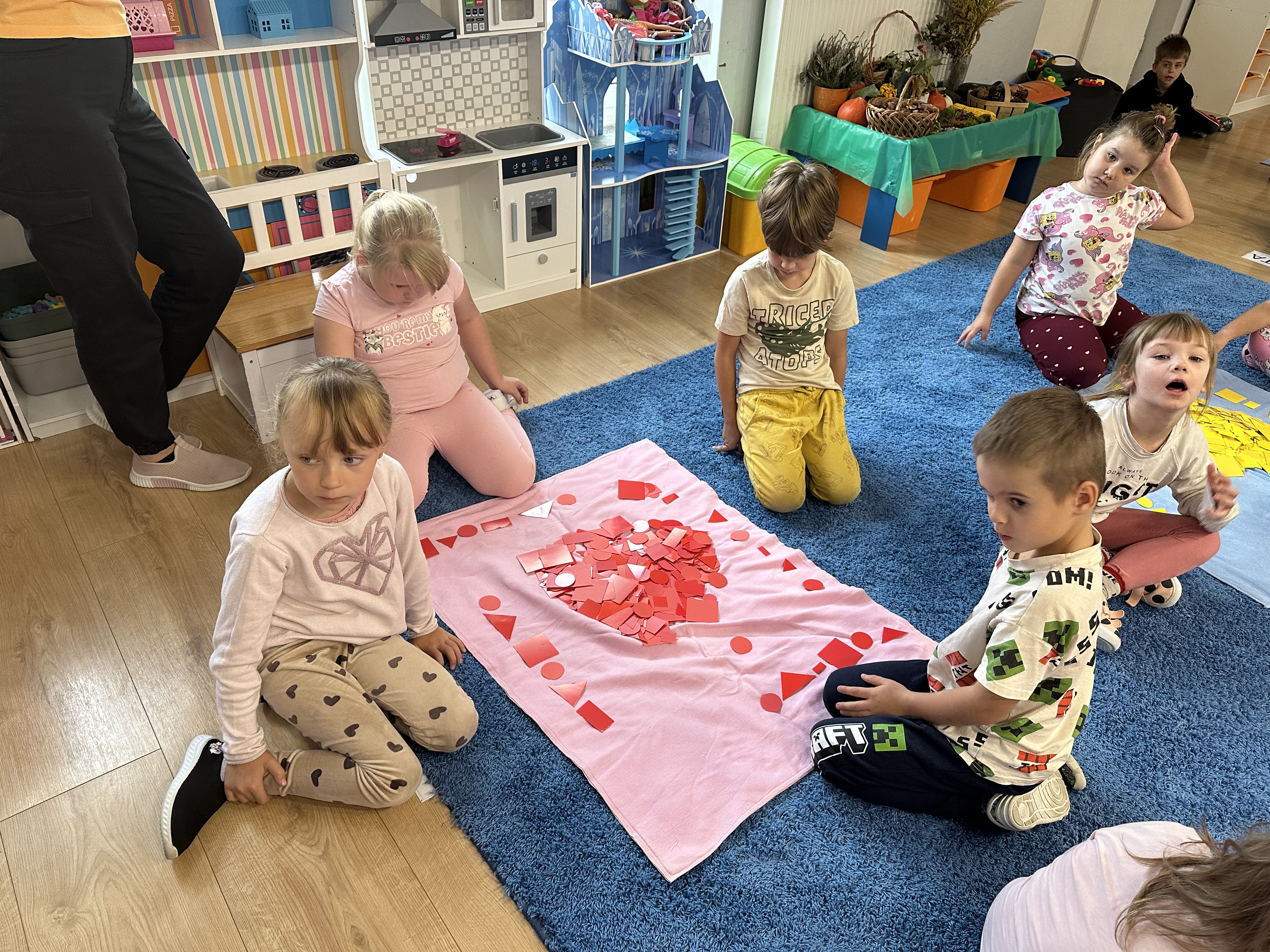Za nami już czwarty tydzień w przedszkolu. W tym czasie dzieci zwracały szczególną uwagę na zmianę pory roku w złotą jesień, zapoznały się ze znakami drogowymi i ich kształtami oraz poznały nowe słówka w języku angielskim. Codziennie rano przedszkolaki śpiewały piosenkę ,,Jesień w naszej okolicy” i ilustrowały ją ruchem.