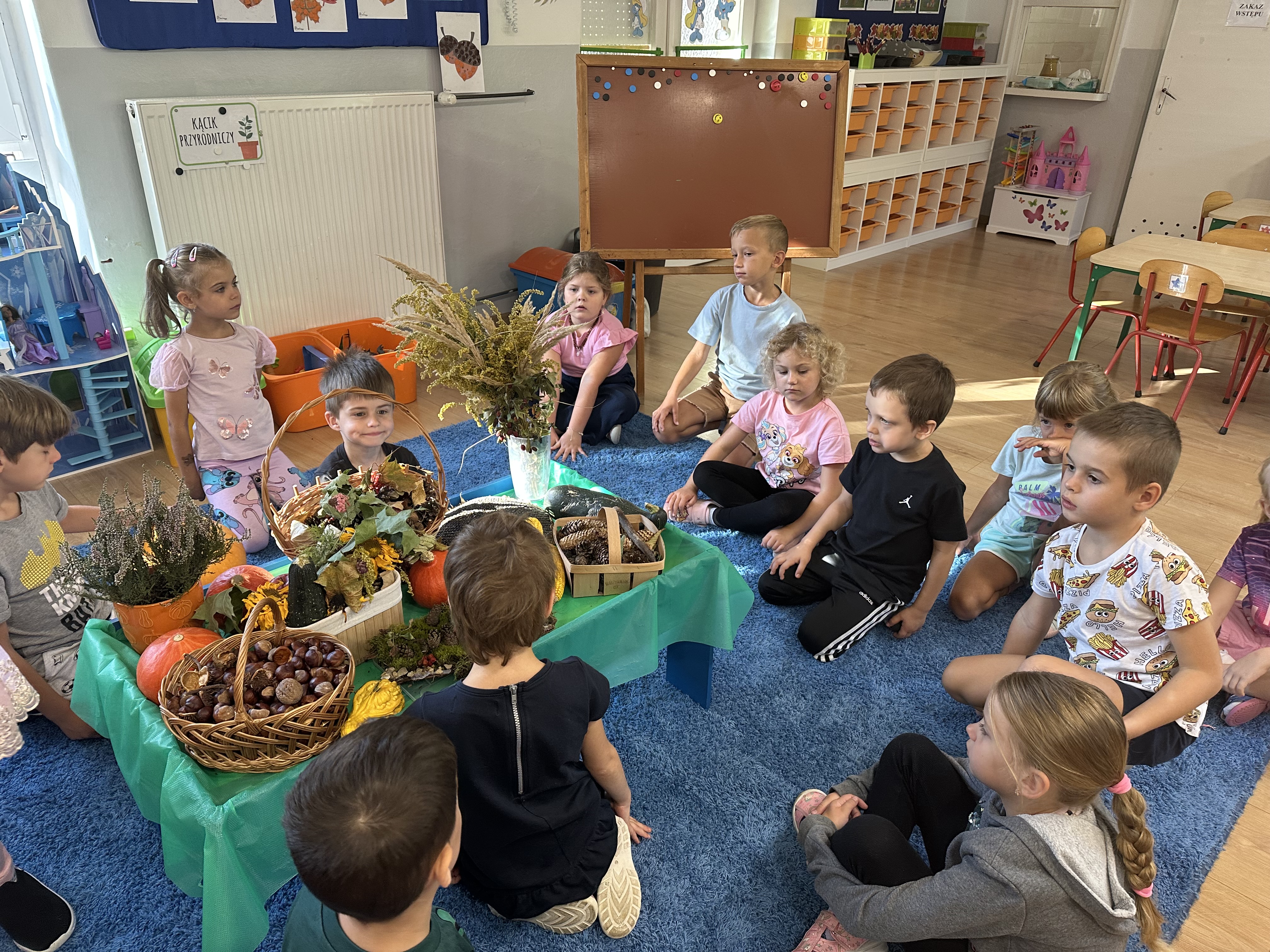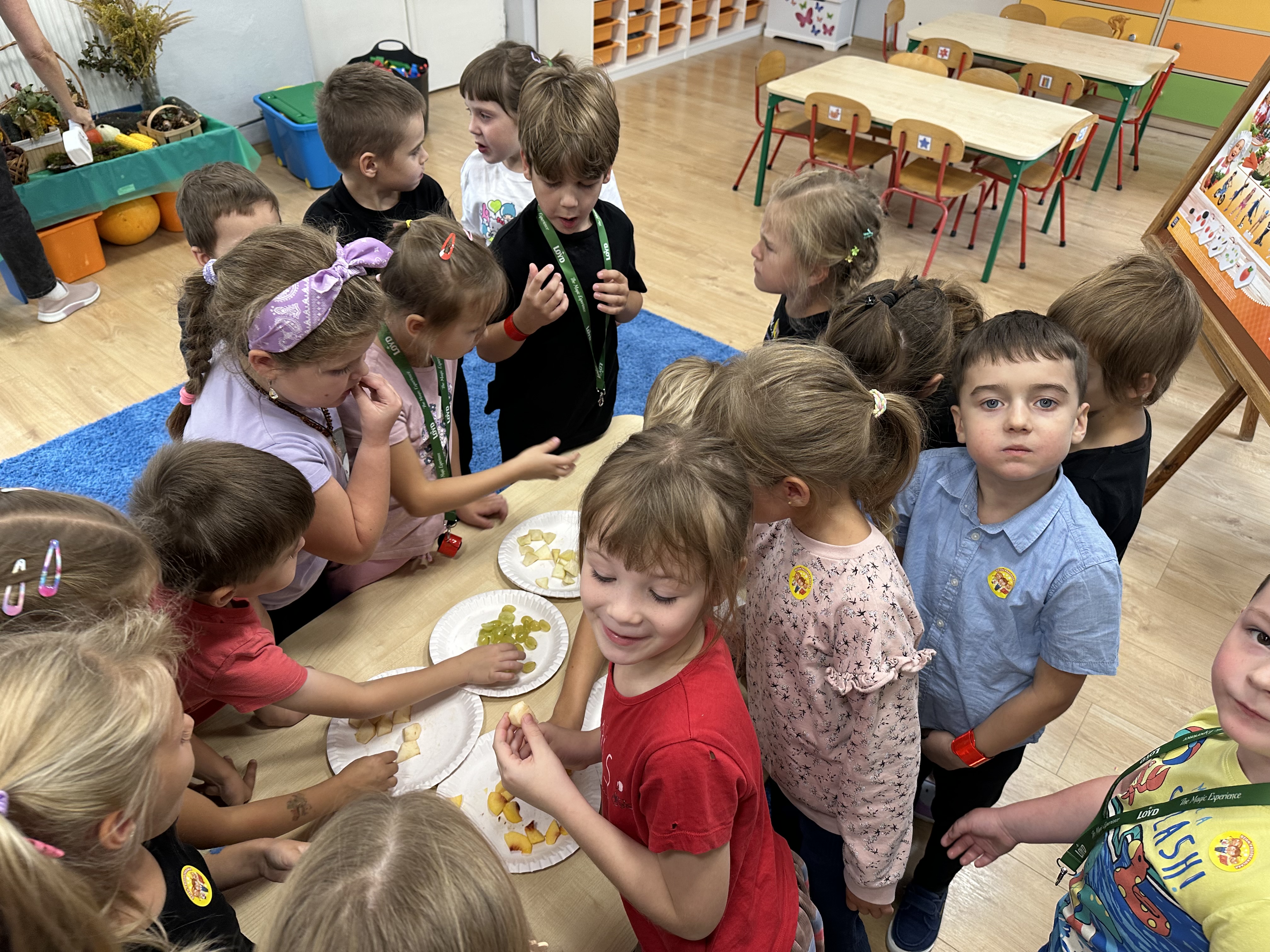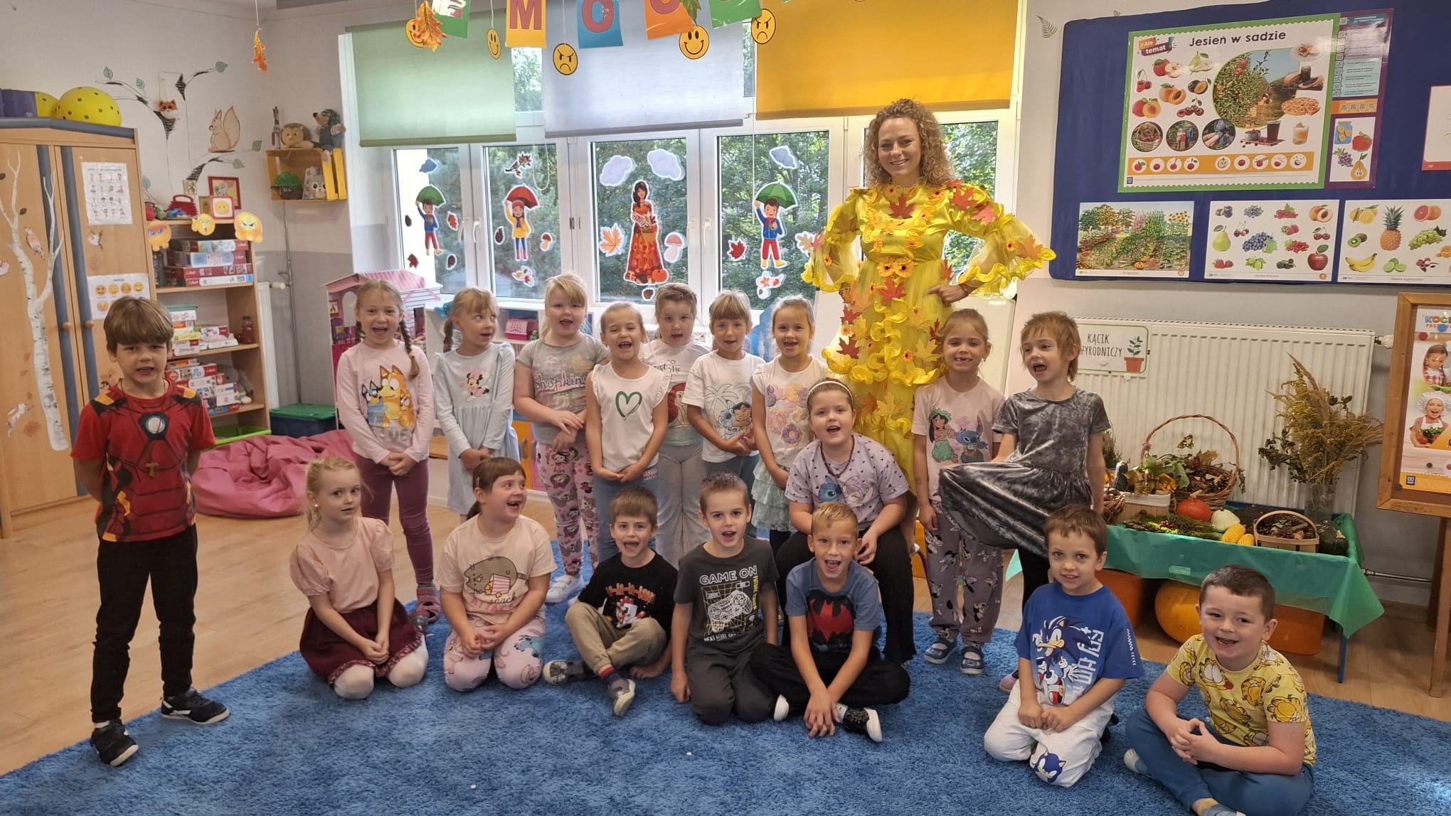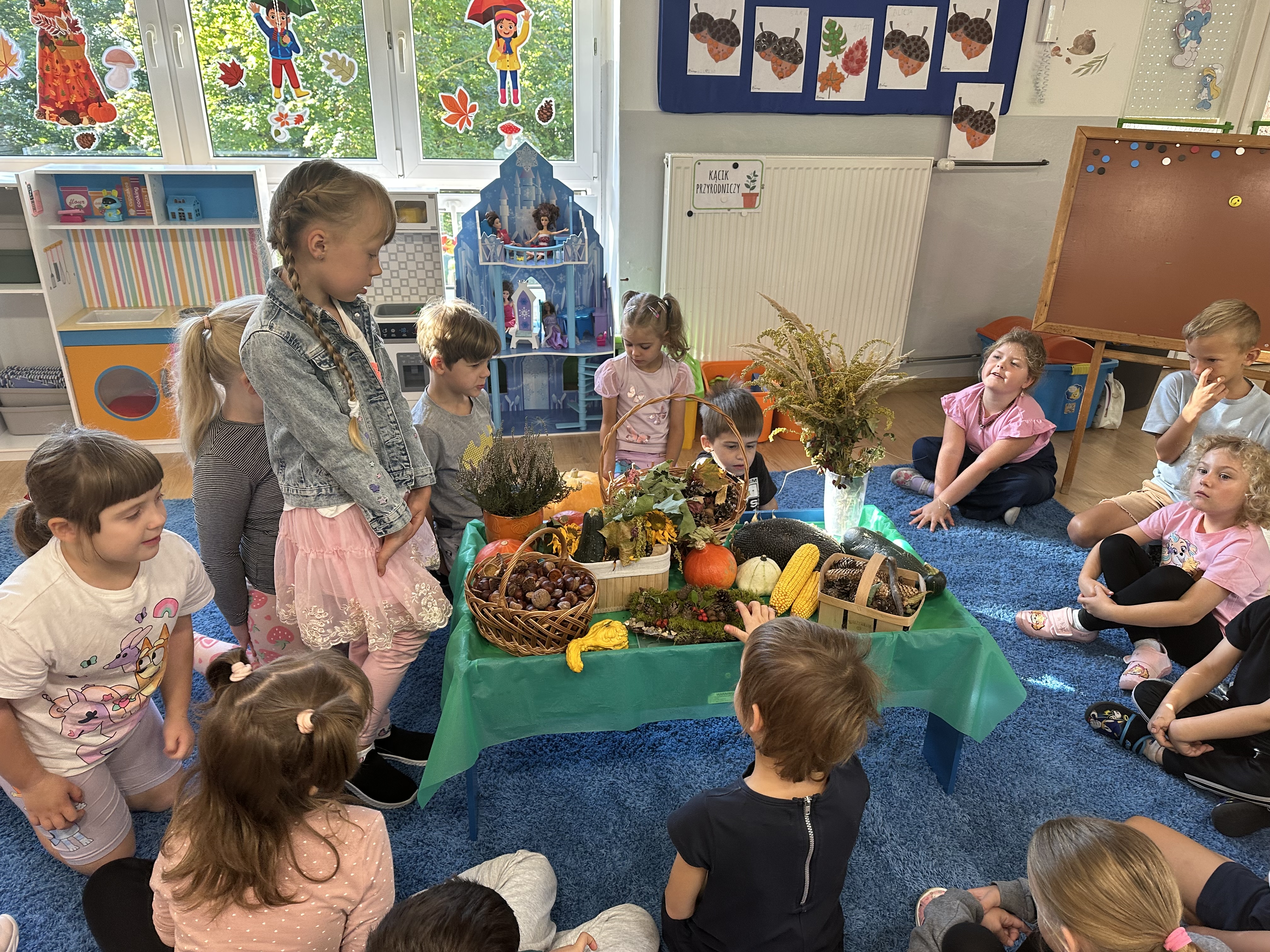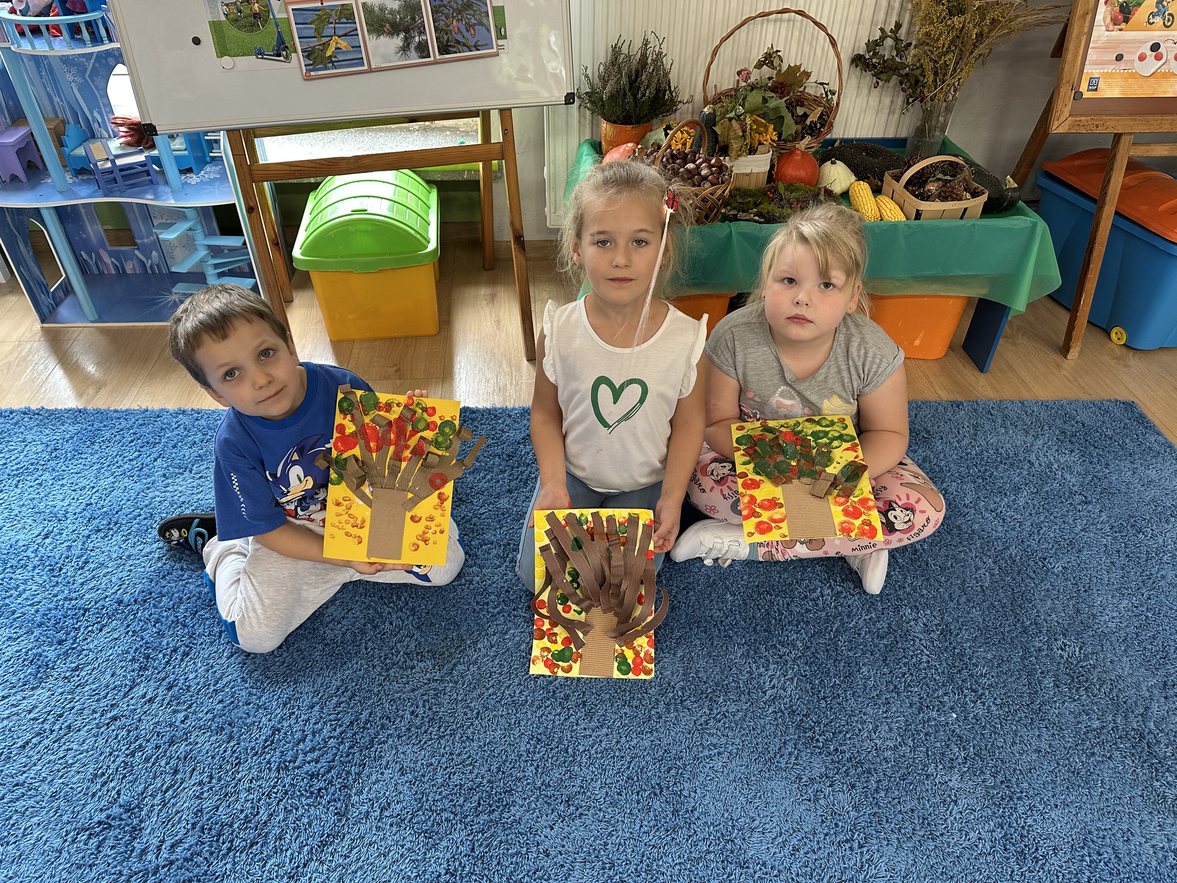 W poniedziałek po zabawie ,,Wokół kolorów” kształtującej koncentrację, dzieci uczestniczyły w porannych ćwiczeniach gimnastycznych, rozwijały tym samym duże grupy mięśniowe. Następnie wysłuchały opowiadania Marii Pawlisz ,,Skarby jesieni” i wspólnie zastanawiały się, w jaki sposób można zachwycać się jesienią, i co jest w niej takiego nadzwyczajnego. Omawiały również symbole i skarby jesieni. Dzieci brały udział w zabawach ruchowych o tematyce jesiennej. Podczas ,,Jesiennych rozmów” wymieniały się doświadczeniami i na podstawie wcześniej wysłuchanego opowiadania odpowiadały na pytania nauczyciela. Utrwalały nazwy jesiennych ubrań i uczestniczyły w zabawie ,,ciepło – zimno”. Po zaśpiewaniu powitanki wtorek dzieci zaczęły zabawą logopedyczną, rozwijającą prawidłową motorykę narządów mowy. Wysłuchały wiersza ,,Wrzesień” Józefa Birkenmajera i brały aktywny udział w rozmowie dotyczącej owoców i potraw, które się z nich przyrządza. Tego dnia poznały literę O, o. Podczas zabaw językowych i fonacyjnych dokonywały syntezy i analizy głoskowej wyrazu ,,owoce” oraz układały schemat tego słowa z kartoników. Samodzielnie, po zapoznaniu z zapisem graficznym małej i wielkiej litery o, O, pisały ją palcem wskazującym na dywanie. Podczas zabaw przy stolikach rozwijały grafomotorykę, rysowały szlaczek po śladzie i ozdabiały szablon litery O. W środowy poranek dzieci ćwiczyły pamięć wzrokową poprzez zapamiętywanie ułożenia figur geometrycznych. Podczas zabaw „O znakach”, „Auta i piesi”, „Kolor i kształt znaku” i „Po kałużach” dzieci zapoznały się ze znakami drogowymi. Dowiedziały się, jakie znaki wyróżniamy (informacyjne, ostrzegawcze i zakazu) oraz nauczyły się podstawowych zwrotów po angielsku. Podczas zabaw przy stolikach wykonywały zadania zgodnie z kodem. Czwartek dotyczył witamin oraz jesiennych owoców. Dzieci dowiedziały się o korzystnym wpływie owoców na zdrowie. Podczas zabawy „Straganiki” zapoznały się z piramidą/talerzem zdrowego żywienia. Próbowały różnych owoców z zasłoniętymi oczami i odgadywały, co to za owoc. Podczas zabaw „Witaminy w moim brzuchu” i „Zjem, bo wiem” dowiedziały się, czym są witaminy i gdzie można je znaleźć. Dzień zakończyły kulinarną zabawą i degustacją owocowych szaszłyków. W piątek dzieci bawiły się do muzyki klasycznej, kształtując tym samym wyczucie rytmu i reakcje na zmianę charakteru muzyki. Wysłuchały wiersza Wandy Chotomskiej ,,Deszcz”, który był wprowadzeniem do rozmowy dotyczącej artystycznej inspiracji jesienią. Przypominały sobie tekst ,,Domowej piosenki” i naśladowały do niej różne czynności związane ze zwierzętami. Podczas zabaw przy stolikach wykonały pracę plastyczno-techniczną według instrukcji. Nie zabrakło zabaw przyrodniczych na dworze z wykorzystaniem nowych słówek w języku angielskim. Przedszkolaki utrwaliły znajomość kolorów po angielsku. Dzień skończyły dzień wykonaniem pracy związanej z jesienną, martwą naturą.