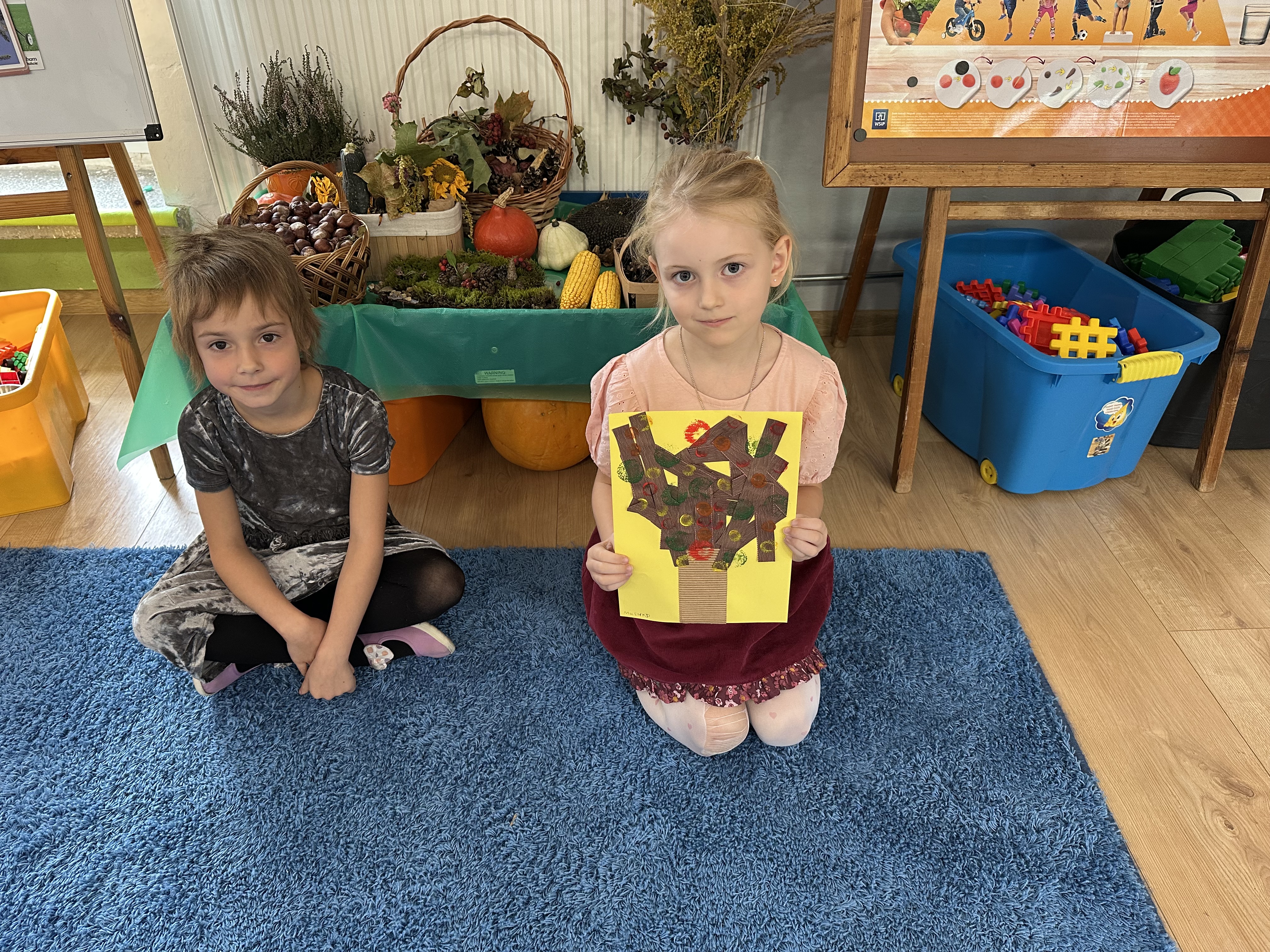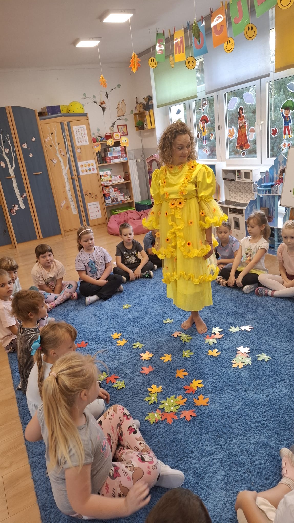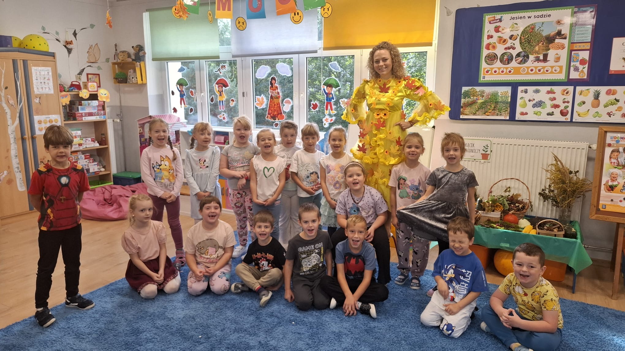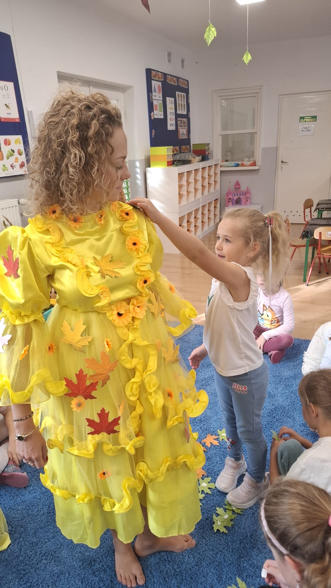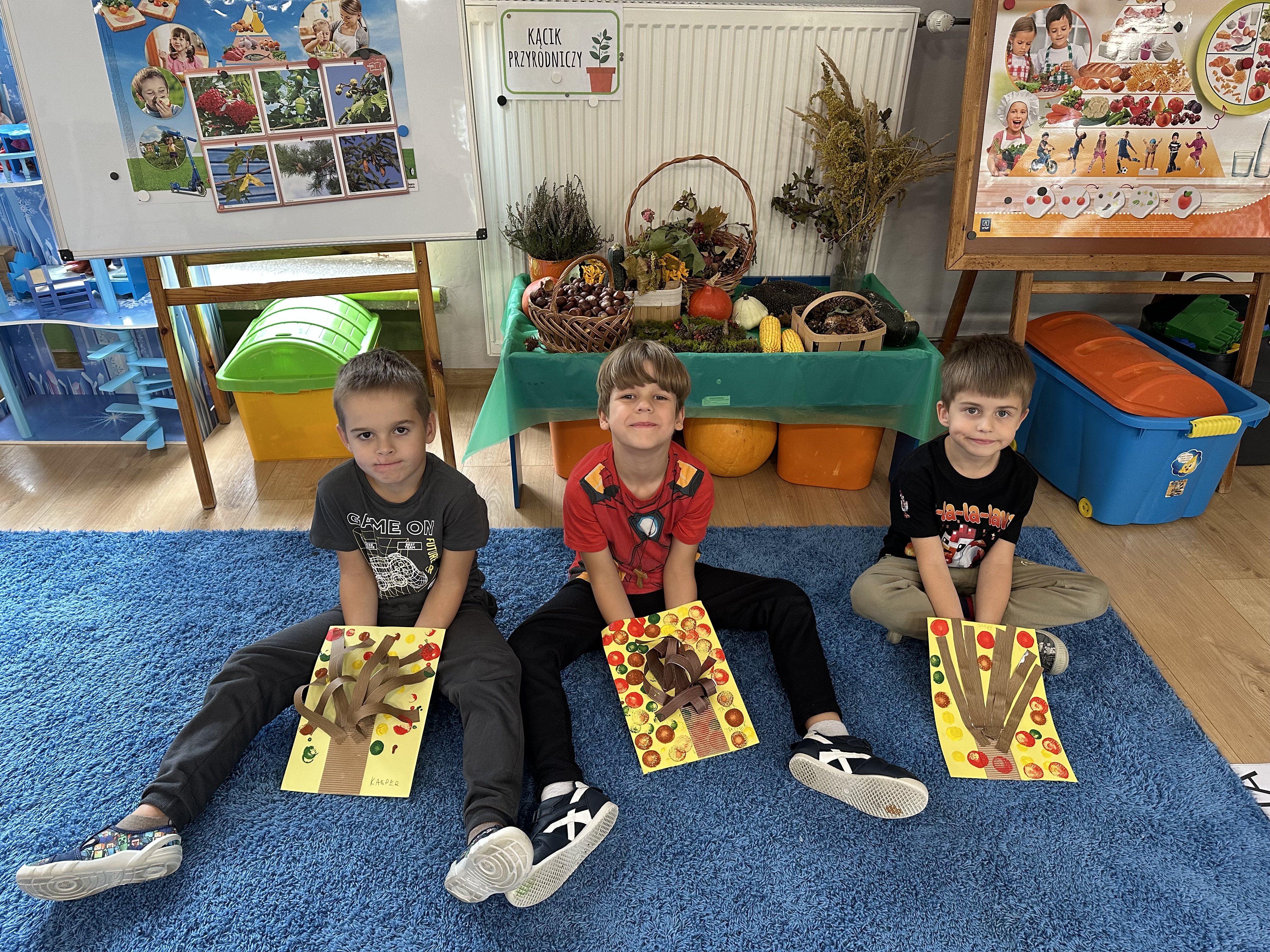 W poniedziałek po zabawie ,,Wokół kolorów” kształtującej koncentrację, dzieci uczestniczyły w porannych ćwiczeniach gimnastycznych, rozwijały tym samym duże grupy mięśniowe. Następnie wysłuchały opowiadania Marii Pawlisz ,,Skarby jesieni” i wspólnie zastanawiały się, w jaki sposób można zachwycać się jesienią, i co jest w niej takiego nadzwyczajnego. Omawiały również symbole i skarby jesieni. Dzieci brały udział w zabawach ruchowych o tematyce jesiennej. Podczas ,,Jesiennych rozmów” wymieniały się doświadczeniami i na podstawie wcześniej wysłuchanego opowiadania odpowiadały na pytania nauczyciela. Utrwalały nazwy jesiennych ubrań i uczestniczyły w zabawie ,,ciepło – zimno”. Po zaśpiewaniu powitanki wtorek dzieci zaczęły zabawą logopedyczną, rozwijającą prawidłową motorykę narządów mowy. Wysłuchały wiersza ,,Wrzesień” Józefa Birkenmajera i brały aktywny udział w rozmowie dotyczącej owoców i potraw, które się z nich przyrządza. Tego dnia poznały literę O, o. Podczas zabaw językowych i fonacyjnych dokonywały syntezy i analizy głoskowej wyrazu ,,owoce” oraz układały schemat tego słowa z kartoników. Samodzielnie, po zapoznaniu z zapisem graficznym małej i wielkiej litery o, O, pisały ją palcem wskazującym na dywanie. Podczas zabaw przy stolikach rozwijały grafomotorykę, rysowały szlaczek po śladzie i ozdabiały szablon litery O. W środowy poranek dzieci ćwiczyły pamięć wzrokową poprzez zapamiętywanie ułożenia figur geometrycznych. Podczas zabaw „O znakach”, „Auta i piesi”, „Kolor i kształt znaku” i „Po kałużach” dzieci zapoznały się ze znakami drogowymi. Dowiedziały się, jakie znaki wyróżniamy (informacyjne, ostrzegawcze i zakazu) oraz nauczyły się podstawowych zwrotów po angielsku. Podczas zabaw przy stolikach wykonywały zadania zgodnie z kodem. Czwartek dotyczył witamin oraz jesiennych owoców. Dzieci dowiedziały się o korzystnym wpływie owoców na zdrowie. Podczas zabawy „Straganiki” zapoznały się z piramidą/talerzem zdrowego żywienia. Próbowały różnych owoców z zasłoniętymi oczami i odgadywały, co to za owoc. Podczas zabaw „Witaminy w moim brzuchu” i „Zjem, bo wiem” dowiedziały się, czym są witaminy i gdzie można je znaleźć. Dzień zakończyły kulinarną zabawą i degustacją owocowych szaszłyków. W piątek dzieci bawiły się do muzyki klasycznej, kształtując tym samym wyczucie rytmu i reakcje na zmianę charakteru muzyki. Wysłuchały wiersza Wandy Chotomskiej ,,Deszcz”, który był wprowadzeniem do rozmowy dotyczącej artystycznej inspiracji jesienią. Przypominały sobie tekst ,,Domowej piosenki” i naśladowały do niej różne czynności związane ze zwierzętami. Podczas zabaw przy stolikach wykonały pracę plastyczno-techniczną według instrukcji. Nie zabrakło zabaw przyrodniczych na dworze z wykorzystaniem nowych słówek w języku angielskim. Przedszkolaki utrwaliły znajomość kolorów po angielsku. Dzień skończyły dzień wykonaniem pracy związanej z jesienną, martwą naturą.