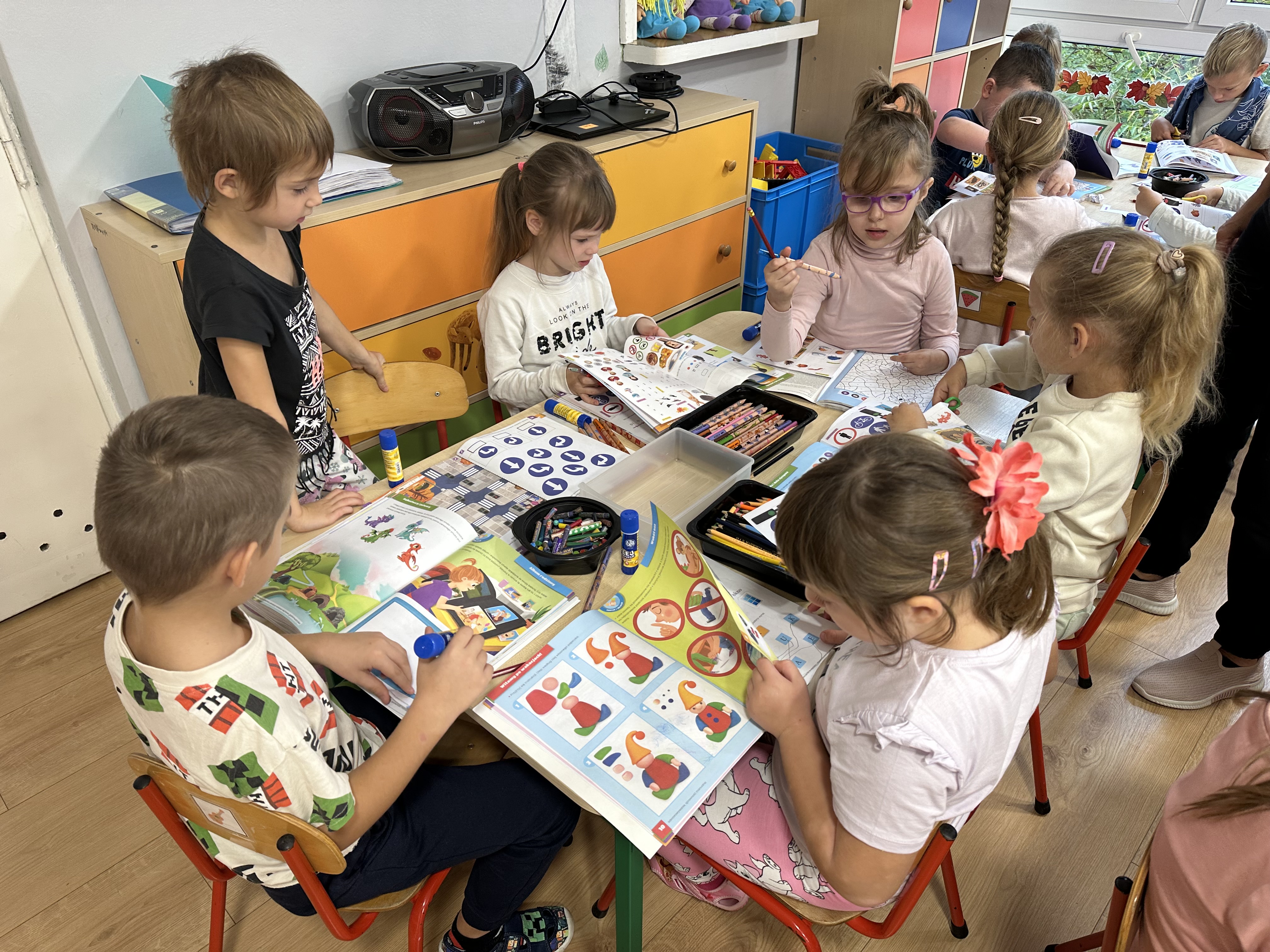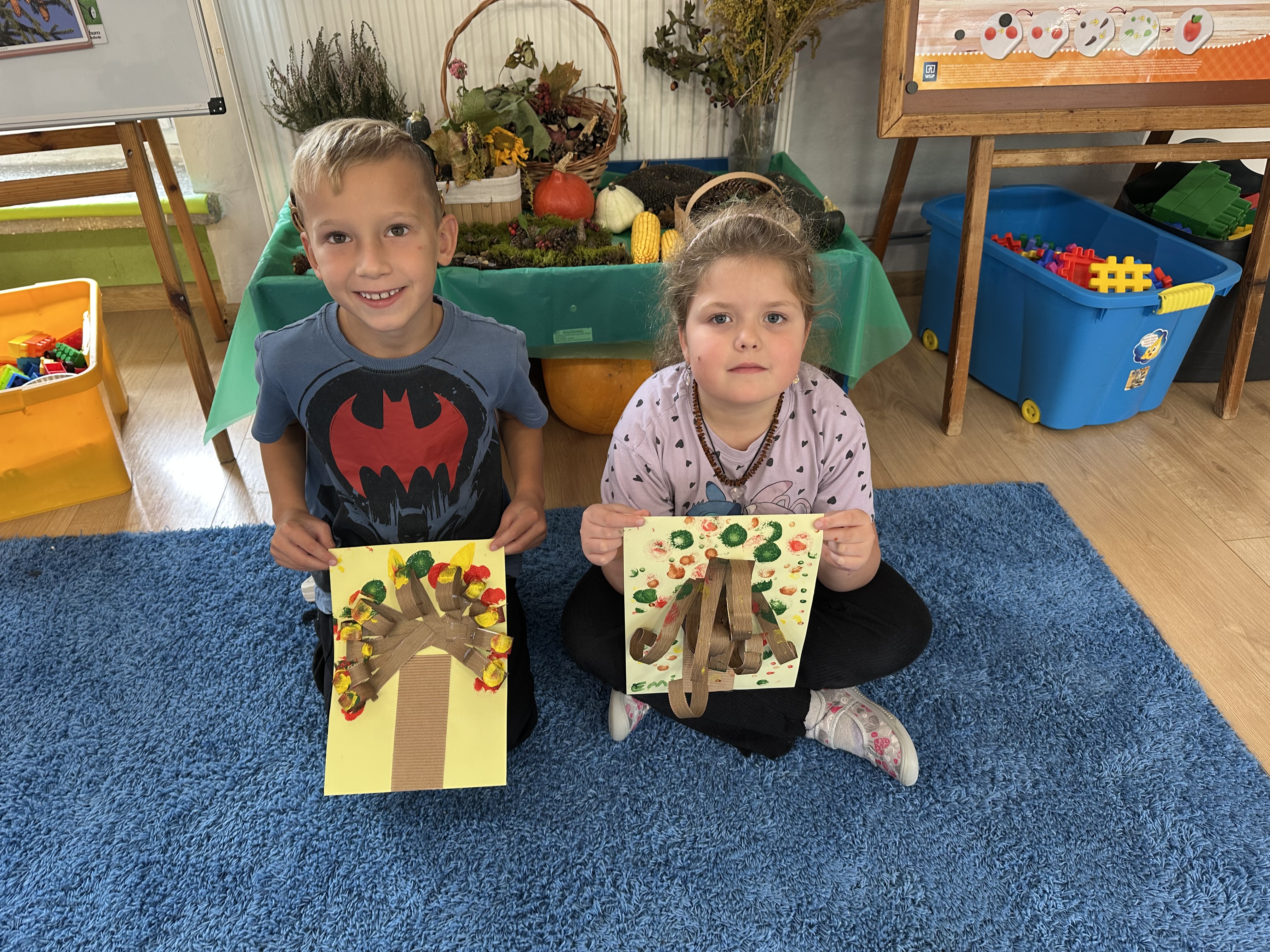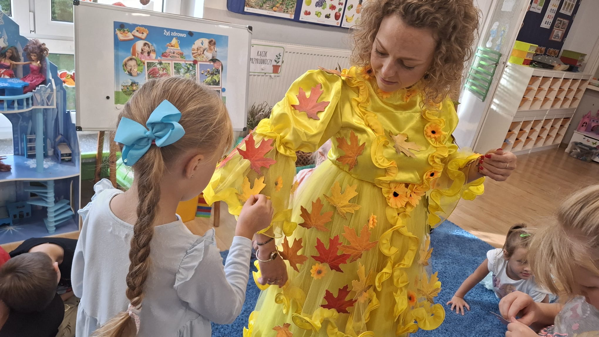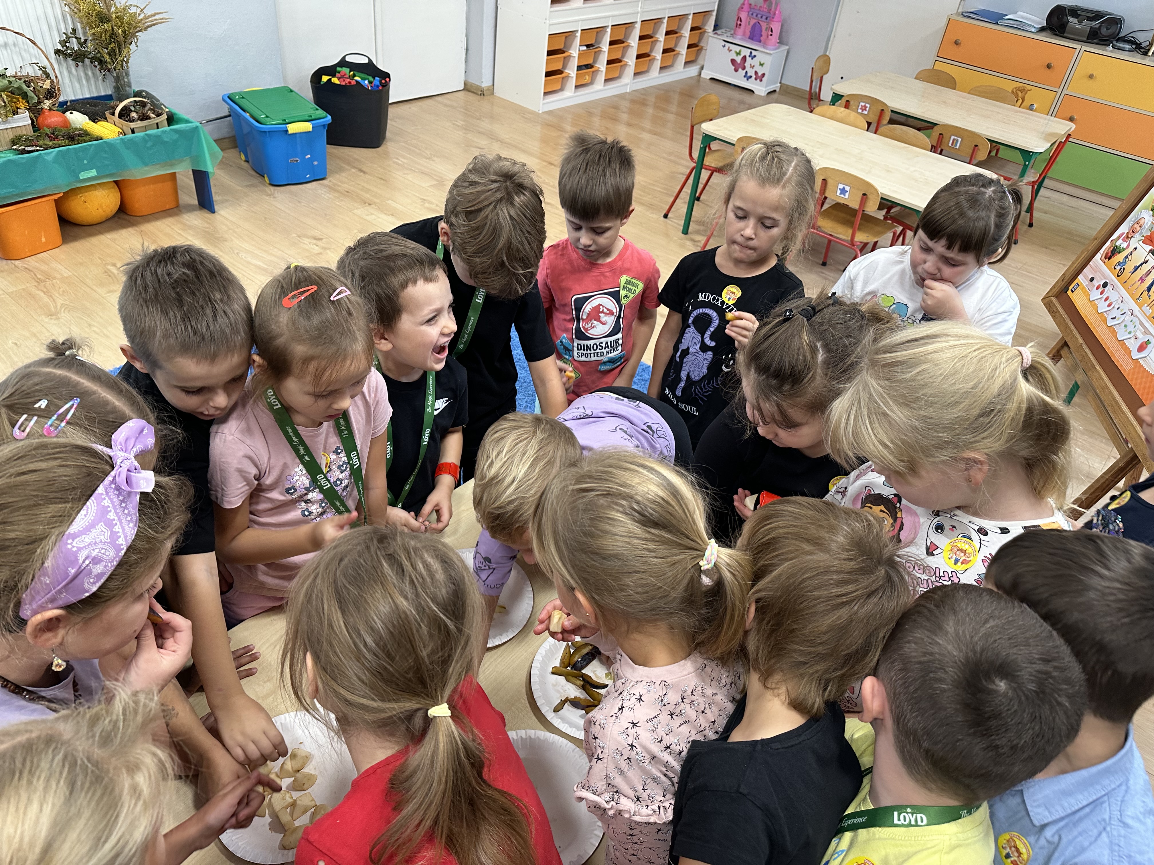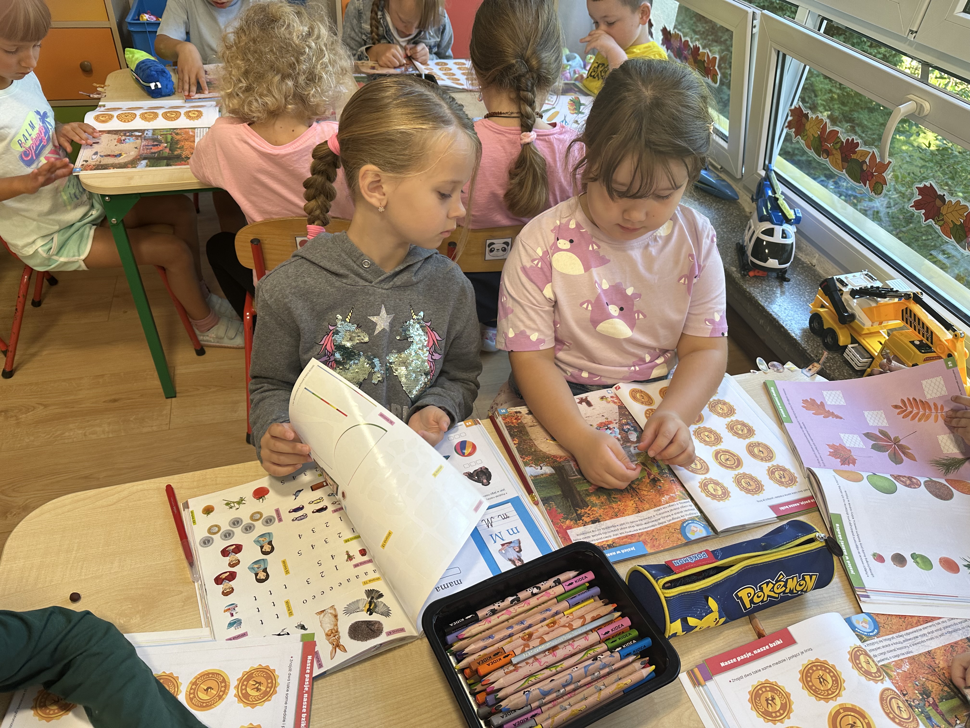 W poniedziałek po zabawie ,,Wokół kolorów” kształtującej koncentrację, dzieci uczestniczyły w porannych ćwiczeniach gimnastycznych, rozwijały tym samym duże grupy mięśniowe. Następnie wysłuchały opowiadania Marii Pawlisz ,,Skarby jesieni” i wspólnie zastanawiały się, w jaki sposób można zachwycać się jesienią, i co jest w niej takiego nadzwyczajnego. Omawiały również symbole i skarby jesieni. Dzieci brały udział w zabawach ruchowych o tematyce jesiennej. Podczas ,,Jesiennych rozmów” wymieniały się doświadczeniami i na podstawie wcześniej wysłuchanego opowiadania odpowiadały na pytania nauczyciela. Utrwalały nazwy jesiennych ubrań i uczestniczyły w zabawie ,,ciepło – zimno”. Po zaśpiewaniu powitanki wtorek dzieci zaczęły zabawą logopedyczną, rozwijającą prawidłową motorykę narządów mowy. Wysłuchały wiersza ,,Wrzesień” Józefa Birkenmajera i brały aktywny udział w rozmowie dotyczącej owoców i potraw, które się z nich przyrządza. Tego dnia poznały literę O, o. Podczas zabaw językowych i fonacyjnych dokonywały syntezy i analizy głoskowej wyrazu ,,owoce” oraz układały schemat tego słowa z kartoników. Samodzielnie, po zapoznaniu z zapisem graficznym małej i wielkiej litery o, O, pisały ją palcem wskazującym na dywanie. Podczas zabaw przy stolikach rozwijały grafomotorykę, rysowały szlaczek po śladzie i ozdabiały szablon litery O. W środowy poranek dzieci ćwiczyły pamięć wzrokową poprzez zapamiętywanie ułożenia figur geometrycznych. Podczas zabaw „O znakach”, „Auta i piesi”, „Kolor i kształt znaku” i „Po kałużach” dzieci zapoznały się ze znakami drogowymi. Dowiedziały się, jakie znaki wyróżniamy (informacyjne, ostrzegawcze i zakazu) oraz nauczyły się podstawowych zwrotów po angielsku. Podczas zabaw przy stolikach wykonywały zadania zgodnie z kodem. Czwartek dotyczył witamin oraz jesiennych owoców. Dzieci dowiedziały się o korzystnym wpływie owoców na zdrowie. Podczas zabawy „Straganiki” zapoznały się z piramidą/talerzem zdrowego żywienia. Próbowały różnych owoców z zasłoniętymi oczami i odgadywały, co to za owoc. Podczas zabaw „Witaminy w moim brzuchu” i „Zjem, bo wiem” dowiedziały się, czym są witaminy i gdzie można je znaleźć. Dzień zakończyły kulinarną zabawą i degustacją owocowych szaszłyków. W piątek dzieci bawiły się do muzyki klasycznej, kształtując tym samym wyczucie rytmu i reakcje na zmianę charakteru muzyki. Wysłuchały wiersza Wandy Chotomskiej ,,Deszcz”, który był wprowadzeniem do rozmowy dotyczącej artystycznej inspiracji jesienią. Przypominały sobie tekst ,,Domowej piosenki” i naśladowały do niej różne czynności związane ze zwierzętami. Podczas zabaw przy stolikach wykonały pracę plastyczno-techniczną według instrukcji. Nie zabrakło zabaw przyrodniczych na dworze z wykorzystaniem nowych słówek w języku angielskim. Przedszkolaki utrwaliły znajomość kolorów po angielsku. Dzień skończyły dzień wykonaniem pracy związanej z jesienną, martwą naturą.