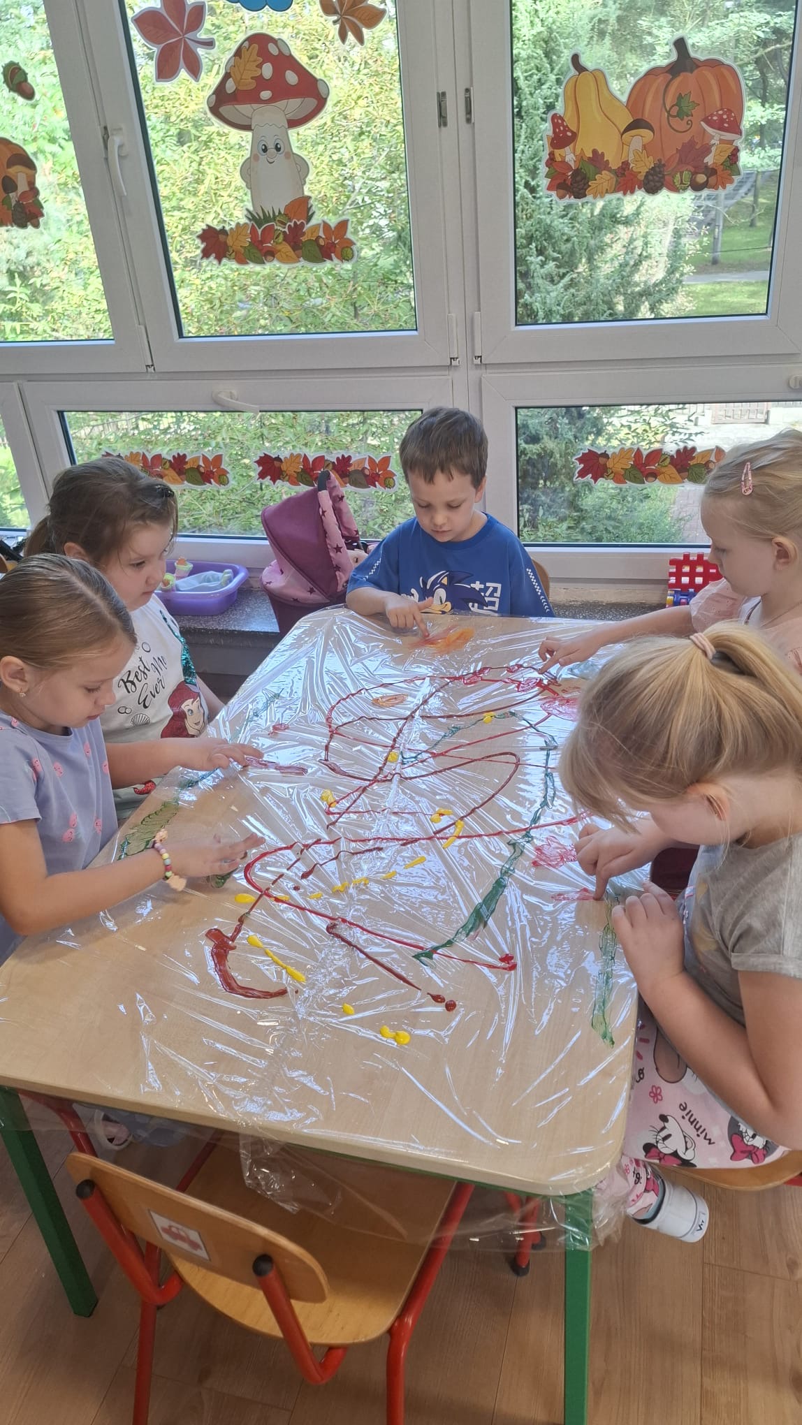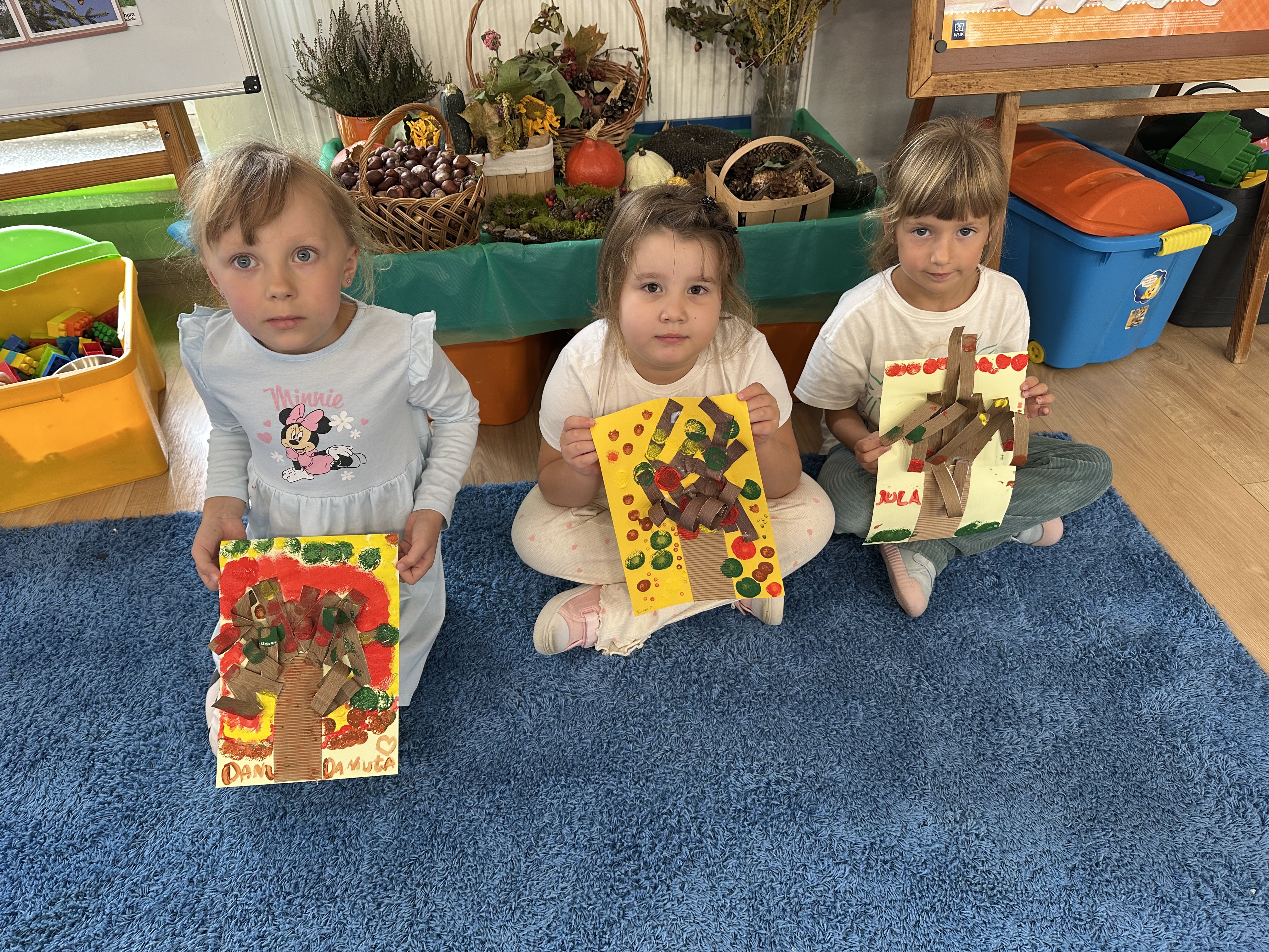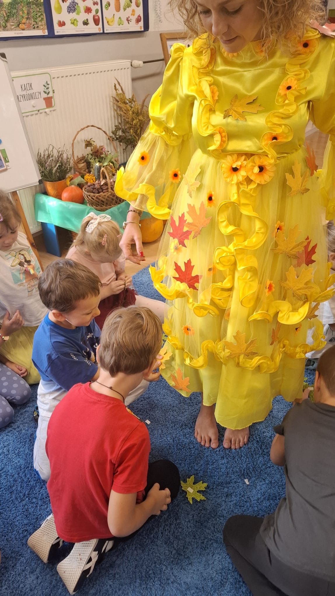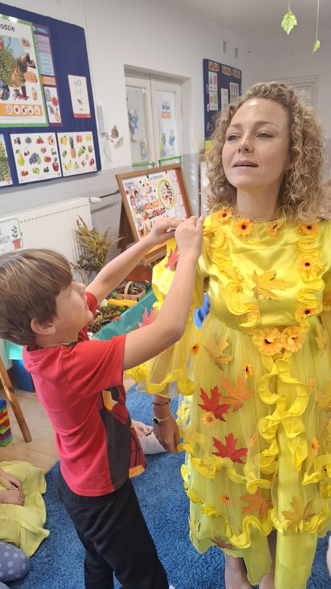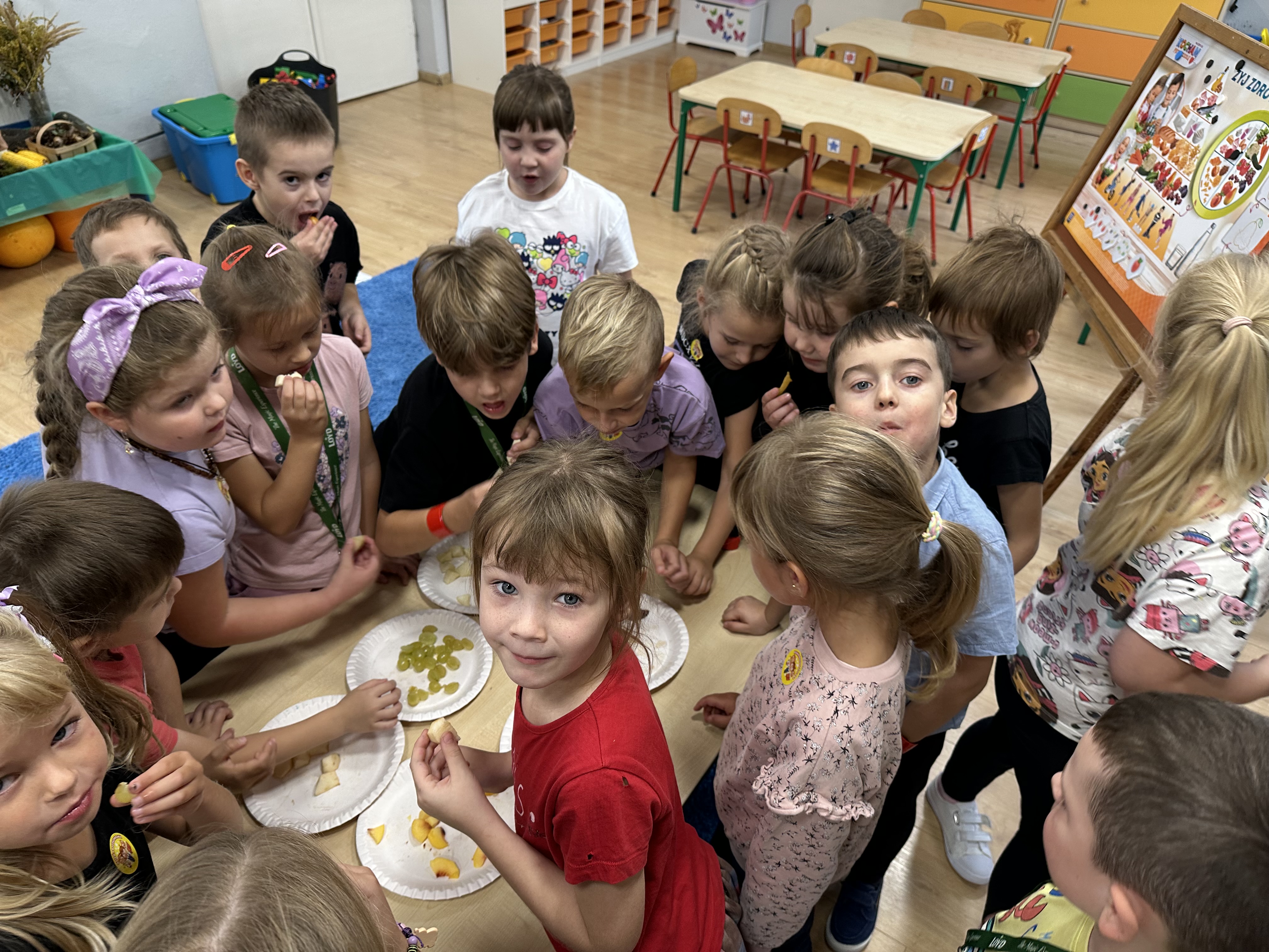 W poniedziałek po zabawie ,,Wokół kolorów” kształtującej koncentrację, dzieci uczestniczyły w porannych ćwiczeniach gimnastycznych, rozwijały tym samym duże grupy mięśniowe. Następnie wysłuchały opowiadania Marii Pawlisz ,,Skarby jesieni” i wspólnie zastanawiały się, w jaki sposób można zachwycać się jesienią, i co jest w niej takiego nadzwyczajnego. Omawiały również symbole i skarby jesieni. Dzieci brały udział w zabawach ruchowych o tematyce jesiennej. Podczas ,,Jesiennych rozmów” wymieniały się doświadczeniami i na podstawie wcześniej wysłuchanego opowiadania odpowiadały na pytania nauczyciela. Utrwalały nazwy jesiennych ubrań i uczestniczyły w zabawie ,,ciepło – zimno”. Po zaśpiewaniu powitanki wtorek dzieci zaczęły zabawą logopedyczną, rozwijającą prawidłową motorykę narządów mowy. Wysłuchały wiersza ,,Wrzesień” Józefa Birkenmajera i brały aktywny udział w rozmowie dotyczącej owoców i potraw, które się z nich przyrządza. Tego dnia poznały literę O, o. Podczas zabaw językowych i fonacyjnych dokonywały syntezy i analizy głoskowej wyrazu ,,owoce” oraz układały schemat tego słowa z kartoników. Samodzielnie, po zapoznaniu z zapisem graficznym małej i wielkiej litery o, O, pisały ją palcem wskazującym na dywanie. Podczas zabaw przy stolikach rozwijały grafomotorykę, rysowały szlaczek po śladzie i ozdabiały szablon litery O. W środowy poranek dzieci ćwiczyły pamięć wzrokową poprzez zapamiętywanie ułożenia figur geometrycznych. Podczas zabaw „O znakach”, „Auta i piesi”, „Kolor i kształt znaku” i „Po kałużach” dzieci zapoznały się ze znakami drogowymi. Dowiedziały się, jakie znaki wyróżniamy (informacyjne, ostrzegawcze i zakazu) oraz nauczyły się podstawowych zwrotów po angielsku. Podczas zabaw przy stolikach wykonywały zadania zgodnie z kodem. Czwartek dotyczył witamin oraz jesiennych owoców. Dzieci dowiedziały się o korzystnym wpływie owoców na zdrowie. Podczas zabawy „Straganiki” zapoznały się z piramidą/talerzem zdrowego żywienia. Próbowały różnych owoców z zasłoniętymi oczami i odgadywały, co to za owoc. Podczas zabaw „Witaminy w moim brzuchu” i „Zjem, bo wiem” dowiedziały się, czym są witaminy i gdzie można je znaleźć. Dzień zakończyły kulinarną zabawą i degustacją owocowych szaszłyków. W piątek dzieci bawiły się do muzyki klasycznej, kształtując tym samym wyczucie rytmu i reakcje na zmianę charakteru muzyki. Wysłuchały wiersza Wandy Chotomskiej ,,Deszcz”, który był wprowadzeniem do rozmowy dotyczącej artystycznej inspiracji jesienią. Przypominały sobie tekst ,,Domowej piosenki” i naśladowały do niej różne czynności związane ze zwierzętami. Podczas zabaw przy stolikach wykonały pracę plastyczno-techniczną według instrukcji. Nie zabrakło zabaw przyrodniczych na dworze z wykorzystaniem nowych słówek w języku angielskim. Przedszkolaki utrwaliły znajomość kolorów po angielsku. Dzień skończyły dzień wykonaniem pracy związanej z jesienną, martwą naturą.