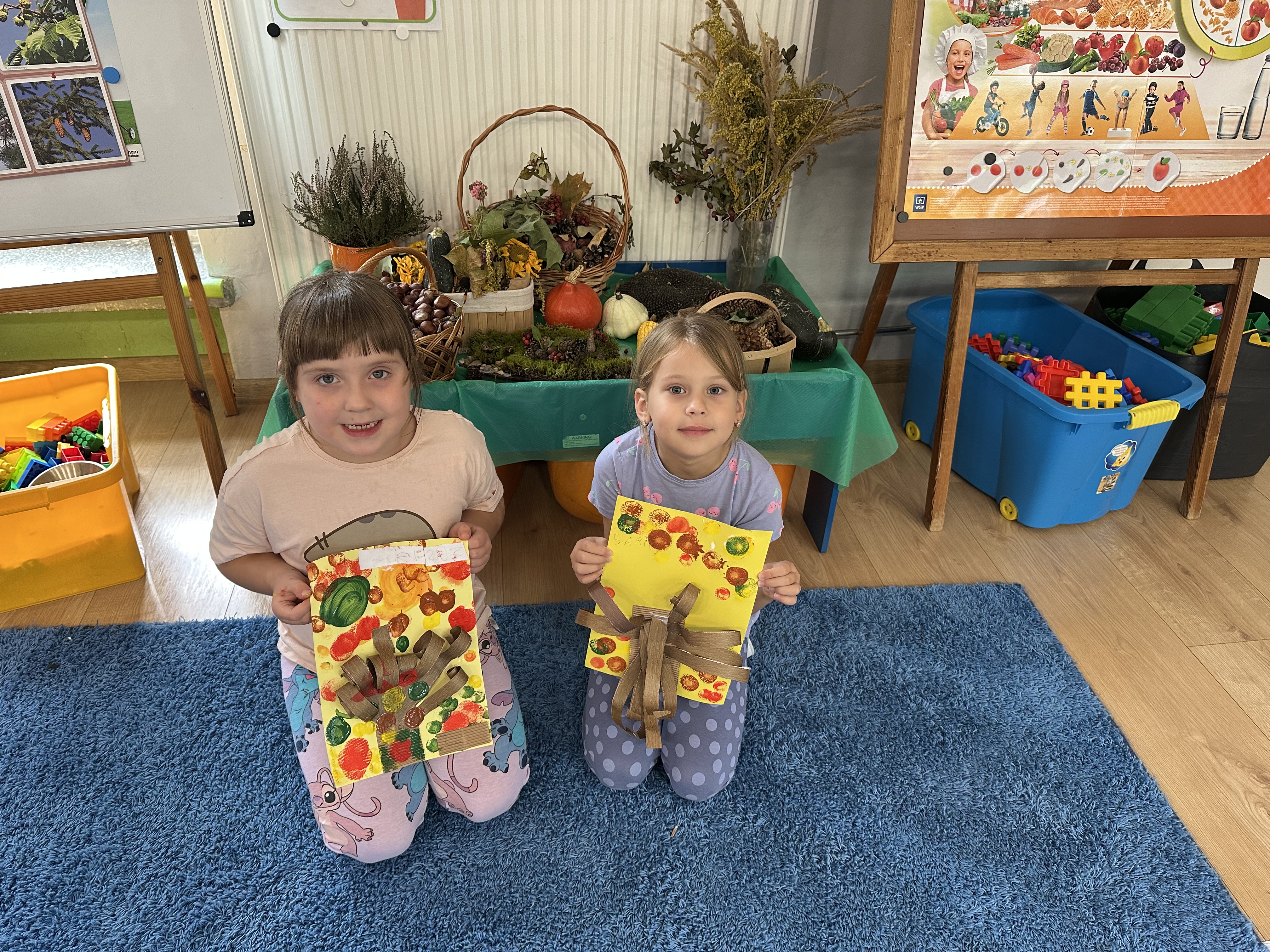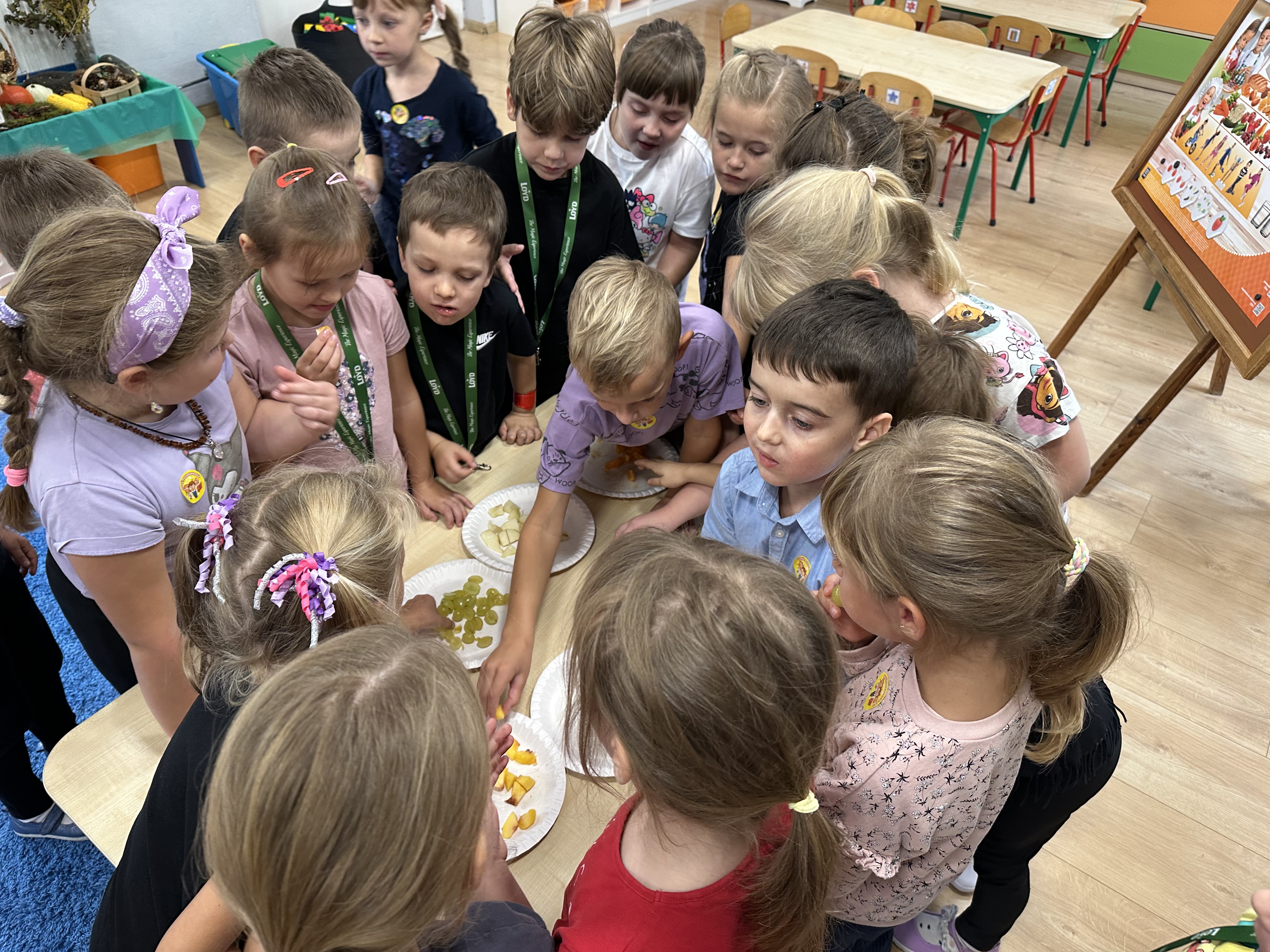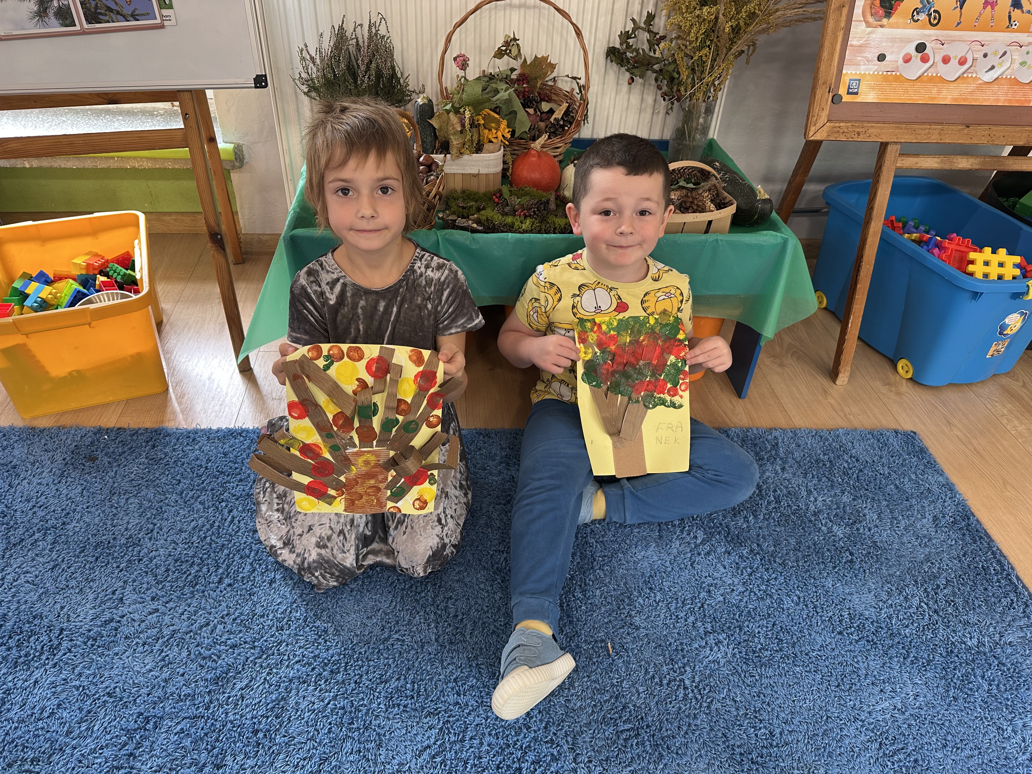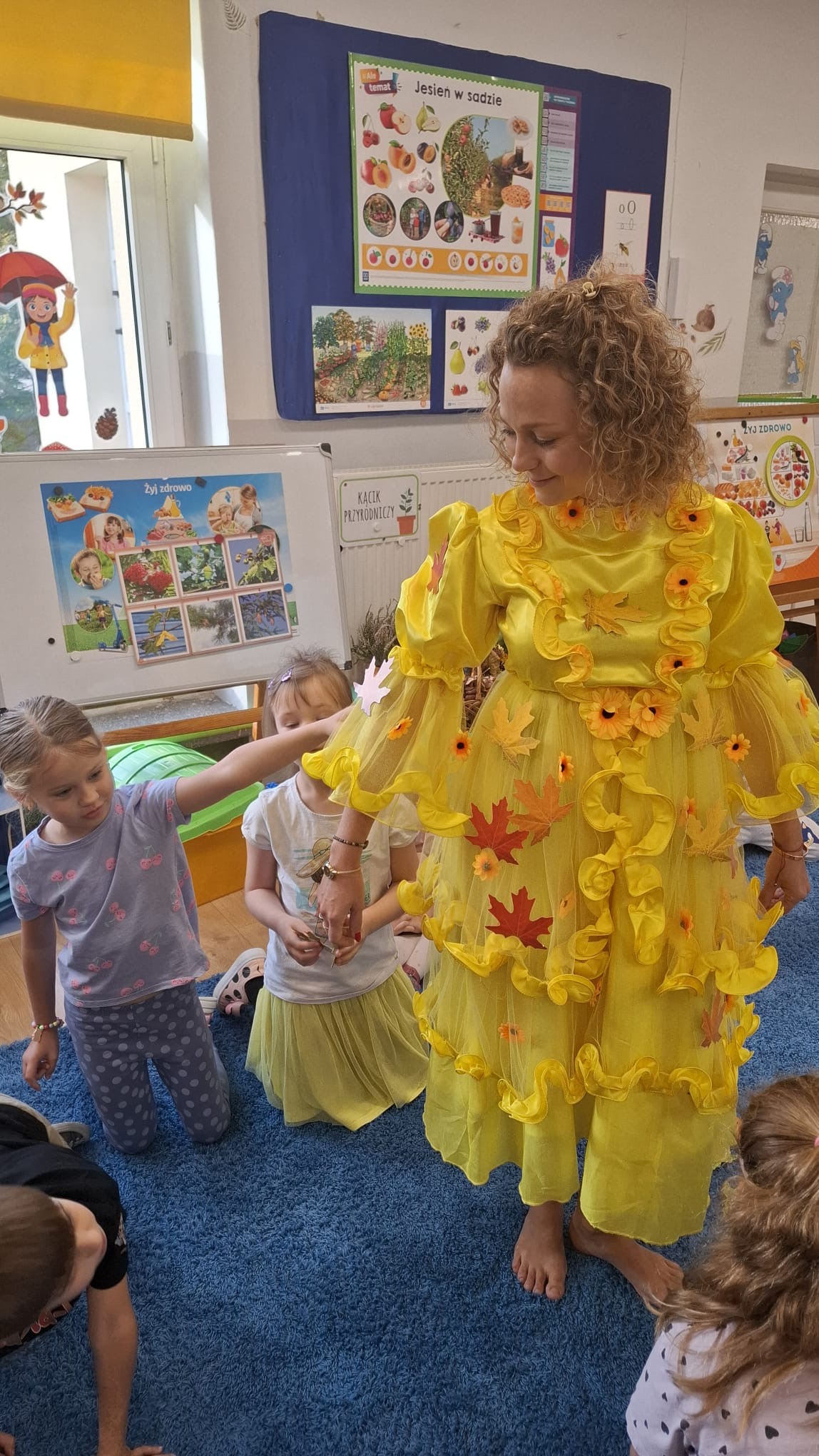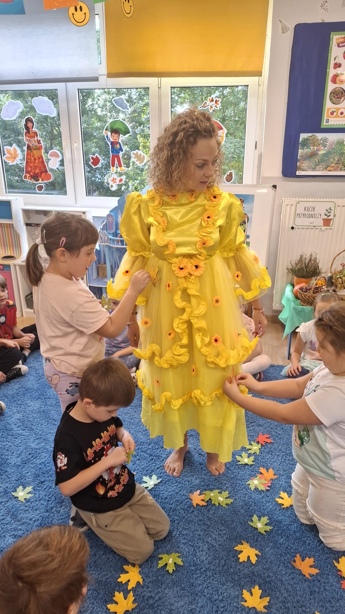 W poniedziałek po zabawie ,,Wokół kolorów” kształtującej koncentrację, dzieci uczestniczyły w porannych ćwiczeniach gimnastycznych, rozwijały tym samym duże grupy mięśniowe. Następnie wysłuchały opowiadania Marii Pawlisz ,,Skarby jesieni” i wspólnie zastanawiały się, w jaki sposób można zachwycać się jesienią, i co jest w niej takiego nadzwyczajnego. Omawiały również symbole i skarby jesieni. Dzieci brały udział w zabawach ruchowych o tematyce jesiennej. Podczas ,,Jesiennych rozmów” wymieniały się doświadczeniami i na podstawie wcześniej wysłuchanego opowiadania odpowiadały na pytania nauczyciela. Utrwalały nazwy jesiennych ubrań i uczestniczyły w zabawie ,,ciepło – zimno”. Po zaśpiewaniu powitanki wtorek dzieci zaczęły zabawą logopedyczną, rozwijającą prawidłową motorykę narządów mowy. Wysłuchały wiersza ,,Wrzesień” Józefa Birkenmajera i brały aktywny udział w rozmowie dotyczącej owoców i potraw, które się z nich przyrządza. Tego dnia poznały literę O, o. Podczas zabaw językowych i fonacyjnych dokonywały syntezy i analizy głoskowej wyrazu ,,owoce” oraz układały schemat tego słowa z kartoników. Samodzielnie, po zapoznaniu z zapisem graficznym małej i wielkiej litery o, O, pisały ją palcem wskazującym na dywanie. Podczas zabaw przy stolikach rozwijały grafomotorykę, rysowały szlaczek po śladzie i ozdabiały szablon litery O. W środowy poranek dzieci ćwiczyły pamięć wzrokową poprzez zapamiętywanie ułożenia figur geometrycznych. Podczas zabaw „O znakach”, „Auta i piesi”, „Kolor i kształt znaku” i „Po kałużach” dzieci zapoznały się ze znakami drogowymi. Dowiedziały się, jakie znaki wyróżniamy (informacyjne, ostrzegawcze i zakazu) oraz nauczyły się podstawowych zwrotów po angielsku. Podczas zabaw przy stolikach wykonywały zadania zgodnie z kodem. Czwartek dotyczył witamin oraz jesiennych owoców. Dzieci dowiedziały się o korzystnym wpływie owoców na zdrowie. Podczas zabawy „Straganiki” zapoznały się z piramidą/talerzem zdrowego żywienia. Próbowały różnych owoców z zasłoniętymi oczami i odgadywały, co to za owoc. Podczas zabaw „Witaminy w moim brzuchu” i „Zjem, bo wiem” dowiedziały się, czym są witaminy i gdzie można je znaleźć. Dzień zakończyły kulinarną zabawą i degustacją owocowych szaszłyków. W piątek dzieci bawiły się do muzyki klasycznej, kształtując tym samym wyczucie rytmu i reakcje na zmianę charakteru muzyki. Wysłuchały wiersza Wandy Chotomskiej ,,Deszcz”, który był wprowadzeniem do rozmowy dotyczącej artystycznej inspiracji jesienią. Przypominały sobie tekst ,,Domowej piosenki” i naśladowały do niej różne czynności związane ze zwierzętami. Podczas zabaw przy stolikach wykonały pracę plastyczno-techniczną według instrukcji. Nie zabrakło zabaw przyrodniczych na dworze z wykorzystaniem nowych słówek w języku angielskim. Przedszkolaki utrwaliły znajomość kolorów po angielsku. Dzień skończyły dzień wykonaniem pracy związanej z jesienną, martwą naturą.