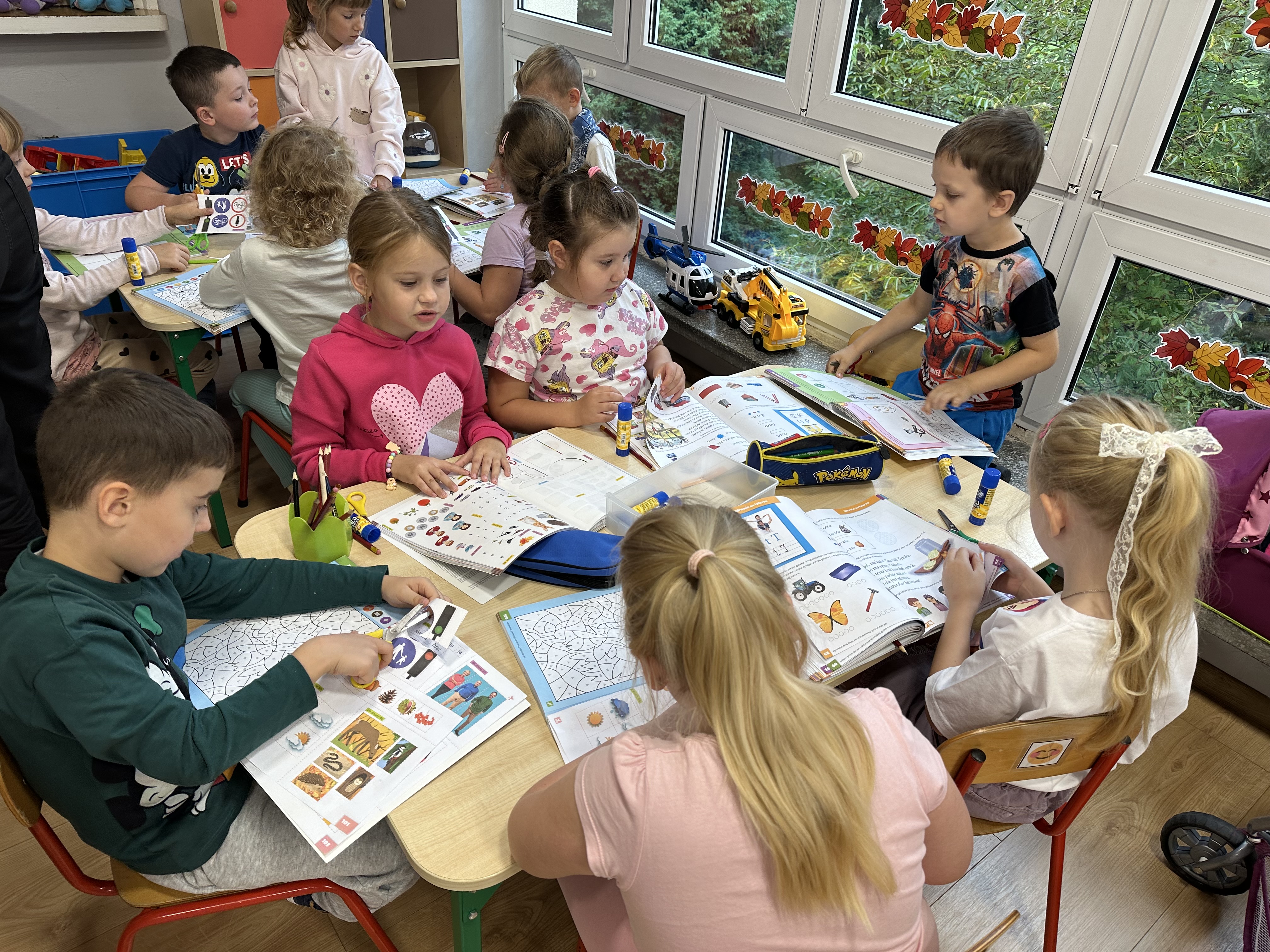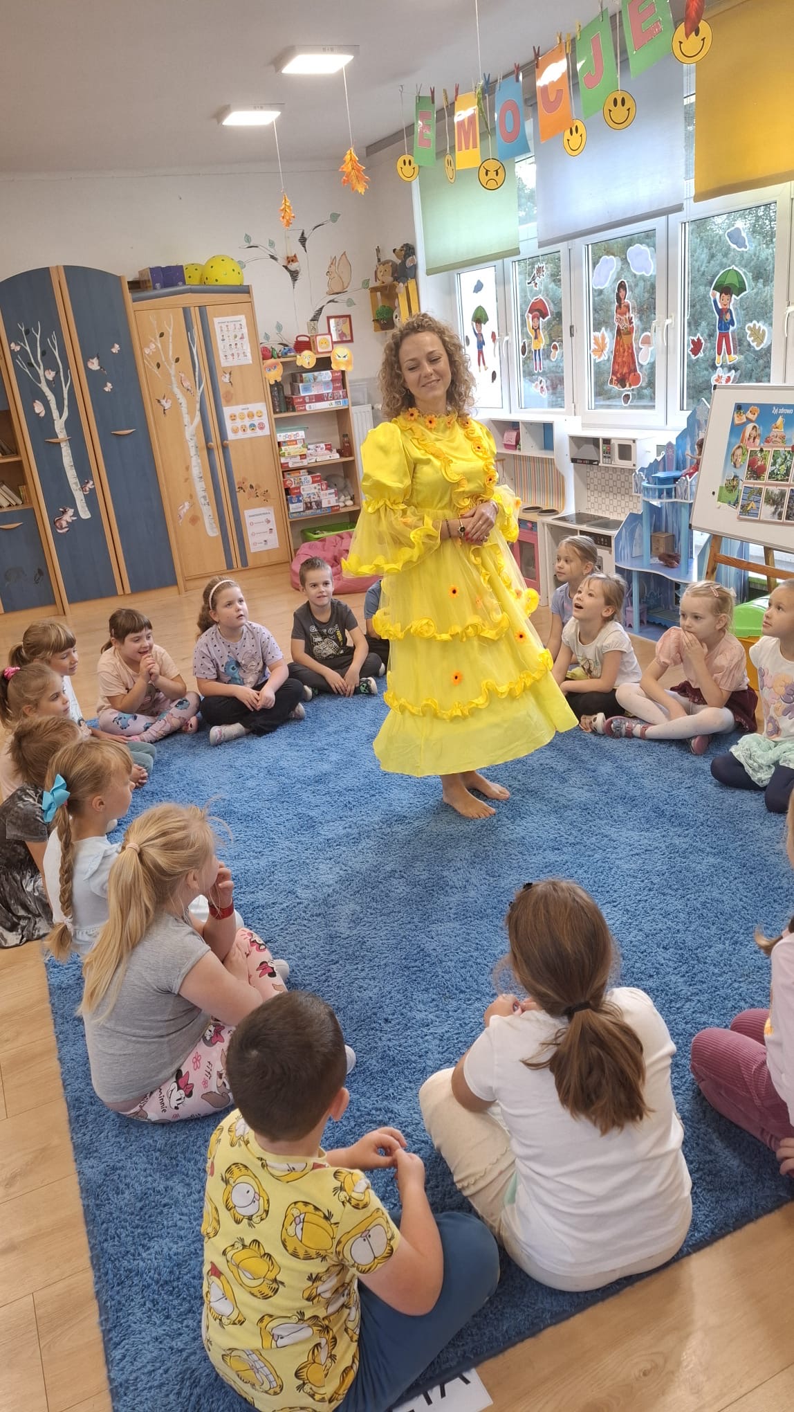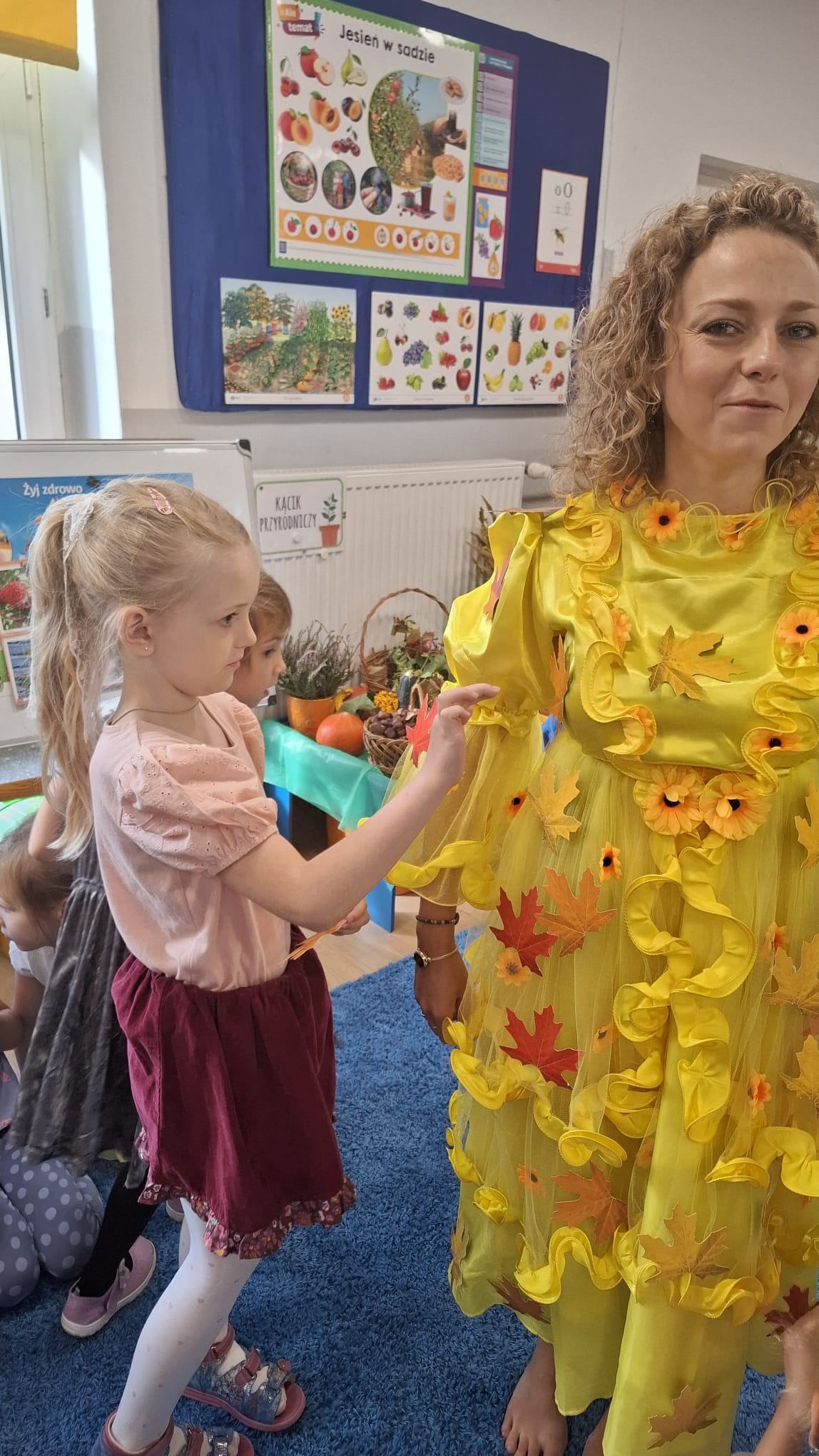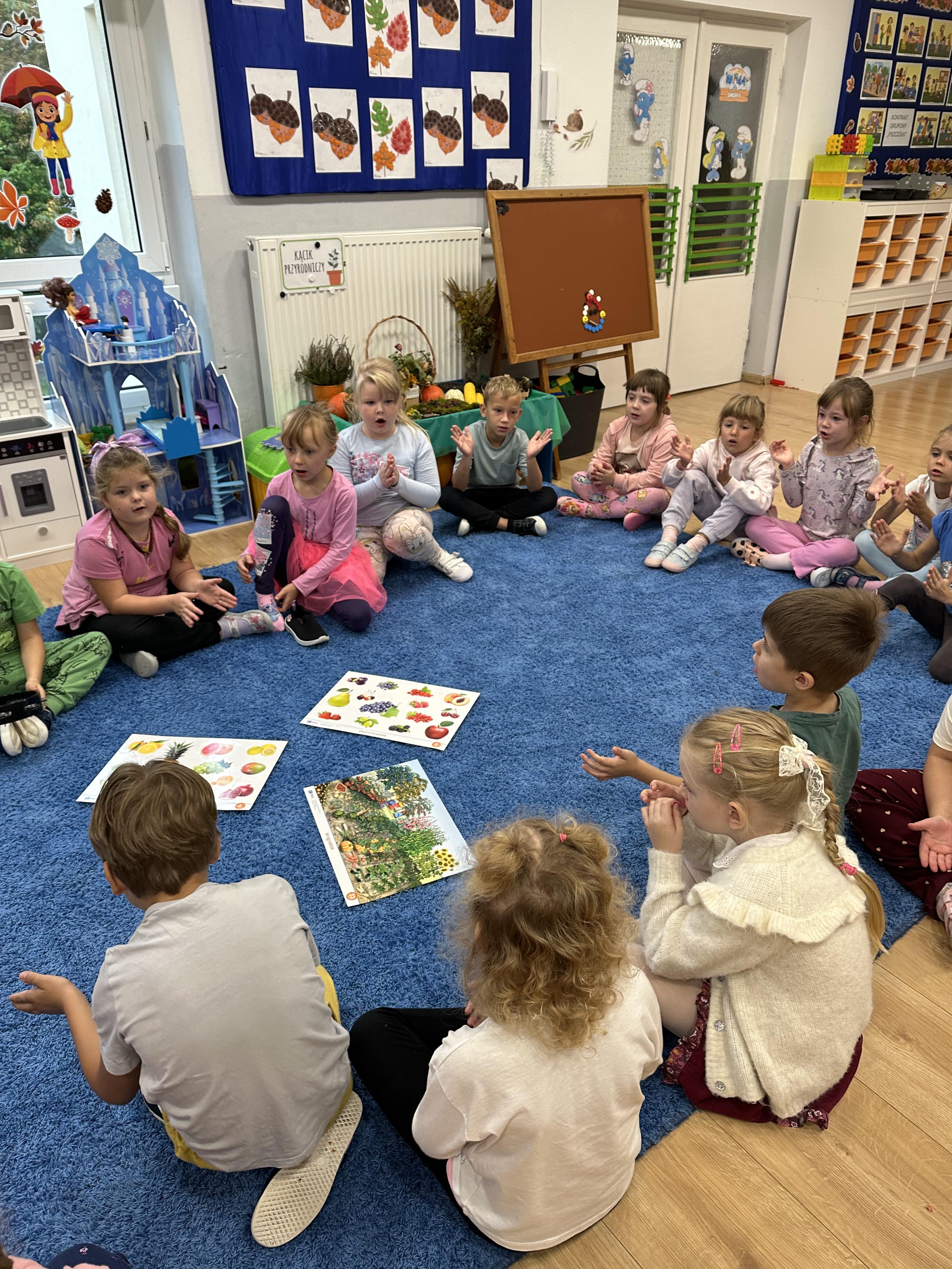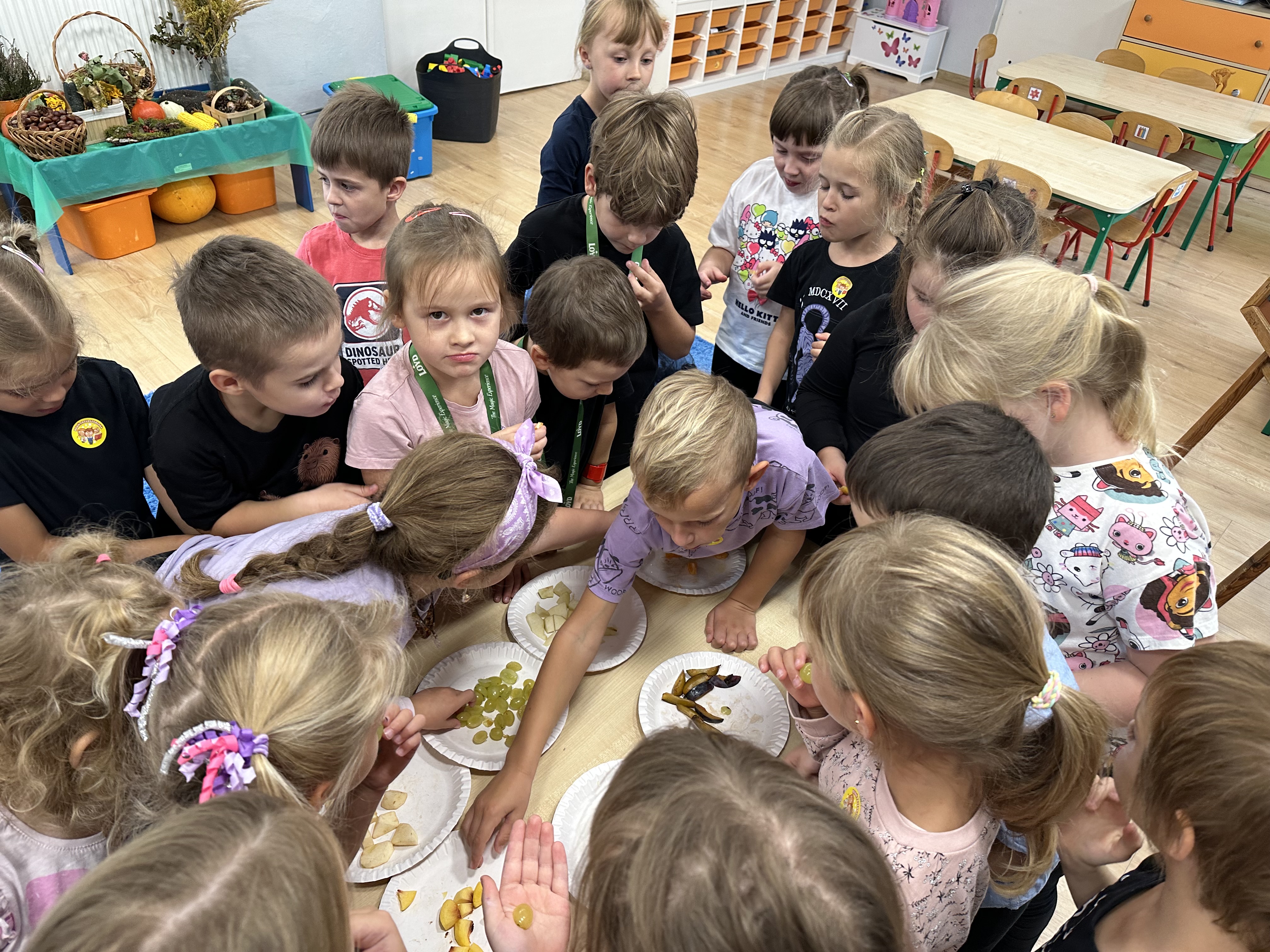 W poniedziałek po zabawie ,,Wokół kolorów” kształtującej koncentrację, dzieci uczestniczyły w porannych ćwiczeniach gimnastycznych, rozwijały tym samym duże grupy mięśniowe. Następnie wysłuchały opowiadania Marii Pawlisz ,,Skarby jesieni” i wspólnie zastanawiały się, w jaki sposób można zachwycać się jesienią, i co jest w niej takiego nadzwyczajnego. Omawiały również symbole i skarby jesieni. Dzieci brały udział w zabawach ruchowych o tematyce jesiennej. Podczas ,,Jesiennych rozmów” wymieniały się doświadczeniami i na podstawie wcześniej wysłuchanego opowiadania odpowiadały na pytania nauczyciela. Utrwalały nazwy jesiennych ubrań i uczestniczyły w zabawie ,,ciepło – zimno”. Po zaśpiewaniu powitanki wtorek dzieci zaczęły zabawą logopedyczną, rozwijającą prawidłową motorykę narządów mowy. Wysłuchały wiersza ,,Wrzesień” Józefa Birkenmajera i brały aktywny udział w rozmowie dotyczącej owoców i potraw, które się z nich przyrządza. Tego dnia poznały literę O, o. Podczas zabaw językowych i fonacyjnych dokonywały syntezy i analizy głoskowej wyrazu ,,owoce” oraz układały schemat tego słowa z kartoników. Samodzielnie, po zapoznaniu z zapisem graficznym małej i wielkiej litery o, O, pisały ją palcem wskazującym na dywanie. Podczas zabaw przy stolikach rozwijały grafomotorykę, rysowały szlaczek po śladzie i ozdabiały szablon litery O. W środowy poranek dzieci ćwiczyły pamięć wzrokową poprzez zapamiętywanie ułożenia figur geometrycznych. Podczas zabaw „O znakach”, „Auta i piesi”, „Kolor i kształt znaku” i „Po kałużach” dzieci zapoznały się ze znakami drogowymi. Dowiedziały się, jakie znaki wyróżniamy (informacyjne, ostrzegawcze i zakazu) oraz nauczyły się podstawowych zwrotów po angielsku. Podczas zabaw przy stolikach wykonywały zadania zgodnie z kodem. Czwartek dotyczył witamin oraz jesiennych owoców. Dzieci dowiedziały się o korzystnym wpływie owoców na zdrowie. Podczas zabawy „Straganiki” zapoznały się z piramidą/talerzem zdrowego żywienia. Próbowały różnych owoców z zasłoniętymi oczami i odgadywały, co to za owoc. Podczas zabaw „Witaminy w moim brzuchu” i „Zjem, bo wiem” dowiedziały się, czym są witaminy i gdzie można je znaleźć. Dzień zakończyły kulinarną zabawą i degustacją owocowych szaszłyków. W piątek dzieci bawiły się do muzyki klasycznej, kształtując tym samym wyczucie rytmu i reakcje na zmianę charakteru muzyki. Wysłuchały wiersza Wandy Chotomskiej ,,Deszcz”, który był wprowadzeniem do rozmowy dotyczącej artystycznej inspiracji jesienią. Przypominały sobie tekst ,,Domowej piosenki” i naśladowały do niej różne czynności związane ze zwierzętami. Podczas zabaw przy stolikach wykonały pracę plastyczno-techniczną według instrukcji. Nie zabrakło zabaw przyrodniczych na dworze z wykorzystaniem nowych słówek w języku angielskim. Przedszkolaki utrwaliły znajomość kolorów po angielsku. Dzień skończyły dzień wykonaniem pracy związanej z jesienną, martwą naturą.