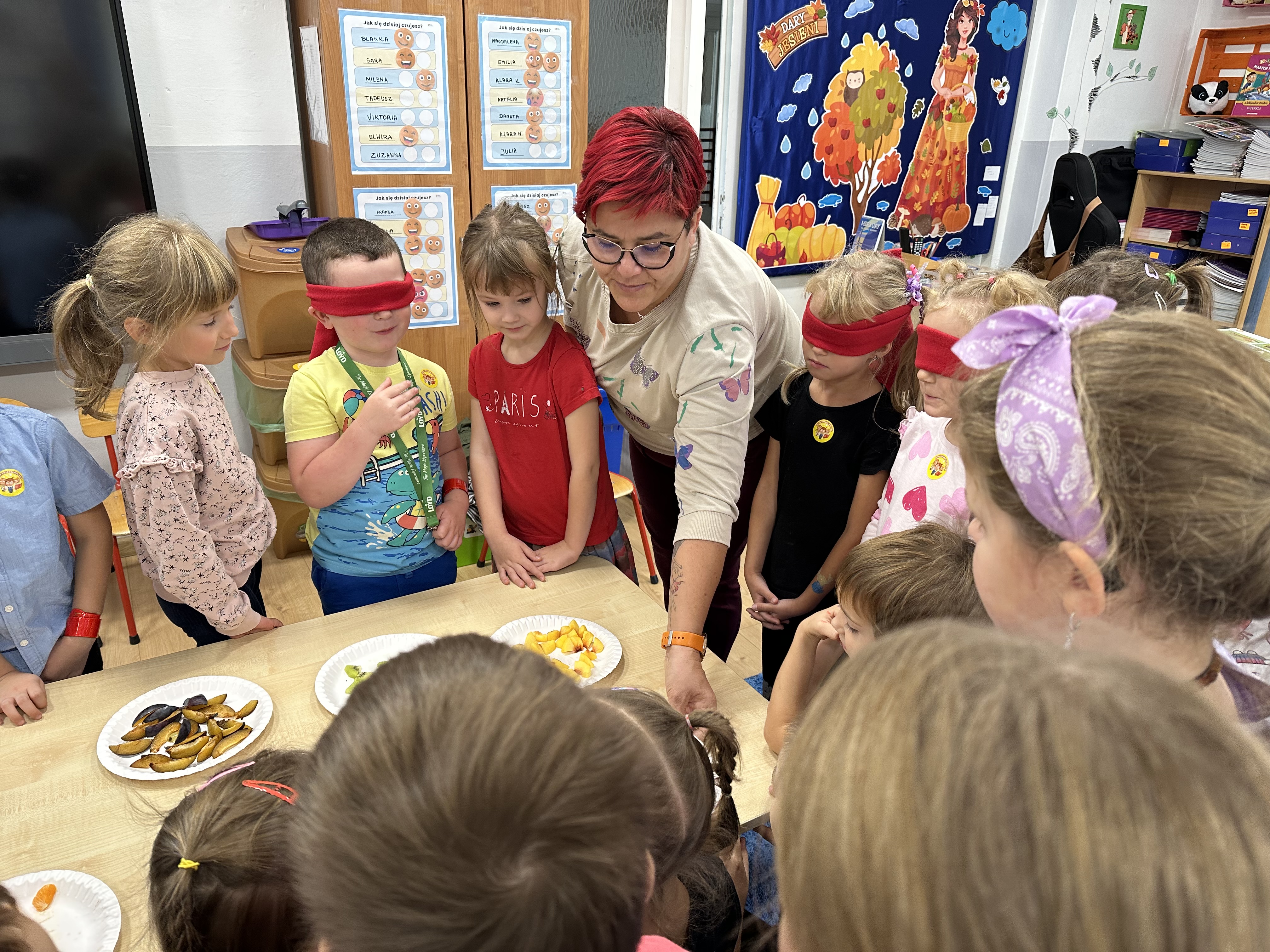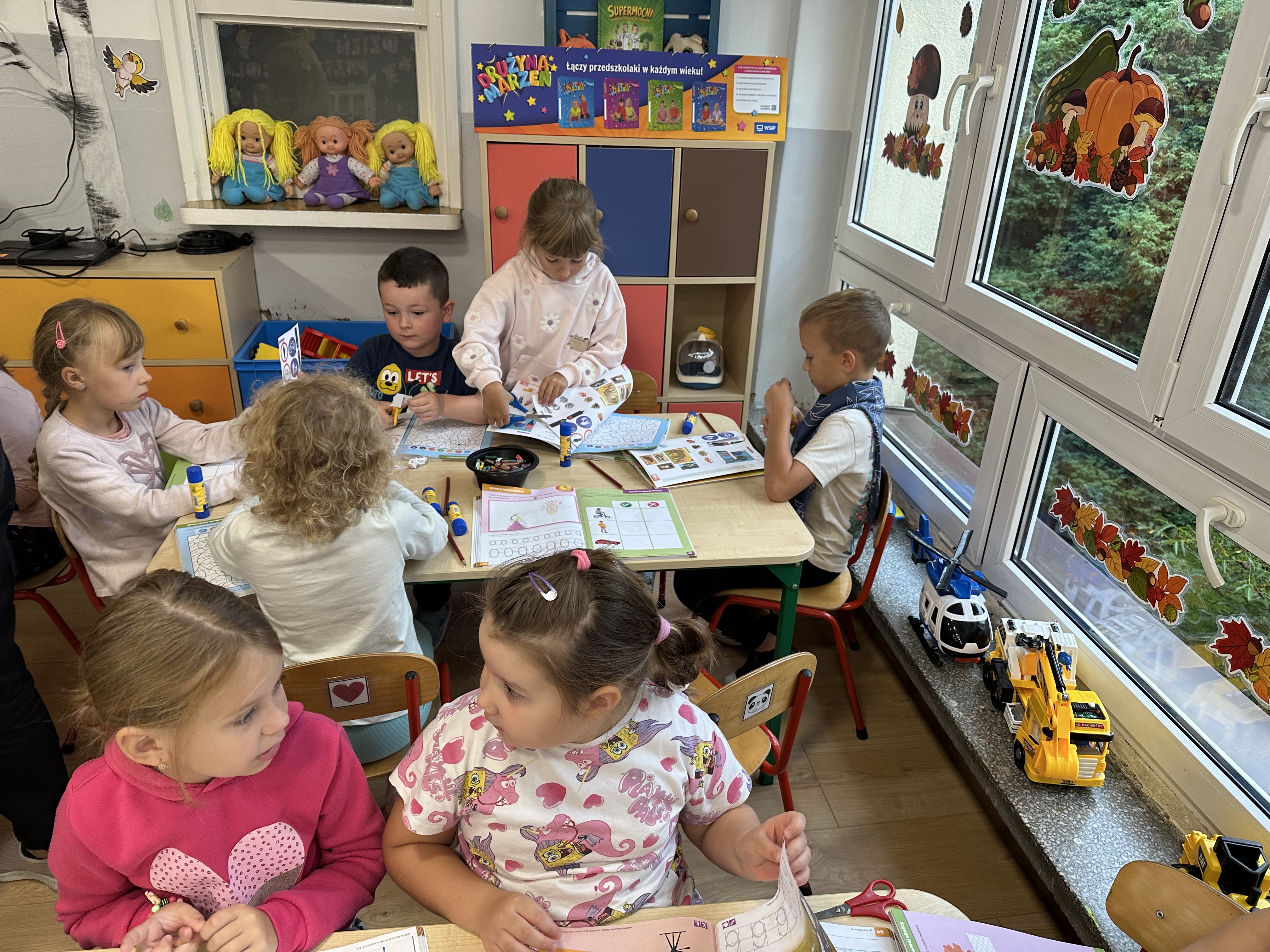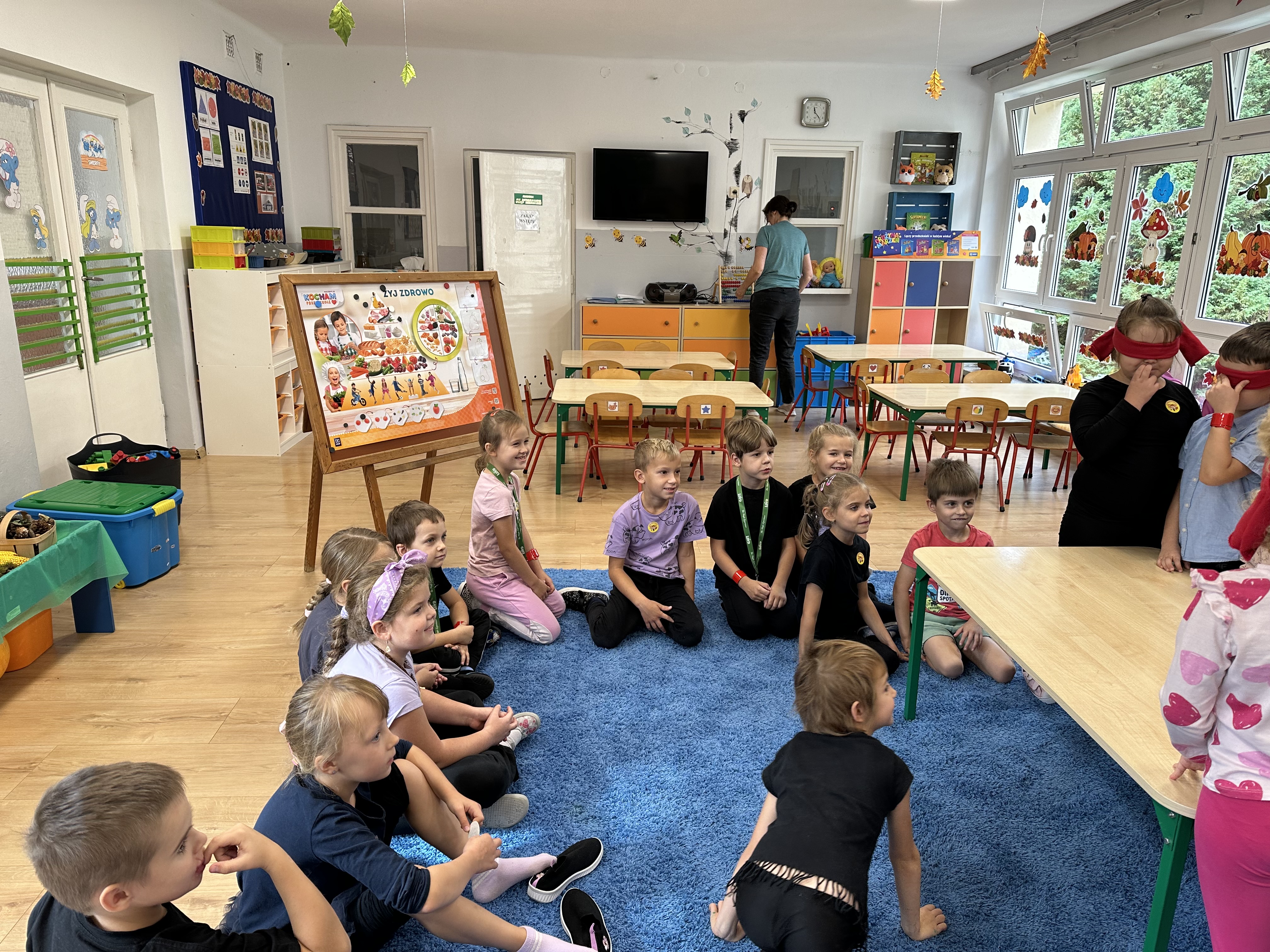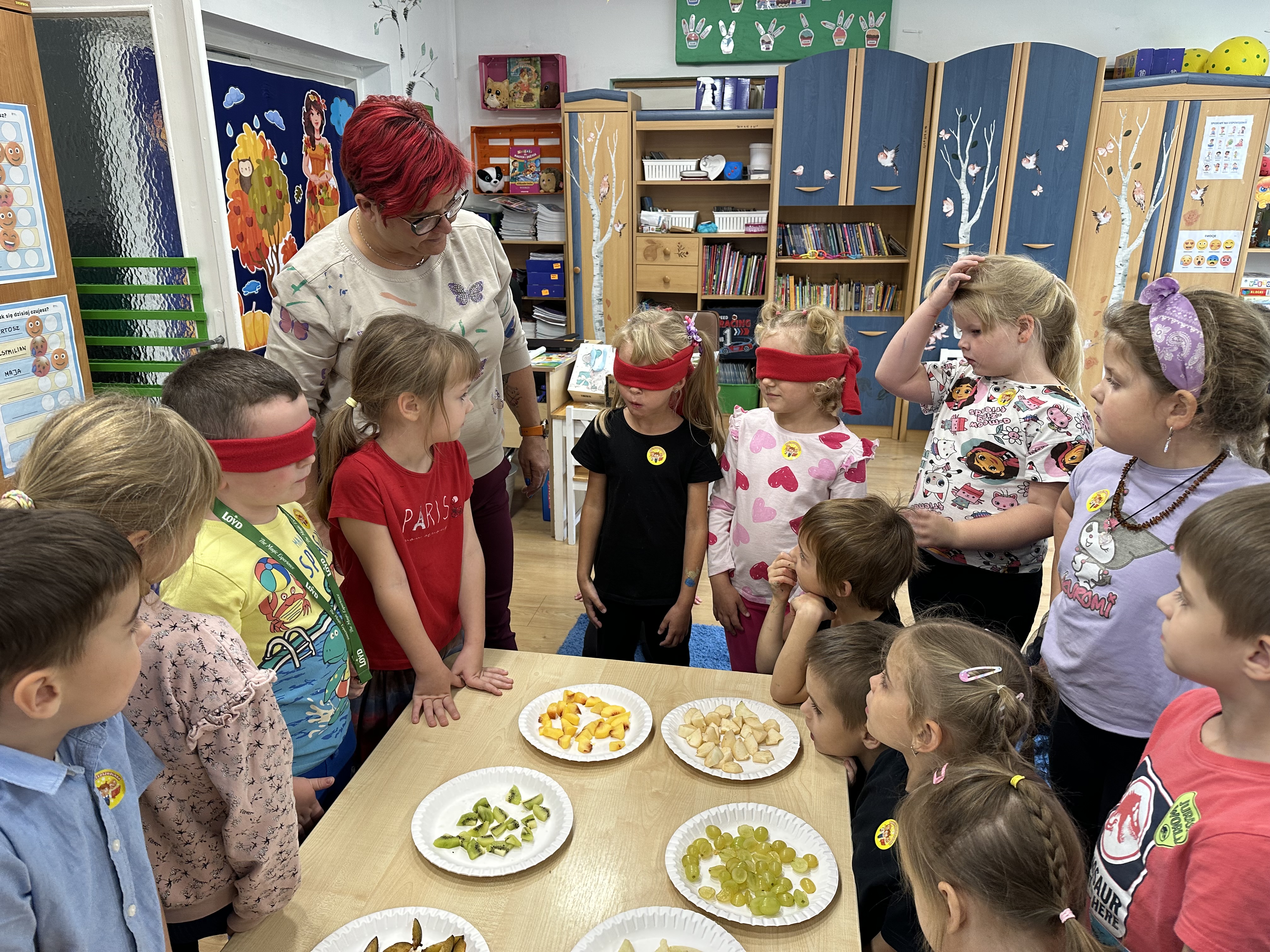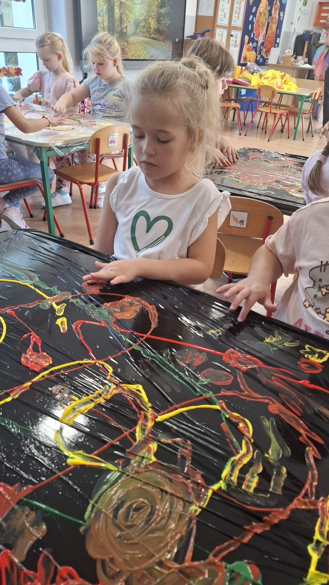 W poniedziałek po zabawie ,,Wokół kolorów” kształtującej koncentrację, dzieci uczestniczyły w porannych ćwiczeniach gimnastycznych, rozwijały tym samym duże grupy mięśniowe. Następnie wysłuchały opowiadania Marii Pawlisz ,,Skarby jesieni” i wspólnie zastanawiały się, w jaki sposób można zachwycać się jesienią, i co jest w niej takiego nadzwyczajnego. Omawiały również symbole i skarby jesieni. Dzieci brały udział w zabawach ruchowych o tematyce jesiennej. Podczas ,,Jesiennych rozmów” wymieniały się doświadczeniami i na podstawie wcześniej wysłuchanego opowiadania odpowiadały na pytania nauczyciela. Utrwalały nazwy jesiennych ubrań i uczestniczyły w zabawie ,,ciepło – zimno”. Po zaśpiewaniu powitanki wtorek dzieci zaczęły zabawą logopedyczną, rozwijającą prawidłową motorykę narządów mowy. Wysłuchały wiersza ,,Wrzesień” Józefa Birkenmajera i brały aktywny udział w rozmowie dotyczącej owoców i potraw, które się z nich przyrządza. Tego dnia poznały literę O, o. Podczas zabaw językowych i fonacyjnych dokonywały syntezy i analizy głoskowej wyrazu ,,owoce” oraz układały schemat tego słowa z kartoników. Samodzielnie, po zapoznaniu z zapisem graficznym małej i wielkiej litery o, O, pisały ją palcem wskazującym na dywanie. Podczas zabaw przy stolikach rozwijały grafomotorykę, rysowały szlaczek po śladzie i ozdabiały szablon litery O. W środowy poranek dzieci ćwiczyły pamięć wzrokową poprzez zapamiętywanie ułożenia figur geometrycznych. Podczas zabaw „O znakach”, „Auta i piesi”, „Kolor i kształt znaku” i „Po kałużach” dzieci zapoznały się ze znakami drogowymi. Dowiedziały się, jakie znaki wyróżniamy (informacyjne, ostrzegawcze i zakazu) oraz nauczyły się podstawowych zwrotów po angielsku. Podczas zabaw przy stolikach wykonywały zadania zgodnie z kodem. Czwartek dotyczył witamin oraz jesiennych owoców. Dzieci dowiedziały się o korzystnym wpływie owoców na zdrowie. Podczas zabawy „Straganiki” zapoznały się z piramidą/talerzem zdrowego żywienia. Próbowały różnych owoców z zasłoniętymi oczami i odgadywały, co to za owoc. Podczas zabaw „Witaminy w moim brzuchu” i „Zjem, bo wiem” dowiedziały się, czym są witaminy i gdzie można je znaleźć. Dzień zakończyły kulinarną zabawą i degustacją owocowych szaszłyków. W piątek dzieci bawiły się do muzyki klasycznej, kształtując tym samym wyczucie rytmu i reakcje na zmianę charakteru muzyki. Wysłuchały wiersza Wandy Chotomskiej ,,Deszcz”, który był wprowadzeniem do rozmowy dotyczącej artystycznej inspiracji jesienią. Przypominały sobie tekst ,,Domowej piosenki” i naśladowały do niej różne czynności związane ze zwierzętami. Podczas zabaw przy stolikach wykonały pracę plastyczno-techniczną według instrukcji. Nie zabrakło zabaw przyrodniczych na dworze z wykorzystaniem nowych słówek w języku angielskim. Przedszkolaki utrwaliły znajomość kolorów po angielsku. Dzień skończyły dzień wykonaniem pracy związanej z jesienną, martwą naturą.