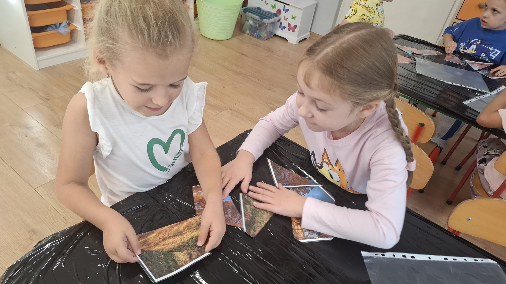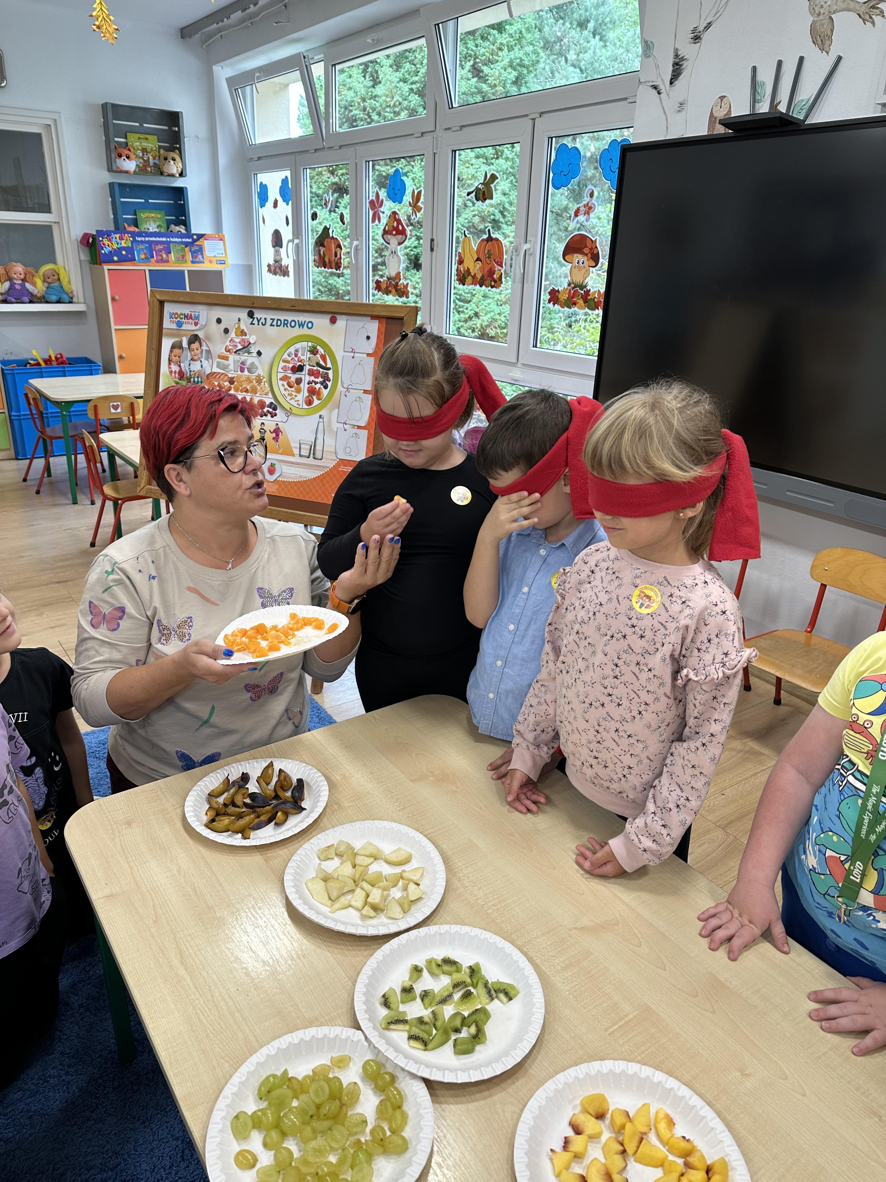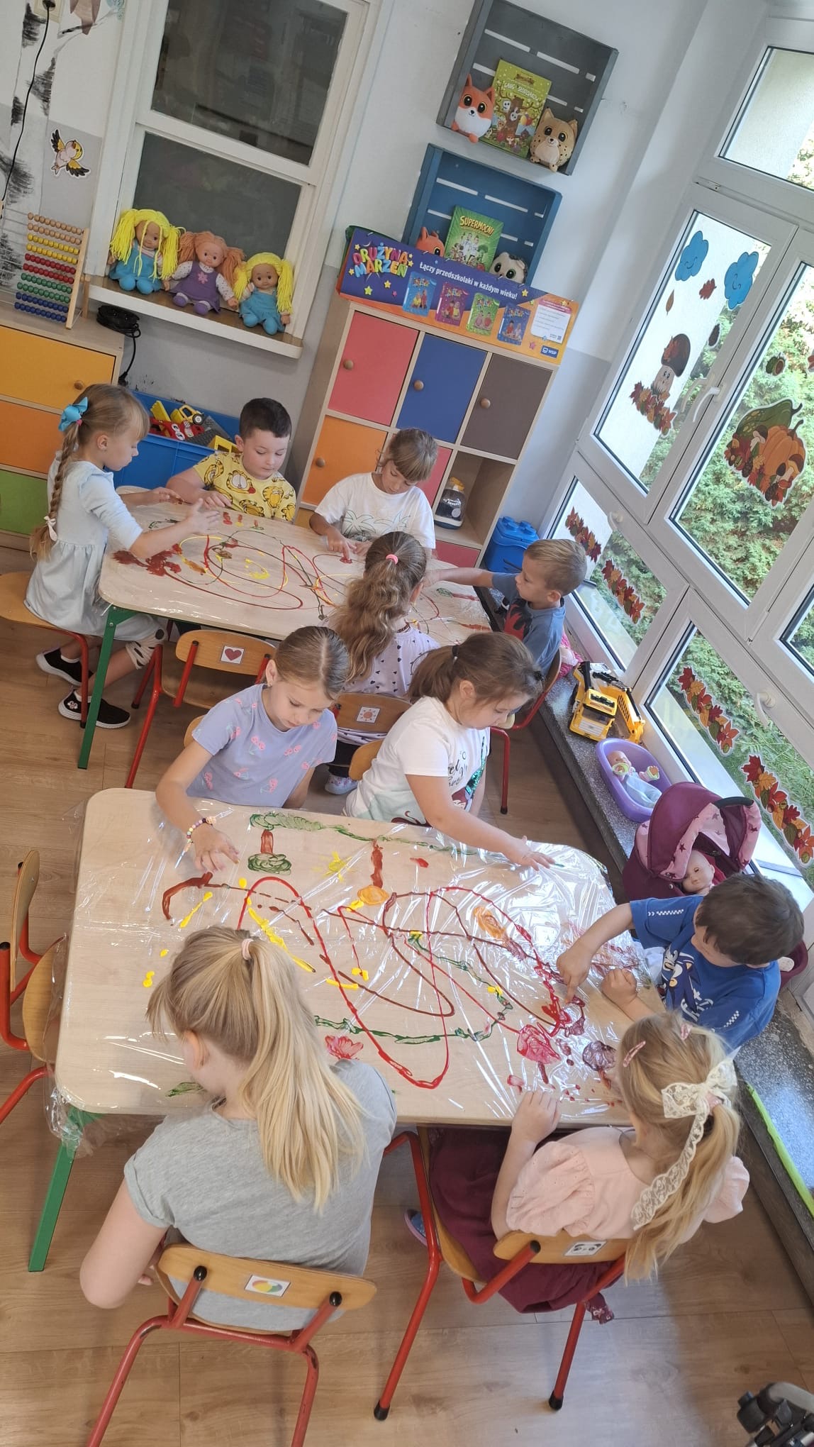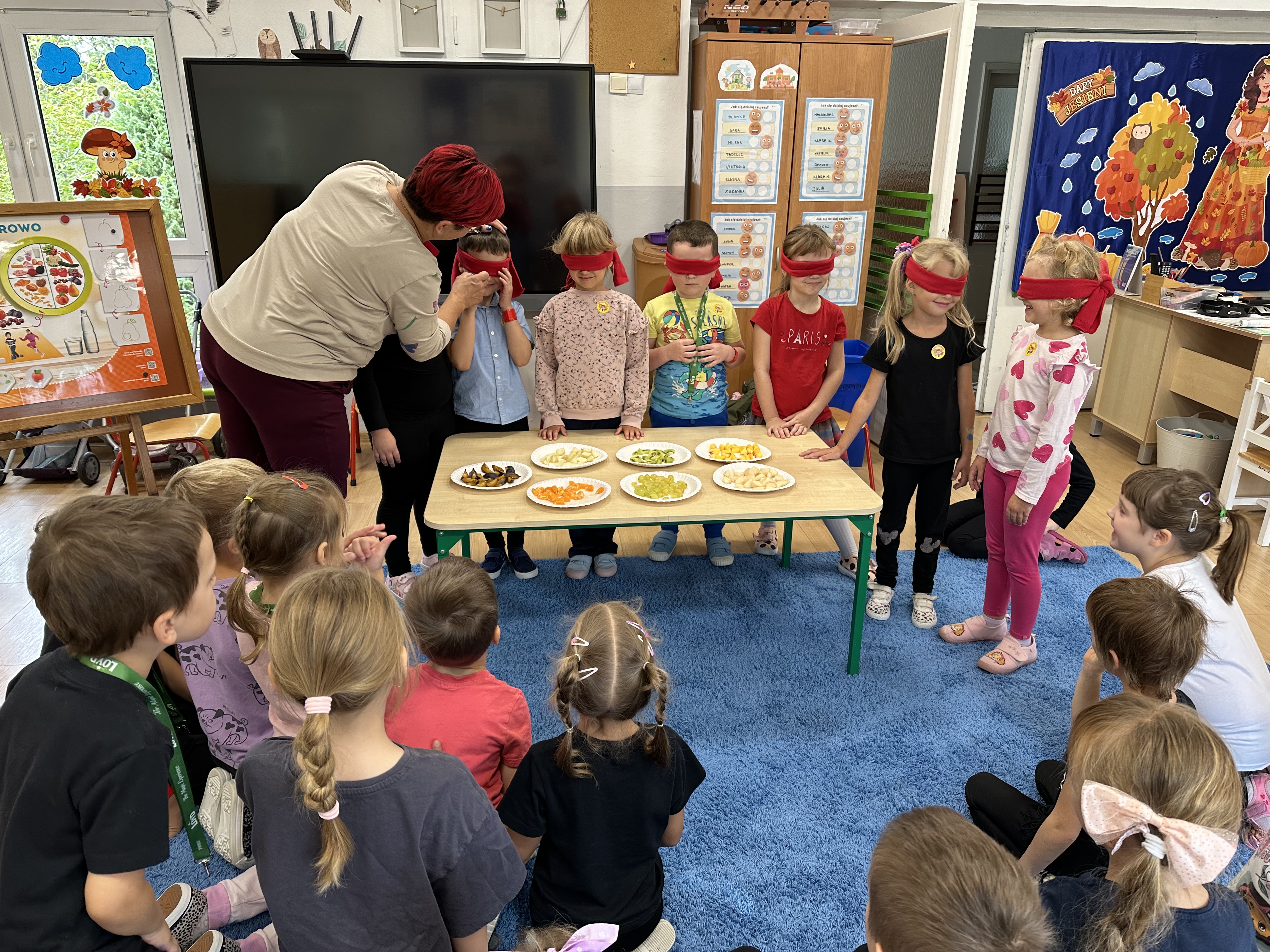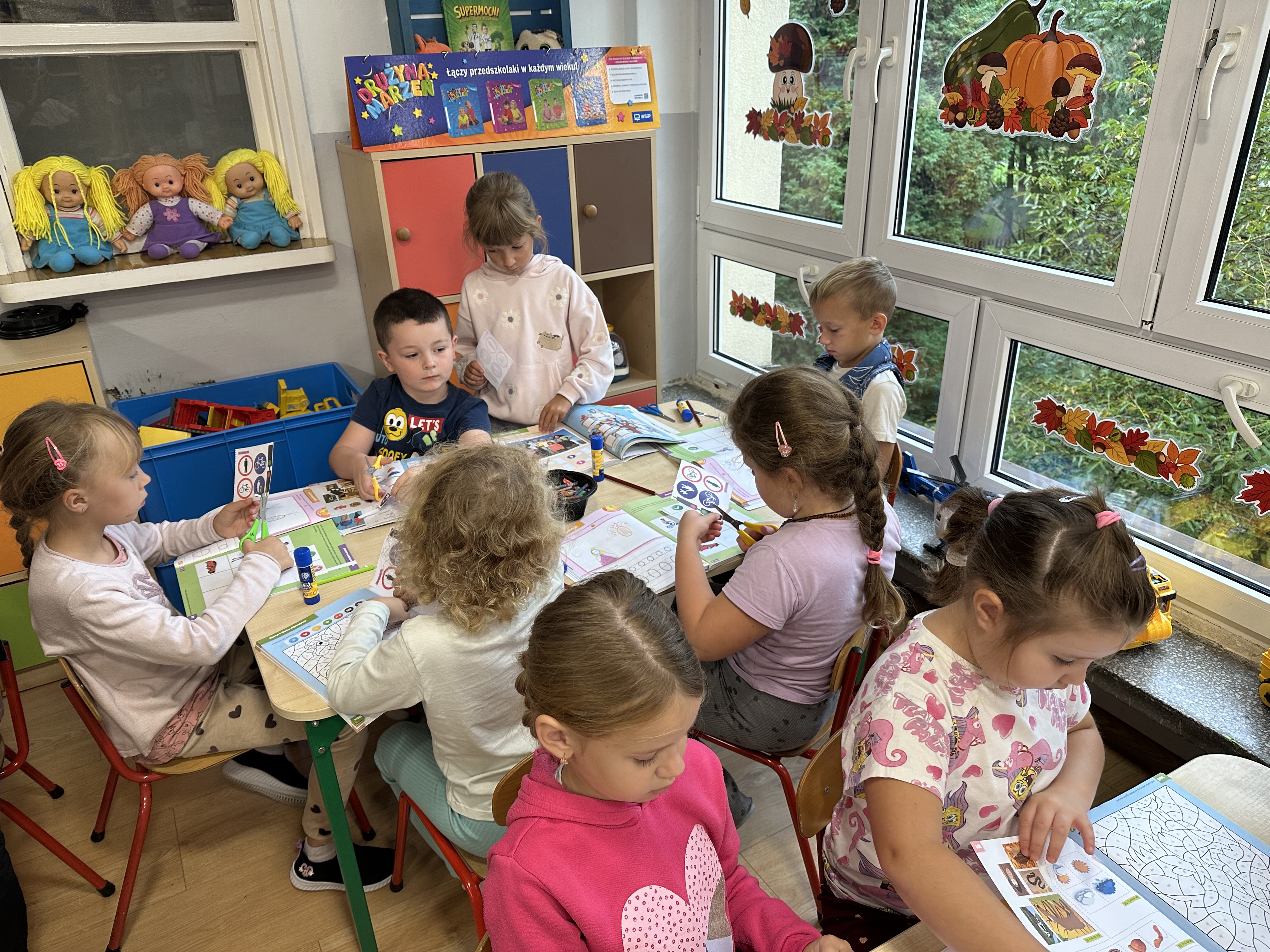 W poniedziałek po zabawie ,,Wokół kolorów” kształtującej koncentrację, dzieci uczestniczyły w porannych ćwiczeniach gimnastycznych, rozwijały tym samym duże grupy mięśniowe. Następnie wysłuchały opowiadania Marii Pawlisz ,,Skarby jesieni” i wspólnie zastanawiały się, w jaki sposób można zachwycać się jesienią, i co jest w niej takiego nadzwyczajnego. Omawiały również symbole i skarby jesieni. Dzieci brały udział w zabawach ruchowych o tematyce jesiennej. Podczas ,,Jesiennych rozmów” wymieniały się doświadczeniami i na podstawie wcześniej wysłuchanego opowiadania odpowiadały na pytania nauczyciela. Utrwalały nazwy jesiennych ubrań i uczestniczyły w zabawie ,,ciepło – zimno”. Po zaśpiewaniu powitanki wtorek dzieci zaczęły zabawą logopedyczną, rozwijającą prawidłową motorykę narządów mowy. Wysłuchały wiersza ,,Wrzesień” Józefa Birkenmajera i brały aktywny udział w rozmowie dotyczącej owoców i potraw, które się z nich przyrządza. Tego dnia poznały literę O, o. Podczas zabaw językowych i fonacyjnych dokonywały syntezy i analizy głoskowej wyrazu ,,owoce” oraz układały schemat tego słowa z kartoników. Samodzielnie, po zapoznaniu z zapisem graficznym małej i wielkiej litery o, O, pisały ją palcem wskazującym na dywanie. Podczas zabaw przy stolikach rozwijały grafomotorykę, rysowały szlaczek po śladzie i ozdabiały szablon litery O. W środowy poranek dzieci ćwiczyły pamięć wzrokową poprzez zapamiętywanie ułożenia figur geometrycznych. Podczas zabaw „O znakach”, „Auta i piesi”, „Kolor i kształt znaku” i „Po kałużach” dzieci zapoznały się ze znakami drogowymi. Dowiedziały się, jakie znaki wyróżniamy (informacyjne, ostrzegawcze i zakazu) oraz nauczyły się podstawowych zwrotów po angielsku. Podczas zabaw przy stolikach wykonywały zadania zgodnie z kodem. Czwartek dotyczył witamin oraz jesiennych owoców. Dzieci dowiedziały się o korzystnym wpływie owoców na zdrowie. Podczas zabawy „Straganiki” zapoznały się z piramidą/talerzem zdrowego żywienia. Próbowały różnych owoców z zasłoniętymi oczami i odgadywały, co to za owoc. Podczas zabaw „Witaminy w moim brzuchu” i „Zjem, bo wiem” dowiedziały się, czym są witaminy i gdzie można je znaleźć. Dzień zakończyły kulinarną zabawą i degustacją owocowych szaszłyków. W piątek dzieci bawiły się do muzyki klasycznej, kształtując tym samym wyczucie rytmu i reakcje na zmianę charakteru muzyki. Wysłuchały wiersza Wandy Chotomskiej ,,Deszcz”, który był wprowadzeniem do rozmowy dotyczącej artystycznej inspiracji jesienią. Przypominały sobie tekst ,,Domowej piosenki” i naśladowały do niej różne czynności związane ze zwierzętami. Podczas zabaw przy stolikach wykonały pracę plastyczno-techniczną według instrukcji. Nie zabrakło zabaw przyrodniczych na dworze z wykorzystaniem nowych słówek w języku angielskim. Przedszkolaki utrwaliły znajomość kolorów po angielsku. Dzień skończyły dzień wykonaniem pracy związanej z jesienną, martwą naturą.