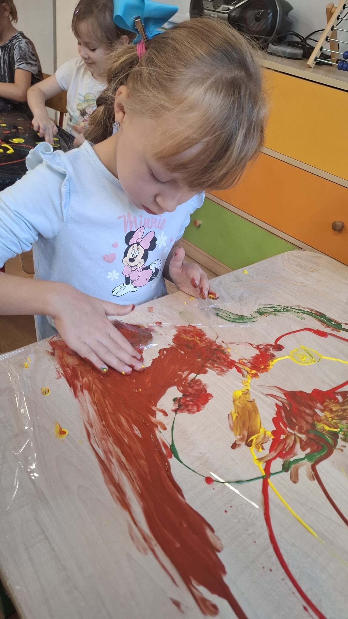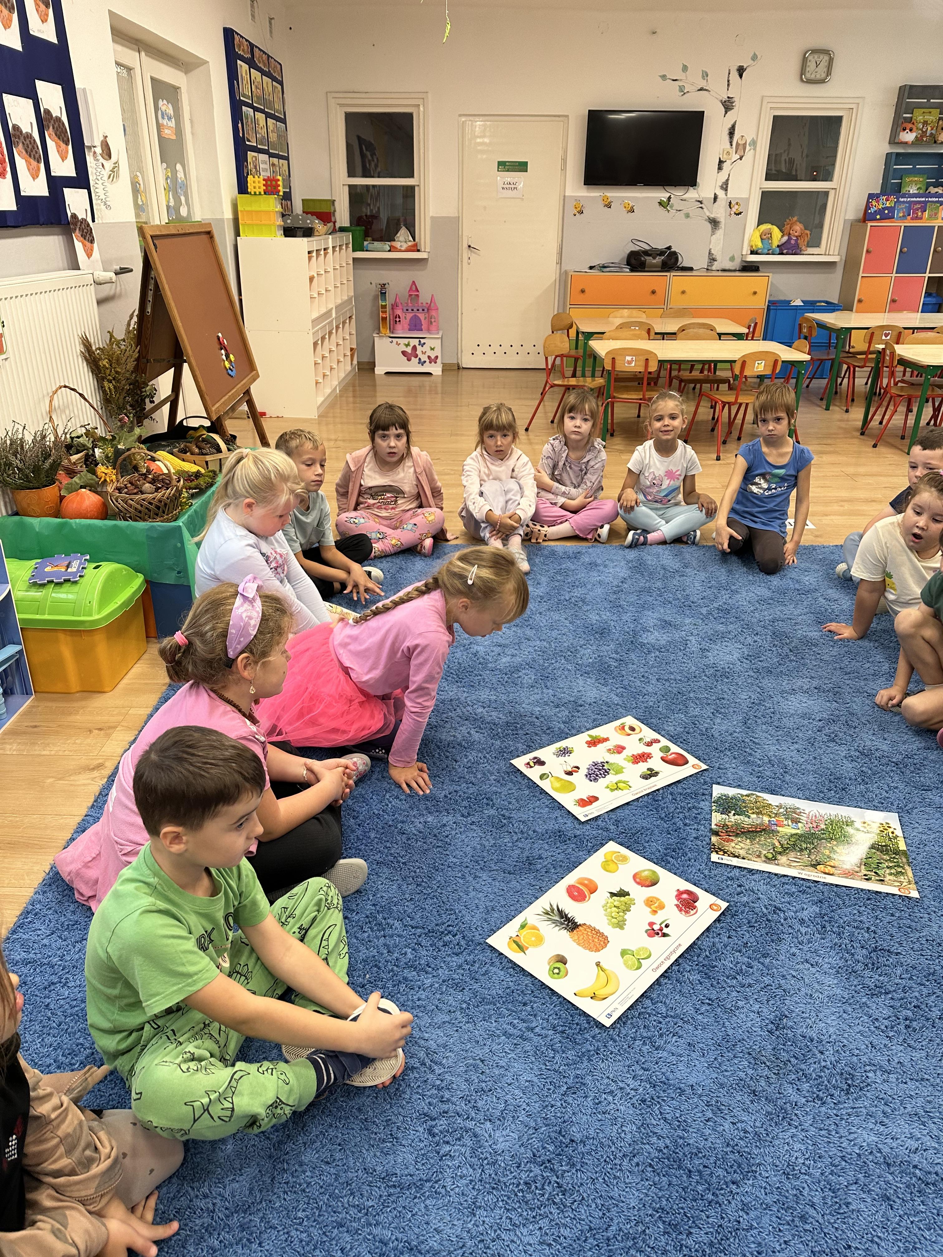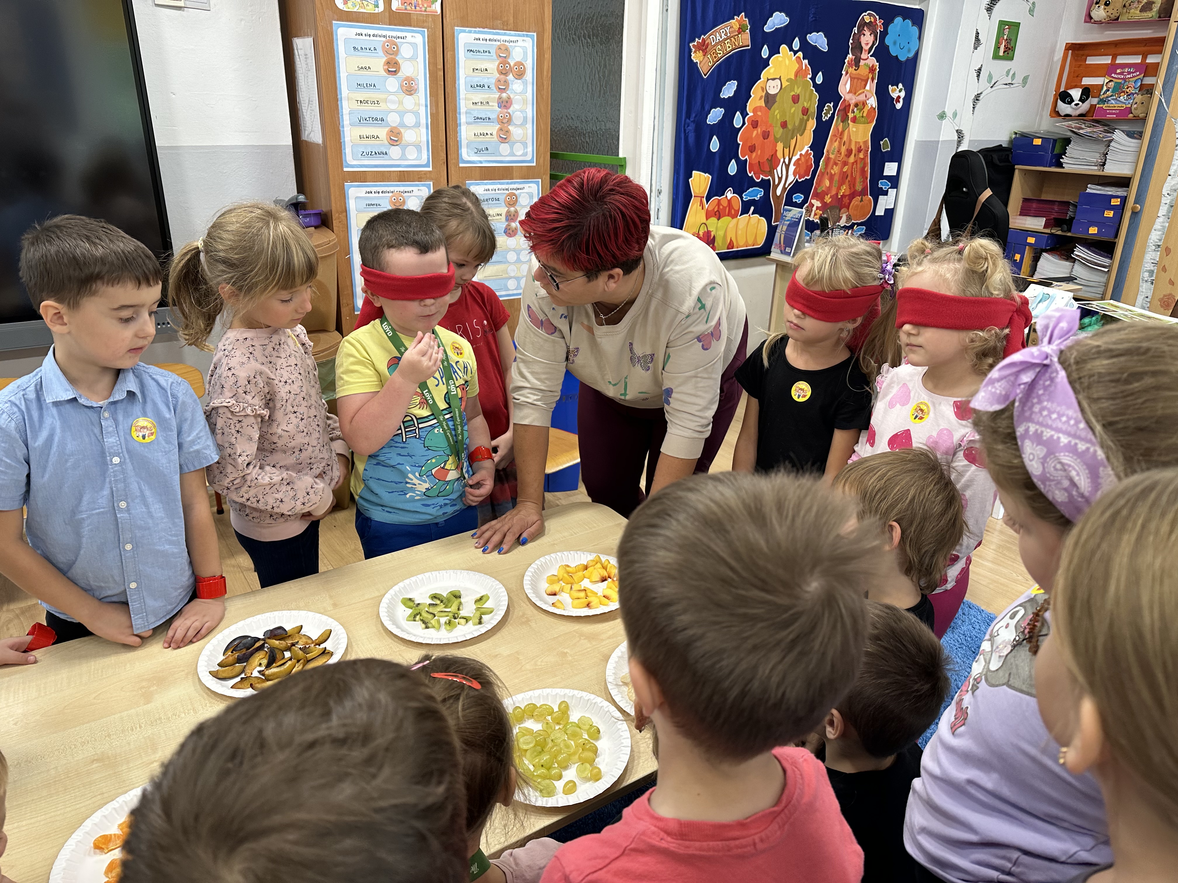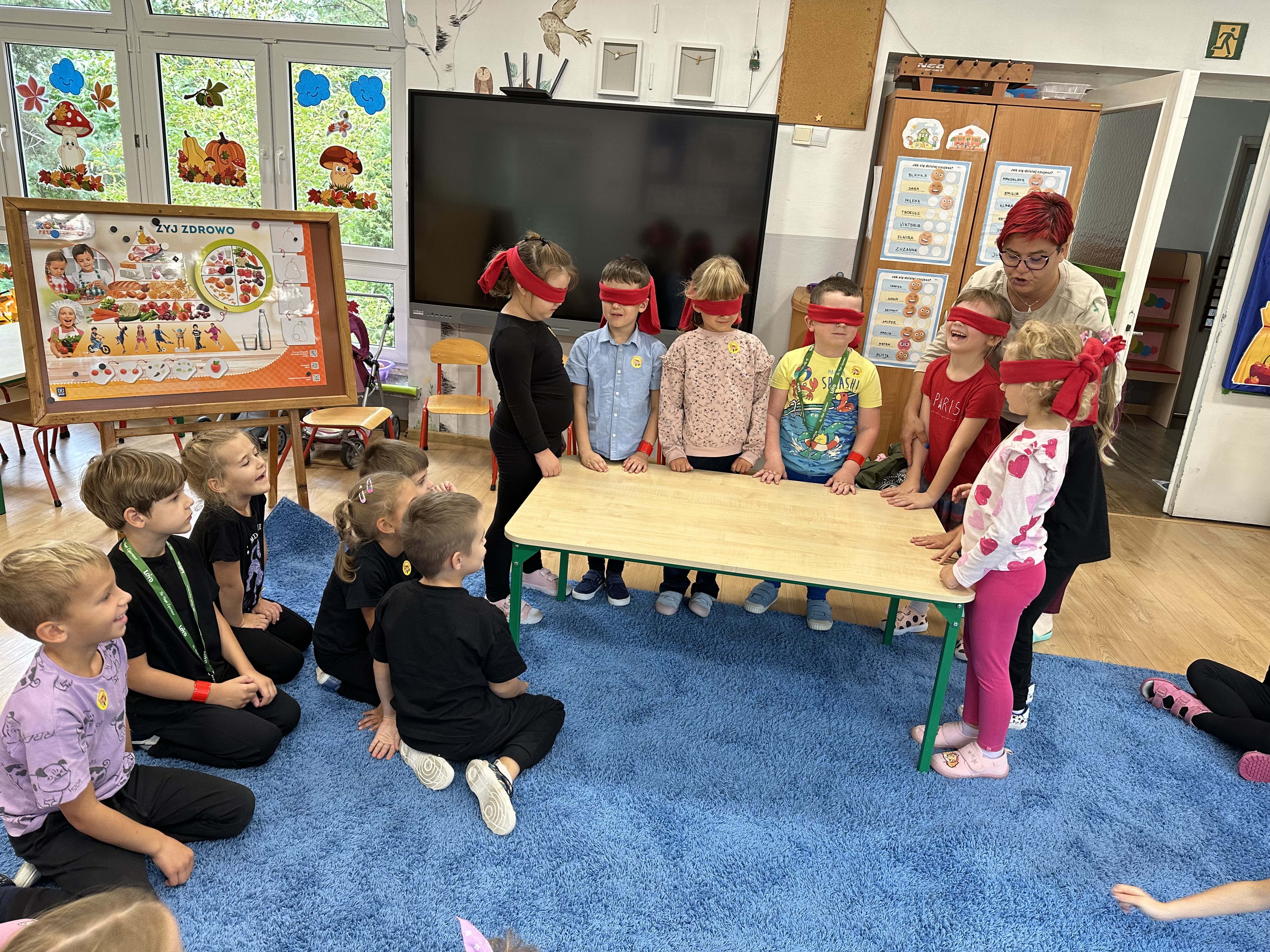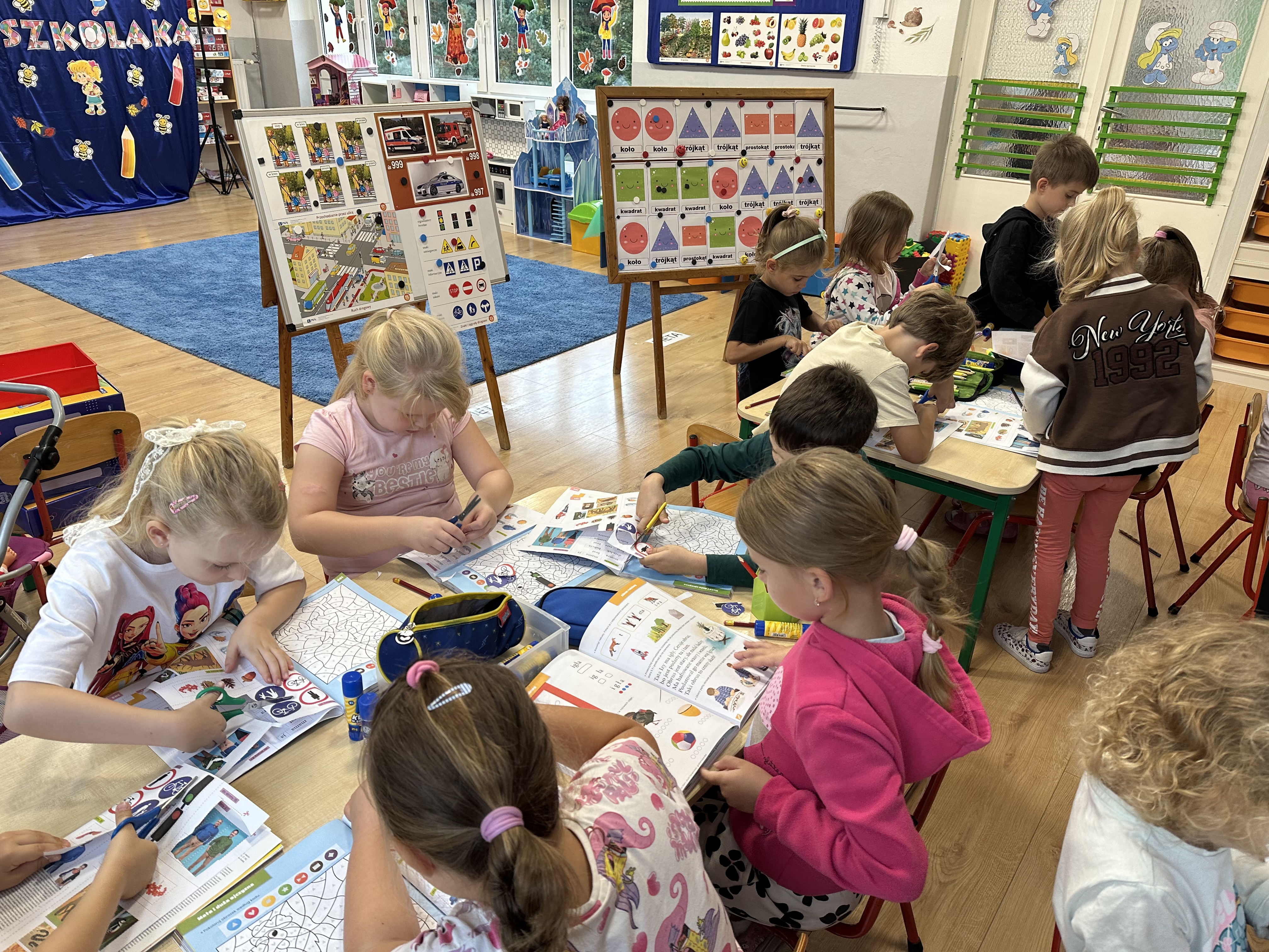 W poniedziałek po zabawie ,,Wokół kolorów” kształtującej koncentrację, dzieci uczestniczyły w porannych ćwiczeniach gimnastycznych, rozwijały tym samym duże grupy mięśniowe. Następnie wysłuchały opowiadania Marii Pawlisz ,,Skarby jesieni” i wspólnie zastanawiały się, w jaki sposób można zachwycać się jesienią, i co jest w niej takiego nadzwyczajnego. Omawiały również symbole i skarby jesieni. Dzieci brały udział w zabawach ruchowych o tematyce jesiennej. Podczas ,,Jesiennych rozmów” wymieniały się doświadczeniami i na podstawie wcześniej wysłuchanego opowiadania odpowiadały na pytania nauczyciela. Utrwalały nazwy jesiennych ubrań i uczestniczyły w zabawie ,,ciepło – zimno”. Po zaśpiewaniu powitanki wtorek dzieci zaczęły zabawą logopedyczną, rozwijającą prawidłową motorykę narządów mowy. Wysłuchały wiersza ,,Wrzesień” Józefa Birkenmajera i brały aktywny udział w rozmowie dotyczącej owoców i potraw, które się z nich przyrządza. Tego dnia poznały literę O, o. Podczas zabaw językowych i fonacyjnych dokonywały syntezy i analizy głoskowej wyrazu ,,owoce” oraz układały schemat tego słowa z kartoników. Samodzielnie, po zapoznaniu z zapisem graficznym małej i wielkiej litery o, O, pisały ją palcem wskazującym na dywanie. Podczas zabaw przy stolikach rozwijały grafomotorykę, rysowały szlaczek po śladzie i ozdabiały szablon litery O. W środowy poranek dzieci ćwiczyły pamięć wzrokową poprzez zapamiętywanie ułożenia figur geometrycznych. Podczas zabaw „O znakach”, „Auta i piesi”, „Kolor i kształt znaku” i „Po kałużach” dzieci zapoznały się ze znakami drogowymi. Dowiedziały się, jakie znaki wyróżniamy (informacyjne, ostrzegawcze i zakazu) oraz nauczyły się podstawowych zwrotów po angielsku. Podczas zabaw przy stolikach wykonywały zadania zgodnie z kodem. Czwartek dotyczył witamin oraz jesiennych owoców. Dzieci dowiedziały się o korzystnym wpływie owoców na zdrowie. Podczas zabawy „Straganiki” zapoznały się z piramidą/talerzem zdrowego żywienia. Próbowały różnych owoców z zasłoniętymi oczami i odgadywały, co to za owoc. Podczas zabaw „Witaminy w moim brzuchu” i „Zjem, bo wiem” dowiedziały się, czym są witaminy i gdzie można je znaleźć. Dzień zakończyły kulinarną zabawą i degustacją owocowych szaszłyków. W piątek dzieci bawiły się do muzyki klasycznej, kształtując tym samym wyczucie rytmu i reakcje na zmianę charakteru muzyki. Wysłuchały wiersza Wandy Chotomskiej ,,Deszcz”, który był wprowadzeniem do rozmowy dotyczącej artystycznej inspiracji jesienią. Przypominały sobie tekst ,,Domowej piosenki” i naśladowały do niej różne czynności związane ze zwierzętami. Podczas zabaw przy stolikach wykonały pracę plastyczno-techniczną według instrukcji. Nie zabrakło zabaw przyrodniczych na dworze z wykorzystaniem nowych słówek w języku angielskim. Przedszkolaki utrwaliły znajomość kolorów po angielsku. Dzień skończyły dzień wykonaniem pracy związanej z jesienną, martwą naturą.