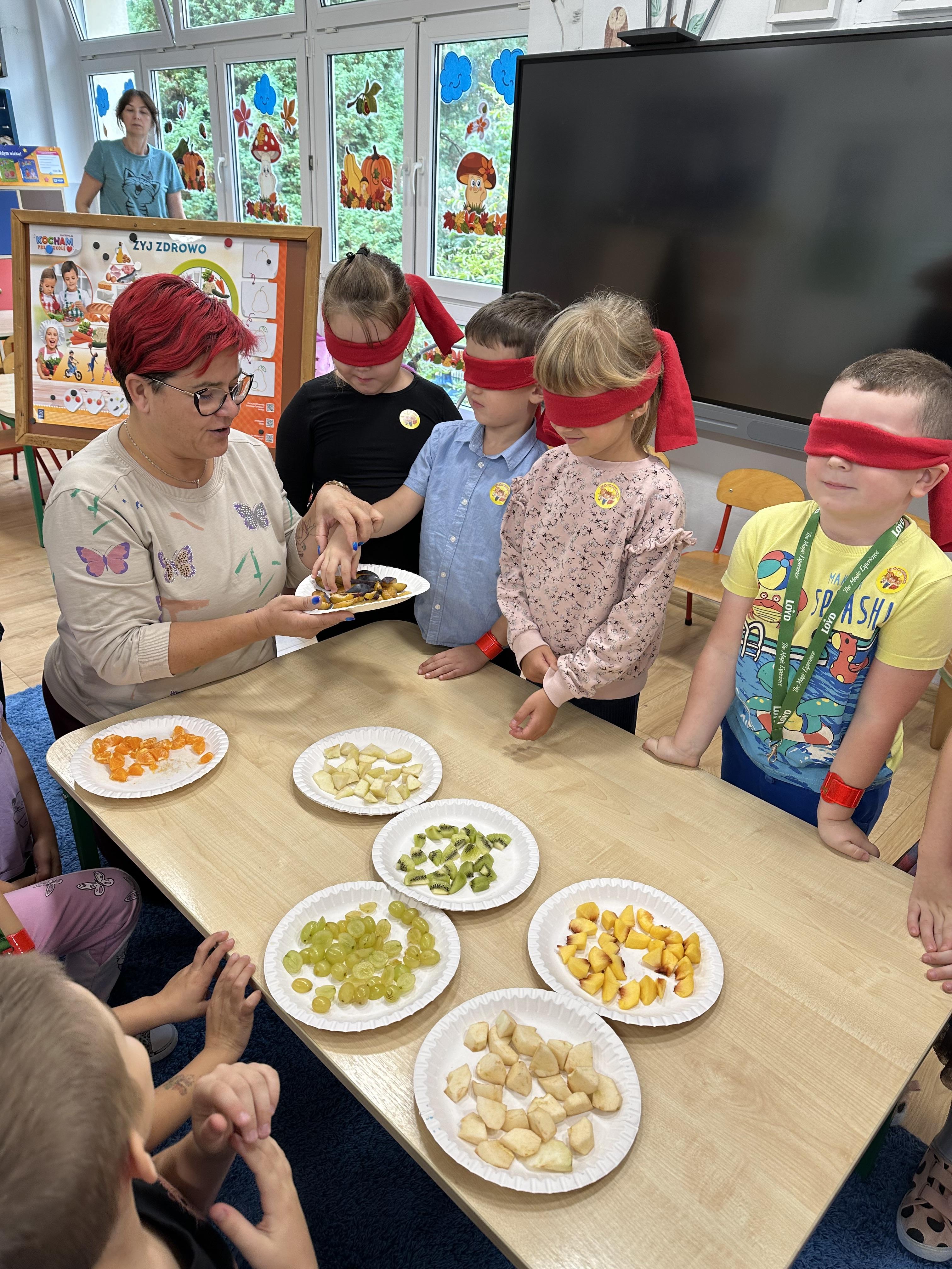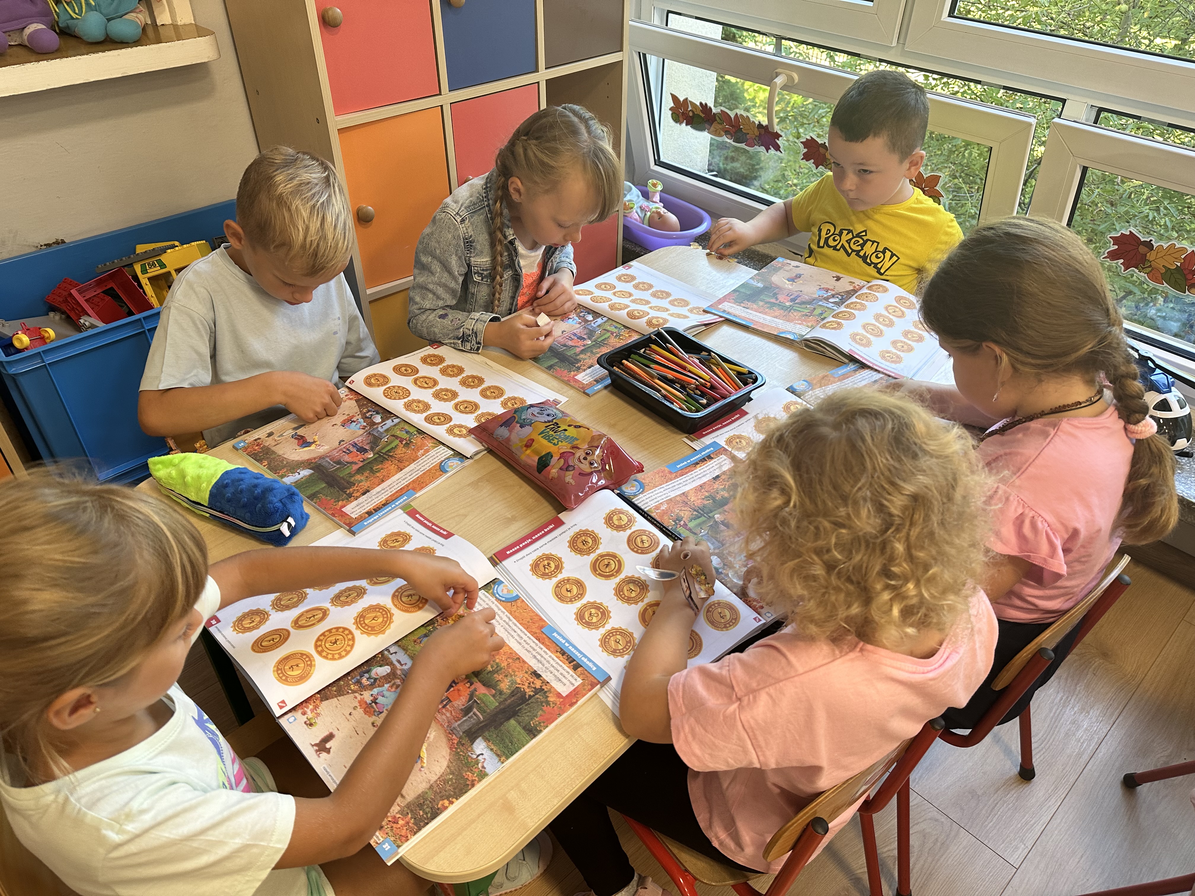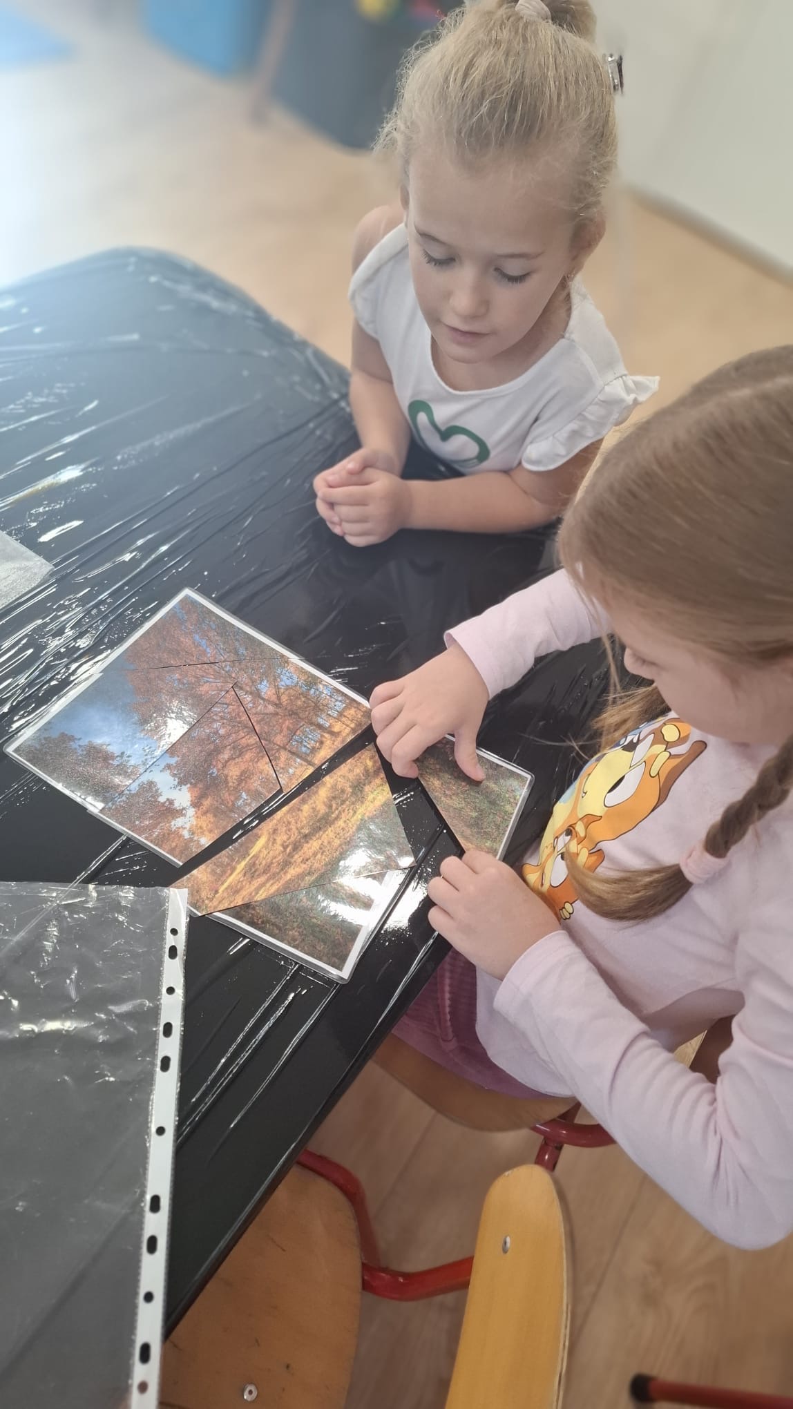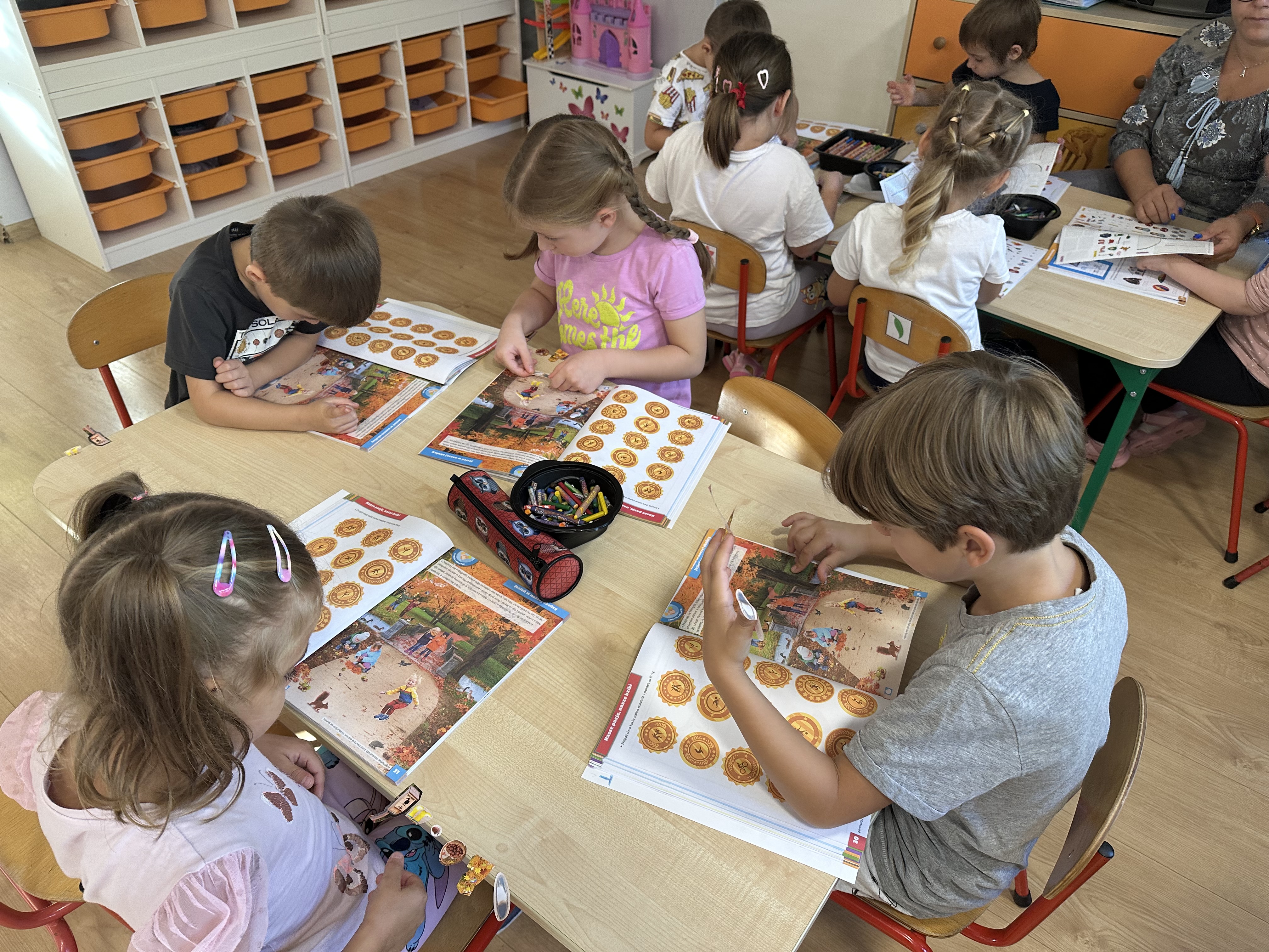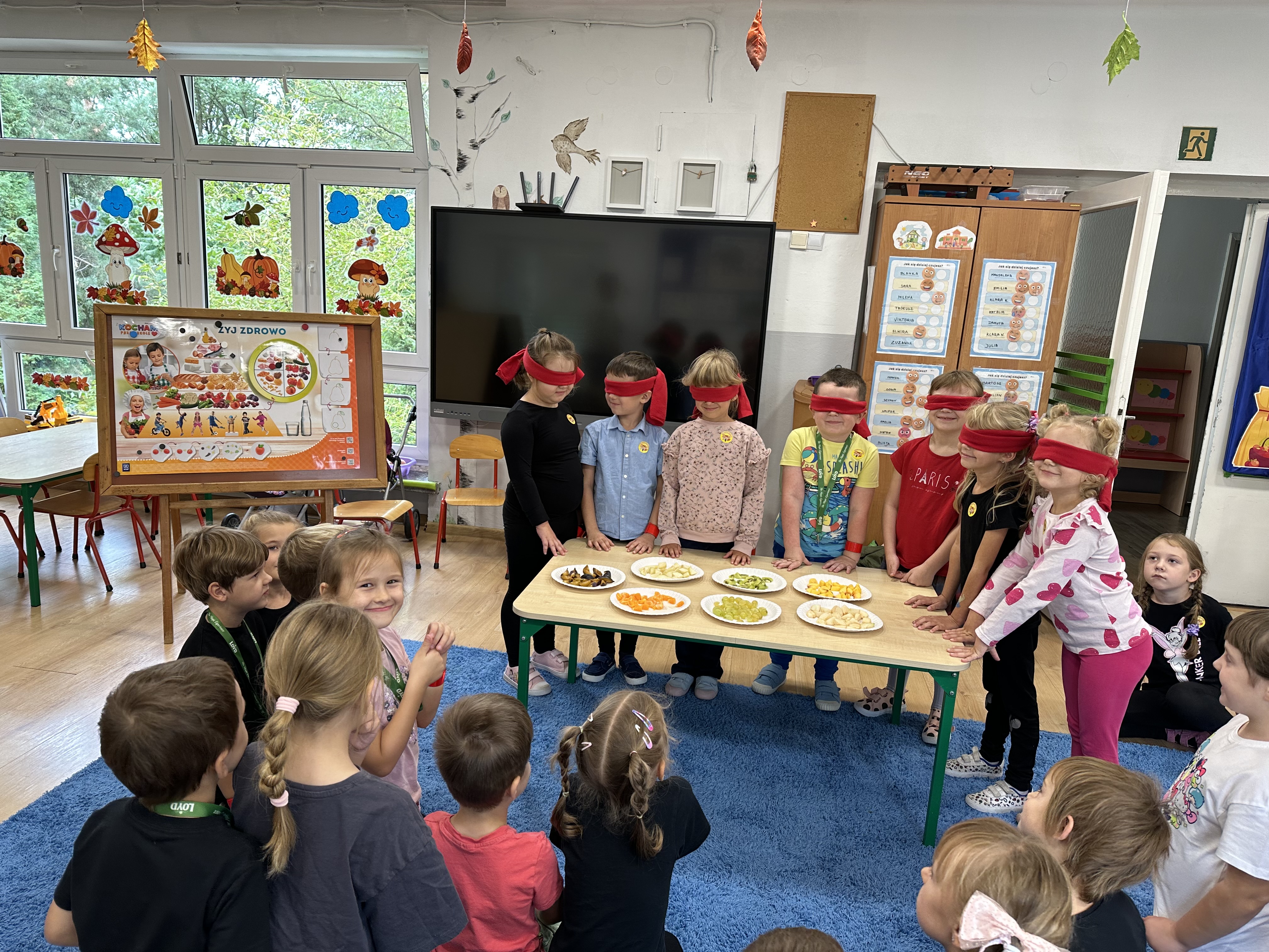 W poniedziałek po zabawie ,,Wokół kolorów” kształtującej koncentrację, dzieci uczestniczyły w porannych ćwiczeniach gimnastycznych, rozwijały tym samym duże grupy mięśniowe. Następnie wysłuchały opowiadania Marii Pawlisz ,,Skarby jesieni” i wspólnie zastanawiały się, w jaki sposób można zachwycać się jesienią, i co jest w niej takiego nadzwyczajnego. Omawiały również symbole i skarby jesieni. Dzieci brały udział w zabawach ruchowych o tematyce jesiennej. Podczas ,,Jesiennych rozmów” wymieniały się doświadczeniami i na podstawie wcześniej wysłuchanego opowiadania odpowiadały na pytania nauczyciela. Utrwalały nazwy jesiennych ubrań i uczestniczyły w zabawie ,,ciepło – zimno”. Po zaśpiewaniu powitanki wtorek dzieci zaczęły zabawą logopedyczną, rozwijającą prawidłową motorykę narządów mowy. Wysłuchały wiersza ,,Wrzesień” Józefa Birkenmajera i brały aktywny udział w rozmowie dotyczącej owoców i potraw, które się z nich przyrządza. Tego dnia poznały literę O, o. Podczas zabaw językowych i fonacyjnych dokonywały syntezy i analizy głoskowej wyrazu ,,owoce” oraz układały schemat tego słowa z kartoników. Samodzielnie, po zapoznaniu z zapisem graficznym małej i wielkiej litery o, O, pisały ją palcem wskazującym na dywanie. Podczas zabaw przy stolikach rozwijały grafomotorykę, rysowały szlaczek po śladzie i ozdabiały szablon litery O. W środowy poranek dzieci ćwiczyły pamięć wzrokową poprzez zapamiętywanie ułożenia figur geometrycznych. Podczas zabaw „O znakach”, „Auta i piesi”, „Kolor i kształt znaku” i „Po kałużach” dzieci zapoznały się ze znakami drogowymi. Dowiedziały się, jakie znaki wyróżniamy (informacyjne, ostrzegawcze i zakazu) oraz nauczyły się podstawowych zwrotów po angielsku. Podczas zabaw przy stolikach wykonywały zadania zgodnie z kodem. Czwartek dotyczył witamin oraz jesiennych owoców. Dzieci dowiedziały się o korzystnym wpływie owoców na zdrowie. Podczas zabawy „Straganiki” zapoznały się z piramidą/talerzem zdrowego żywienia. Próbowały różnych owoców z zasłoniętymi oczami i odgadywały, co to za owoc. Podczas zabaw „Witaminy w moim brzuchu” i „Zjem, bo wiem” dowiedziały się, czym są witaminy i gdzie można je znaleźć. Dzień zakończyły kulinarną zabawą i degustacją owocowych szaszłyków. W piątek dzieci bawiły się do muzyki klasycznej, kształtując tym samym wyczucie rytmu i reakcje na zmianę charakteru muzyki. Wysłuchały wiersza Wandy Chotomskiej ,,Deszcz”, który był wprowadzeniem do rozmowy dotyczącej artystycznej inspiracji jesienią. Przypominały sobie tekst ,,Domowej piosenki” i naśladowały do niej różne czynności związane ze zwierzętami. Podczas zabaw przy stolikach wykonały pracę plastyczno-techniczną według instrukcji. Nie zabrakło zabaw przyrodniczych na dworze z wykorzystaniem nowych słówek w języku angielskim. Przedszkolaki utrwaliły znajomość kolorów po angielsku. Dzień skończyły dzień wykonaniem pracy związanej z jesienną, martwą naturą.