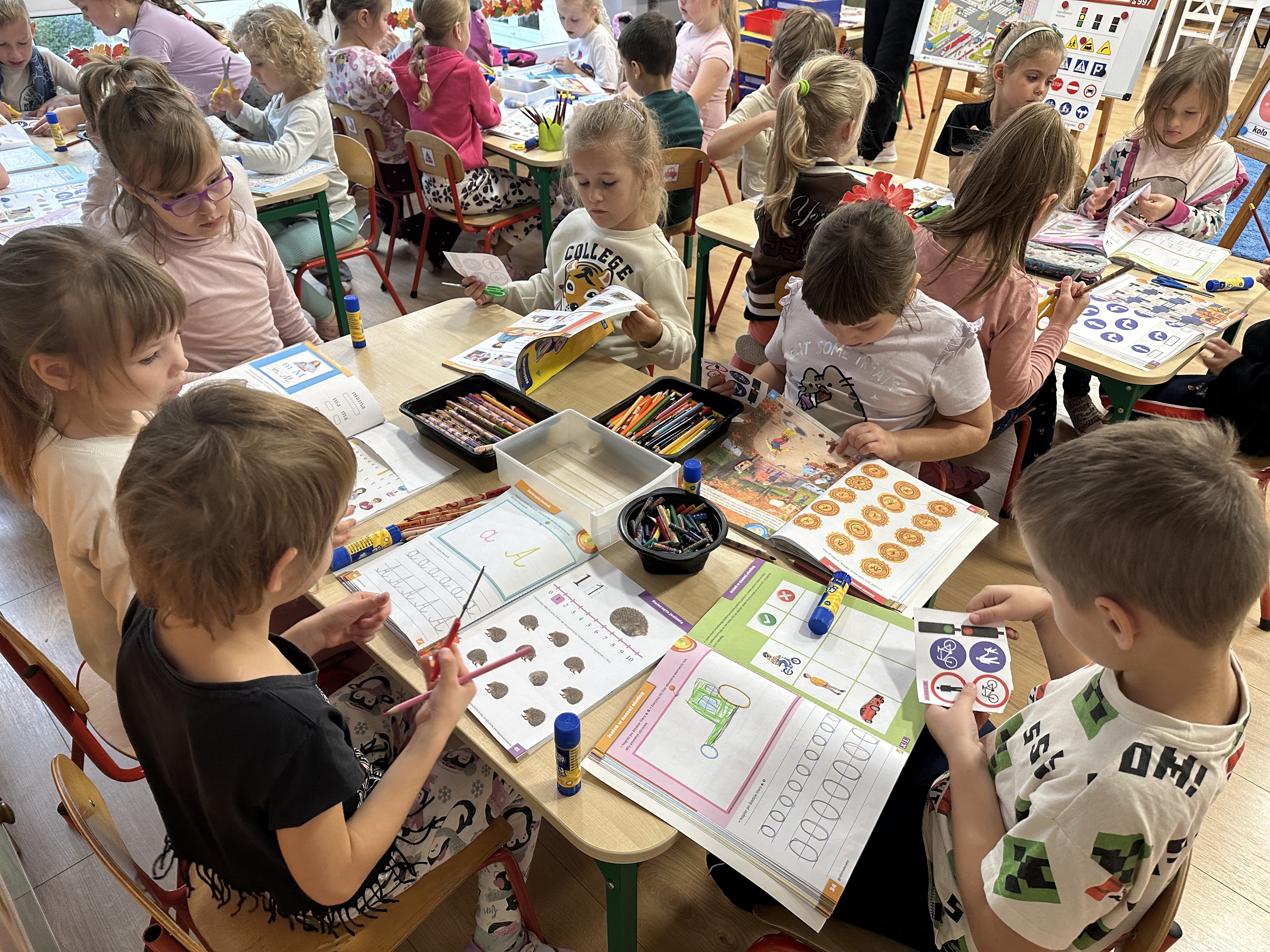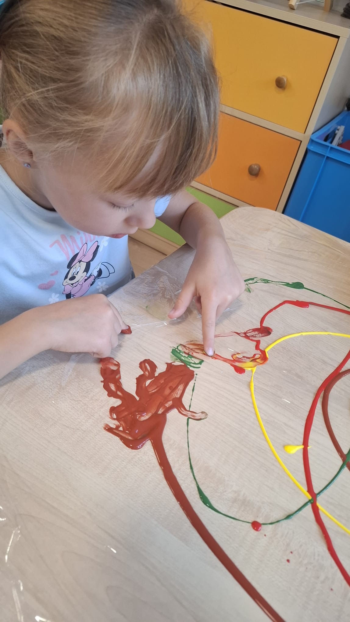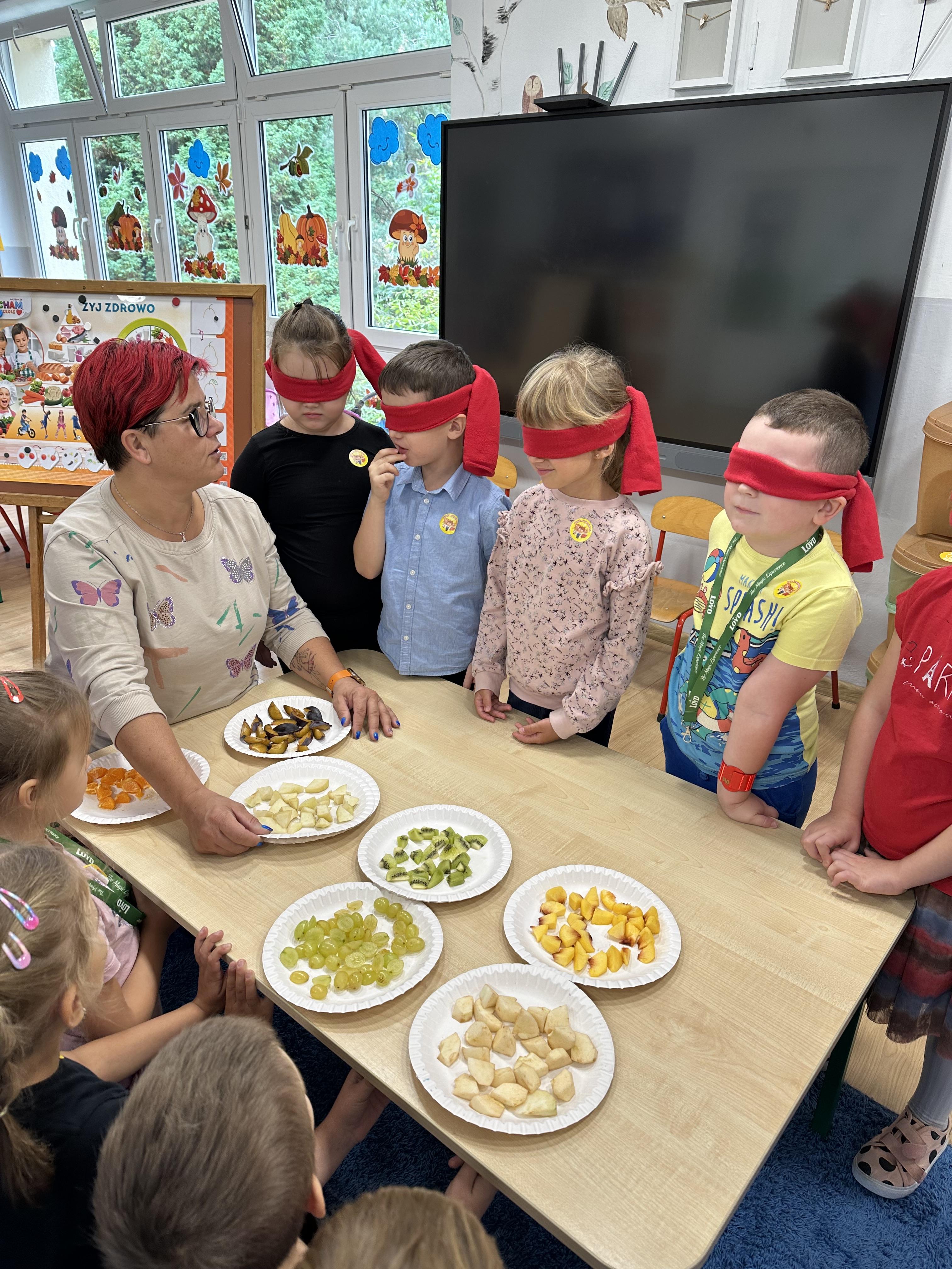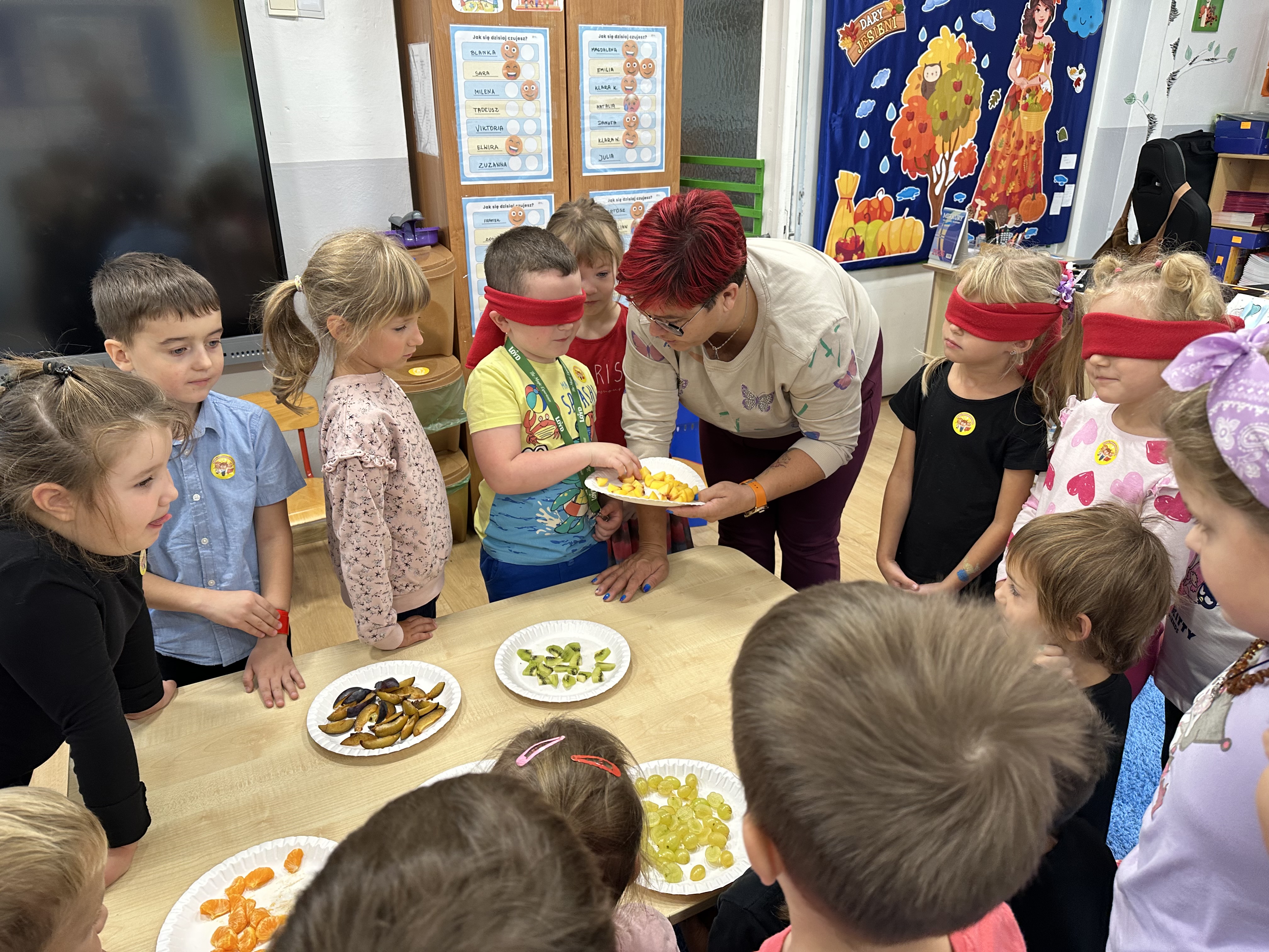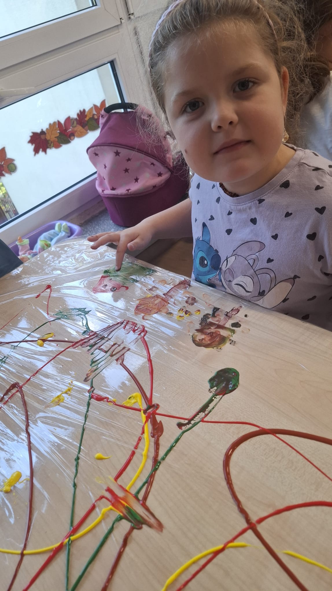 W poniedziałek po zabawie ,,Wokół kolorów” kształtującej koncentrację, dzieci uczestniczyły w porannych ćwiczeniach gimnastycznych, rozwijały tym samym duże grupy mięśniowe. Następnie wysłuchały opowiadania Marii Pawlisz ,,Skarby jesieni” i wspólnie zastanawiały się, w jaki sposób można zachwycać się jesienią, i co jest w niej takiego nadzwyczajnego. Omawiały również symbole i skarby jesieni. Dzieci brały udział w zabawach ruchowych o tematyce jesiennej. Podczas ,,Jesiennych rozmów” wymieniały się doświadczeniami i na podstawie wcześniej wysłuchanego opowiadania odpowiadały na pytania nauczyciela. Utrwalały nazwy jesiennych ubrań i uczestniczyły w zabawie ,,ciepło – zimno”. Po zaśpiewaniu powitanki wtorek dzieci zaczęły zabawą logopedyczną, rozwijającą prawidłową motorykę narządów mowy. Wysłuchały wiersza ,,Wrzesień” Józefa Birkenmajera i brały aktywny udział w rozmowie dotyczącej owoców i potraw, które się z nich przyrządza. Tego dnia poznały literę O, o. Podczas zabaw językowych i fonacyjnych dokonywały syntezy i analizy głoskowej wyrazu ,,owoce” oraz układały schemat tego słowa z kartoników. Samodzielnie, po zapoznaniu z zapisem graficznym małej i wielkiej litery o, O, pisały ją palcem wskazującym na dywanie. Podczas zabaw przy stolikach rozwijały grafomotorykę, rysowały szlaczek po śladzie i ozdabiały szablon litery O. W środowy poranek dzieci ćwiczyły pamięć wzrokową poprzez zapamiętywanie ułożenia figur geometrycznych. Podczas zabaw „O znakach”, „Auta i piesi”, „Kolor i kształt znaku” i „Po kałużach” dzieci zapoznały się ze znakami drogowymi. Dowiedziały się, jakie znaki wyróżniamy (informacyjne, ostrzegawcze i zakazu) oraz nauczyły się podstawowych zwrotów po angielsku. Podczas zabaw przy stolikach wykonywały zadania zgodnie z kodem. Czwartek dotyczył witamin oraz jesiennych owoców. Dzieci dowiedziały się o korzystnym wpływie owoców na zdrowie. Podczas zabawy „Straganiki” zapoznały się z piramidą/talerzem zdrowego żywienia. Próbowały różnych owoców z zasłoniętymi oczami i odgadywały, co to za owoc. Podczas zabaw „Witaminy w moim brzuchu” i „Zjem, bo wiem” dowiedziały się, czym są witaminy i gdzie można je znaleźć. Dzień zakończyły kulinarną zabawą i degustacją owocowych szaszłyków. W piątek dzieci bawiły się do muzyki klasycznej, kształtując tym samym wyczucie rytmu i reakcje na zmianę charakteru muzyki. Wysłuchały wiersza Wandy Chotomskiej ,,Deszcz”, który był wprowadzeniem do rozmowy dotyczącej artystycznej inspiracji jesienią. Przypominały sobie tekst ,,Domowej piosenki” i naśladowały do niej różne czynności związane ze zwierzętami. Podczas zabaw przy stolikach wykonały pracę plastyczno-techniczną według instrukcji. Nie zabrakło zabaw przyrodniczych na dworze z wykorzystaniem nowych słówek w języku angielskim. Przedszkolaki utrwaliły znajomość kolorów po angielsku. Dzień skończyły dzień wykonaniem pracy związanej z jesienną, martwą naturą.