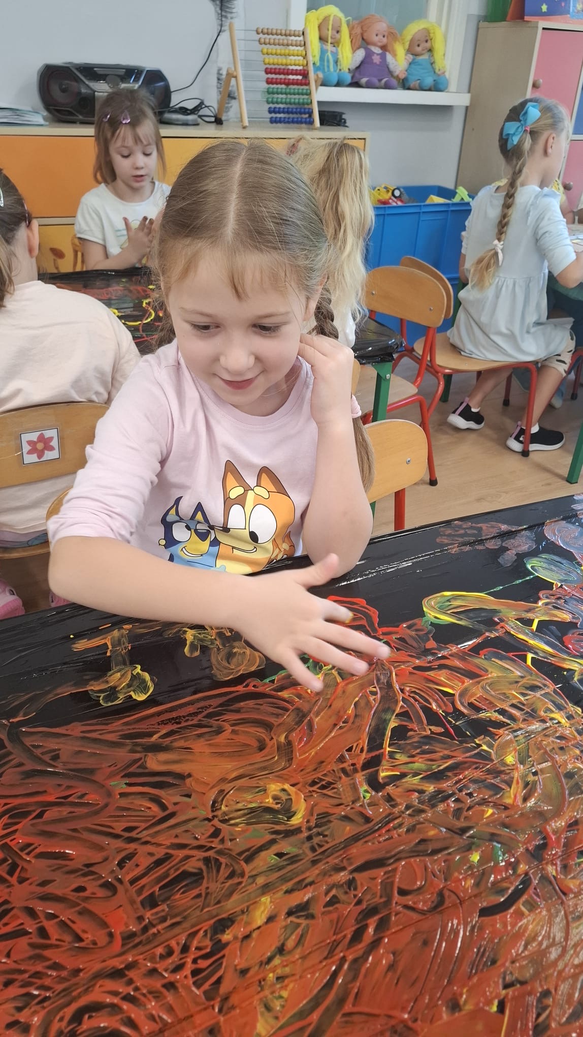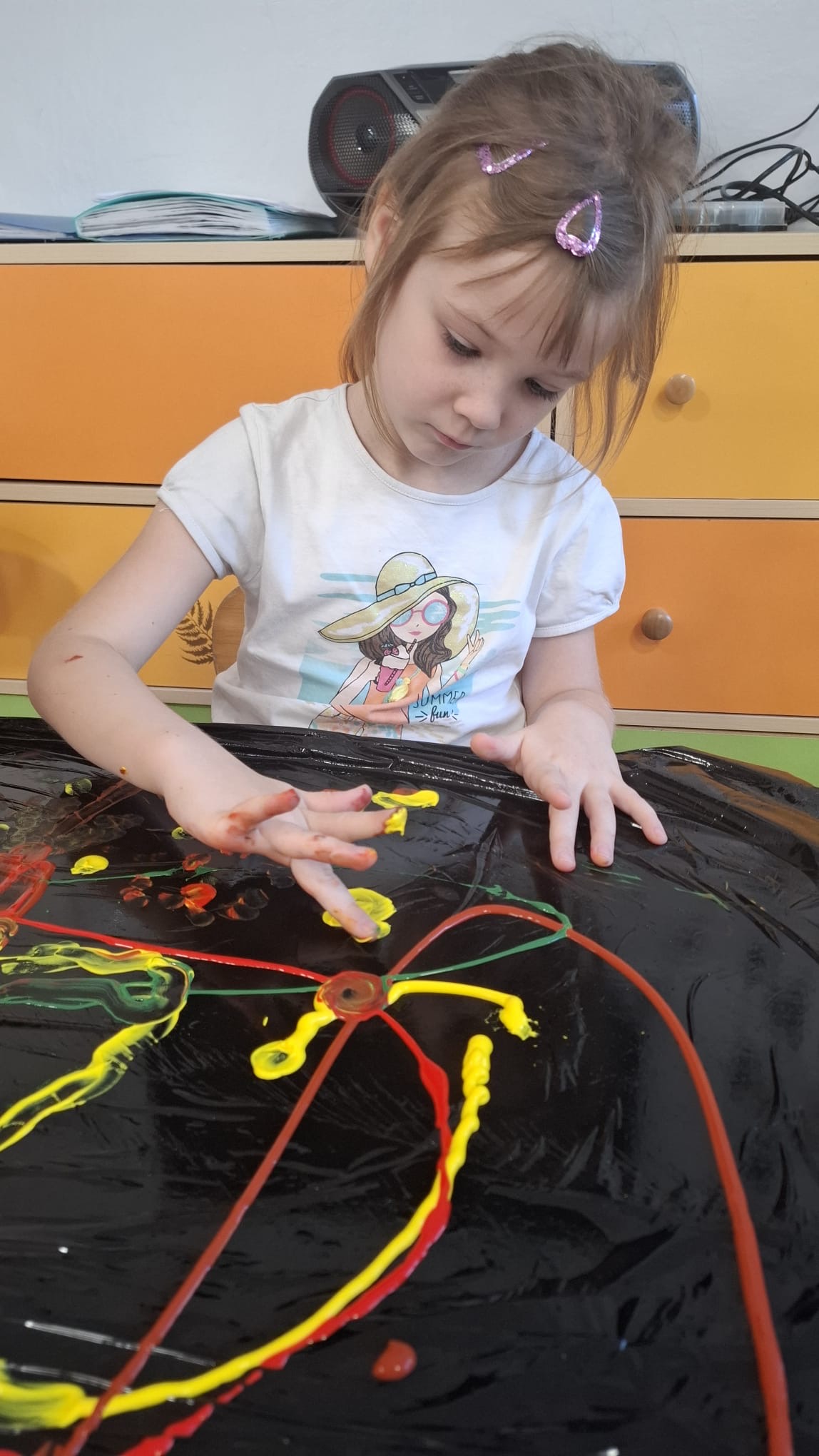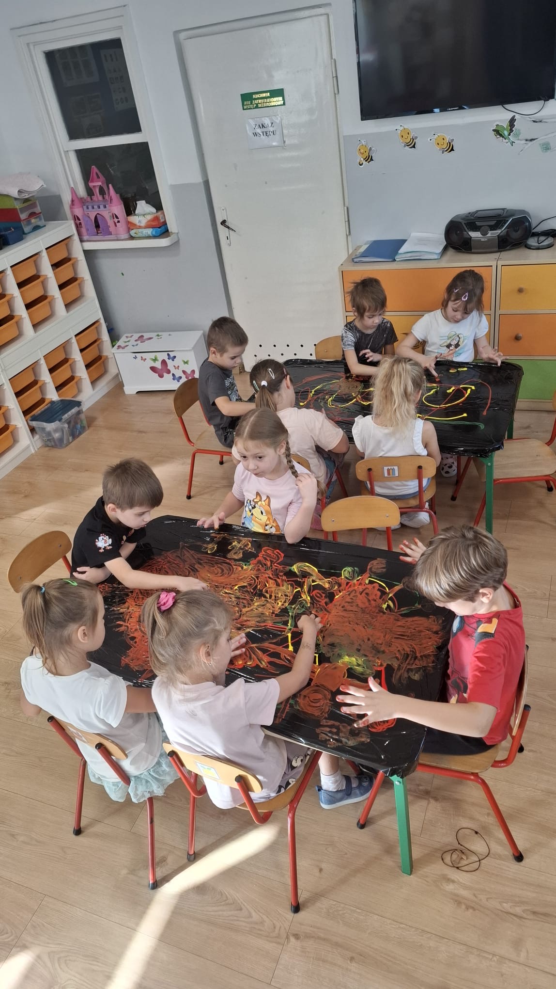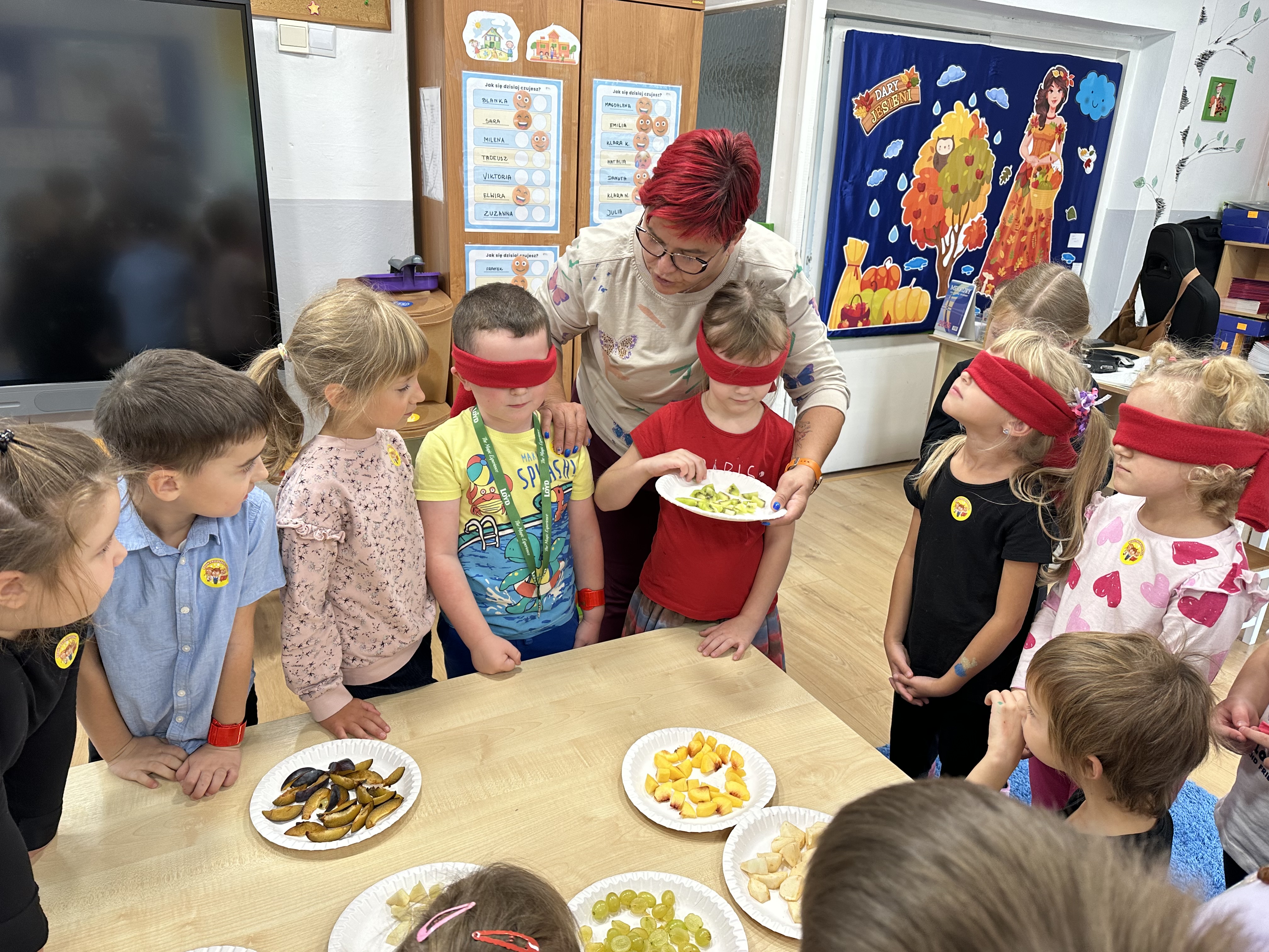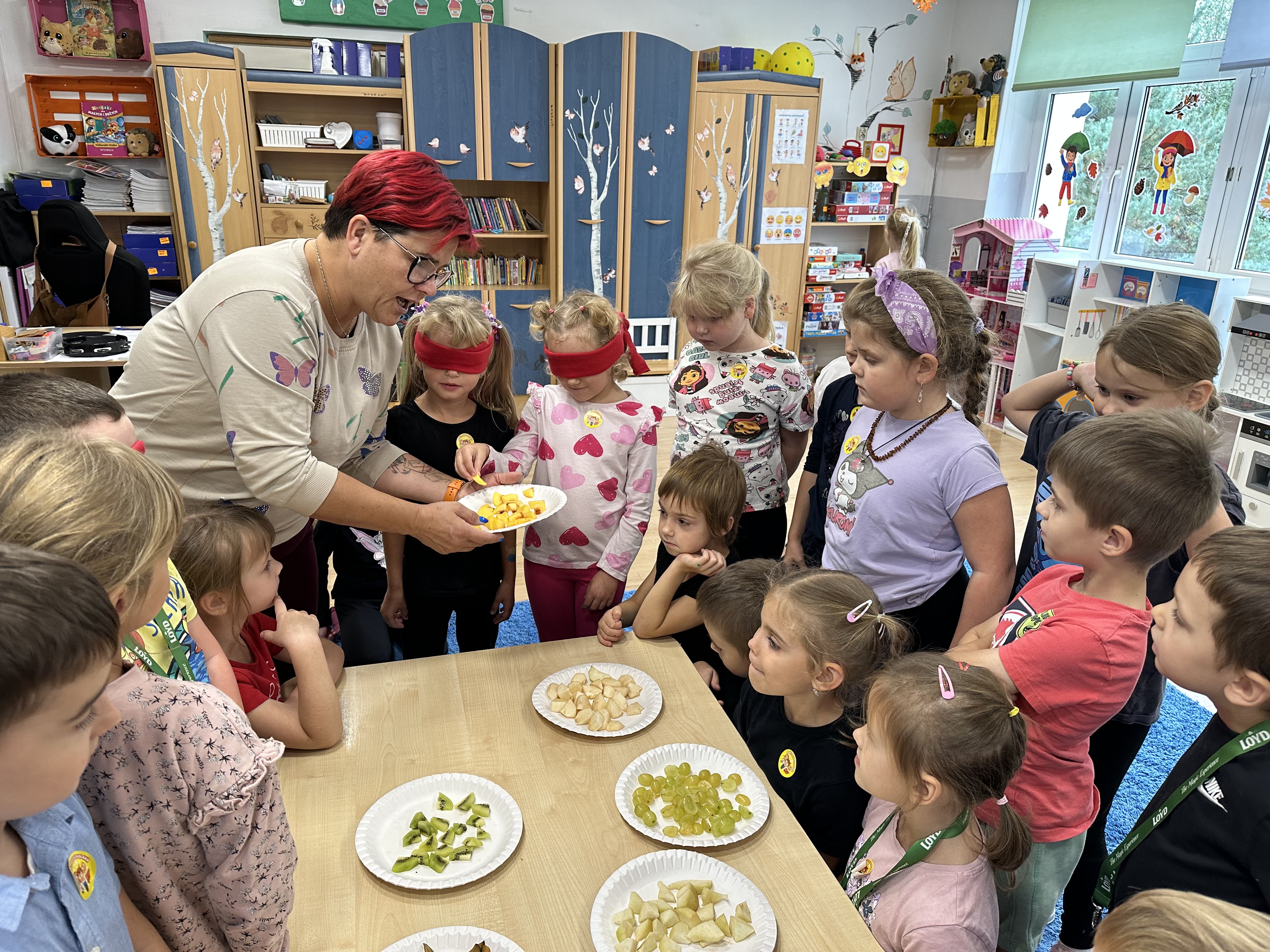 W poniedziałek po zabawie ,,Wokół kolorów” kształtującej koncentrację, dzieci uczestniczyły w porannych ćwiczeniach gimnastycznych, rozwijały tym samym duże grupy mięśniowe. Następnie wysłuchały opowiadania Marii Pawlisz ,,Skarby jesieni” i wspólnie zastanawiały się, w jaki sposób można zachwycać się jesienią, i co jest w niej takiego nadzwyczajnego. Omawiały również symbole i skarby jesieni. Dzieci brały udział w zabawach ruchowych o tematyce jesiennej. Podczas ,,Jesiennych rozmów” wymieniały się doświadczeniami i na podstawie wcześniej wysłuchanego opowiadania odpowiadały na pytania nauczyciela. Utrwalały nazwy jesiennych ubrań i uczestniczyły w zabawie ,,ciepło – zimno”. Po zaśpiewaniu powitanki wtorek dzieci zaczęły zabawą logopedyczną, rozwijającą prawidłową motorykę narządów mowy. Wysłuchały wiersza ,,Wrzesień” Józefa Birkenmajera i brały aktywny udział w rozmowie dotyczącej owoców i potraw, które się z nich przyrządza. Tego dnia poznały literę O, o. Podczas zabaw językowych i fonacyjnych dokonywały syntezy i analizy głoskowej wyrazu ,,owoce” oraz układały schemat tego słowa z kartoników. Samodzielnie, po zapoznaniu z zapisem graficznym małej i wielkiej litery o, O, pisały ją palcem wskazującym na dywanie. Podczas zabaw przy stolikach rozwijały grafomotorykę, rysowały szlaczek po śladzie i ozdabiały szablon litery O. W środowy poranek dzieci ćwiczyły pamięć wzrokową poprzez zapamiętywanie ułożenia figur geometrycznych. Podczas zabaw „O znakach”, „Auta i piesi”, „Kolor i kształt znaku” i „Po kałużach” dzieci zapoznały się ze znakami drogowymi. Dowiedziały się, jakie znaki wyróżniamy (informacyjne, ostrzegawcze i zakazu) oraz nauczyły się podstawowych zwrotów po angielsku. Podczas zabaw przy stolikach wykonywały zadania zgodnie z kodem. Czwartek dotyczył witamin oraz jesiennych owoców. Dzieci dowiedziały się o korzystnym wpływie owoców na zdrowie. Podczas zabawy „Straganiki” zapoznały się z piramidą/talerzem zdrowego żywienia. Próbowały różnych owoców z zasłoniętymi oczami i odgadywały, co to za owoc. Podczas zabaw „Witaminy w moim brzuchu” i „Zjem, bo wiem” dowiedziały się, czym są witaminy i gdzie można je znaleźć. Dzień zakończyły kulinarną zabawą i degustacją owocowych szaszłyków. W piątek dzieci bawiły się do muzyki klasycznej, kształtując tym samym wyczucie rytmu i reakcje na zmianę charakteru muzyki. Wysłuchały wiersza Wandy Chotomskiej ,,Deszcz”, który był wprowadzeniem do rozmowy dotyczącej artystycznej inspiracji jesienią. Przypominały sobie tekst ,,Domowej piosenki” i naśladowały do niej różne czynności związane ze zwierzętami. Podczas zabaw przy stolikach wykonały pracę plastyczno-techniczną według instrukcji. Nie zabrakło zabaw przyrodniczych na dworze z wykorzystaniem nowych słówek w języku angielskim. Przedszkolaki utrwaliły znajomość kolorów po angielsku. Dzień skończyły dzień wykonaniem pracy związanej z jesienną, martwą naturą.