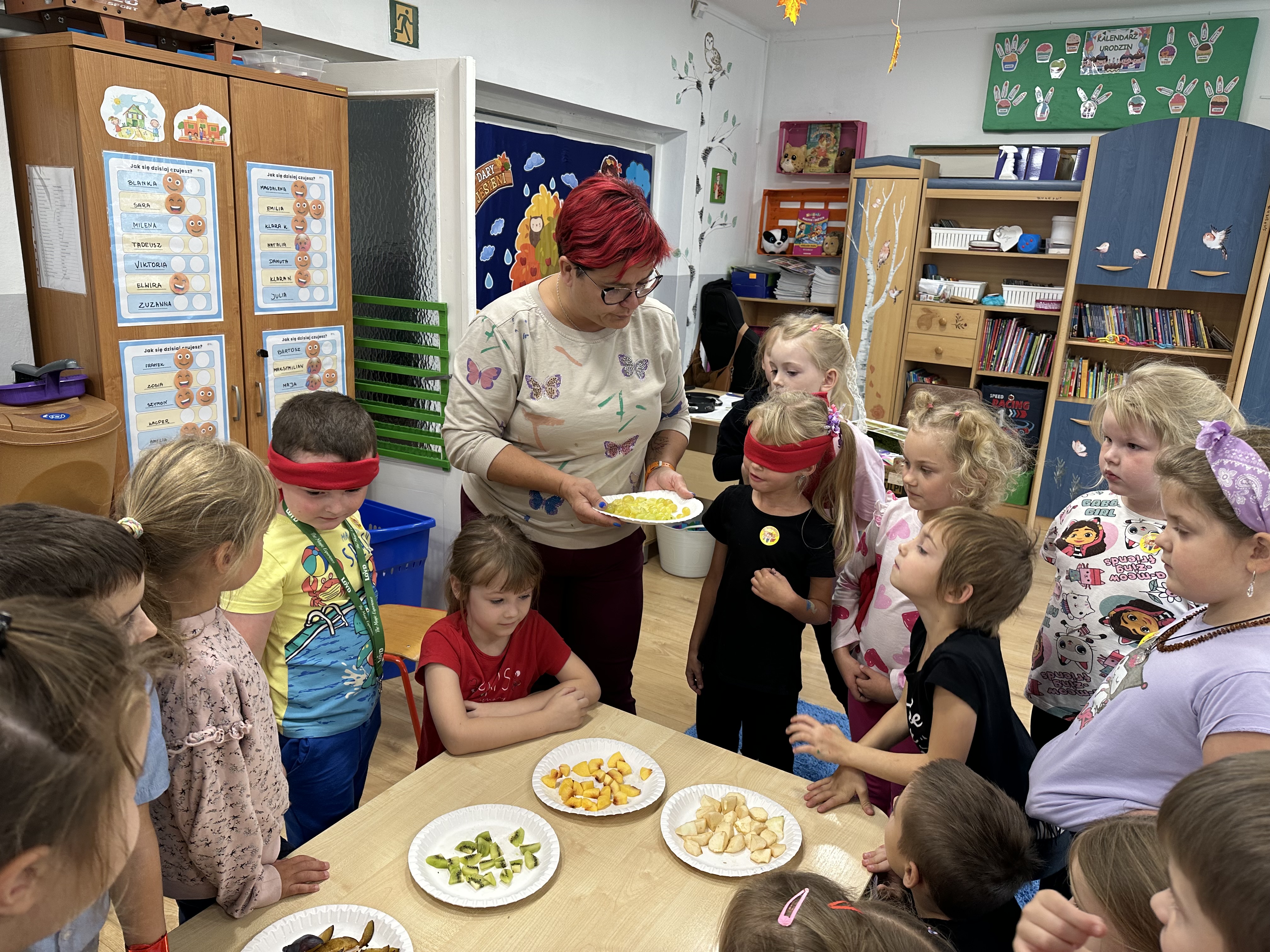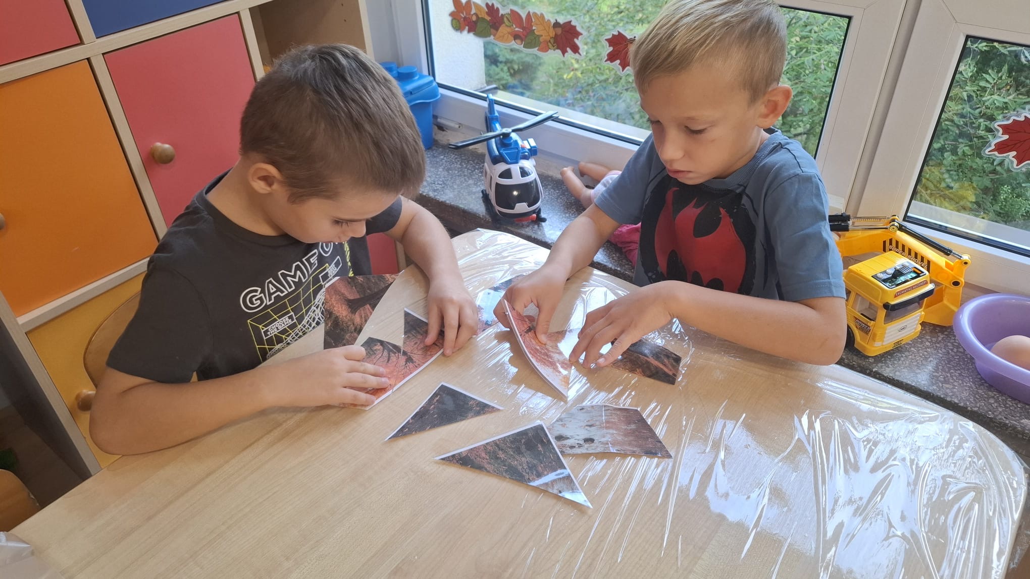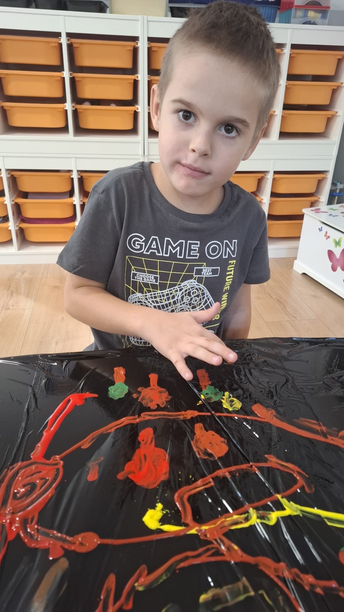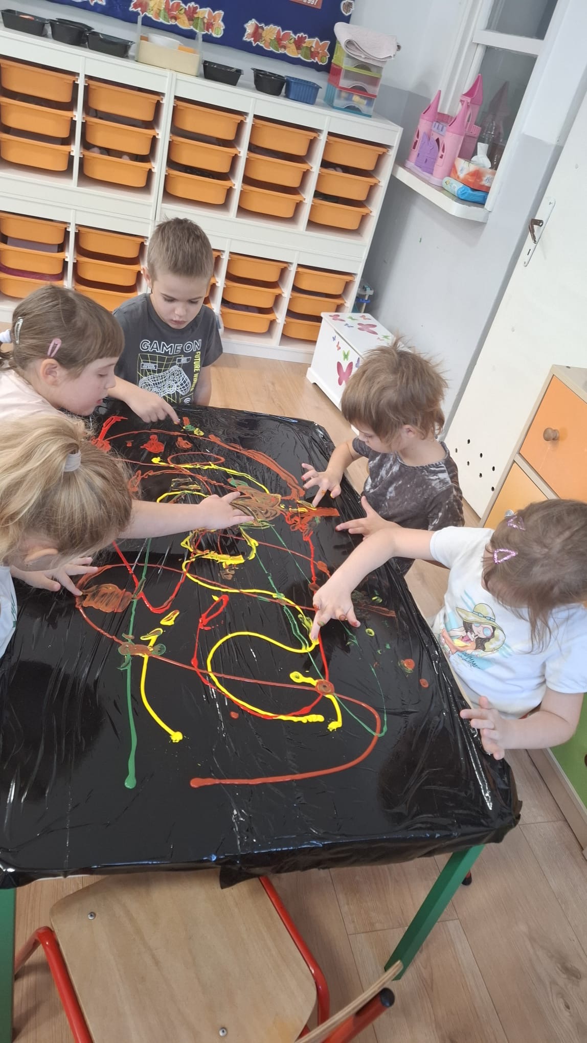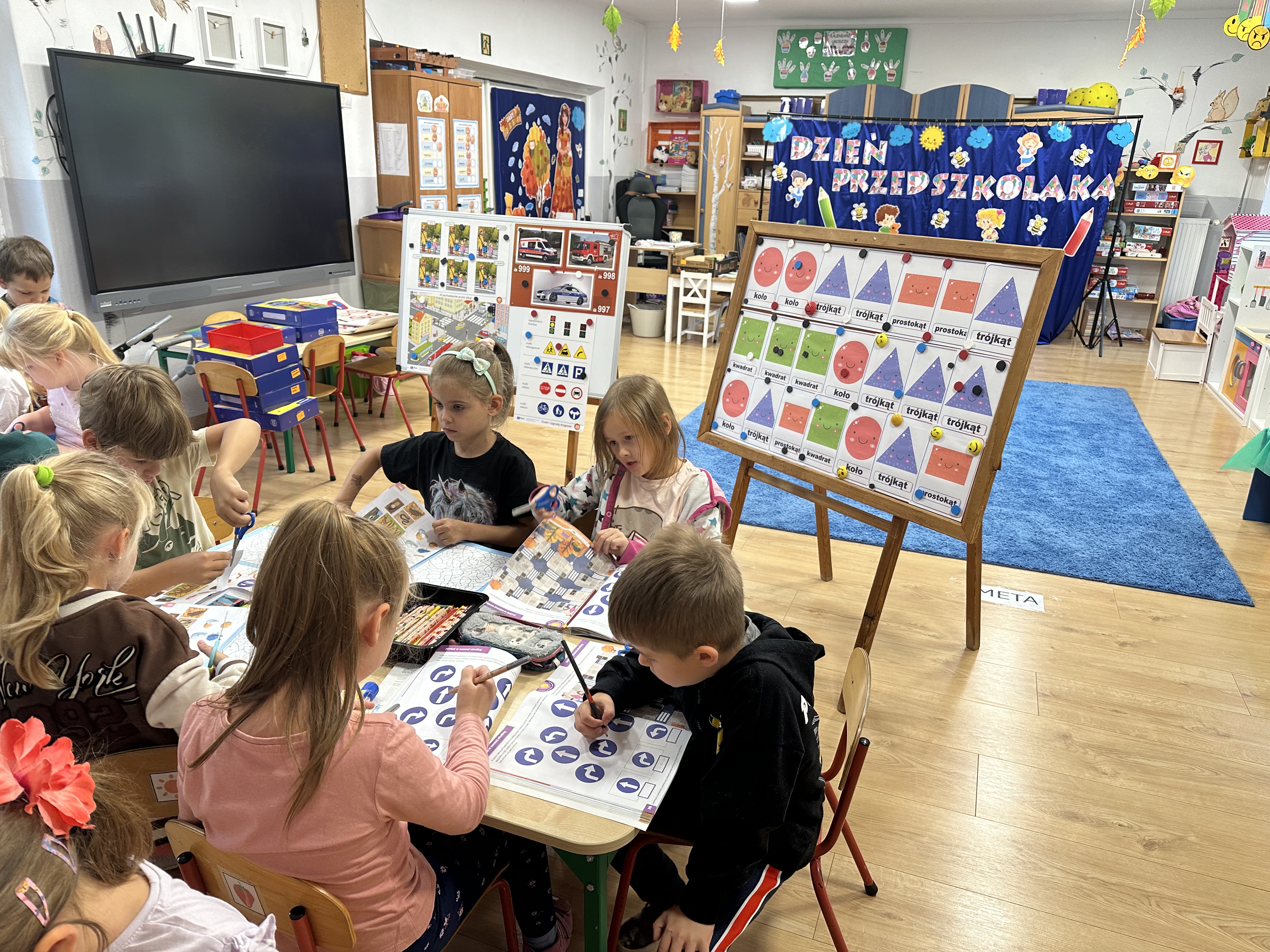 W poniedziałek po zabawie ,,Wokół kolorów” kształtującej koncentrację, dzieci uczestniczyły w porannych ćwiczeniach gimnastycznych, rozwijały tym samym duże grupy mięśniowe. Następnie wysłuchały opowiadania Marii Pawlisz ,,Skarby jesieni” i wspólnie zastanawiały się, w jaki sposób można zachwycać się jesienią, i co jest w niej takiego nadzwyczajnego. Omawiały również symbole i skarby jesieni. Dzieci brały udział w zabawach ruchowych o tematyce jesiennej. Podczas ,,Jesiennych rozmów” wymieniały się doświadczeniami i na podstawie wcześniej wysłuchanego opowiadania odpowiadały na pytania nauczyciela. Utrwalały nazwy jesiennych ubrań i uczestniczyły w zabawie ,,ciepło – zimno”. Po zaśpiewaniu powitanki wtorek dzieci zaczęły zabawą logopedyczną, rozwijającą prawidłową motorykę narządów mowy. Wysłuchały wiersza ,,Wrzesień” Józefa Birkenmajera i brały aktywny udział w rozmowie dotyczącej owoców i potraw, które się z nich przyrządza. Tego dnia poznały literę O, o. Podczas zabaw językowych i fonacyjnych dokonywały syntezy i analizy głoskowej wyrazu ,,owoce” oraz układały schemat tego słowa z kartoników. Samodzielnie, po zapoznaniu z zapisem graficznym małej i wielkiej litery o, O, pisały ją palcem wskazującym na dywanie. Podczas zabaw przy stolikach rozwijały grafomotorykę, rysowały szlaczek po śladzie i ozdabiały szablon litery O. W środowy poranek dzieci ćwiczyły pamięć wzrokową poprzez zapamiętywanie ułożenia figur geometrycznych. Podczas zabaw „O znakach”, „Auta i piesi”, „Kolor i kształt znaku” i „Po kałużach” dzieci zapoznały się ze znakami drogowymi. Dowiedziały się, jakie znaki wyróżniamy (informacyjne, ostrzegawcze i zakazu) oraz nauczyły się podstawowych zwrotów po angielsku. Podczas zabaw przy stolikach wykonywały zadania zgodnie z kodem. Czwartek dotyczył witamin oraz jesiennych owoców. Dzieci dowiedziały się o korzystnym wpływie owoców na zdrowie. Podczas zabawy „Straganiki” zapoznały się z piramidą/talerzem zdrowego żywienia. Próbowały różnych owoców z zasłoniętymi oczami i odgadywały, co to za owoc. Podczas zabaw „Witaminy w moim brzuchu” i „Zjem, bo wiem” dowiedziały się, czym są witaminy i gdzie można je znaleźć. Dzień zakończyły kulinarną zabawą i degustacją owocowych szaszłyków. W piątek dzieci bawiły się do muzyki klasycznej, kształtując tym samym wyczucie rytmu i reakcje na zmianę charakteru muzyki. Wysłuchały wiersza Wandy Chotomskiej ,,Deszcz”, który był wprowadzeniem do rozmowy dotyczącej artystycznej inspiracji jesienią. Przypominały sobie tekst ,,Domowej piosenki” i naśladowały do niej różne czynności związane ze zwierzętami. Podczas zabaw przy stolikach wykonały pracę plastyczno-techniczną według instrukcji. Nie zabrakło zabaw przyrodniczych na dworze z wykorzystaniem nowych słówek w języku angielskim. Przedszkolaki utrwaliły znajomość kolorów po angielsku. Dzień skończyły dzień wykonaniem pracy związanej z jesienną, martwą naturą.