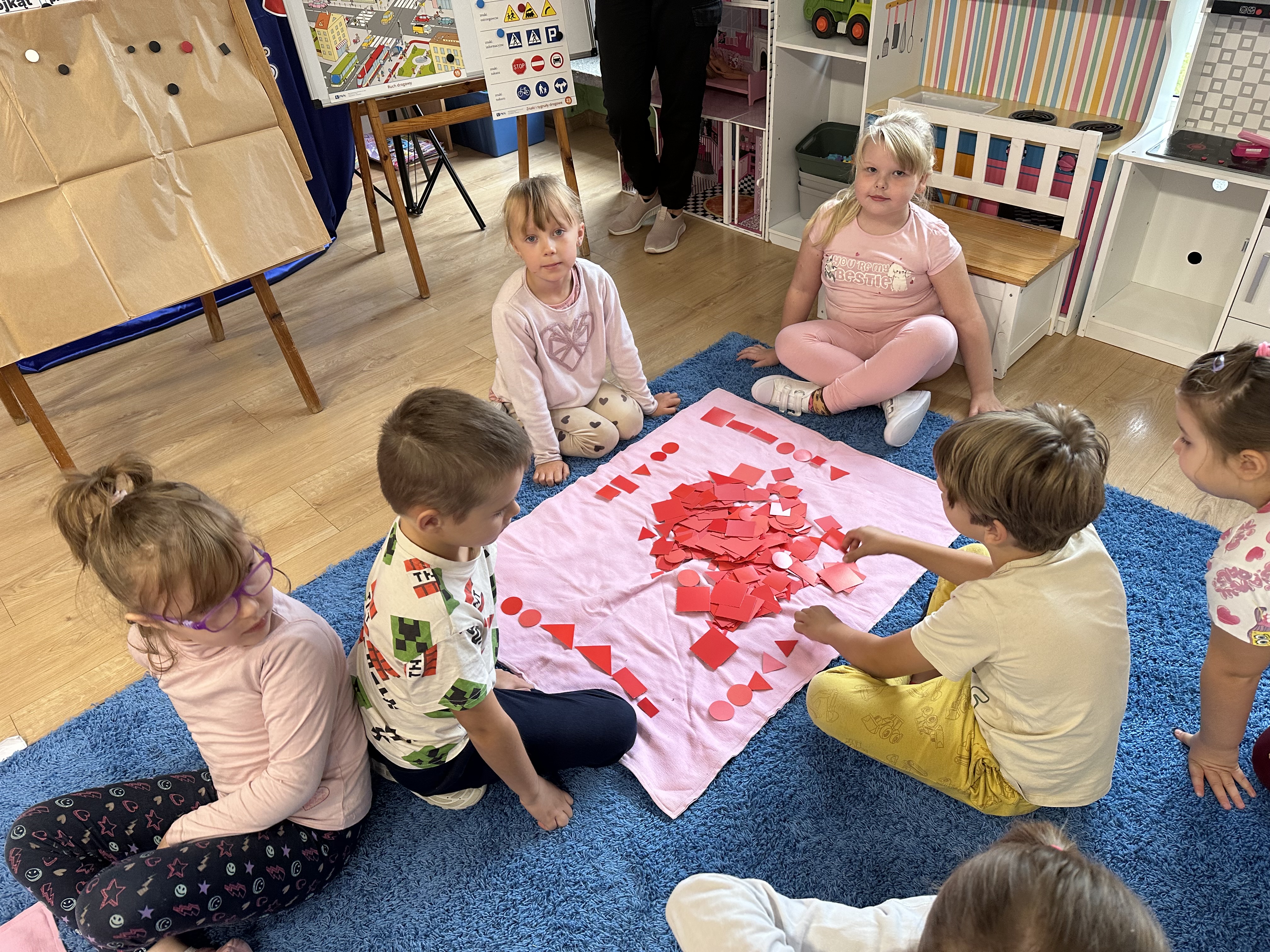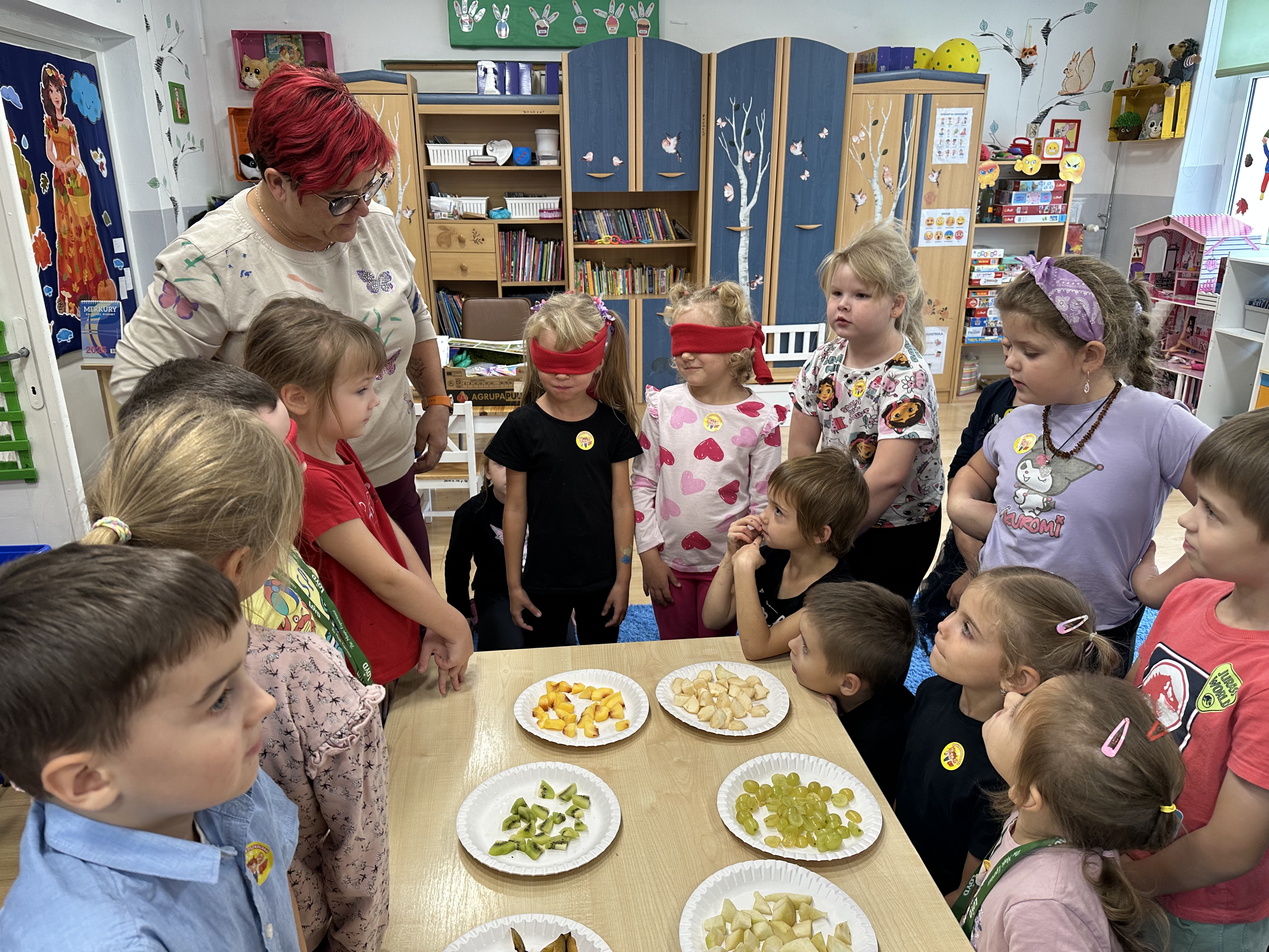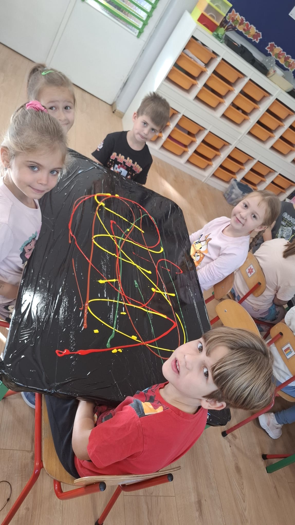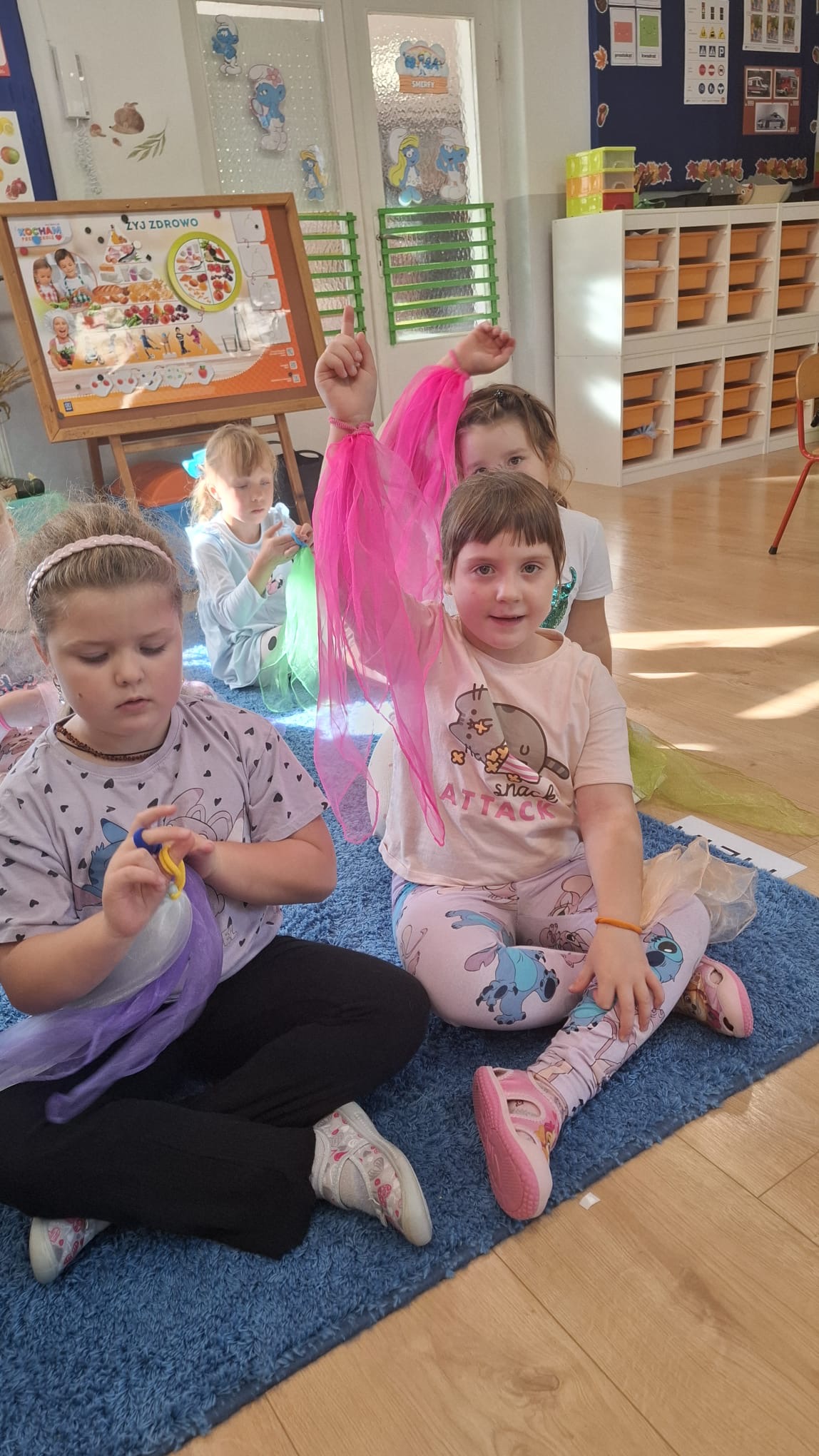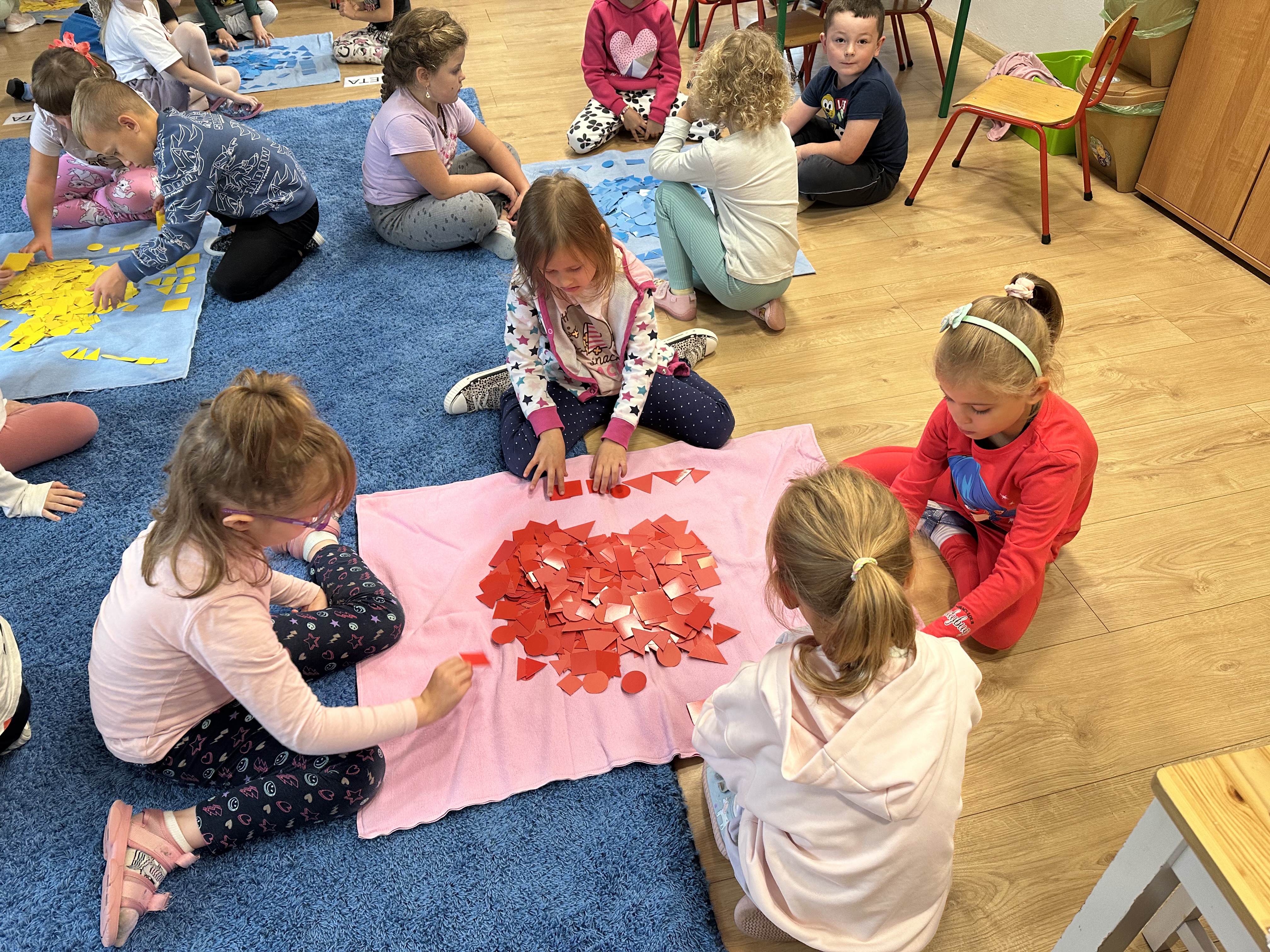 W poniedziałek po zabawie ,,Wokół kolorów” kształtującej koncentrację, dzieci uczestniczyły w porannych ćwiczeniach gimnastycznych, rozwijały tym samym duże grupy mięśniowe. Następnie wysłuchały opowiadania Marii Pawlisz ,,Skarby jesieni” i wspólnie zastanawiały się, w jaki sposób można zachwycać się jesienią, i co jest w niej takiego nadzwyczajnego. Omawiały również symbole i skarby jesieni. Dzieci brały udział w zabawach ruchowych o tematyce jesiennej. Podczas ,,Jesiennych rozmów” wymieniały się doświadczeniami i na podstawie wcześniej wysłuchanego opowiadania odpowiadały na pytania nauczyciela. Utrwalały nazwy jesiennych ubrań i uczestniczyły w zabawie ,,ciepło – zimno”. Po zaśpiewaniu powitanki wtorek dzieci zaczęły zabawą logopedyczną, rozwijającą prawidłową motorykę narządów mowy. Wysłuchały wiersza ,,Wrzesień” Józefa Birkenmajera i brały aktywny udział w rozmowie dotyczącej owoców i potraw, które się z nich przyrządza. Tego dnia poznały literę O, o. Podczas zabaw językowych i fonacyjnych dokonywały syntezy i analizy głoskowej wyrazu ,,owoce” oraz układały schemat tego słowa z kartoników. Samodzielnie, po zapoznaniu z zapisem graficznym małej i wielkiej litery o, O, pisały ją palcem wskazującym na dywanie. Podczas zabaw przy stolikach rozwijały grafomotorykę, rysowały szlaczek po śladzie i ozdabiały szablon litery O. W środowy poranek dzieci ćwiczyły pamięć wzrokową poprzez zapamiętywanie ułożenia figur geometrycznych. Podczas zabaw „O znakach”, „Auta i piesi”, „Kolor i kształt znaku” i „Po kałużach” dzieci zapoznały się ze znakami drogowymi. Dowiedziały się, jakie znaki wyróżniamy (informacyjne, ostrzegawcze i zakazu) oraz nauczyły się podstawowych zwrotów po angielsku. Podczas zabaw przy stolikach wykonywały zadania zgodnie z kodem. Czwartek dotyczył witamin oraz jesiennych owoców. Dzieci dowiedziały się o korzystnym wpływie owoców na zdrowie. Podczas zabawy „Straganiki” zapoznały się z piramidą/talerzem zdrowego żywienia. Próbowały różnych owoców z zasłoniętymi oczami i odgadywały, co to za owoc. Podczas zabaw „Witaminy w moim brzuchu” i „Zjem, bo wiem” dowiedziały się, czym są witaminy i gdzie można je znaleźć. Dzień zakończyły kulinarną zabawą i degustacją owocowych szaszłyków. W piątek dzieci bawiły się do muzyki klasycznej, kształtując tym samym wyczucie rytmu i reakcje na zmianę charakteru muzyki. Wysłuchały wiersza Wandy Chotomskiej ,,Deszcz”, który był wprowadzeniem do rozmowy dotyczącej artystycznej inspiracji jesienią. Przypominały sobie tekst ,,Domowej piosenki” i naśladowały do niej różne czynności związane ze zwierzętami. Podczas zabaw przy stolikach wykonały pracę plastyczno-techniczną według instrukcji. Nie zabrakło zabaw przyrodniczych na dworze z wykorzystaniem nowych słówek w języku angielskim. Przedszkolaki utrwaliły znajomość kolorów po angielsku. Dzień skończyły dzień wykonaniem pracy związanej z jesienną, martwą naturą.