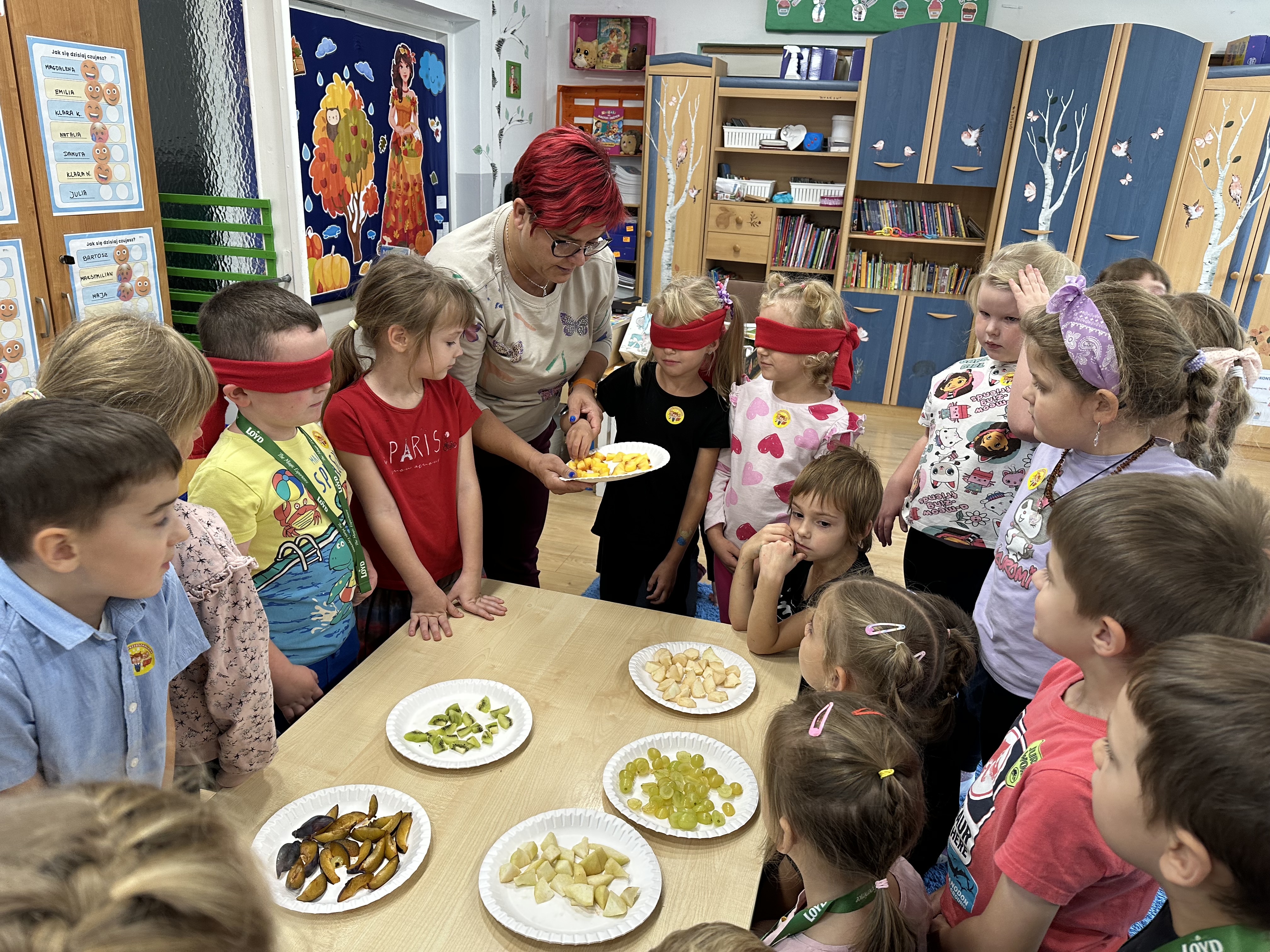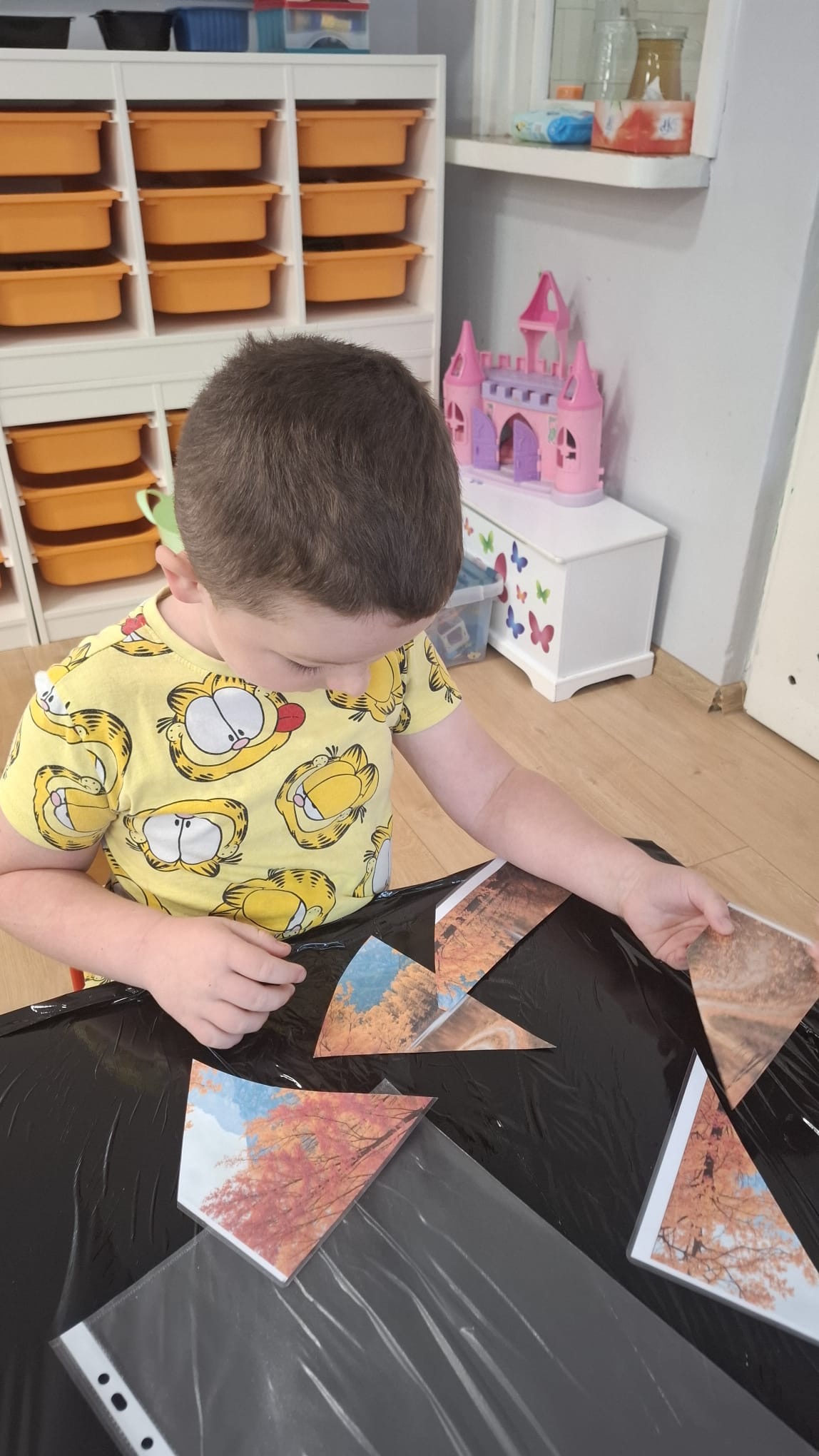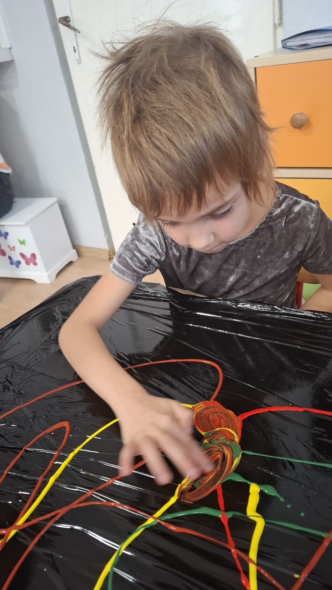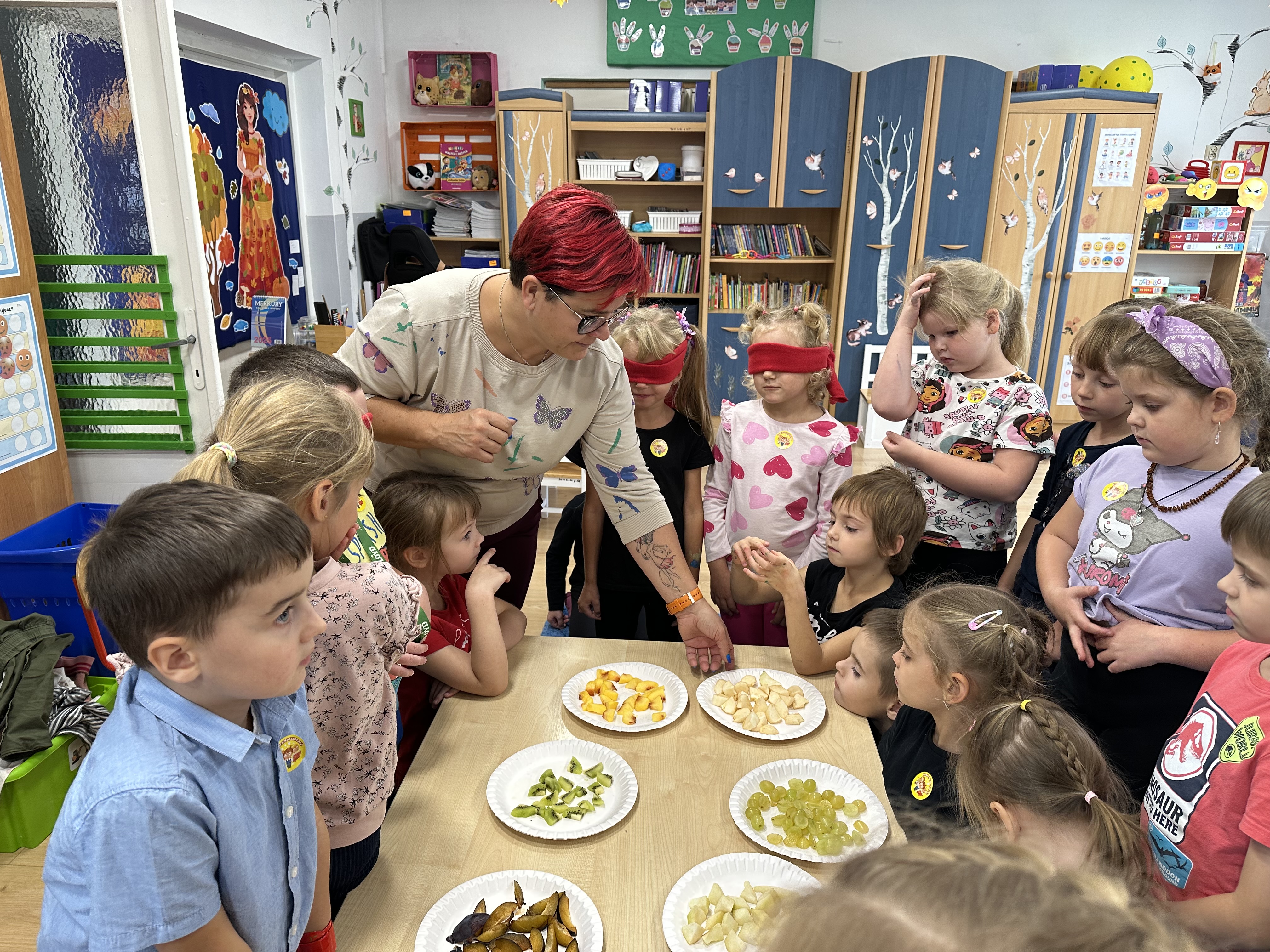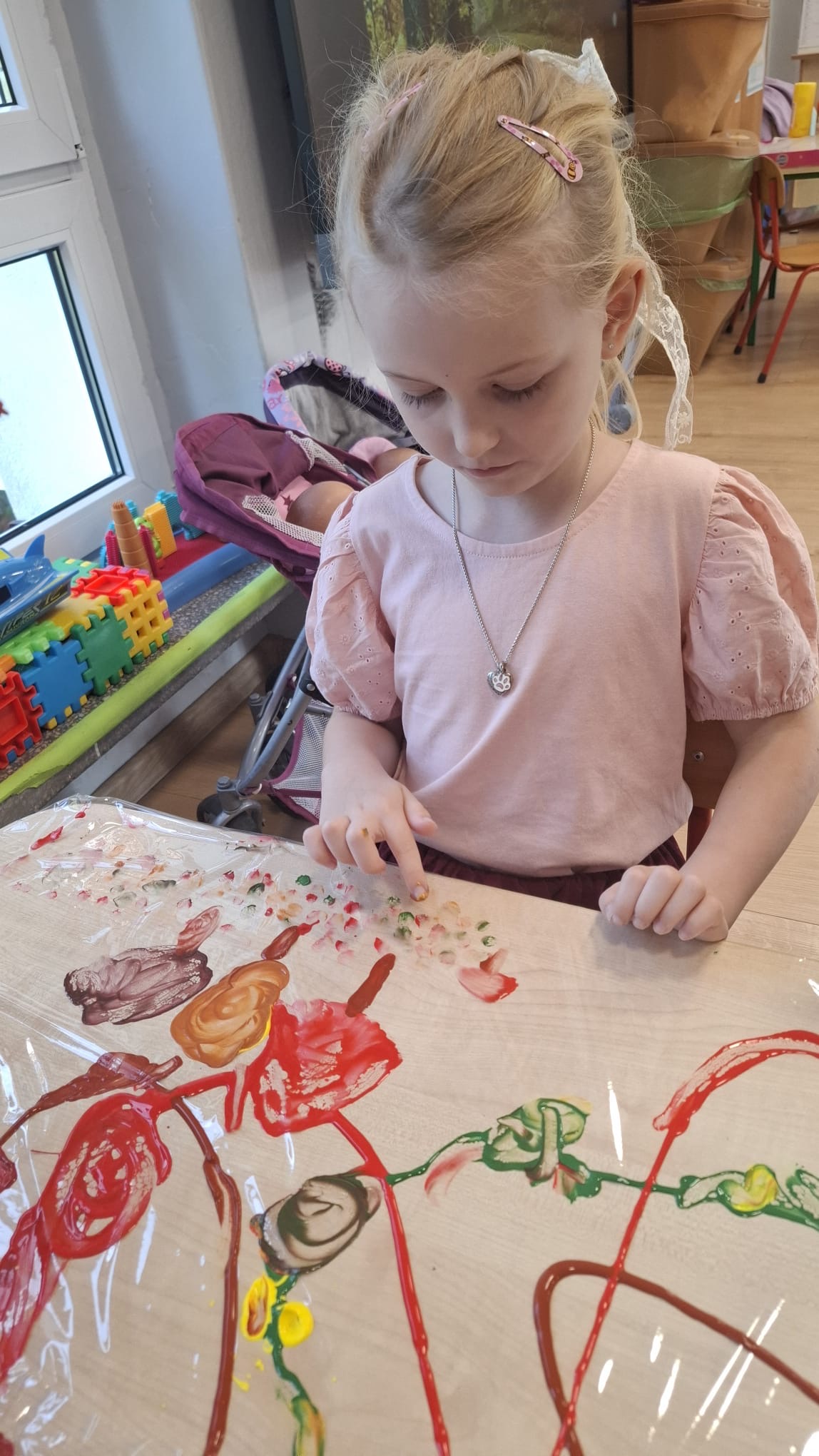 W poniedziałek po zabawie ,,Wokół kolorów” kształtującej koncentrację, dzieci uczestniczyły w porannych ćwiczeniach gimnastycznych, rozwijały tym samym duże grupy mięśniowe. Następnie wysłuchały opowiadania Marii Pawlisz ,,Skarby jesieni” i wspólnie zastanawiały się, w jaki sposób można zachwycać się jesienią, i co jest w niej takiego nadzwyczajnego. Omawiały również symbole i skarby jesieni. Dzieci brały udział w zabawach ruchowych o tematyce jesiennej. Podczas ,,Jesiennych rozmów” wymieniały się doświadczeniami i na podstawie wcześniej wysłuchanego opowiadania odpowiadały na pytania nauczyciela. Utrwalały nazwy jesiennych ubrań i uczestniczyły w zabawie ,,ciepło – zimno”. Po zaśpiewaniu powitanki wtorek dzieci zaczęły zabawą logopedyczną, rozwijającą prawidłową motorykę narządów mowy. Wysłuchały wiersza ,,Wrzesień” Józefa Birkenmajera i brały aktywny udział w rozmowie dotyczącej owoców i potraw, które się z nich przyrządza. Tego dnia poznały literę O, o. Podczas zabaw językowych i fonacyjnych dokonywały syntezy i analizy głoskowej wyrazu ,,owoce” oraz układały schemat tego słowa z kartoników. Samodzielnie, po zapoznaniu z zapisem graficznym małej i wielkiej litery o, O, pisały ją palcem wskazującym na dywanie. Podczas zabaw przy stolikach rozwijały grafomotorykę, rysowały szlaczek po śladzie i ozdabiały szablon litery O. W środowy poranek dzieci ćwiczyły pamięć wzrokową poprzez zapamiętywanie ułożenia figur geometrycznych. Podczas zabaw „O znakach”, „Auta i piesi”, „Kolor i kształt znaku” i „Po kałużach” dzieci zapoznały się ze znakami drogowymi. Dowiedziały się, jakie znaki wyróżniamy (informacyjne, ostrzegawcze i zakazu) oraz nauczyły się podstawowych zwrotów po angielsku. Podczas zabaw przy stolikach wykonywały zadania zgodnie z kodem. Czwartek dotyczył witamin oraz jesiennych owoców. Dzieci dowiedziały się o korzystnym wpływie owoców na zdrowie. Podczas zabawy „Straganiki” zapoznały się z piramidą/talerzem zdrowego żywienia. Próbowały różnych owoców z zasłoniętymi oczami i odgadywały, co to za owoc. Podczas zabaw „Witaminy w moim brzuchu” i „Zjem, bo wiem” dowiedziały się, czym są witaminy i gdzie można je znaleźć. Dzień zakończyły kulinarną zabawą i degustacją owocowych szaszłyków. W piątek dzieci bawiły się do muzyki klasycznej, kształtując tym samym wyczucie rytmu i reakcje na zmianę charakteru muzyki. Wysłuchały wiersza Wandy Chotomskiej ,,Deszcz”, który był wprowadzeniem do rozmowy dotyczącej artystycznej inspiracji jesienią. Przypominały sobie tekst ,,Domowej piosenki” i naśladowały do niej różne czynności związane ze zwierzętami. Podczas zabaw przy stolikach wykonały pracę plastyczno-techniczną według instrukcji. Nie zabrakło zabaw przyrodniczych na dworze z wykorzystaniem nowych słówek w języku angielskim. Przedszkolaki utrwaliły znajomość kolorów po angielsku. Dzień skończyły dzień wykonaniem pracy związanej z jesienną, martwą naturą.