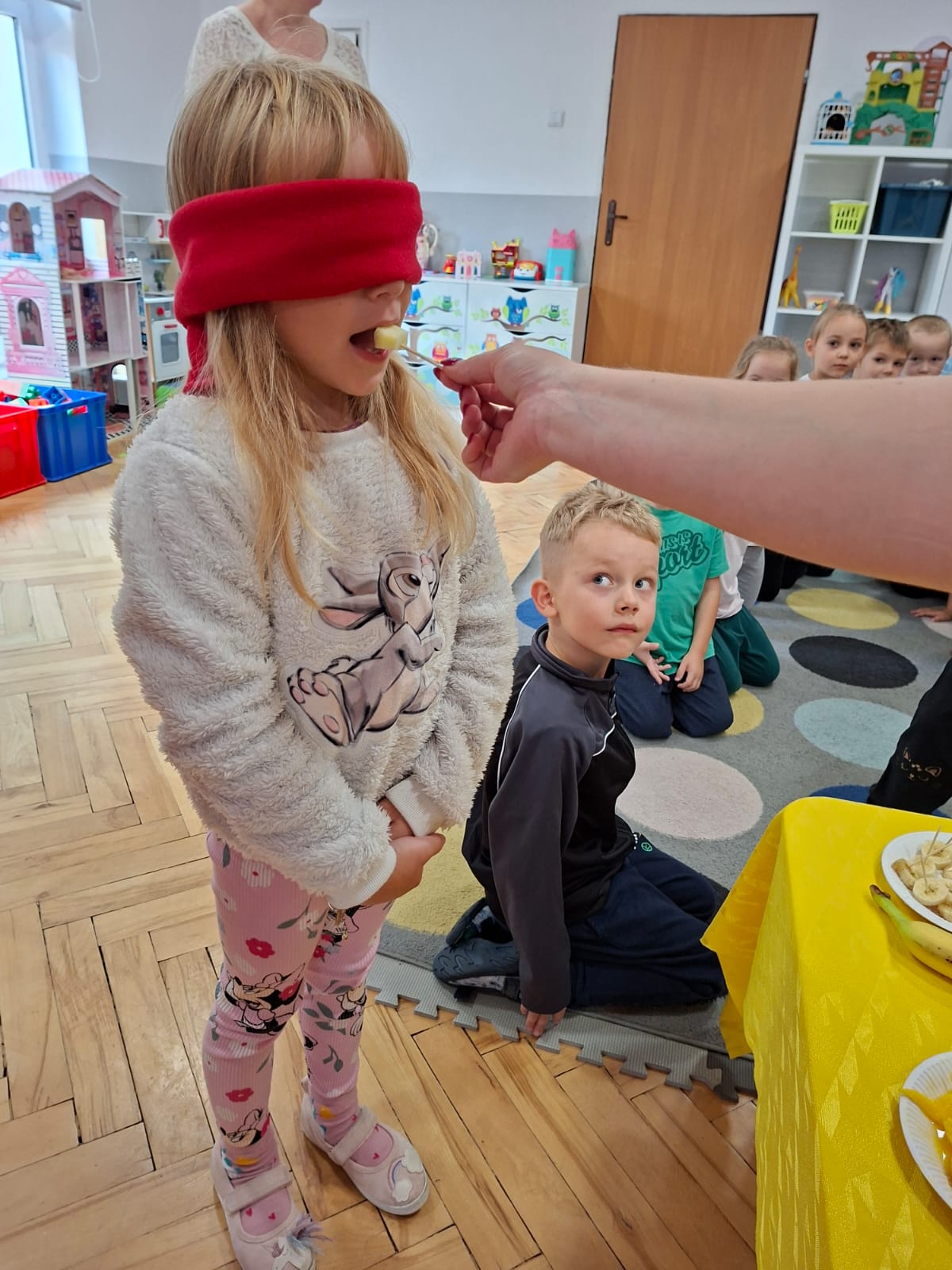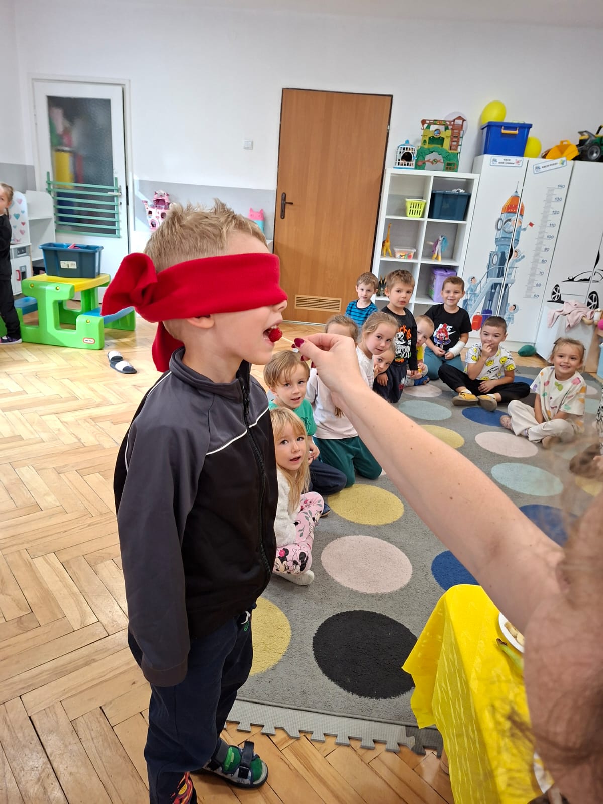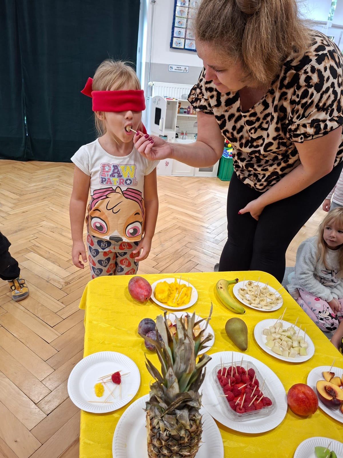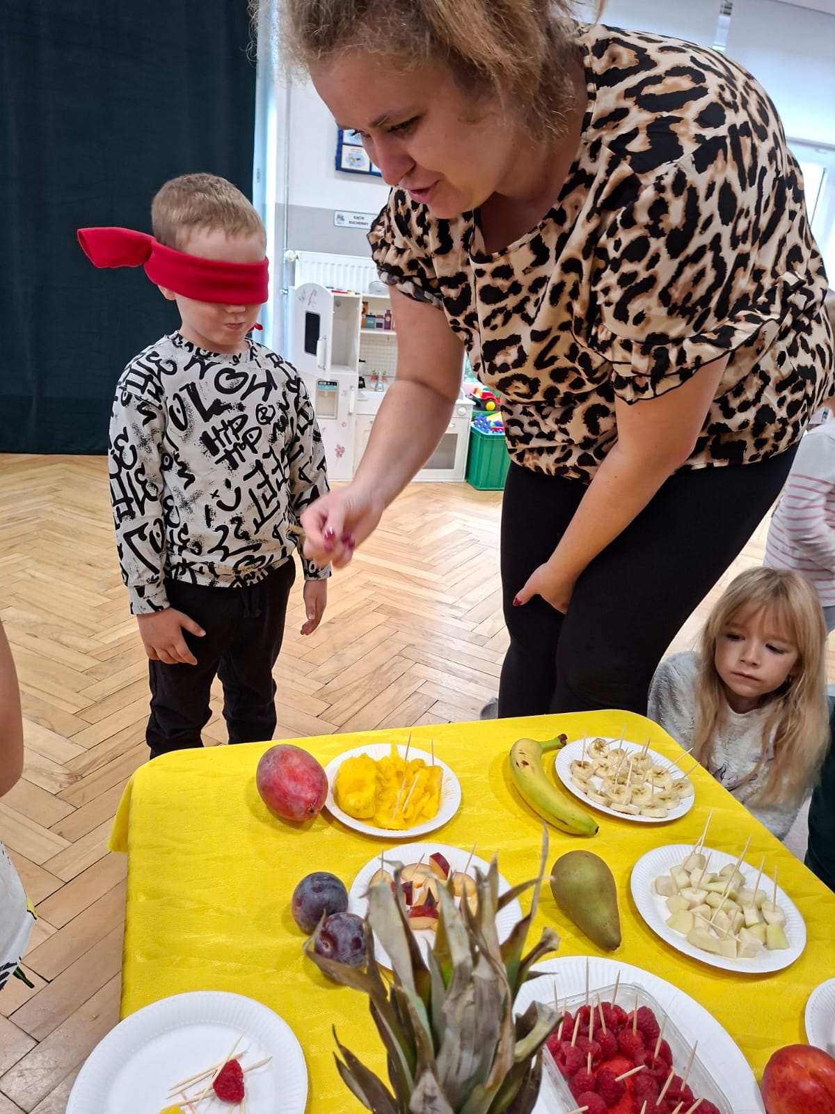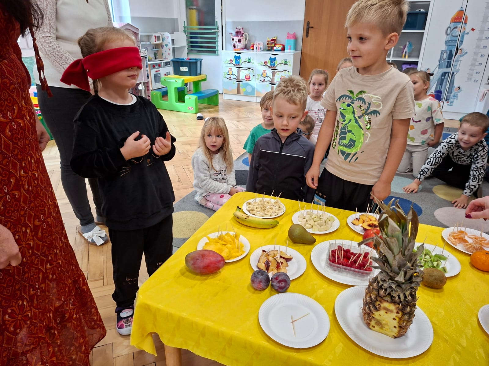 Rozpoznawaliśmy różne owoce, dotykając ich zgadując co to za owoc w czarodziejskim pudełku , smakując ich z zamkniętymi oczami i odgadując co to za owoc, dzieci poszerzały w ten sposób swoją świadomość dotyczącą wpływu owoców na zdrowie człowieka oraz rozumienie znaczenia witamin dla zdrowia człowieka.