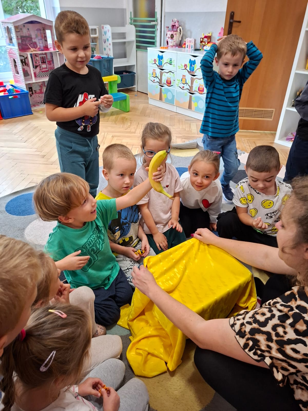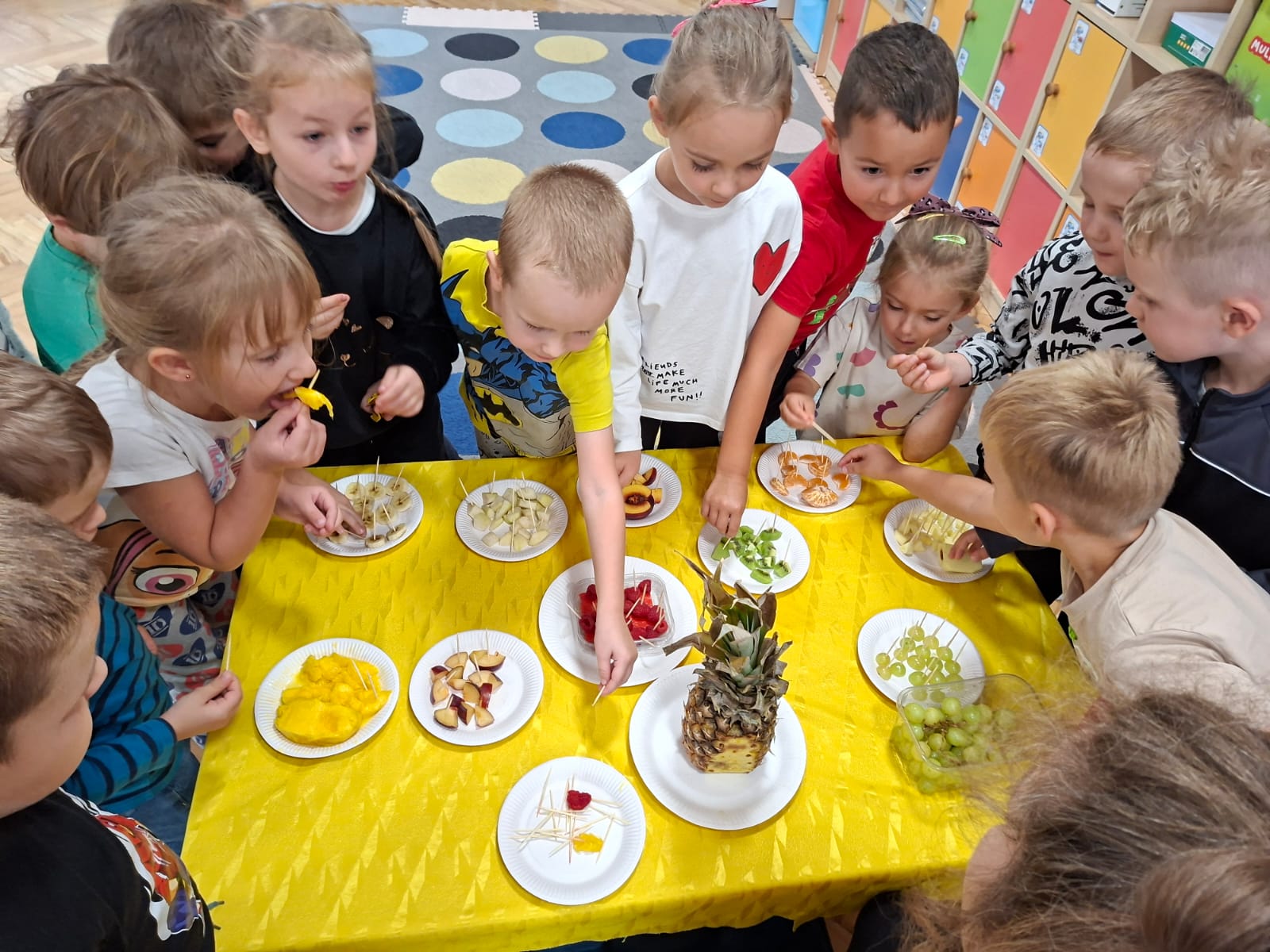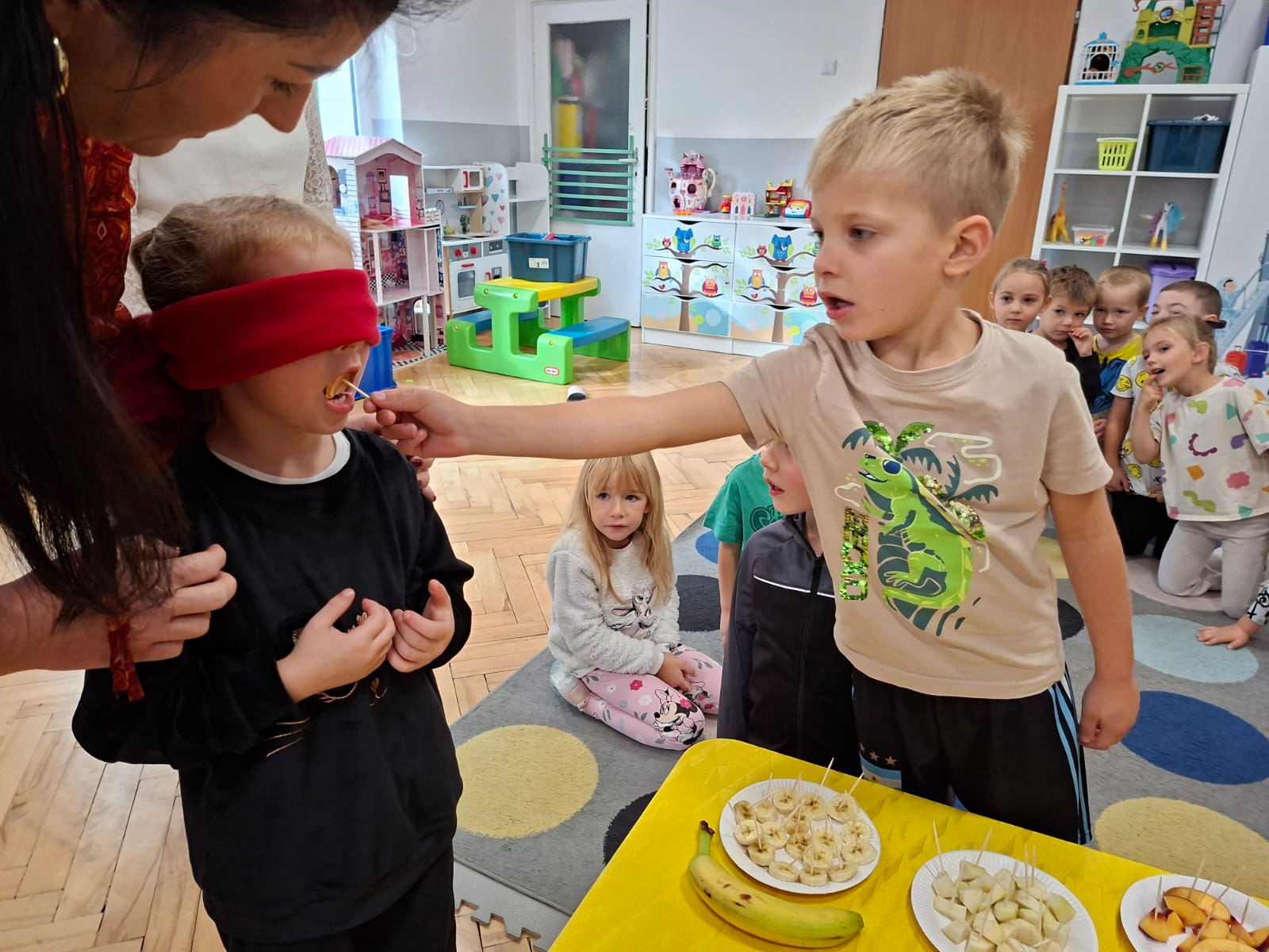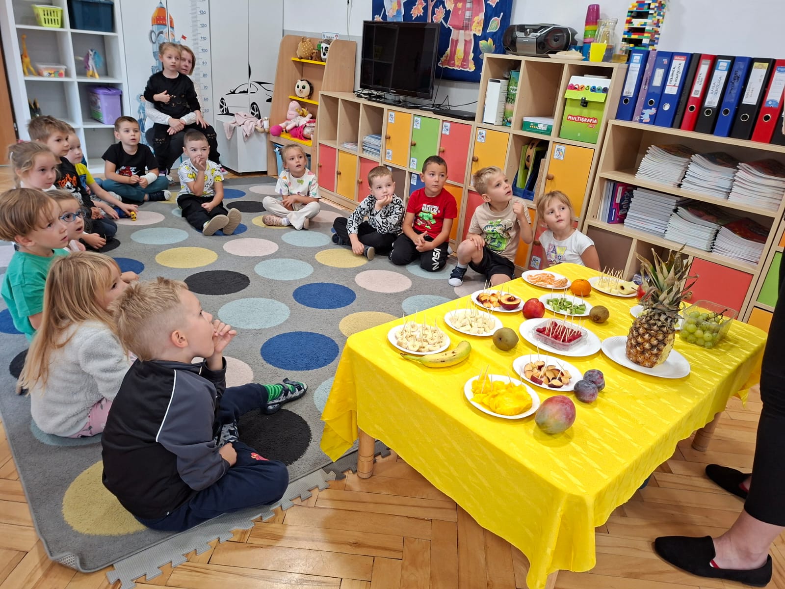 Rozpoznawaliśmy różne owoce, dotykając ich zgadując co to za owoc w czarodziejskim pudełku , smakując ich z zamkniętymi oczami i odgadując co to za owoc, dzieci poszerzały w ten sposób swoją świadomość dotyczącą wpływu owoców na zdrowie człowieka oraz rozumienie znaczenia witamin dla zdrowia człowieka.