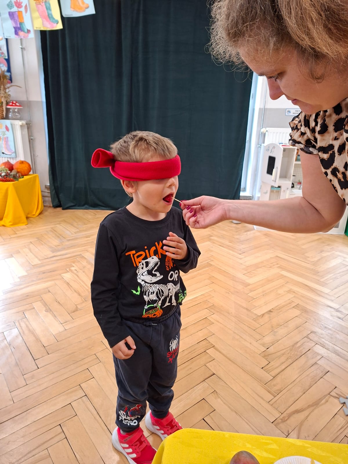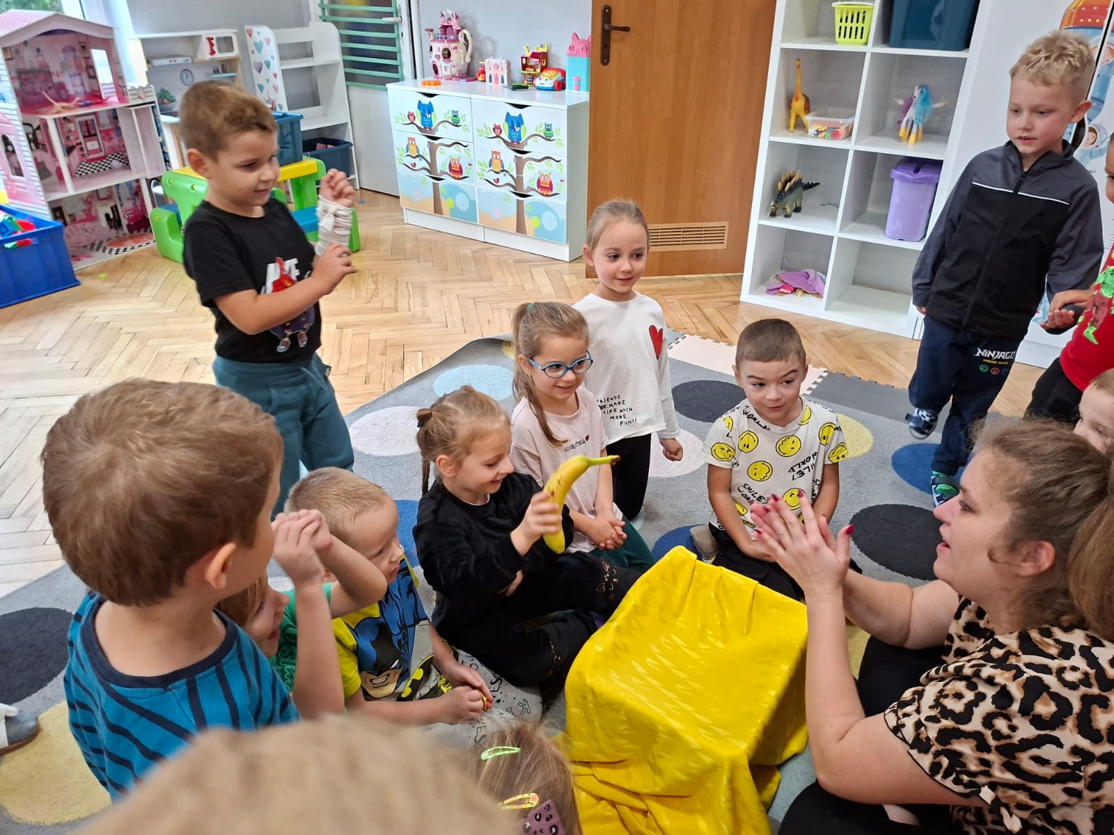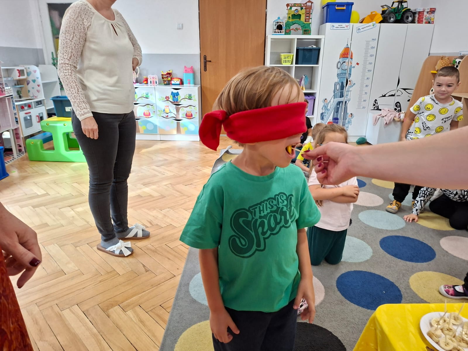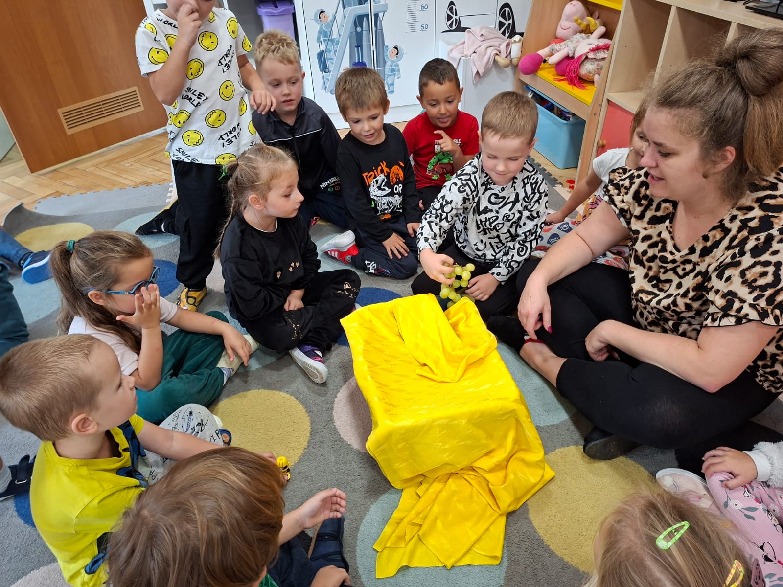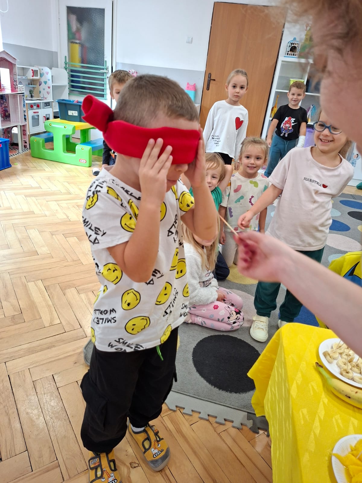Rozpoznawaliśmy różne owoce, dotykając ich zgadując co to za owoc w czarodziejskim pudełku , smakując ich z zamkniętymi oczami i odgadując co to za owoc, dzieci poszerzały w ten sposób swoją świadomość dotyczącą wpływu owoców na zdrowie człowieka oraz rozumienie znaczenia witamin dla zdrowia człowieka.
