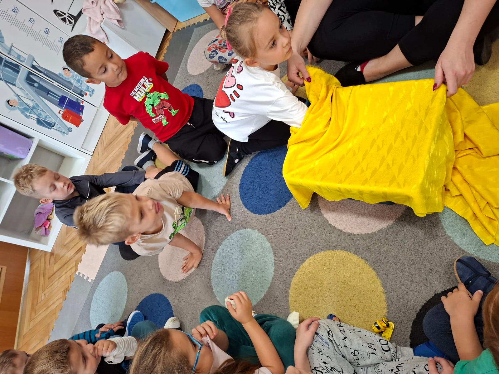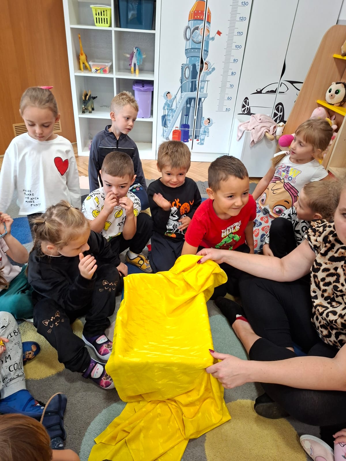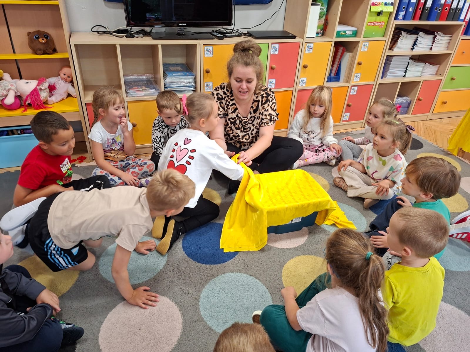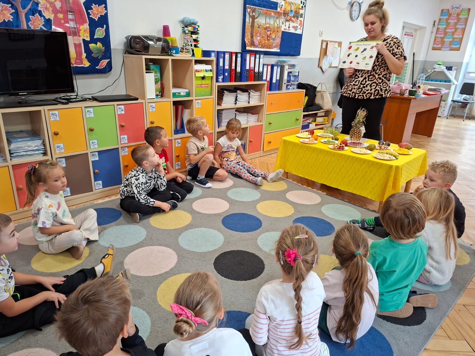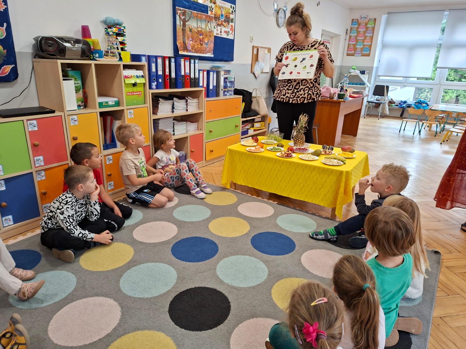 Rozpoznawaliśmy różne owoce, dotykając ich zgadując co to za owoc w czarodziejskim pudełku , smakując ich z zamkniętymi oczami i odgadując co to za owoc, dzieci poszerzały w ten sposób swoją świadomość dotyczącą wpływu owoców na zdrowie człowieka oraz rozumienie znaczenia witamin dla zdrowia człowieka.