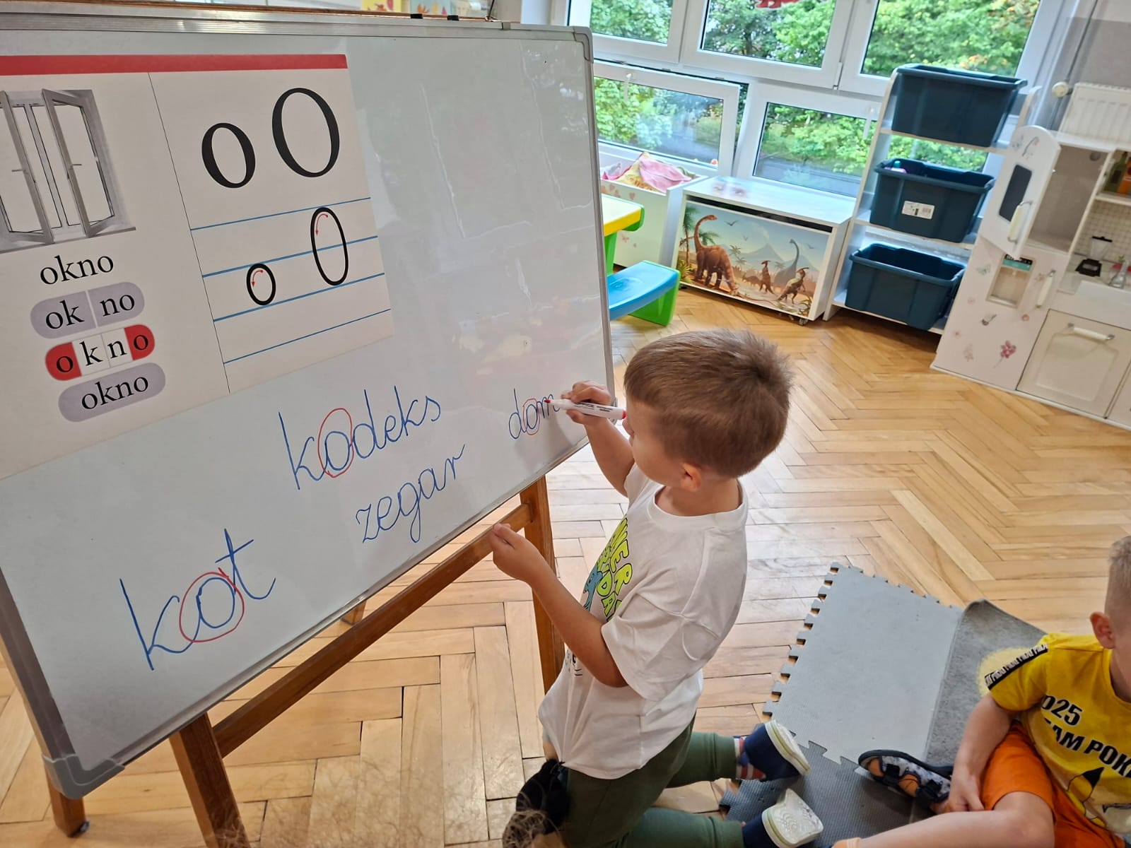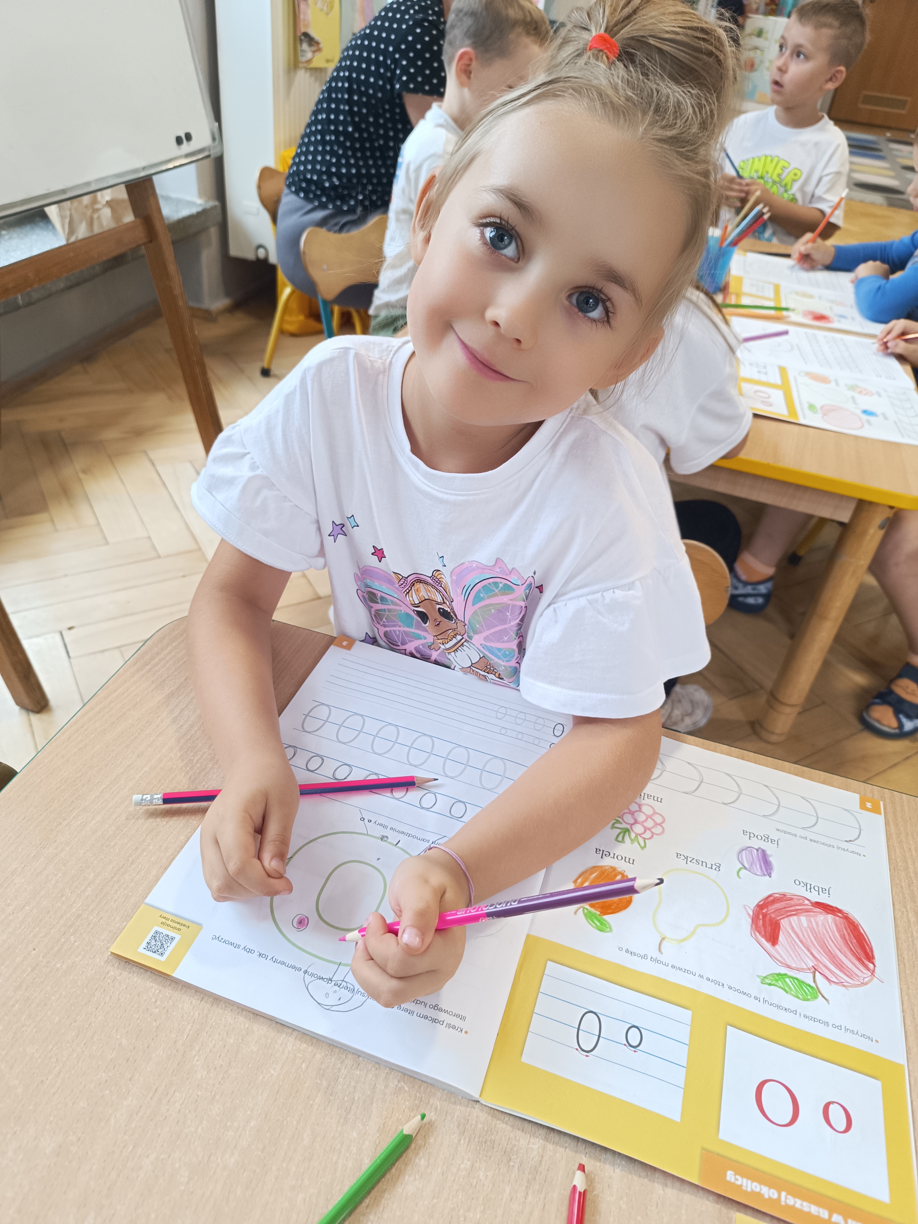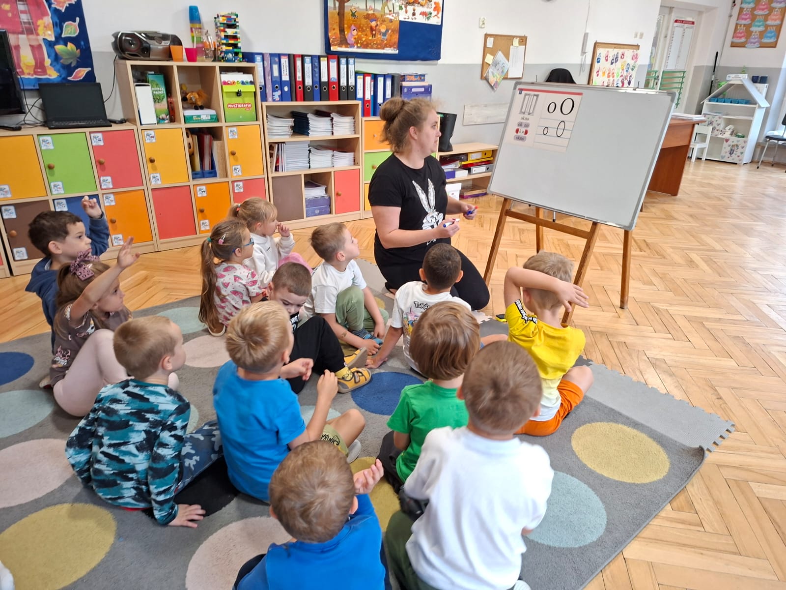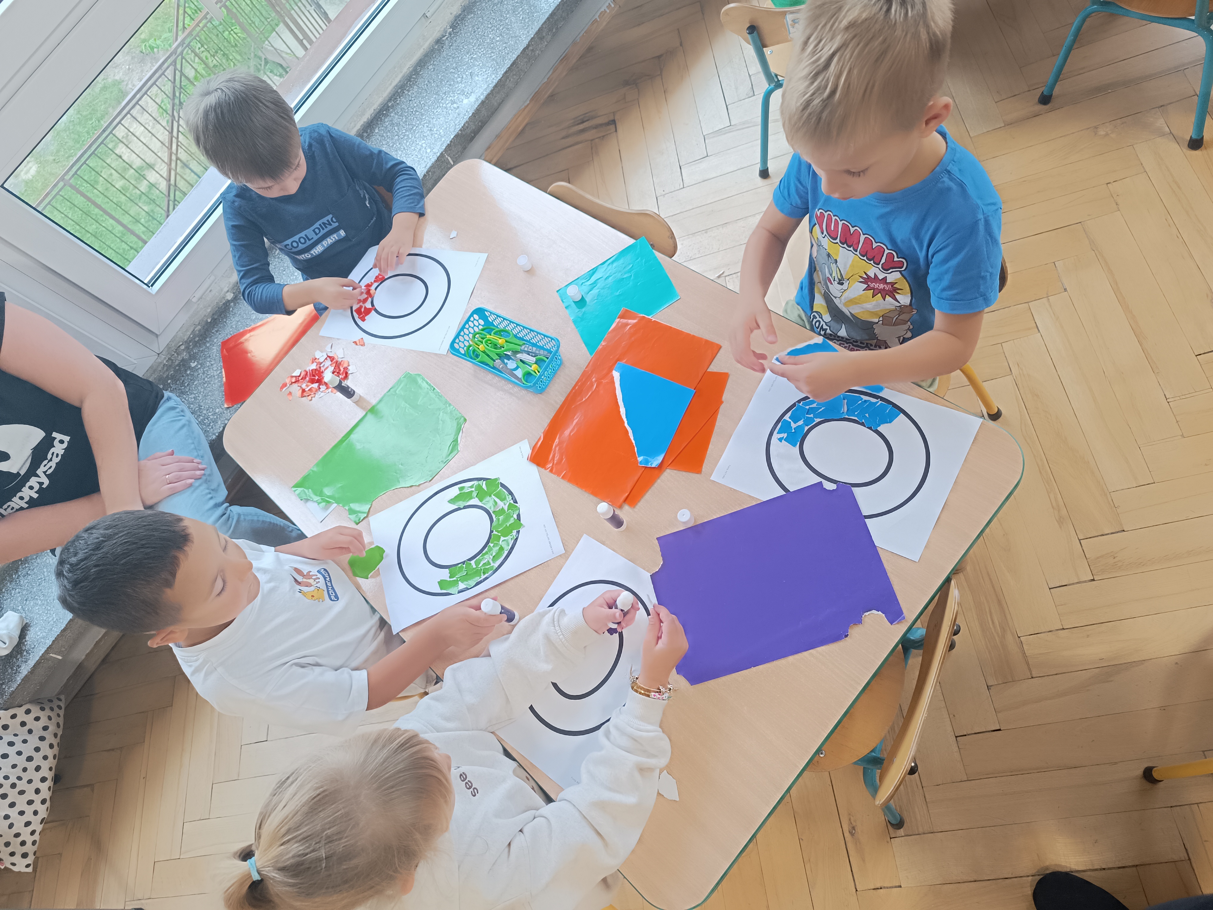 W tym tygodniu poznaliśmy również literkę O,o. Rozmawialiśmy o wyrazach na literkę "O" , dzieliliśmy wyrazy na sylaby. Kreśliliśmy literkę w powietrzu, pisaliśmy na dywanie , układaliśmy ją z klocków, układaliśmy z naszych bucików oraz próbowaliśmy ją zrobić z naszych ciał układając się na dywanie , zaznaczyliśmy ją szukając w wyrazach, robiliśmy ćwiczenia grafomotoryczne, a także wyklejaliśmy literkę wydzieranką z papieru kolorowego.