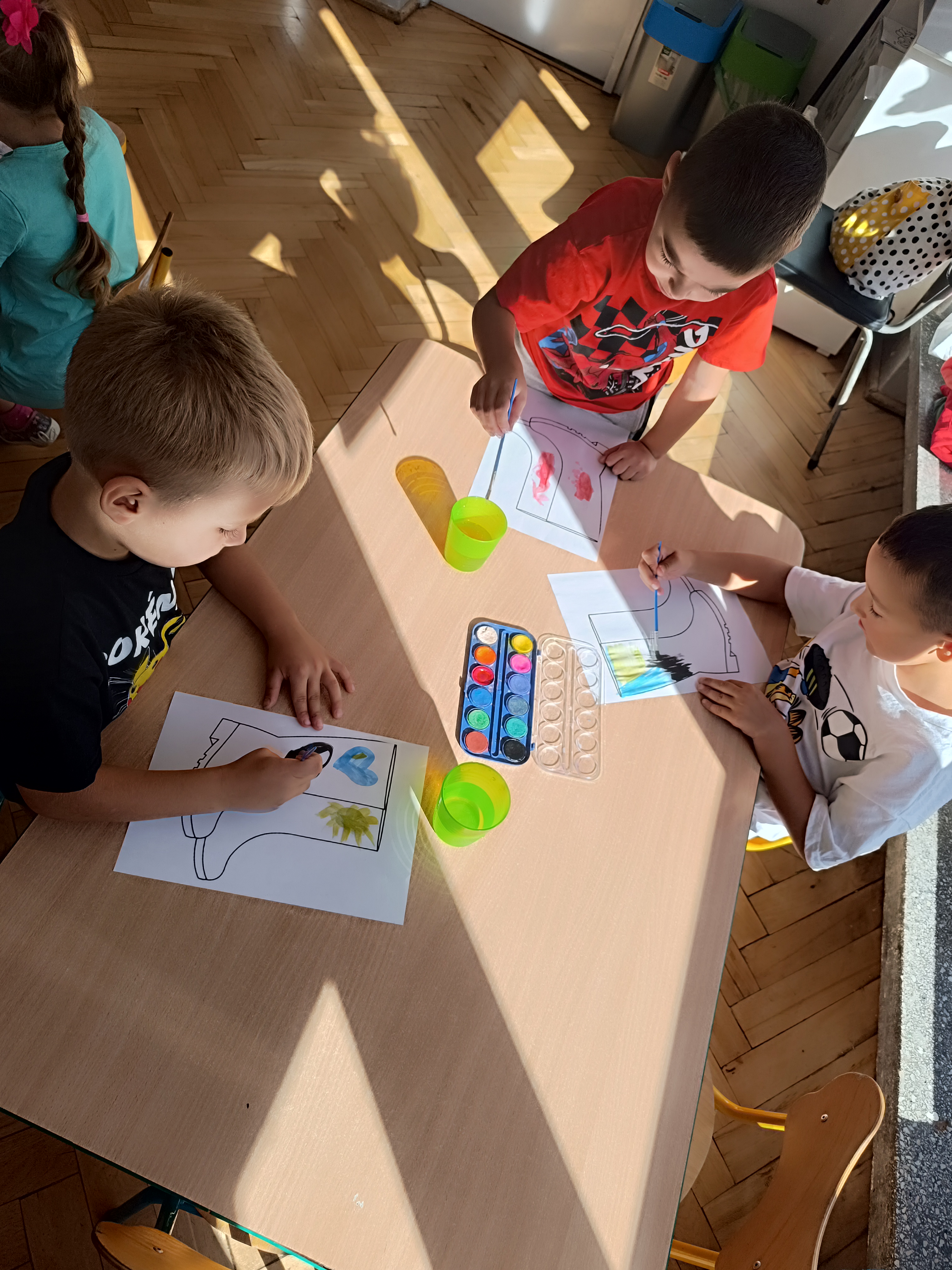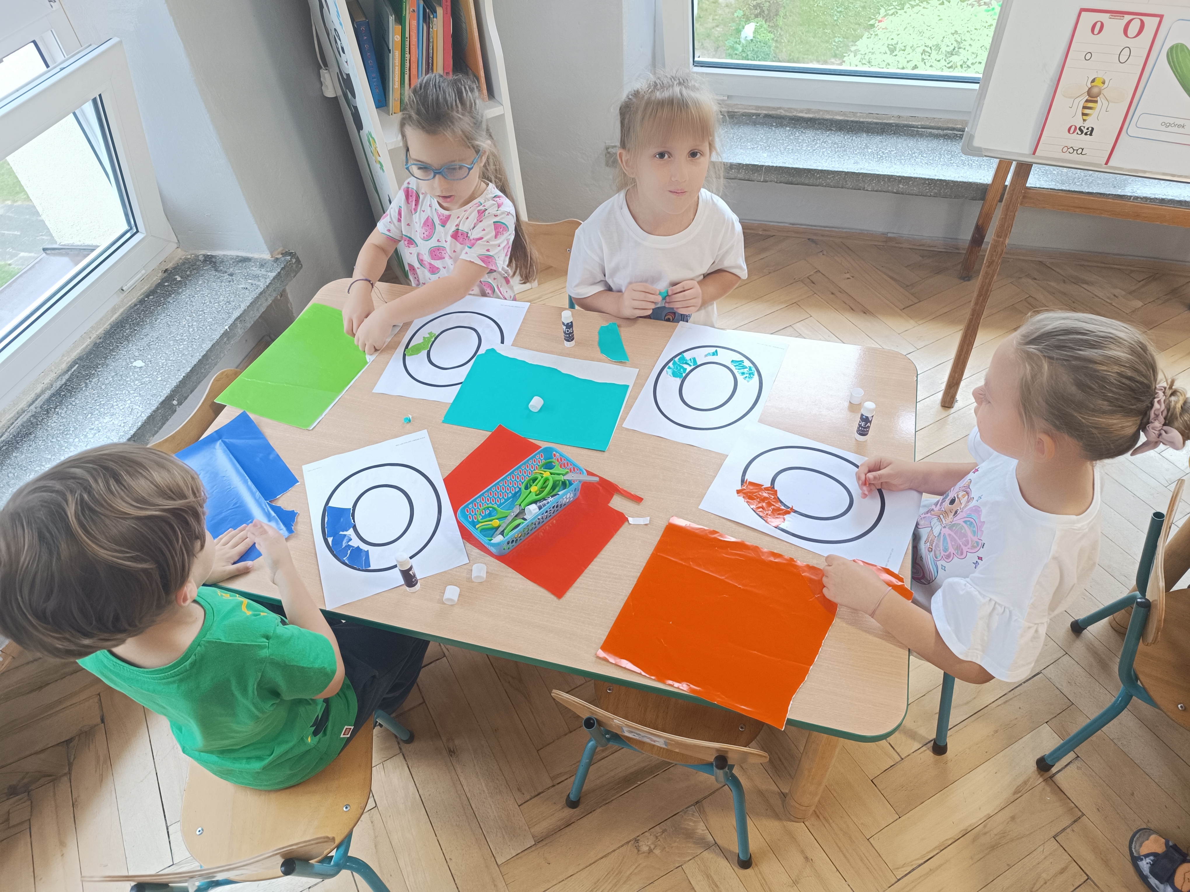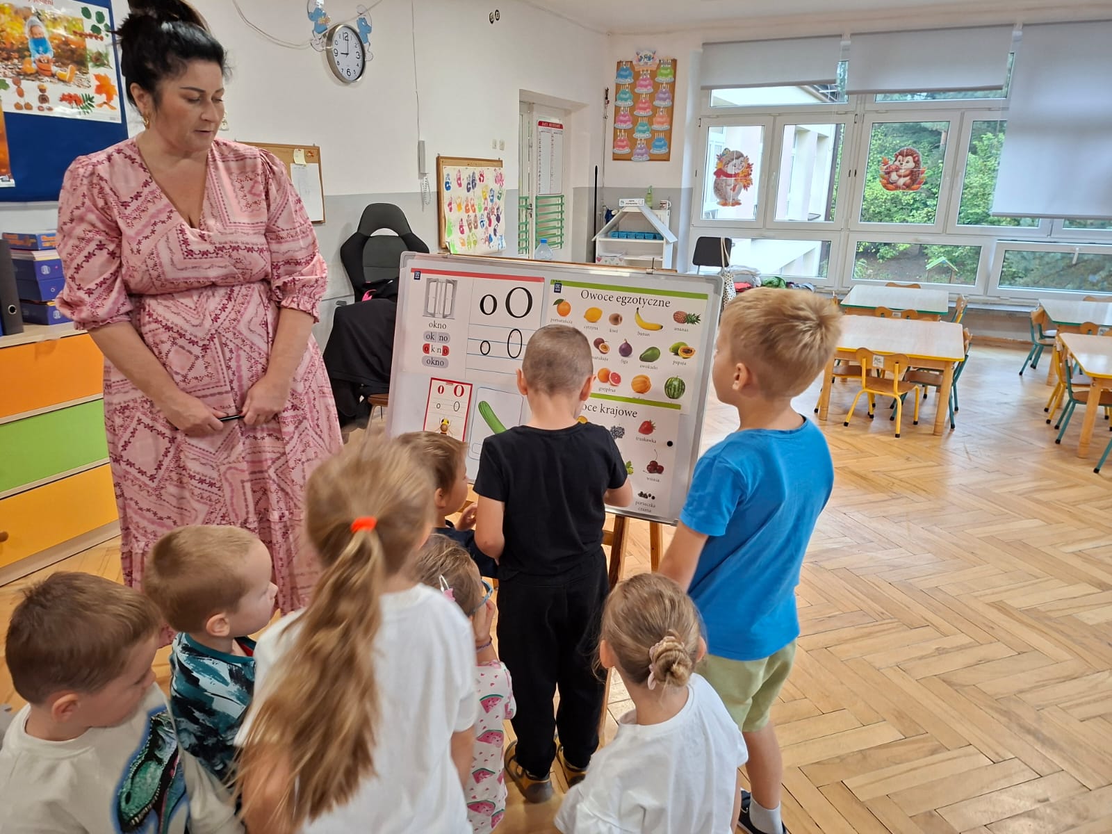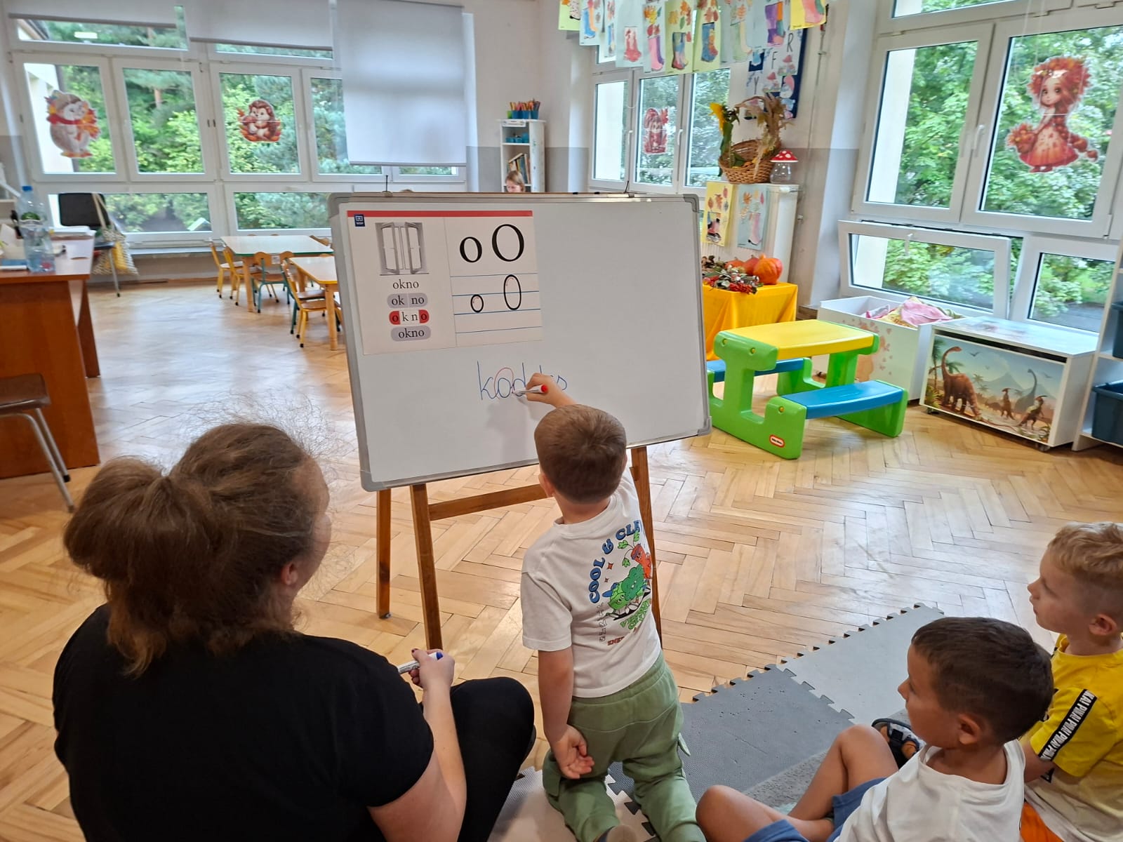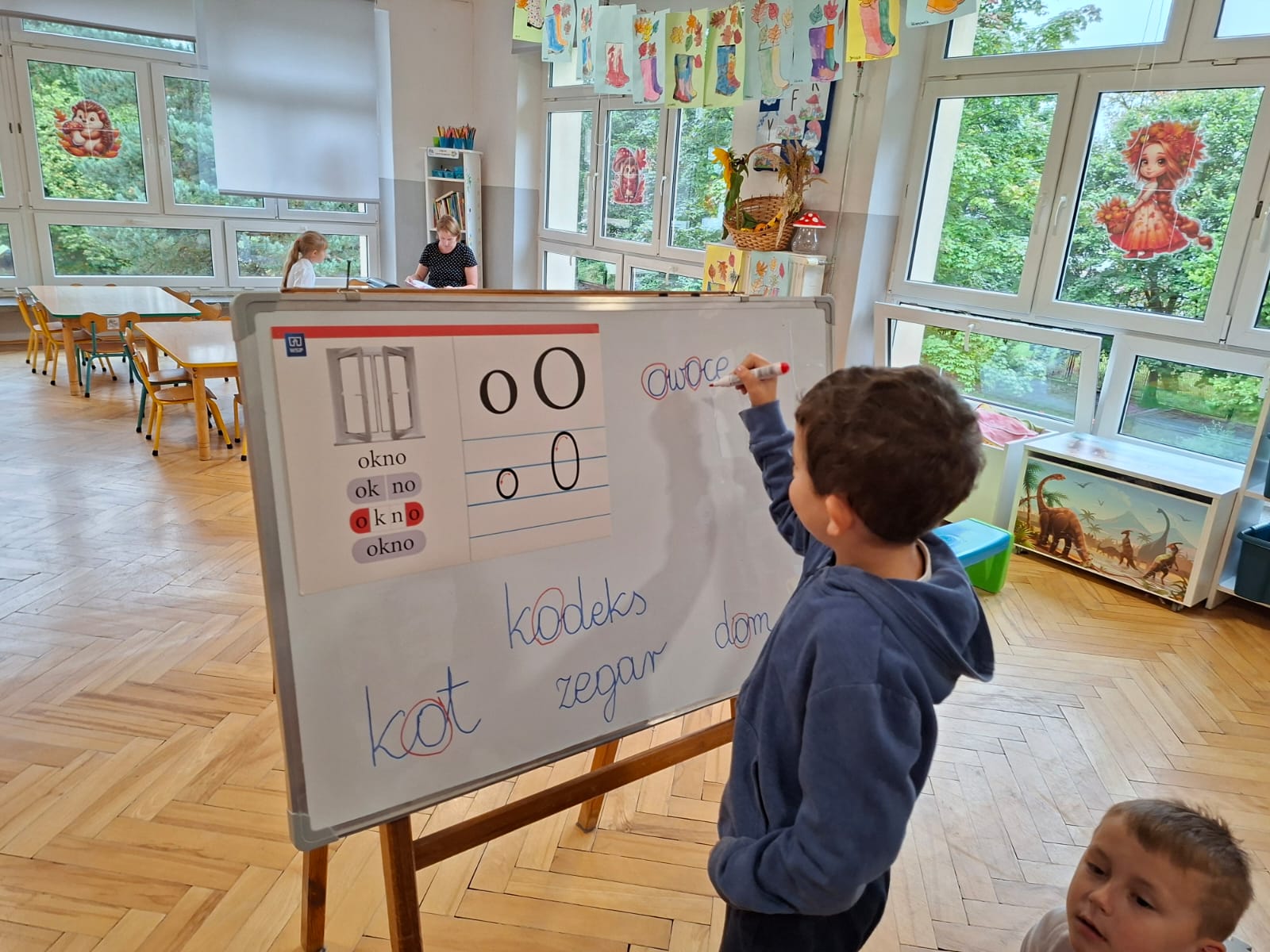 W tym tygodniu poznaliśmy również literkę O,o. Rozmawialiśmy o wyrazach na literkę "O" , dzieliliśmy wyrazy na sylaby. Kreśliliśmy literkę w powietrzu, pisaliśmy na dywanie , układaliśmy ją z klocków, układaliśmy z naszych bucików oraz próbowaliśmy ją zrobić z naszych ciał układając się na dywanie , zaznaczyliśmy ją szukając w wyrazach, robiliśmy ćwiczenia grafomotoryczne, a także wyklejaliśmy literkę wydzieranką z papieru kolorowego.
