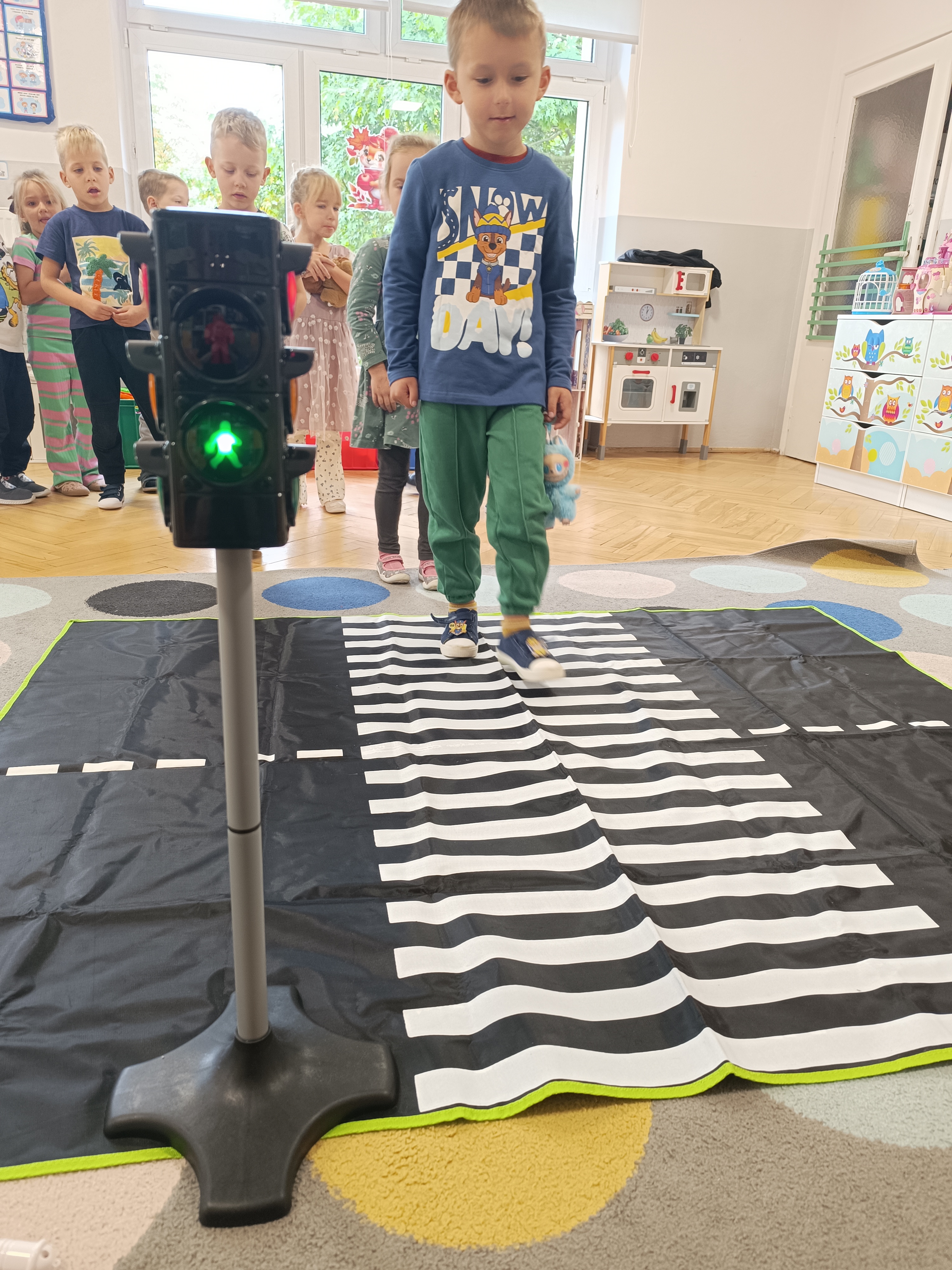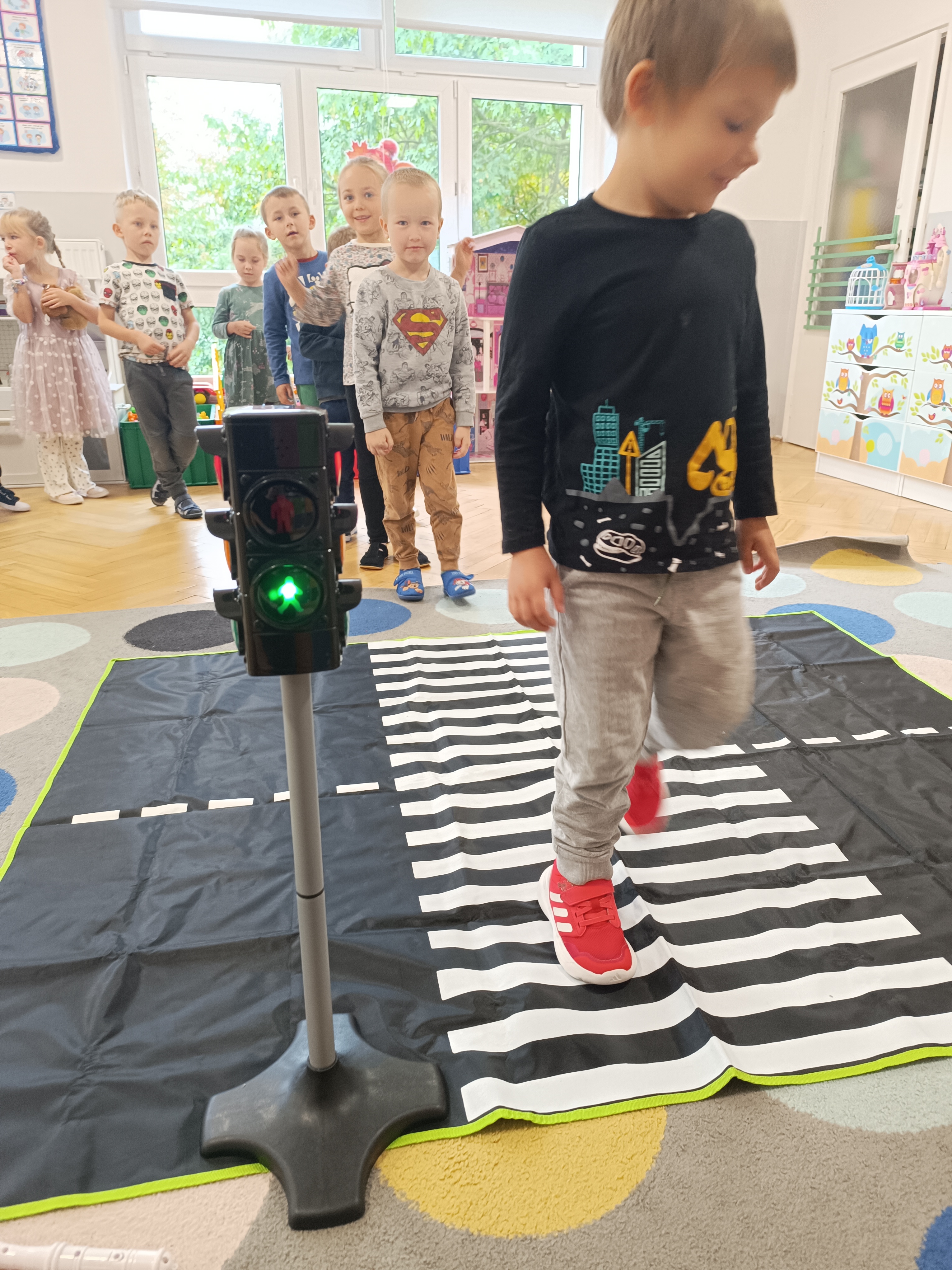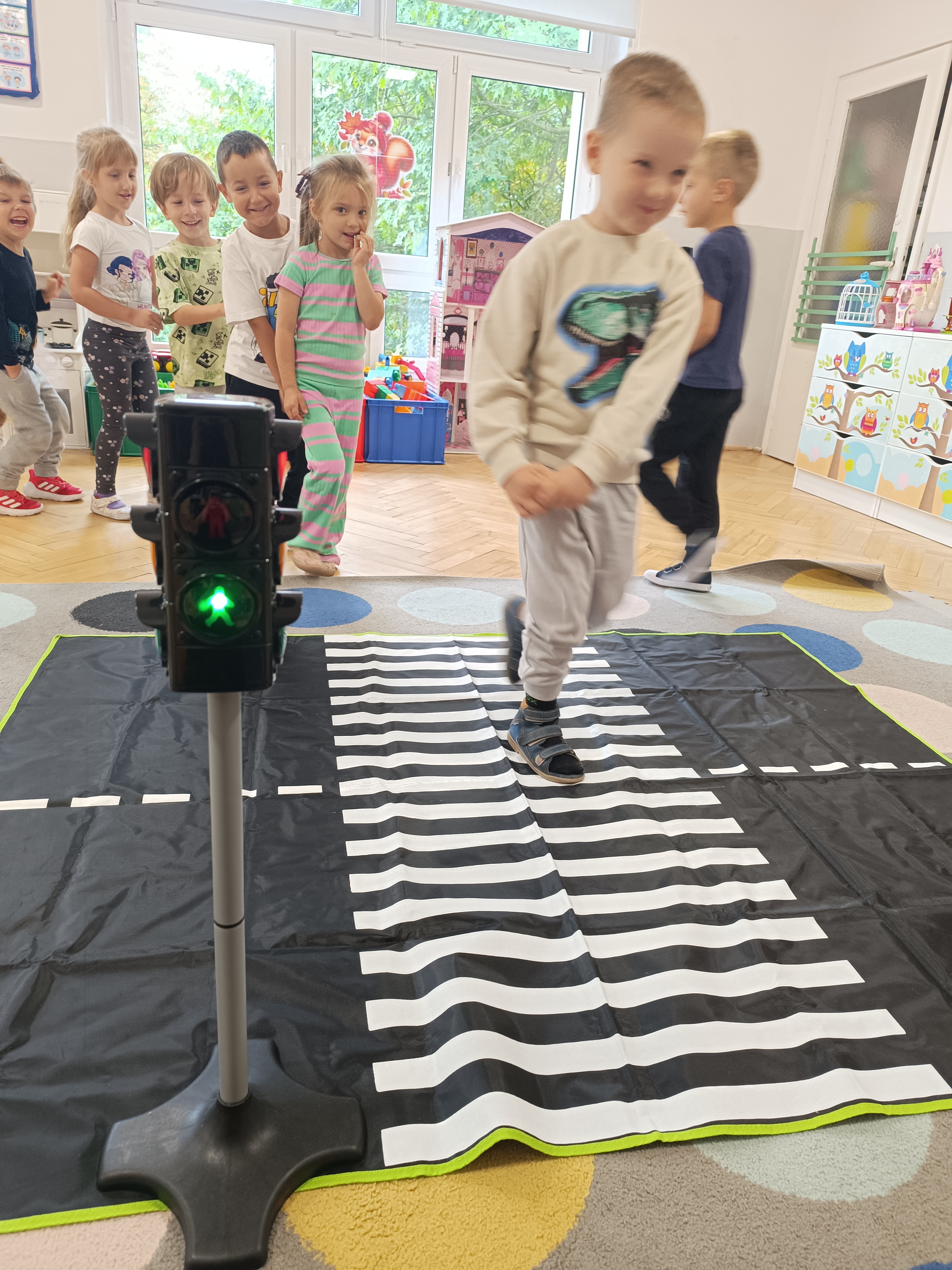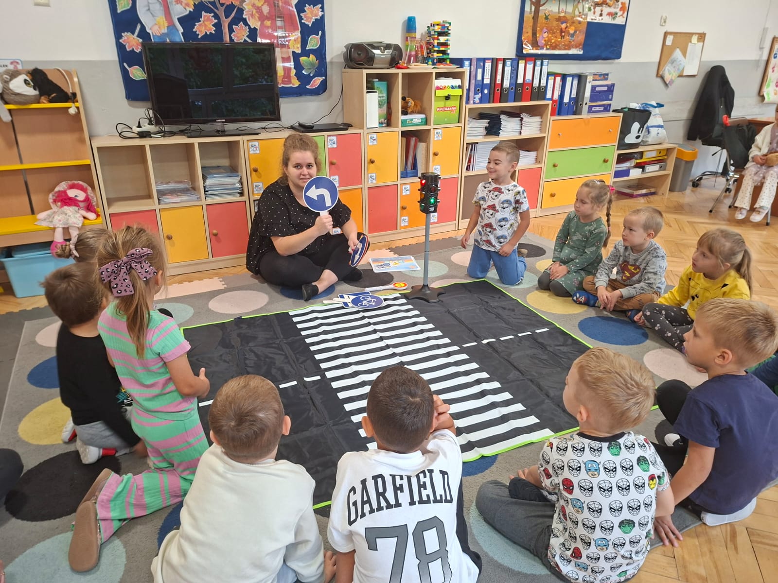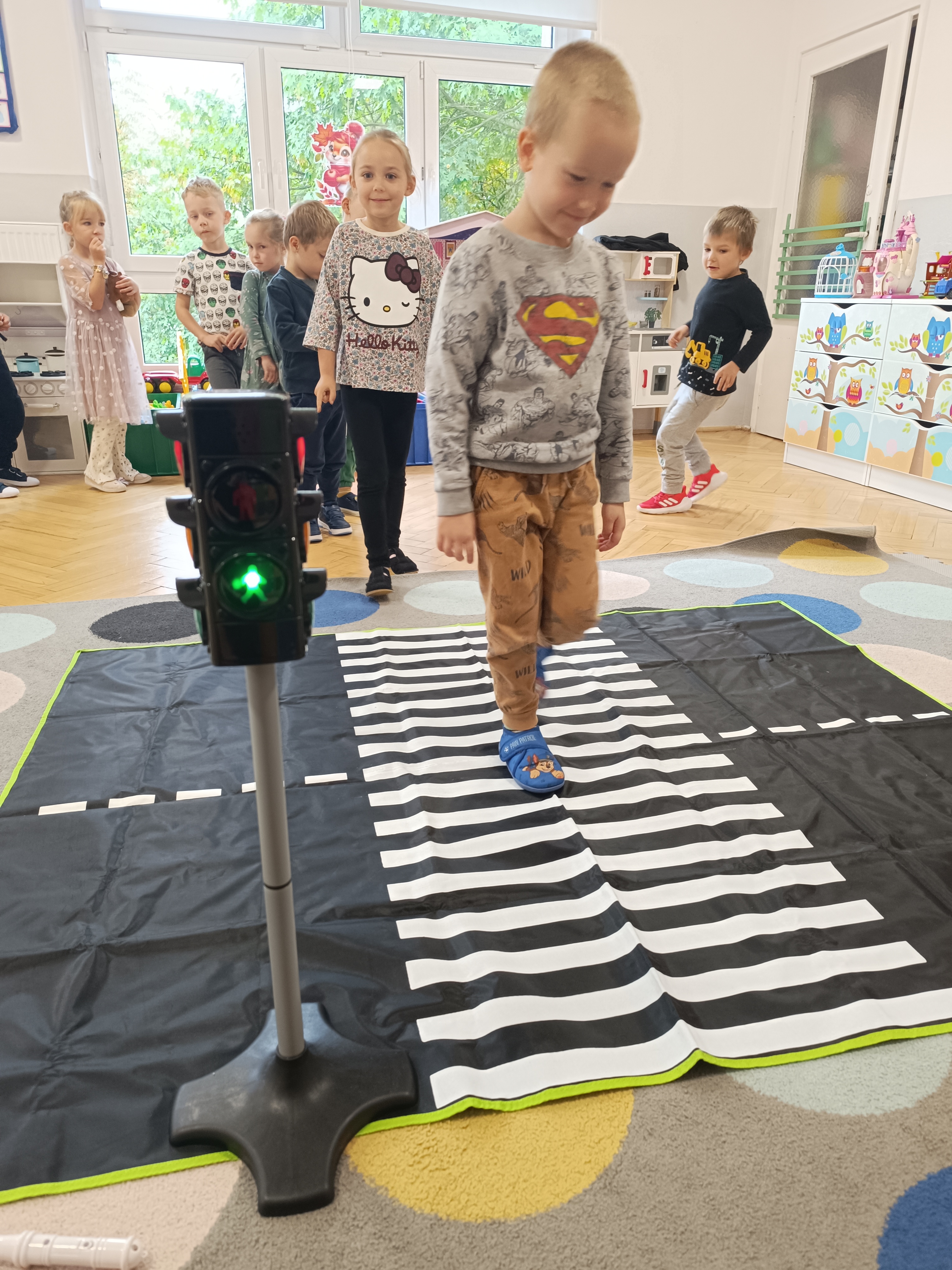 W minionym tygodniu rozmawialiśmy również o Bezpiecznym spacerze, przygotowując dzieci do bezpiecznego i samodzielnego poruszania się po drodze, jak trzeba się zachować przy przejściu dla pieszych, omawialiśmy światła , rozmawialiśmy na temat podstawowych znaków drogowych, odczytywaliśmy je wspólnie. Dopasowywaliśmy odpowiednie znaki do obrazków. Nie zabrakło przy tym zabaw ruchowych z użyciem sygnalizatora i maty drogi z przejściem dla pieszych.