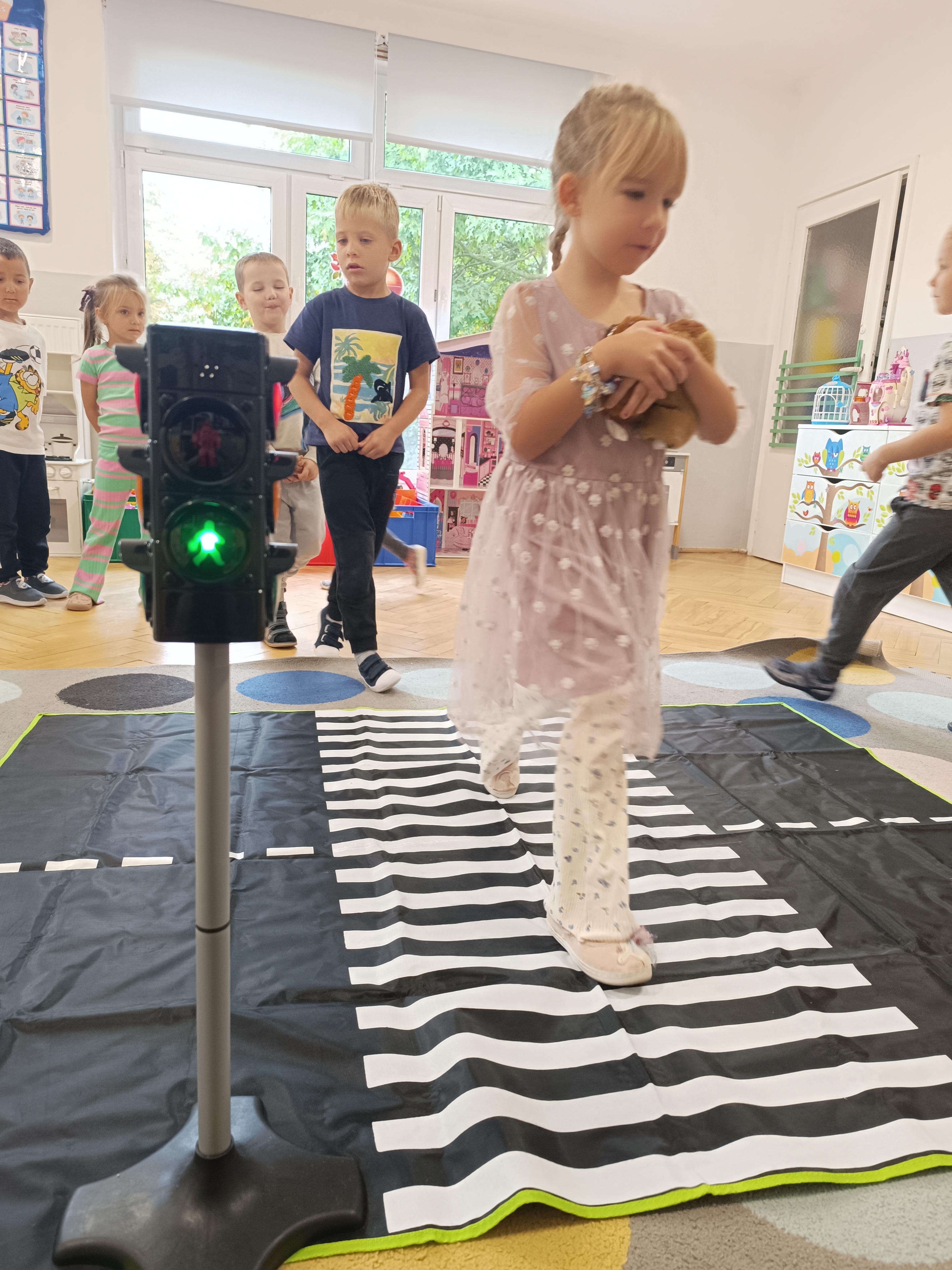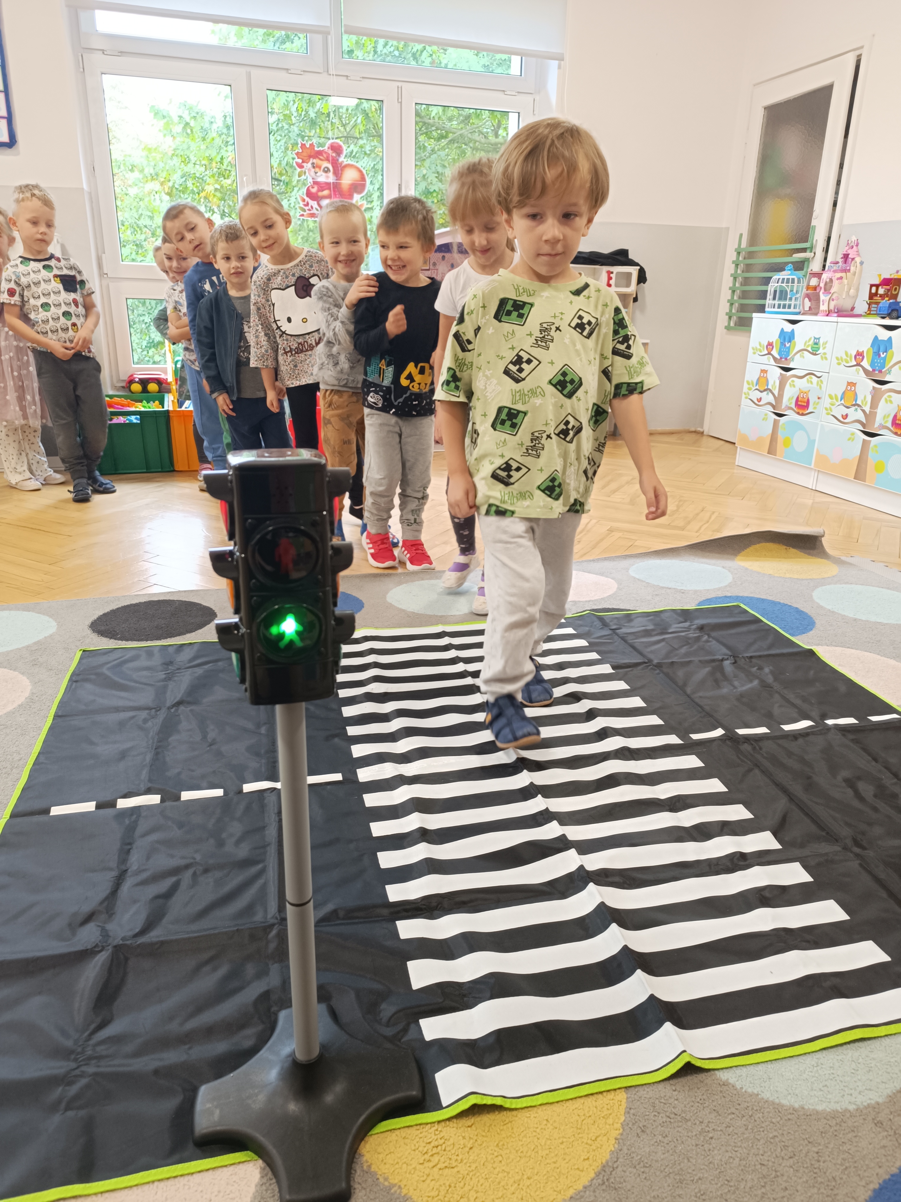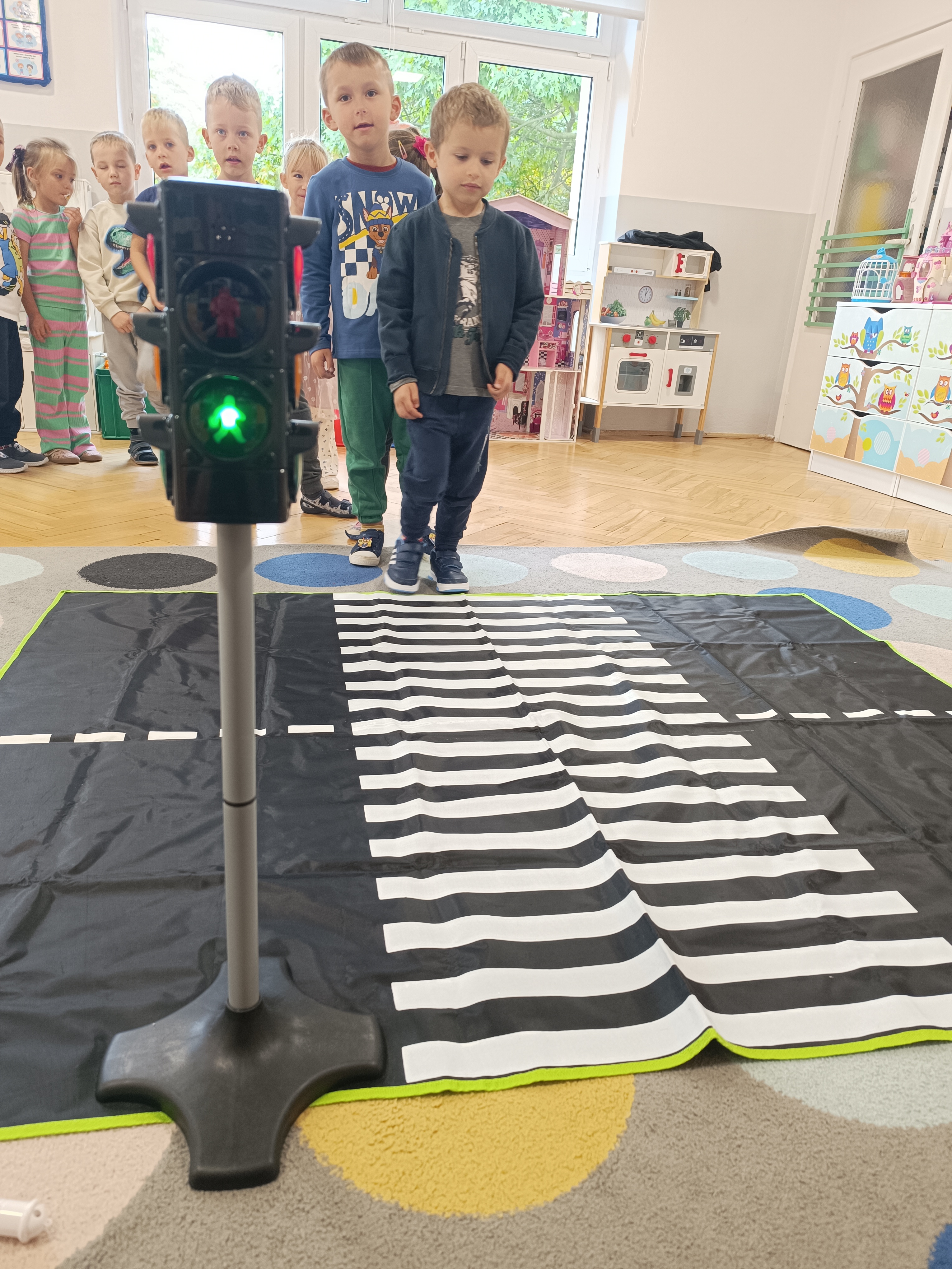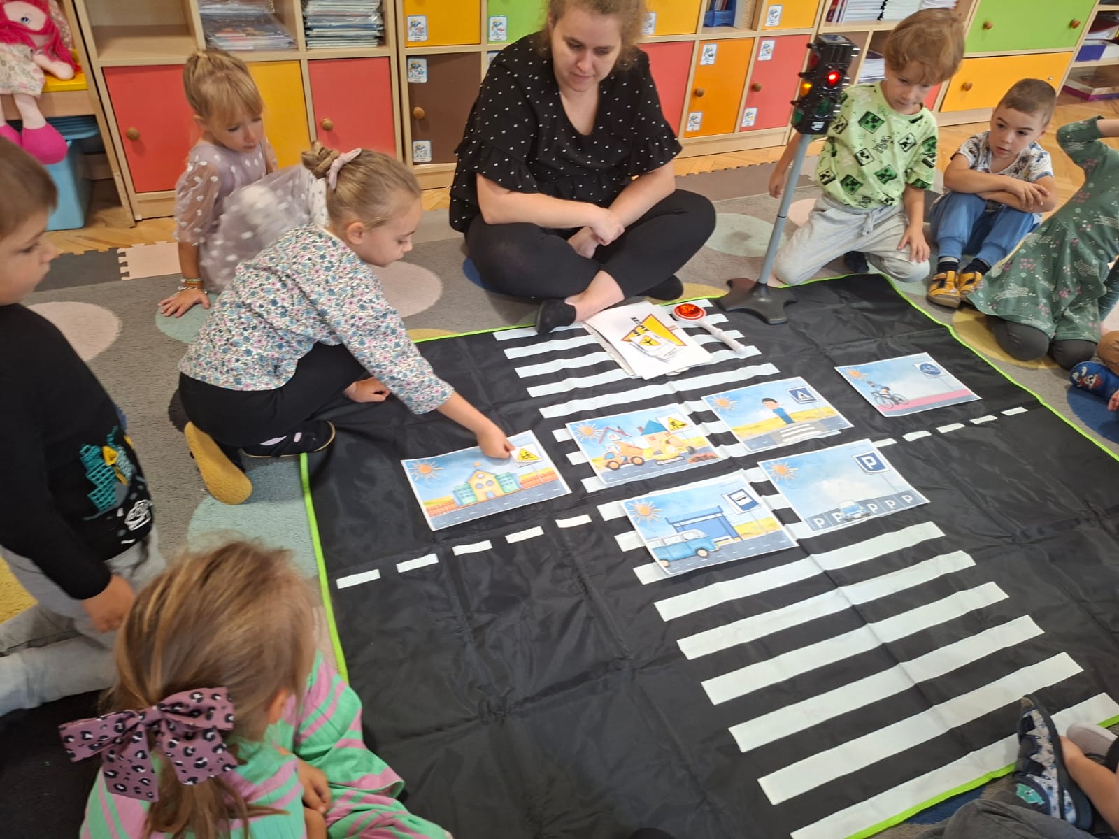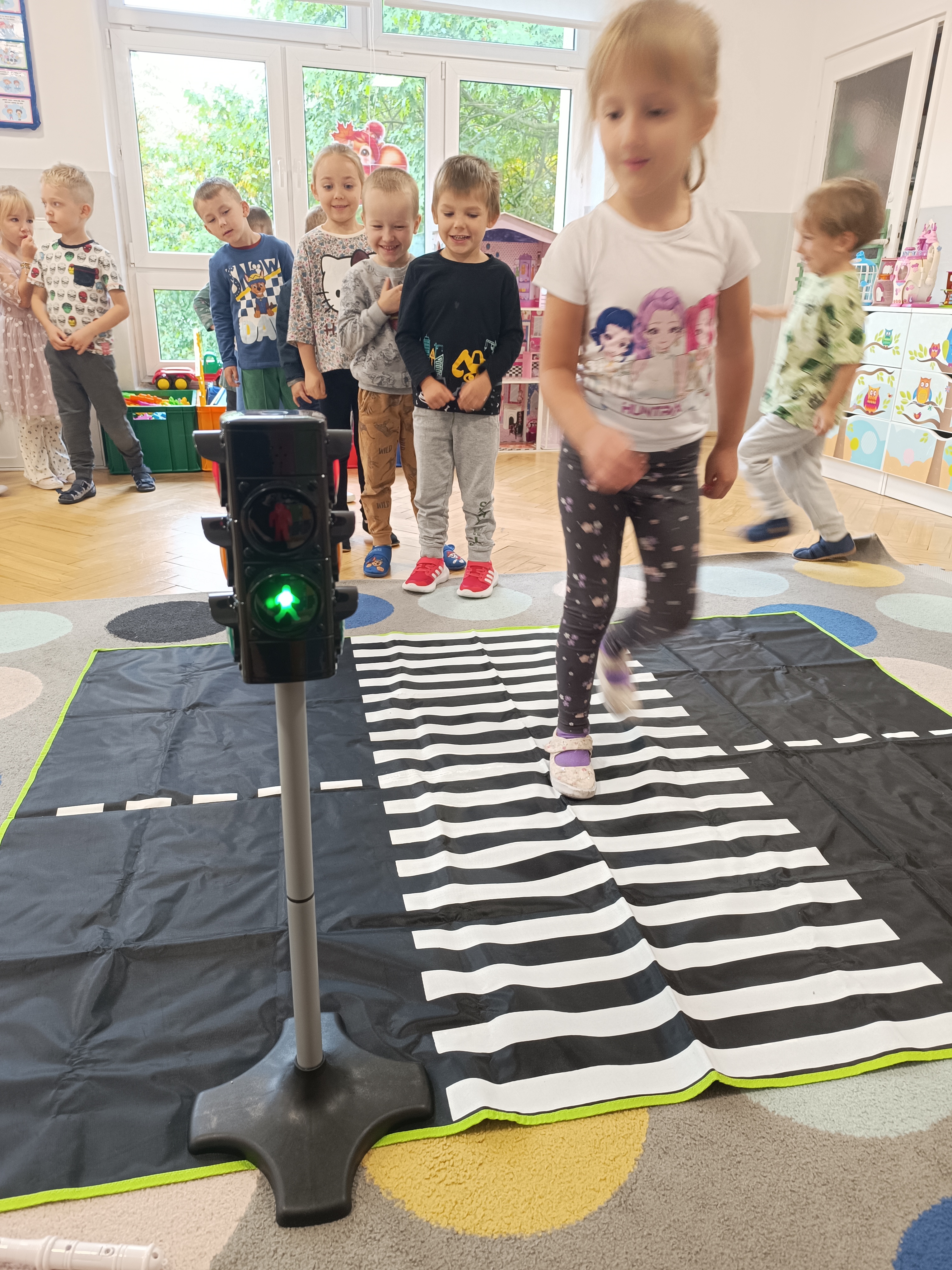 W minionym tygodniu rozmawialiśmy również o Bezpiecznym spacerze, przygotowując dzieci do bezpiecznego i samodzielnego poruszania się po drodze, jak trzeba się zachować przy przejściu dla pieszych, omawialiśmy światła , rozmawialiśmy na temat podstawowych znaków drogowych, odczytywaliśmy je wspólnie. Dopasowywaliśmy odpowiednie znaki do obrazków. Nie zabrakło przy tym zabaw ruchowych z użyciem sygnalizatora i maty drogi z przejściem dla pieszych.