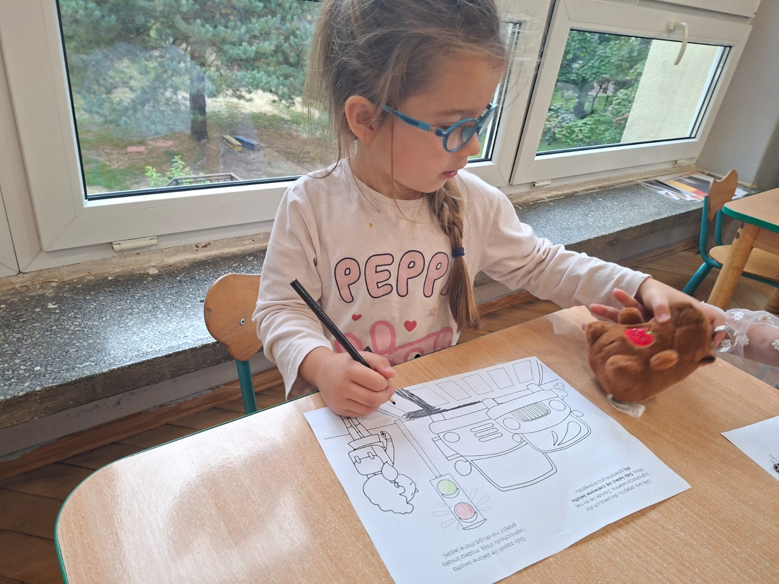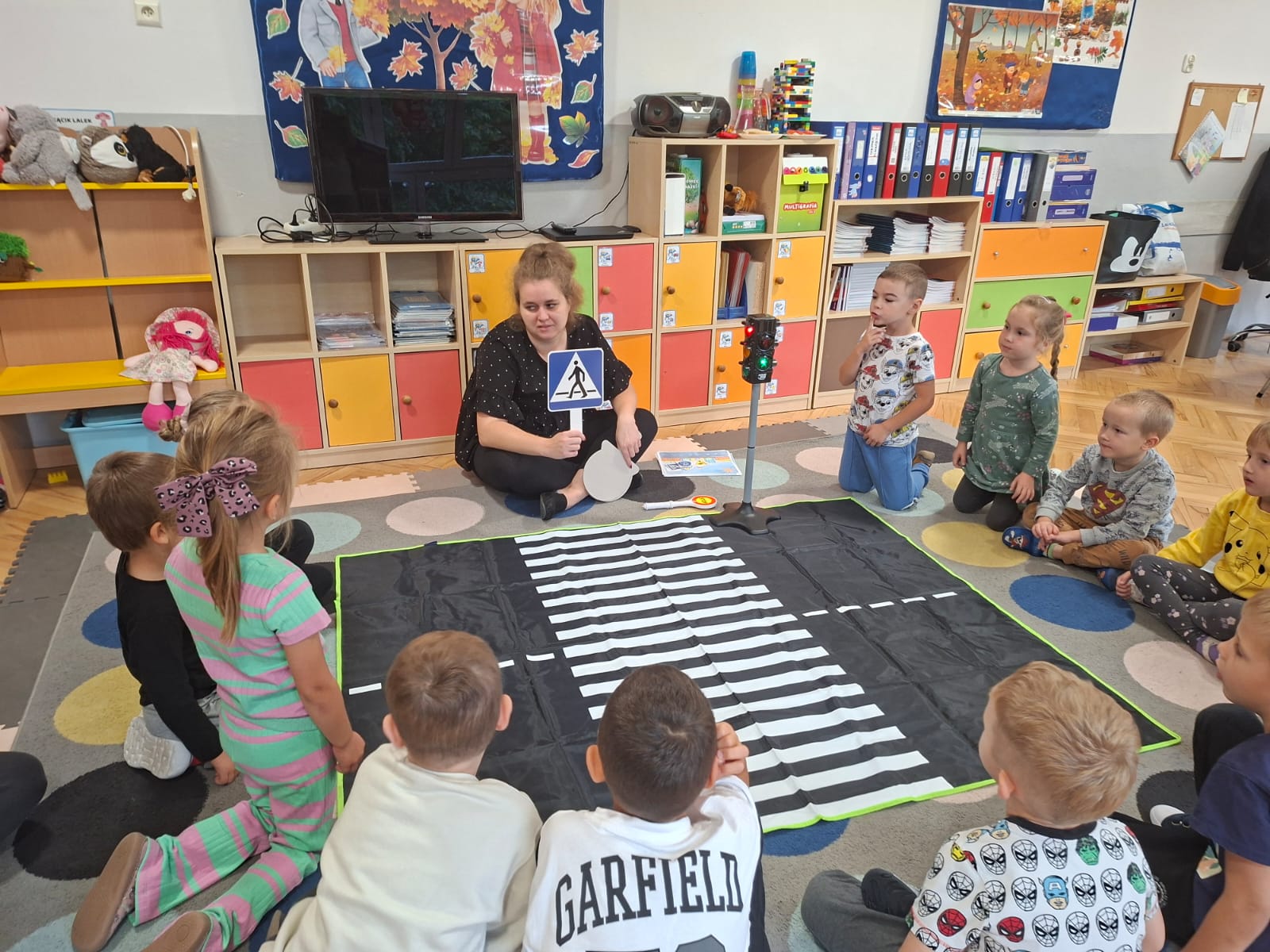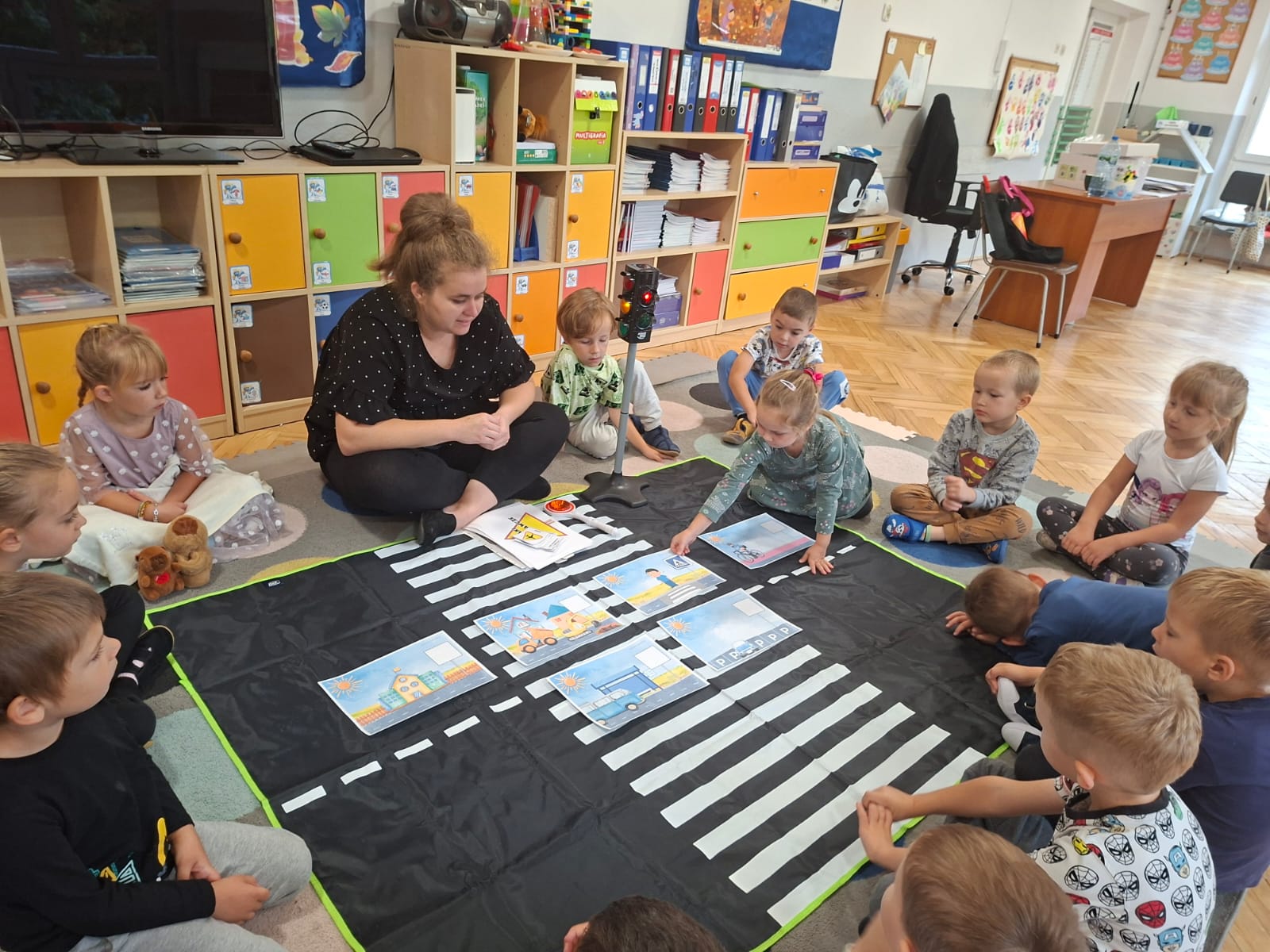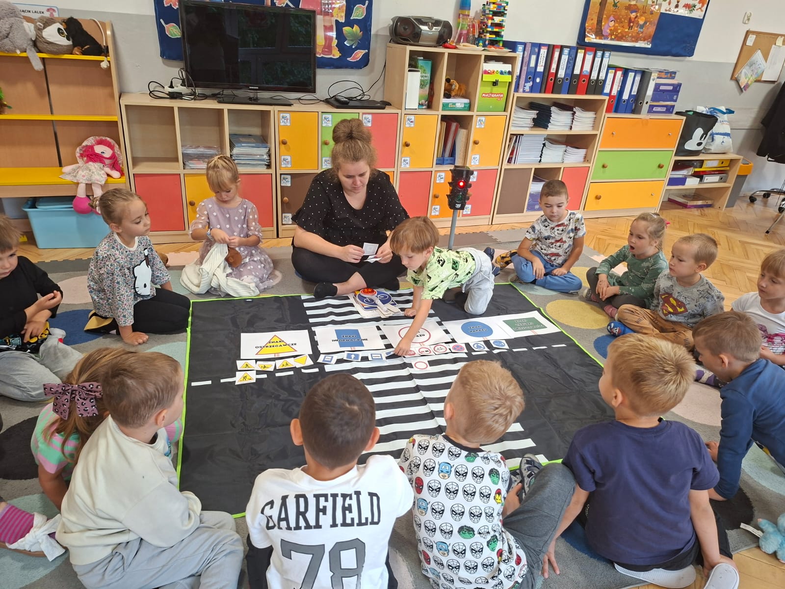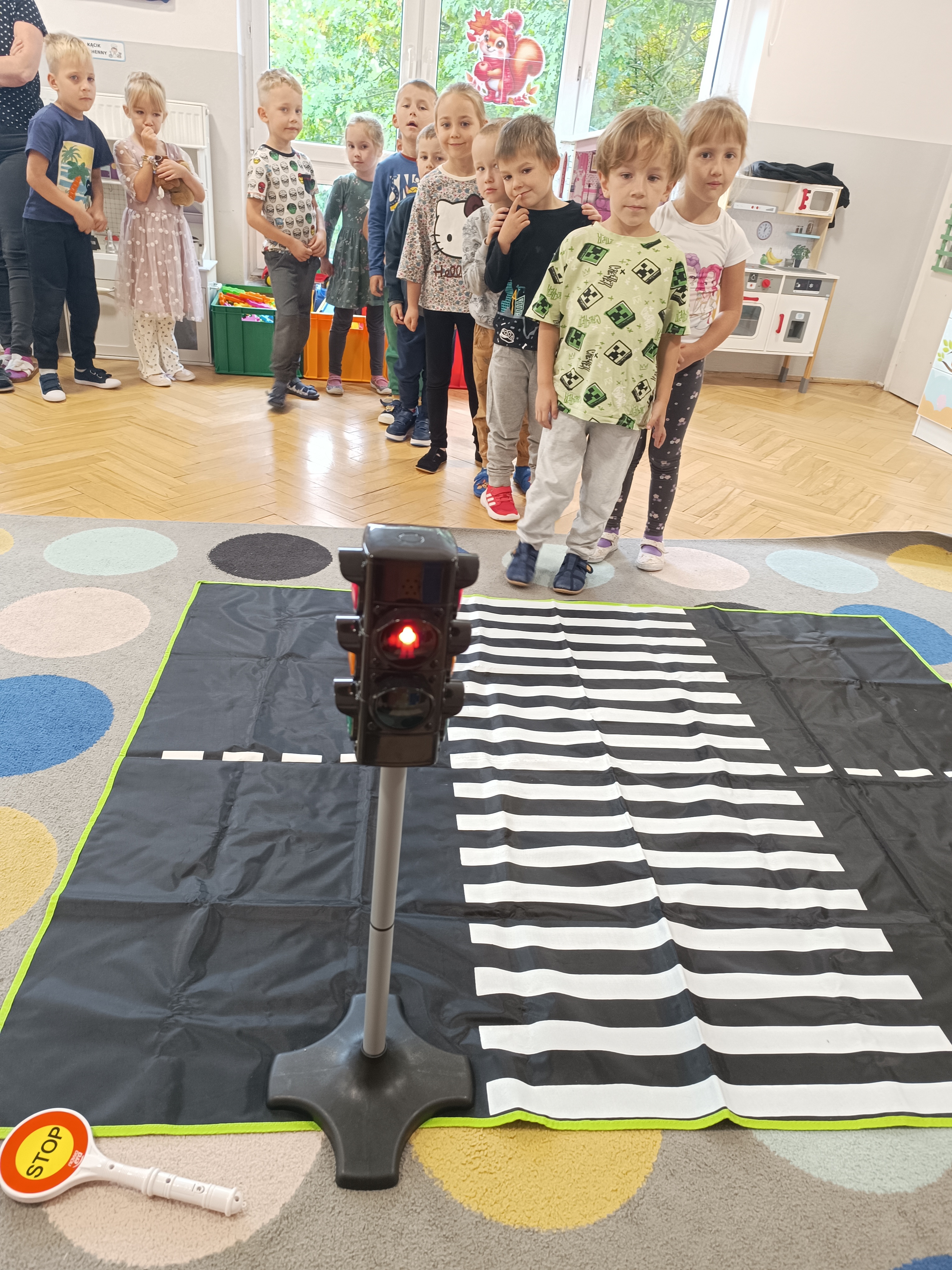 W minionym tygodniu rozmawialiśmy również o Bezpiecznym spacerze, przygotowując dzieci do bezpiecznego i samodzielnego poruszania się po drodze, jak trzeba się zachować przy przejściu dla pieszych, omawialiśmy światła , rozmawialiśmy na temat podstawowych znaków drogowych, odczytywaliśmy je wspólnie. Dopasowywaliśmy odpowiednie znaki do obrazków. Nie zabrakło przy tym zabaw ruchowych z użyciem sygnalizatora i maty drogi z przejściem dla pieszych.