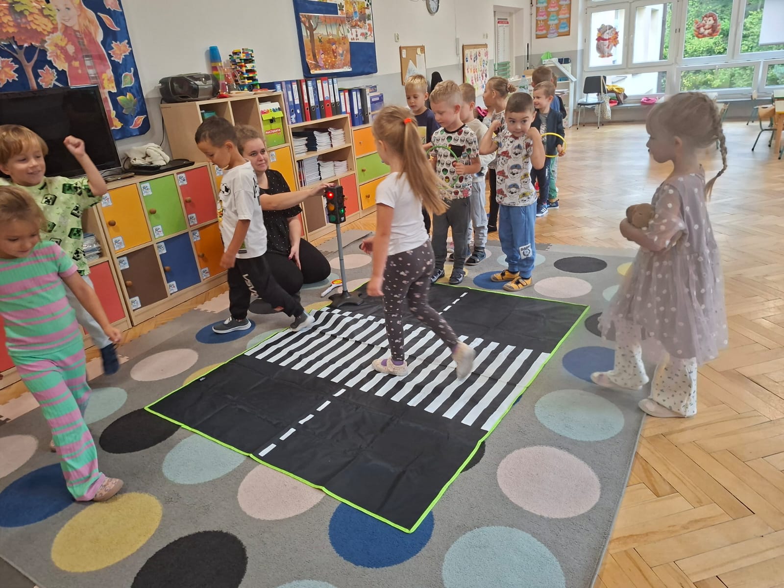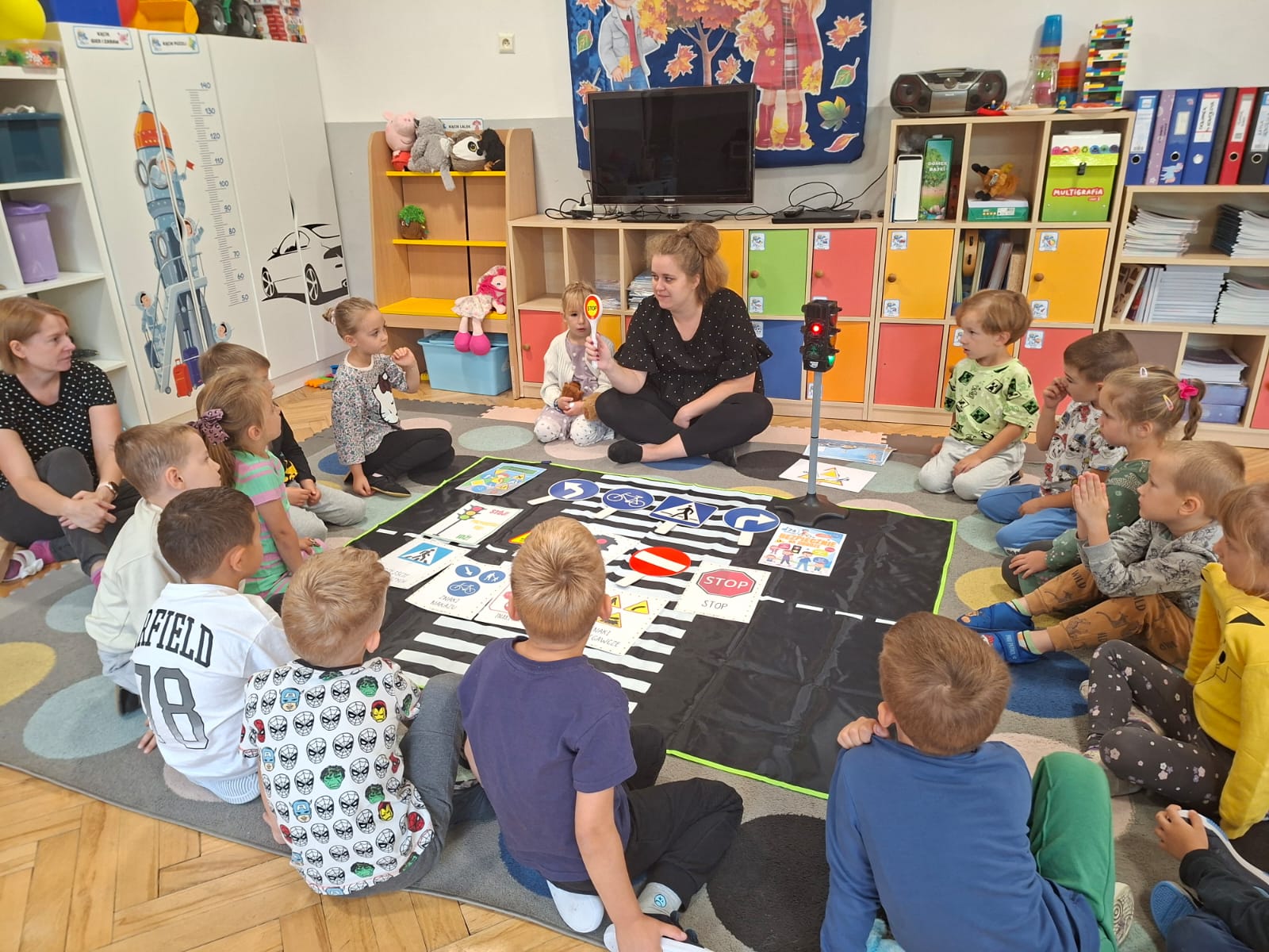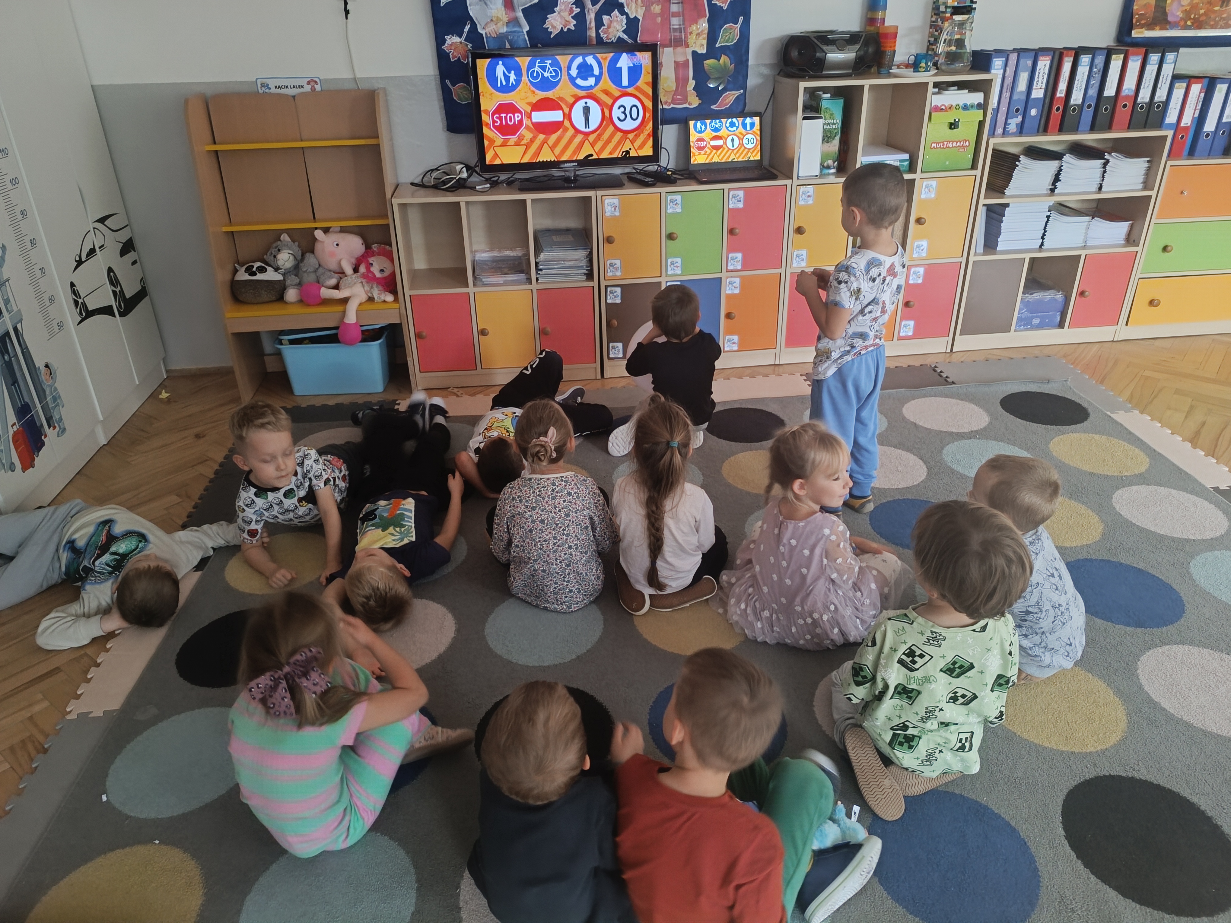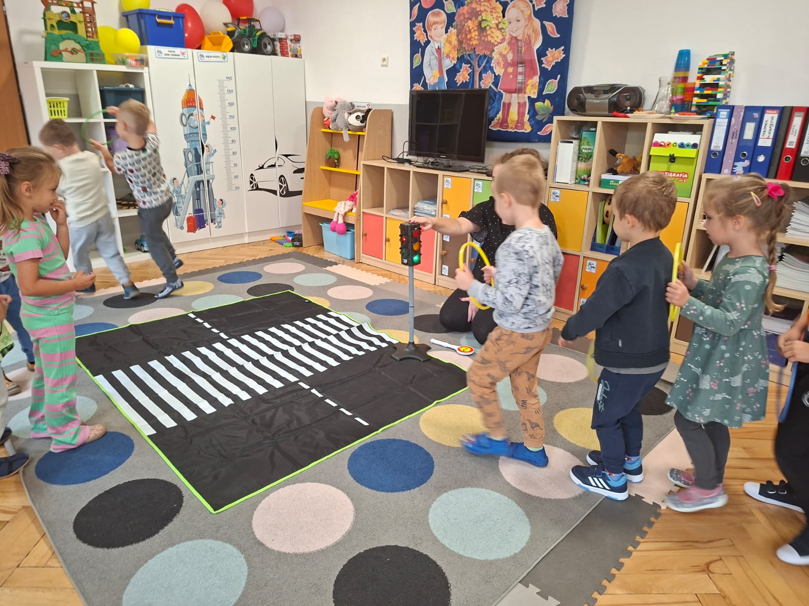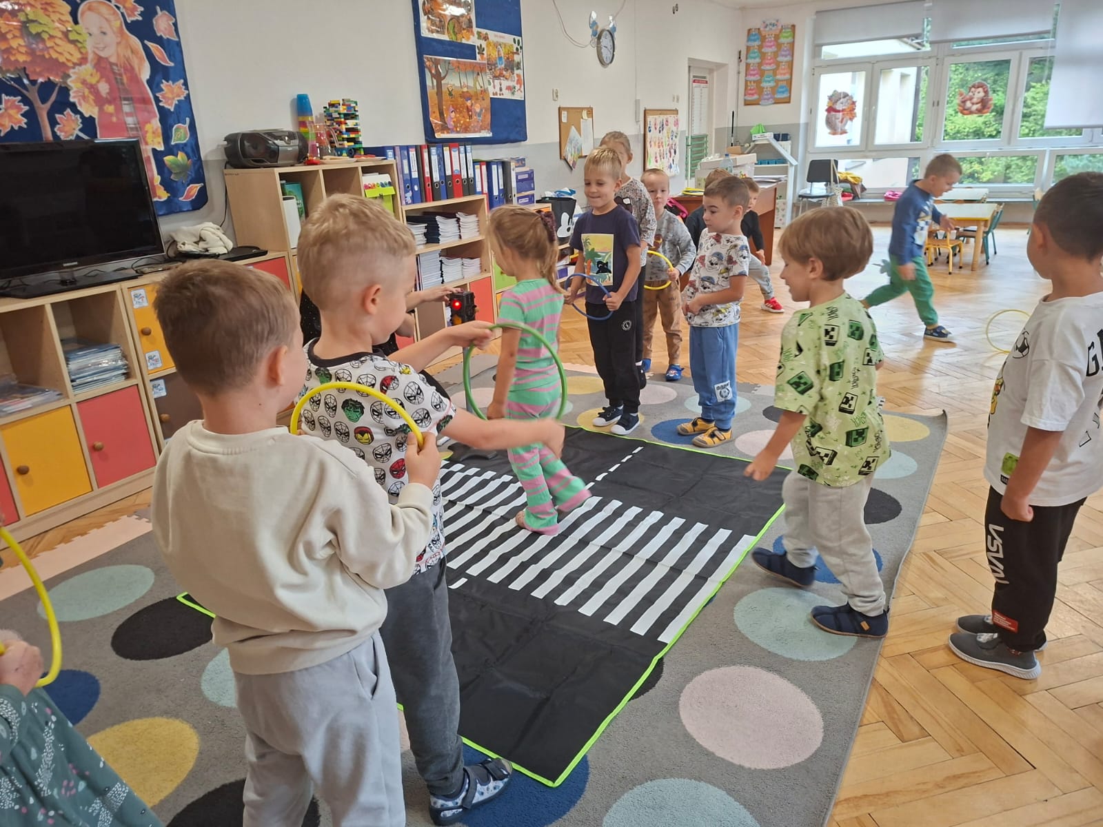 W minionym tygodniu rozmawialiśmy również o Bezpiecznym spacerze, przygotowując dzieci do bezpiecznego i samodzielnego poruszania się po drodze, jak trzeba się zachować przy przejściu dla pieszych, omawialiśmy światła , rozmawialiśmy na temat podstawowych znaków drogowych, odczytywaliśmy je wspólnie. Dopasowywaliśmy odpowiednie znaki do obrazków. Nie zabrakło przy tym zabaw ruchowych z użyciem sygnalizatora i maty drogi z przejściem dla pieszych.