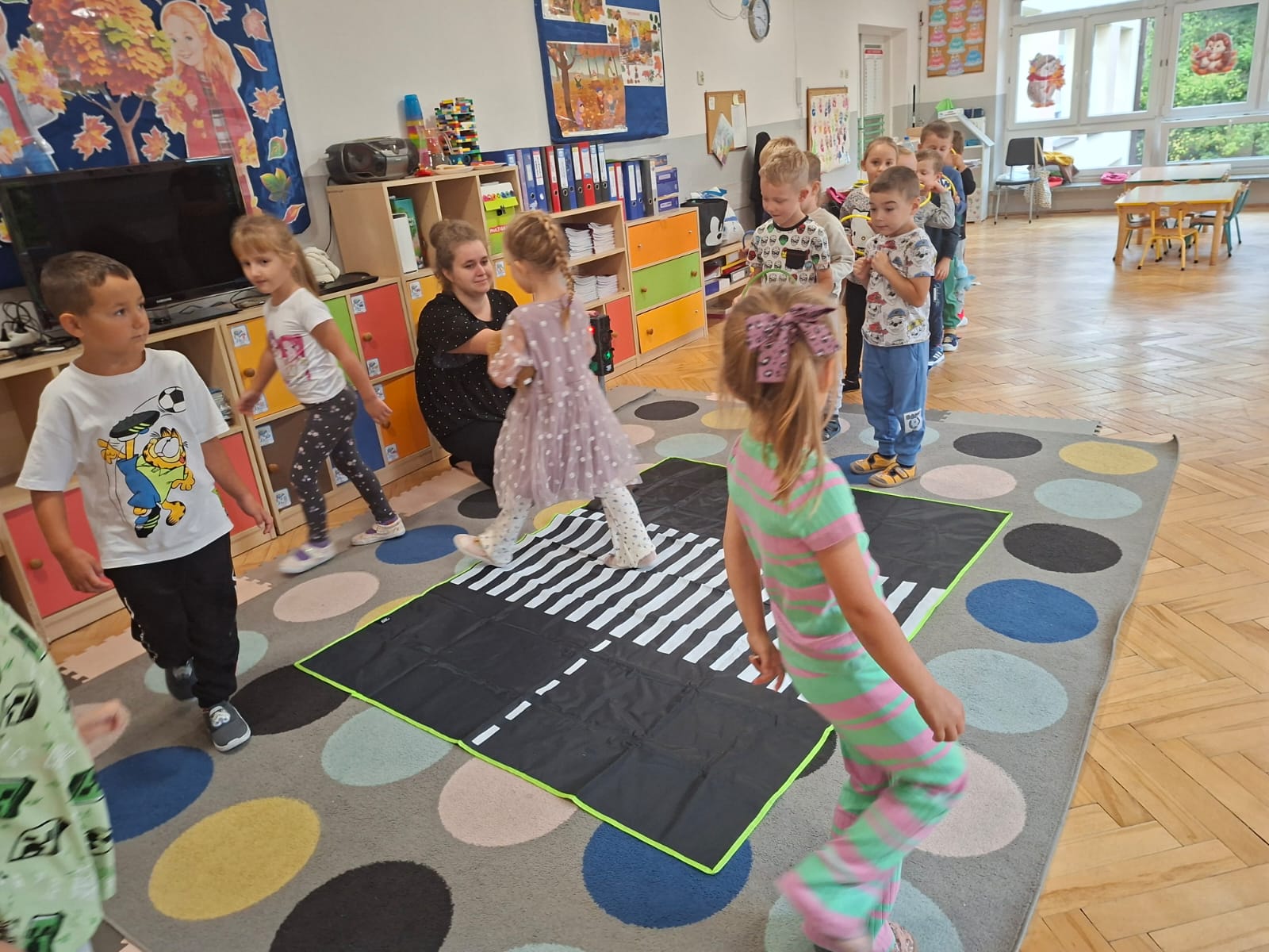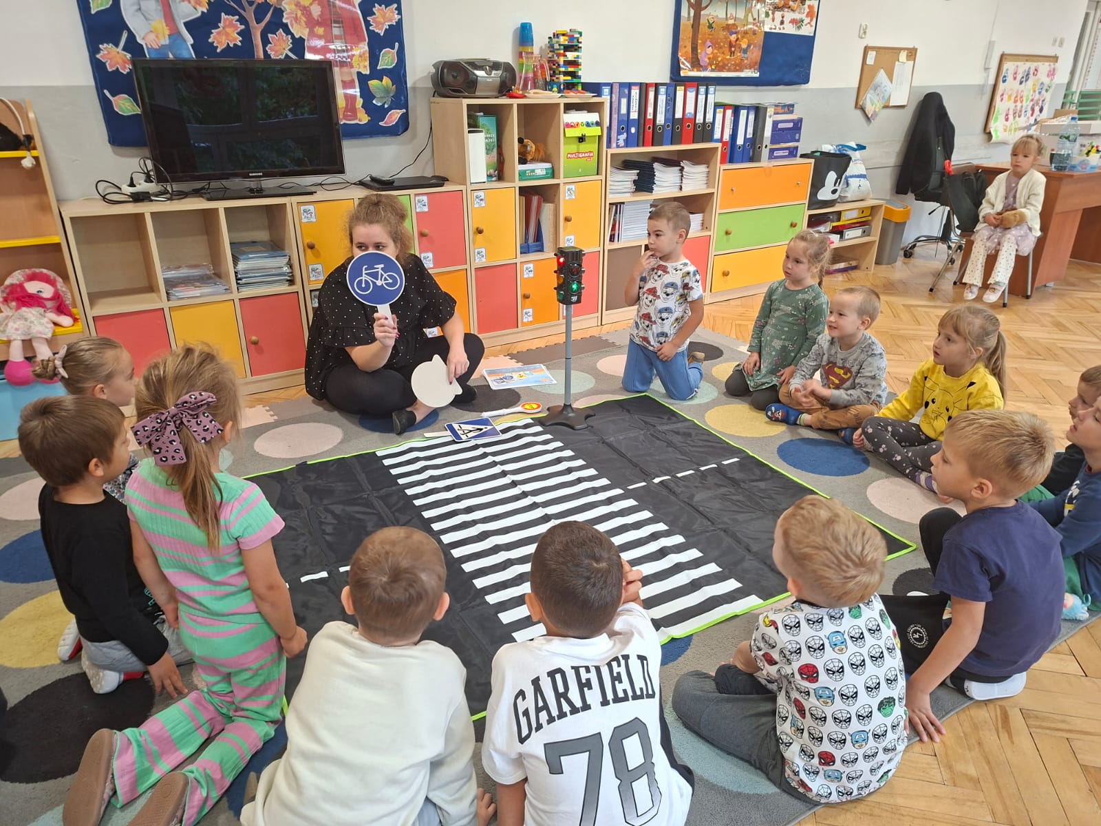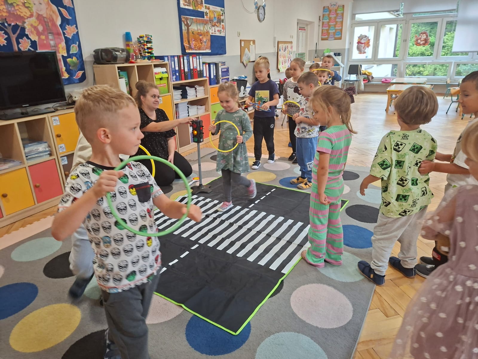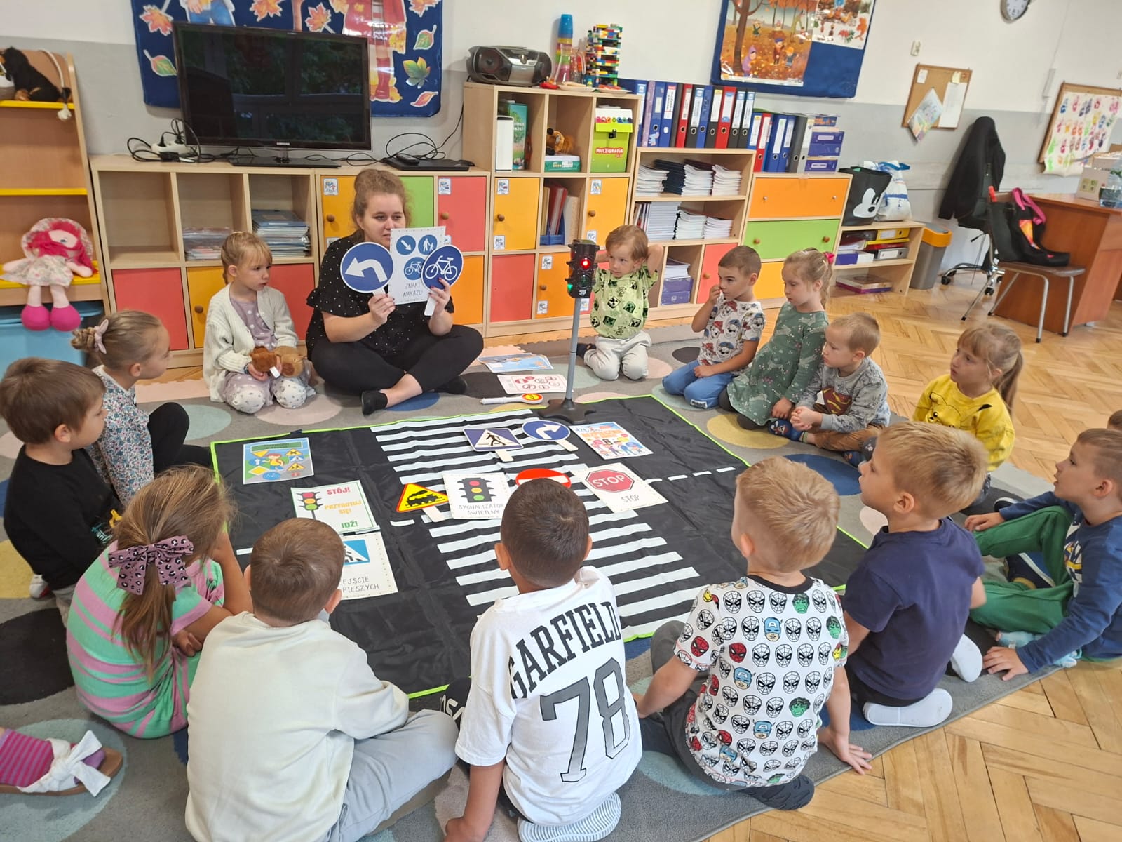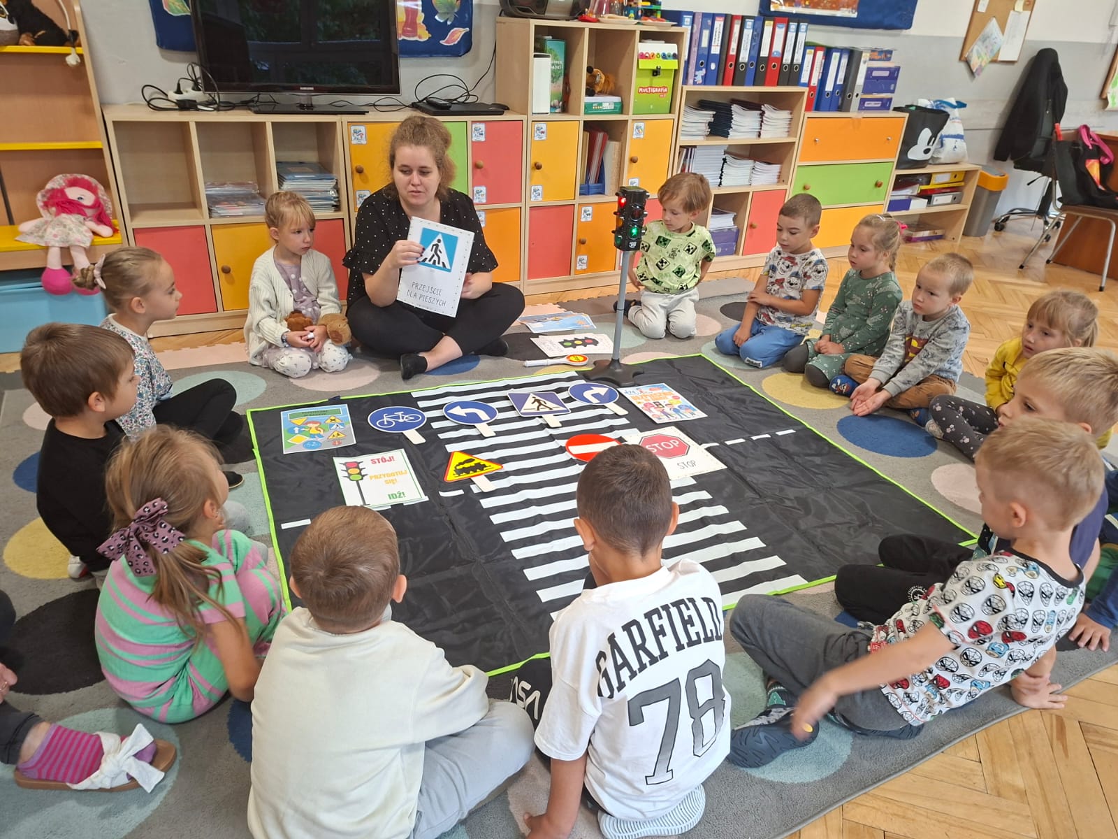 W minionym tygodniu rozmawialiśmy również o Bezpiecznym spacerze, przygotowując dzieci do bezpiecznego i samodzielnego poruszania się po drodze, jak trzeba się zachować przy przejściu dla pieszych, omawialiśmy światła , rozmawialiśmy na temat podstawowych znaków drogowych, odczytywaliśmy je wspólnie. Dopasowywaliśmy odpowiednie znaki do obrazków. Nie zabrakło przy tym zabaw ruchowych z użyciem sygnalizatora i maty drogi z przejściem dla pieszych.