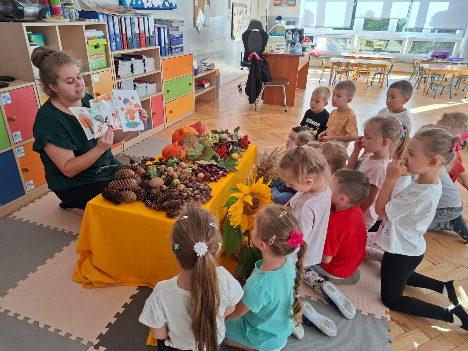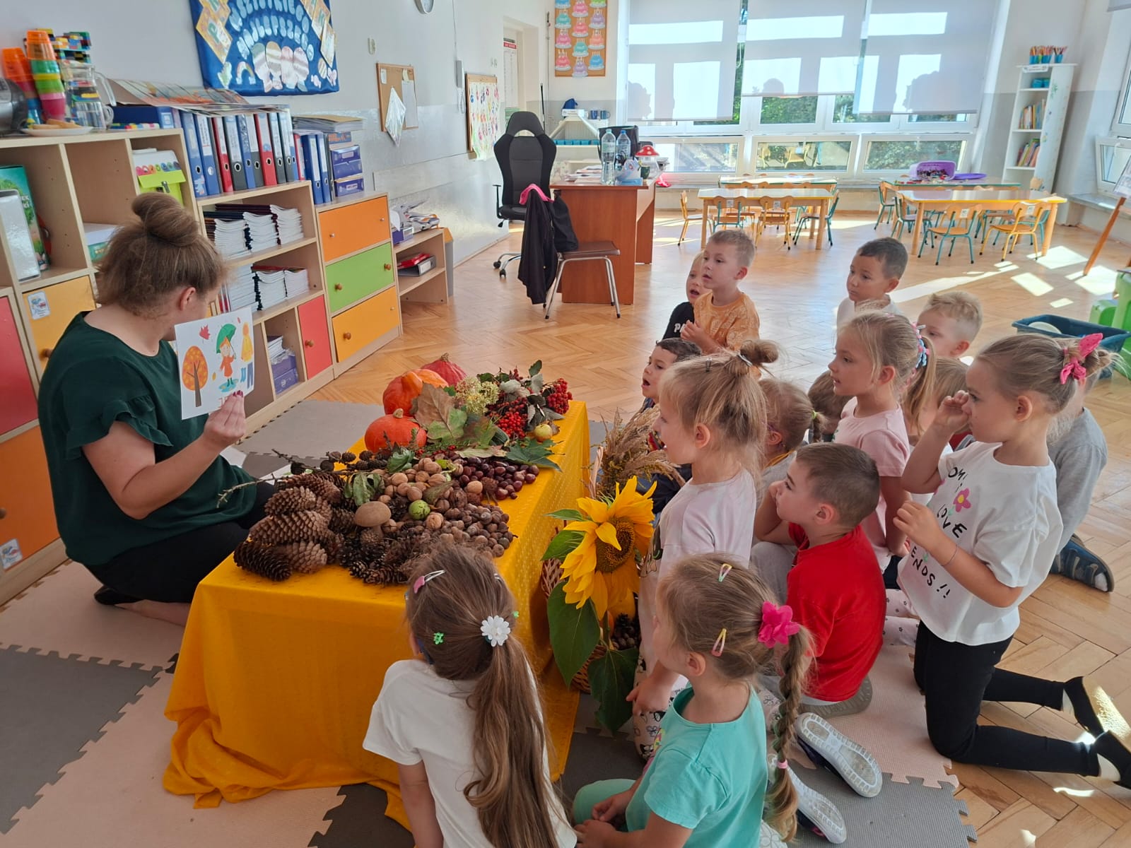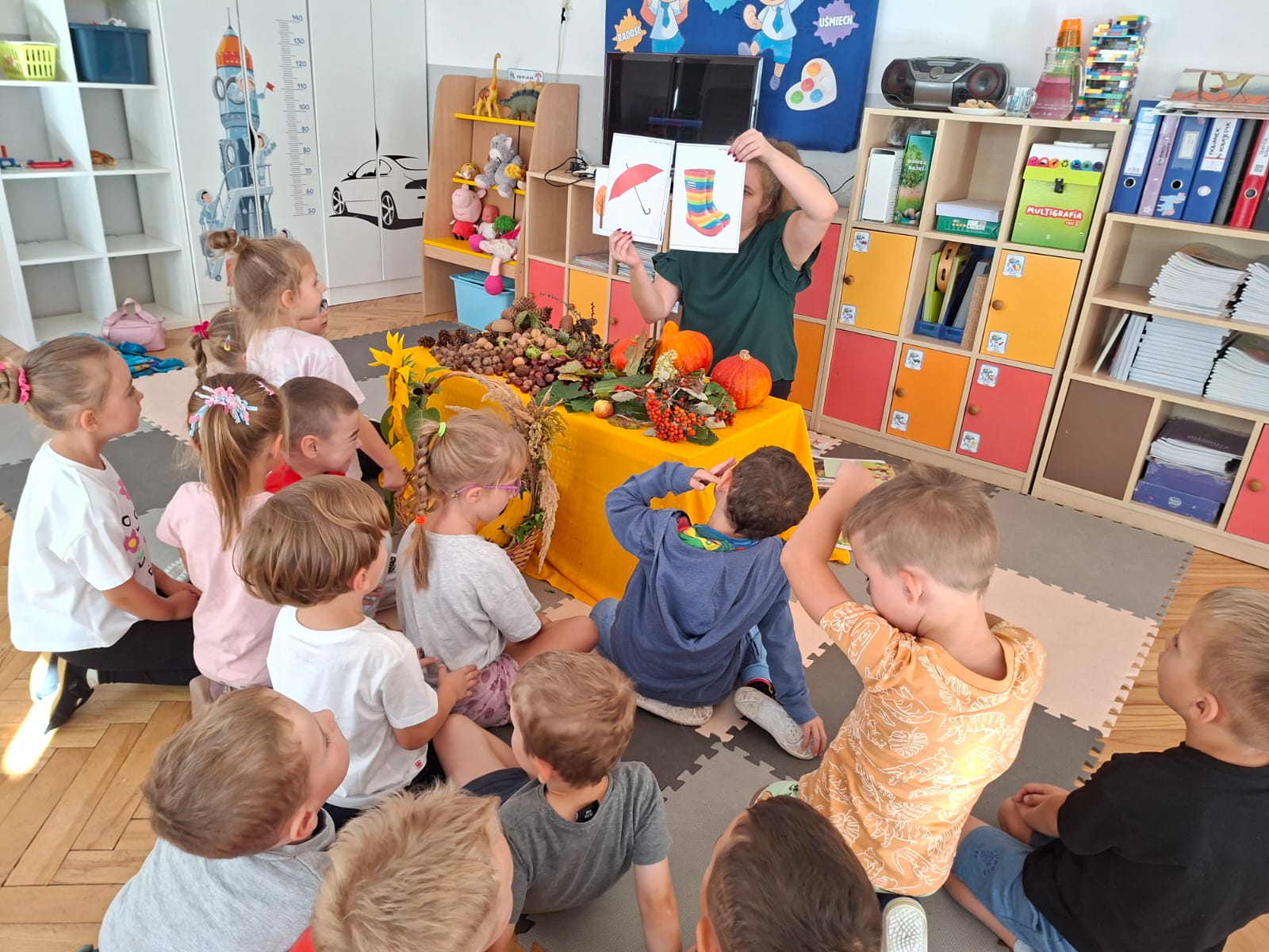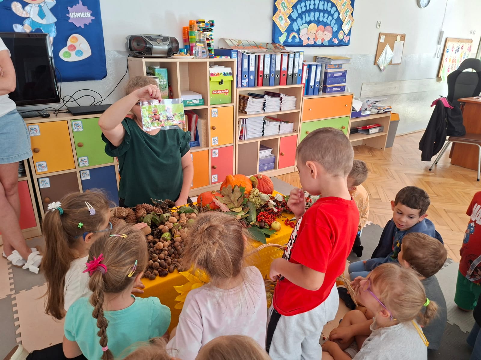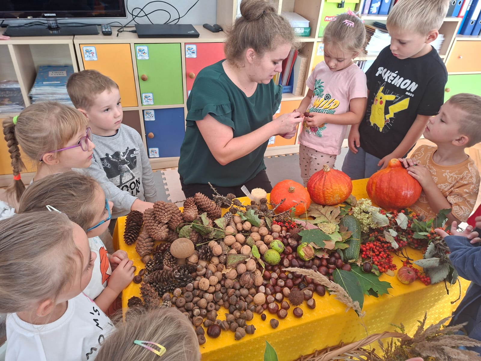 W minionym tygodniu rozmawialiśmy o jesieni w naszej okolicy, o zmianach przyrody, poznawaliśmy dary jesieni, zrobiliśmy kącik jesienny.
