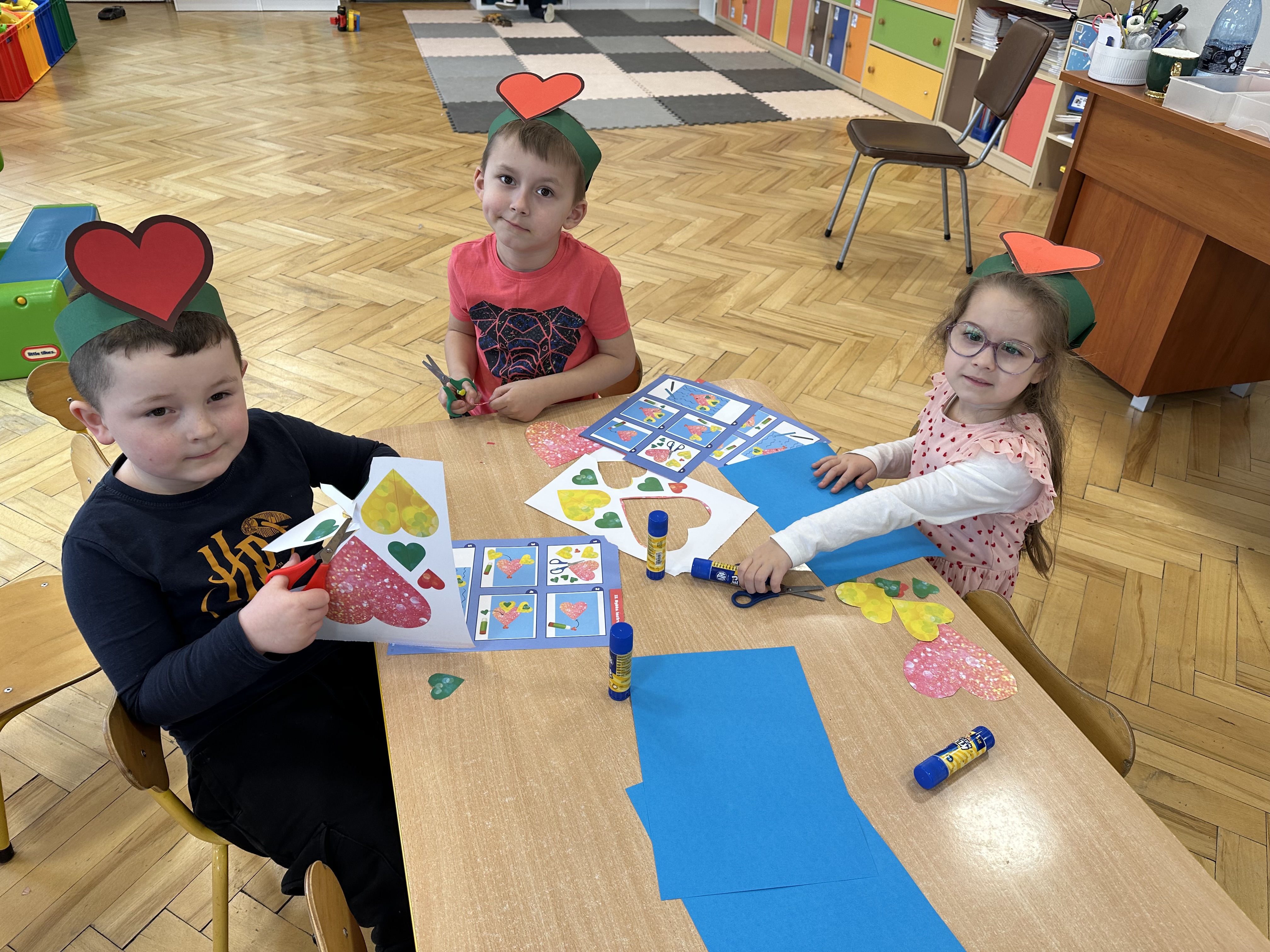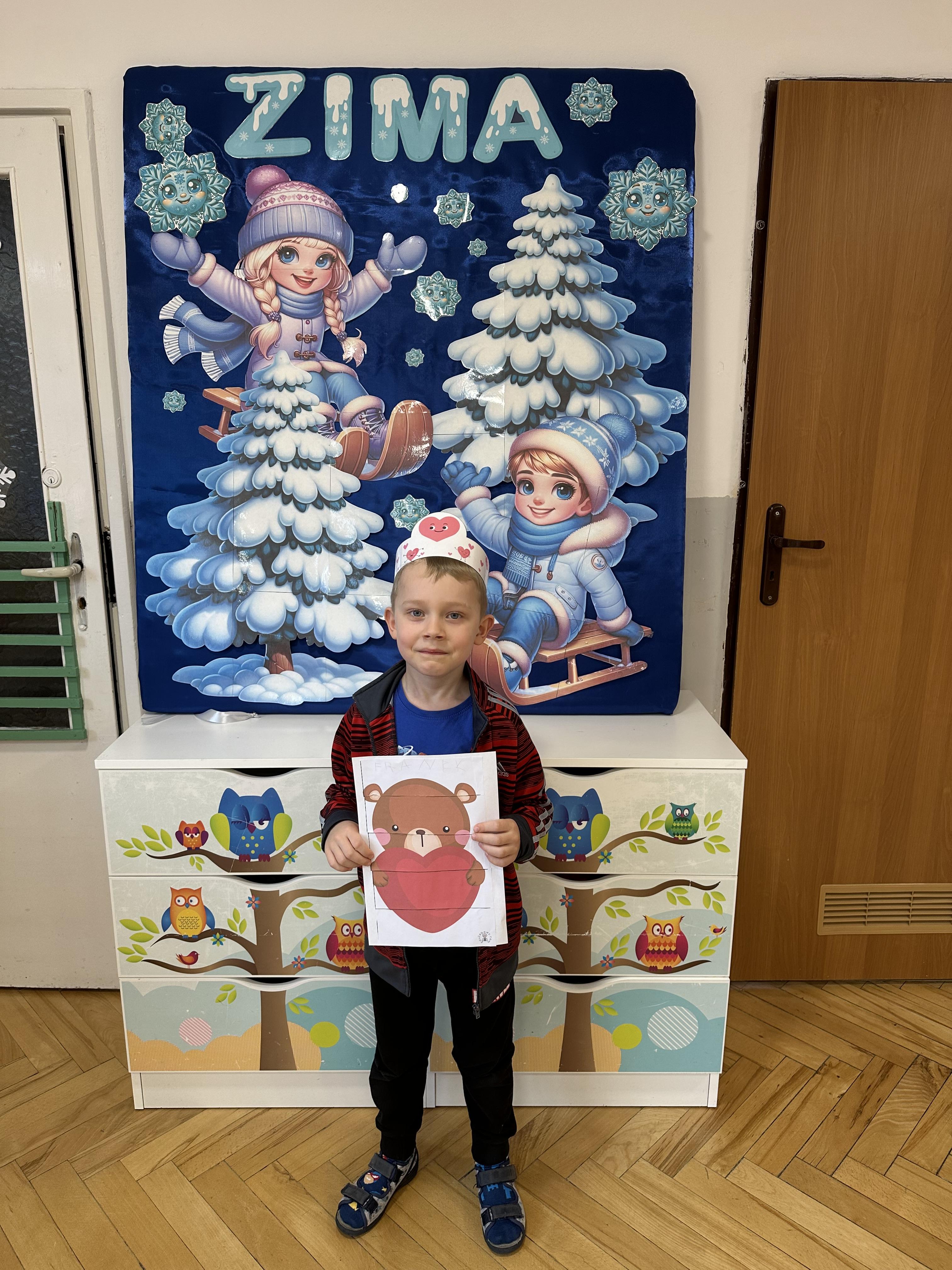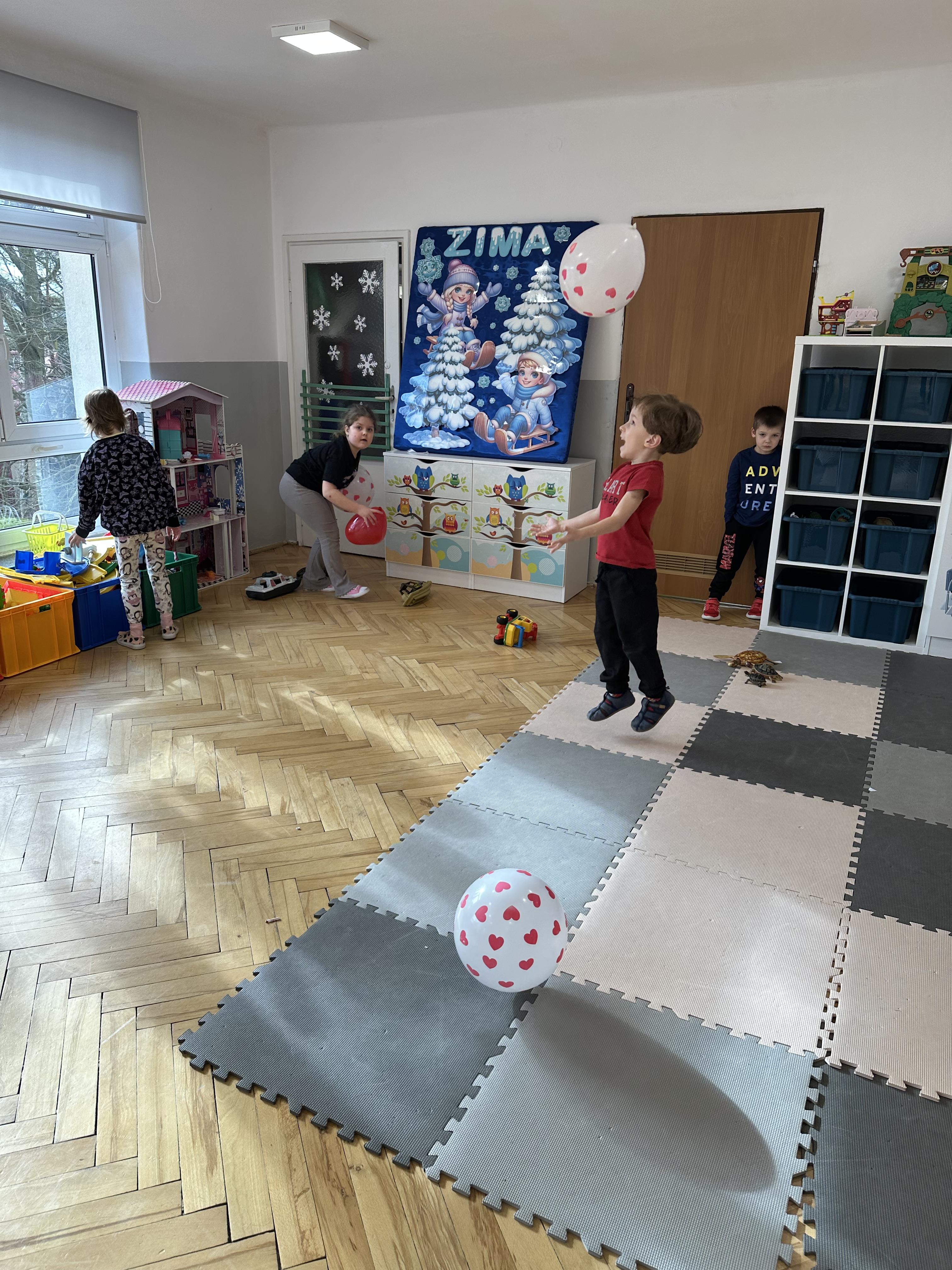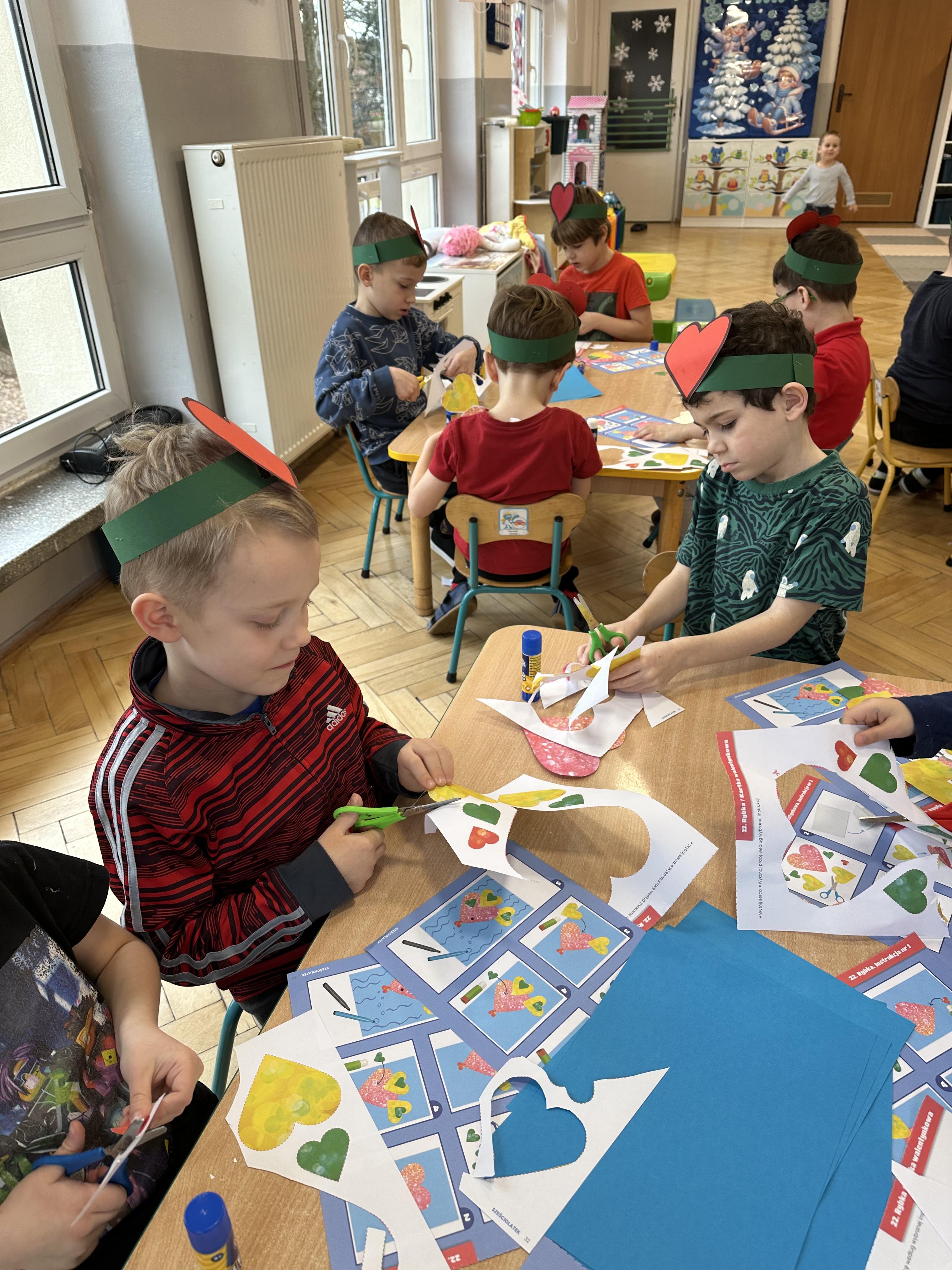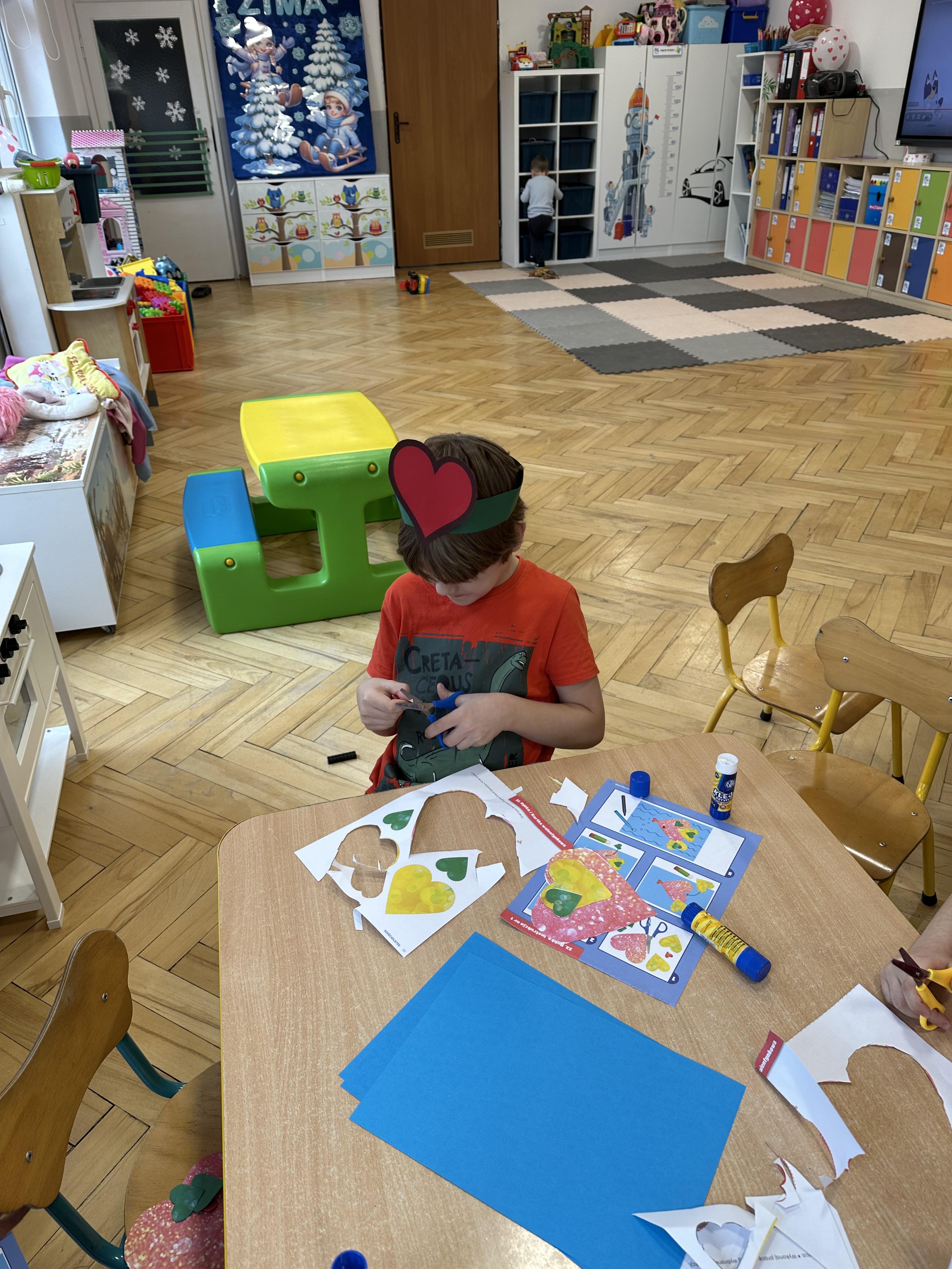 w kalamburach, doskonaliły umiejętność niewerbalnego wyrażania uczuć, rozwijały logiczne myślenie i równowagę. Podczas zabaw przy stolikach dzieci kształtowały umiejętność rozpoznawania i nazywania uczuć i emocji, ćwiczyły ruchy dłoni i rozwiązywały zadania. We wtorek przedszkolaki dowiedziały się, czym jest rym i podały jego przykłady. Poznały literę „s” małą i wielką, drukowaną i pisaną, dzieliły na sylaby słowo ,,serce” i przeliczały je, wysłuchiwały pierwszą głoskę w tym słowie i ją powtarzały, a także odtwarzały słyszalny rytm dźwiękowy. Dodatkowo dzieci samodzielnie układały schemat głoskowy i wymieniały imiona rozpoczynające się głoską s. W środę podczas zabawy „Smaczne i zdrowe” dzieci wychwytywały daną sekwencję