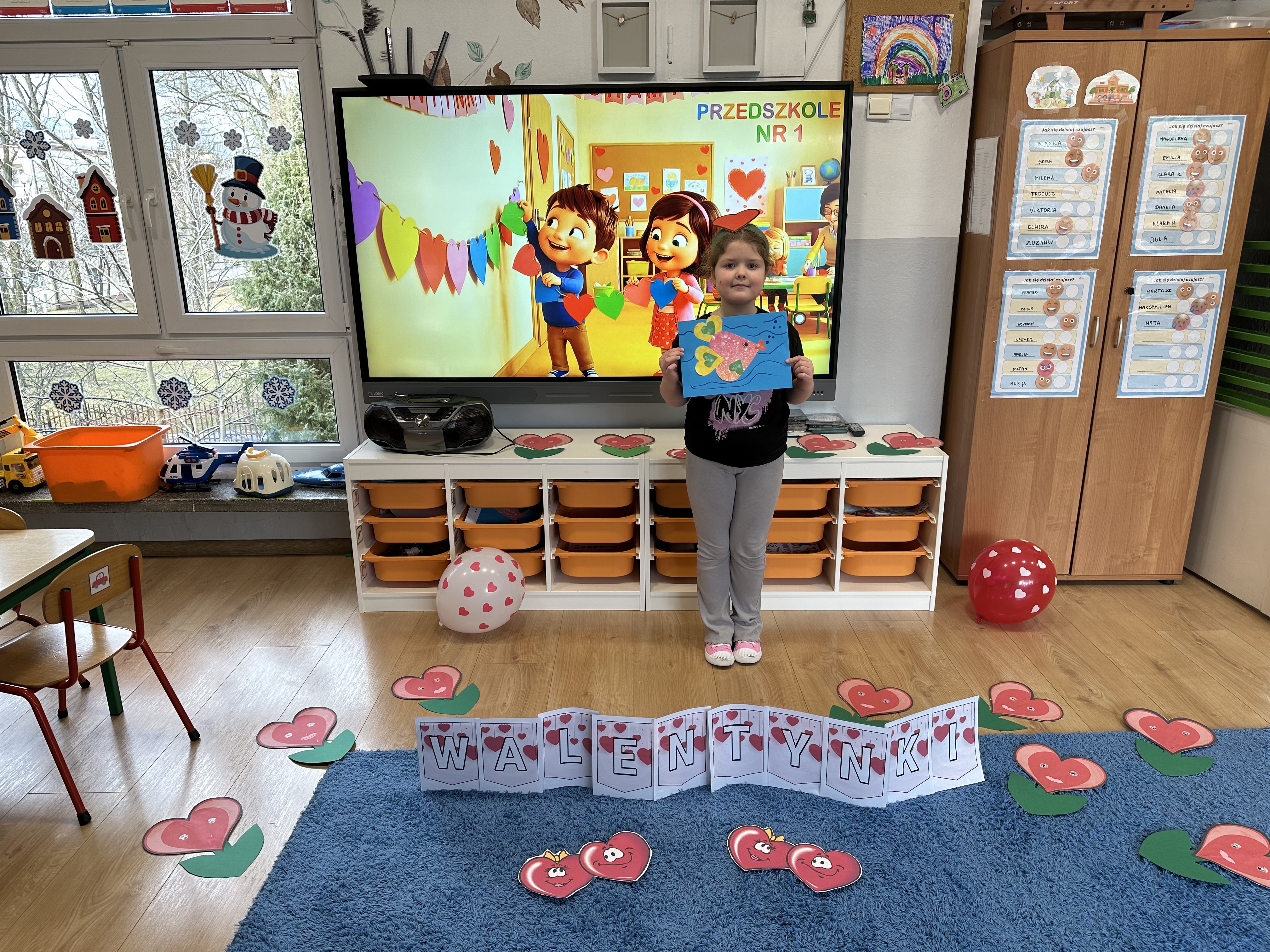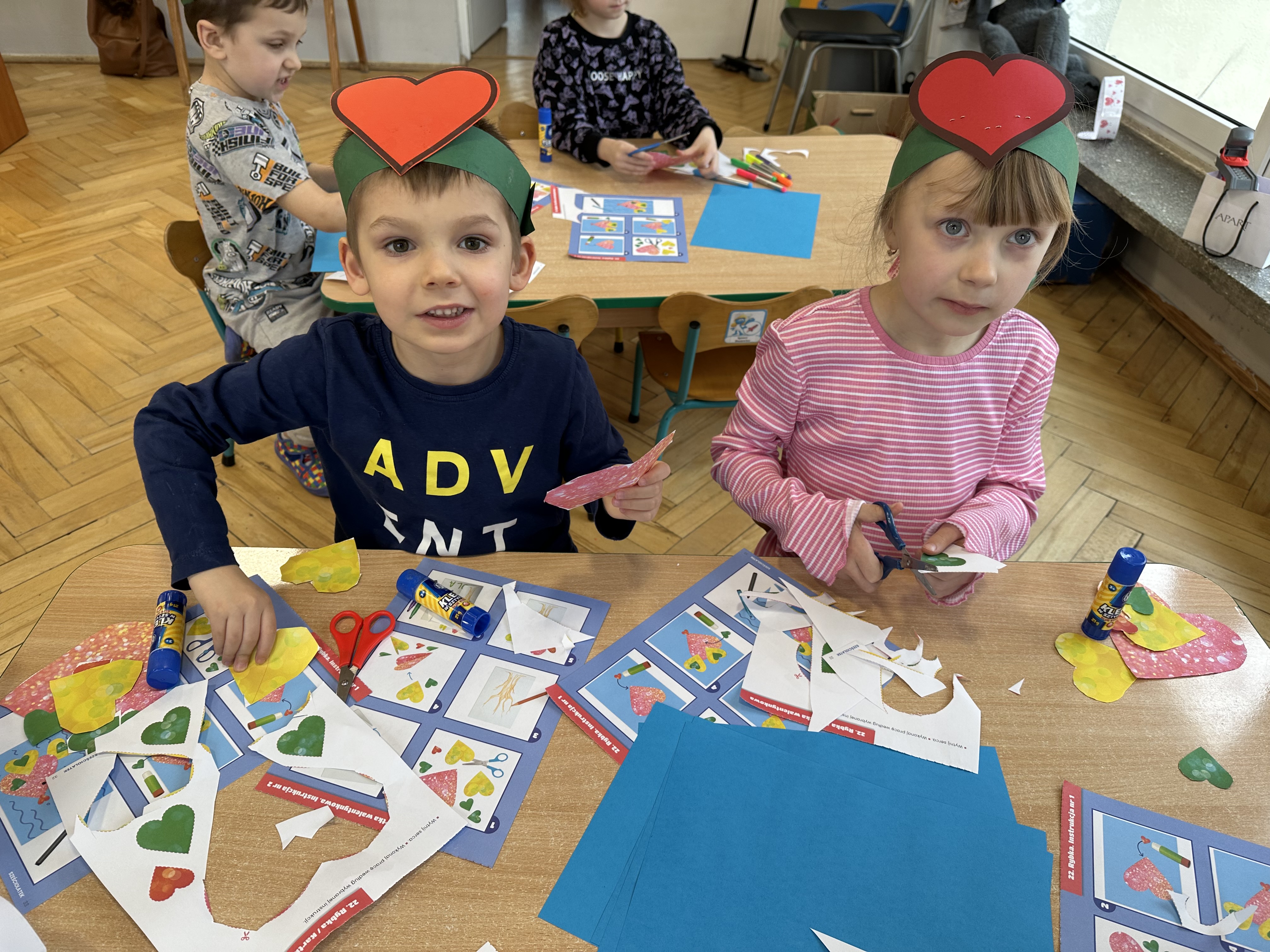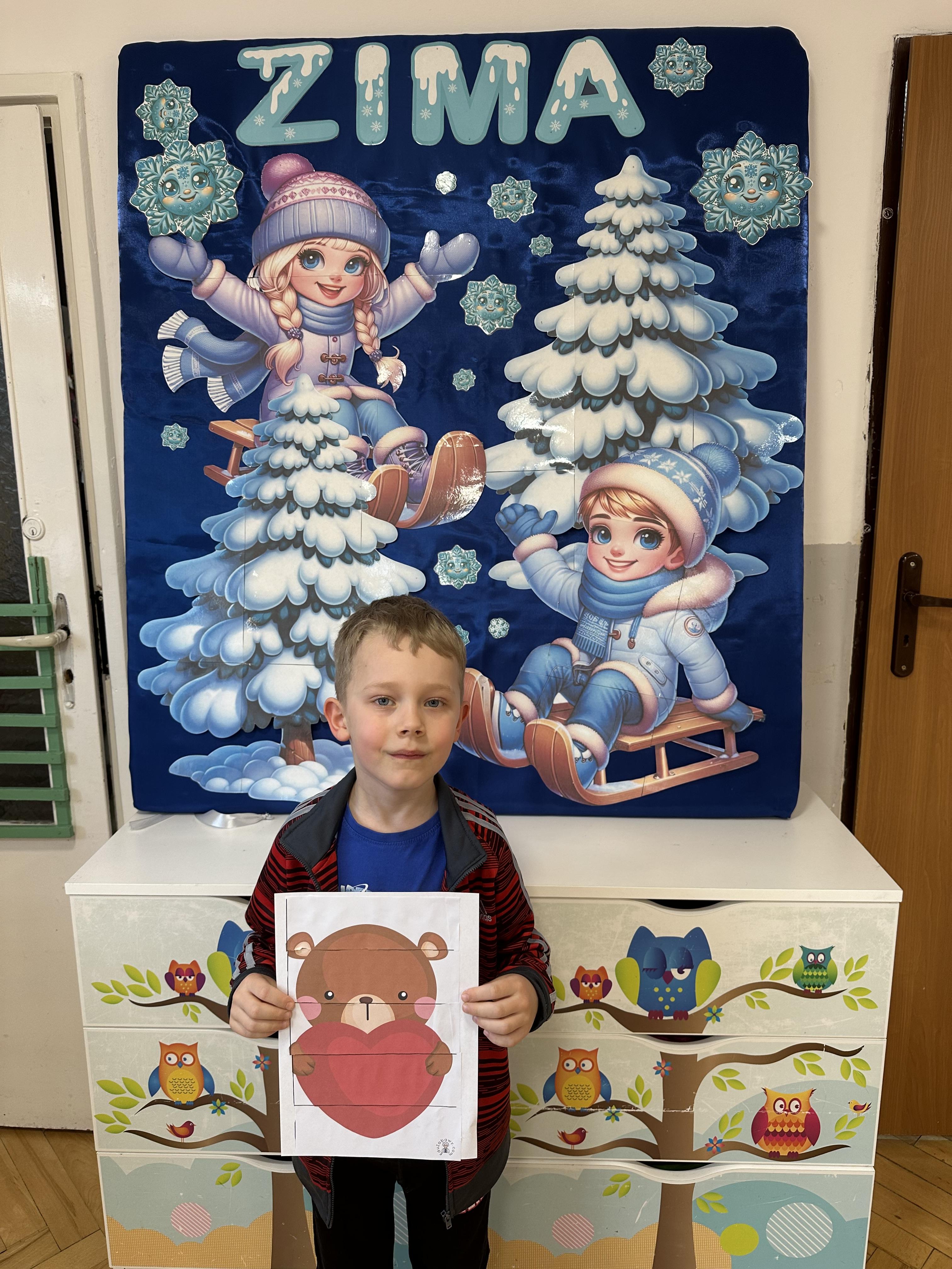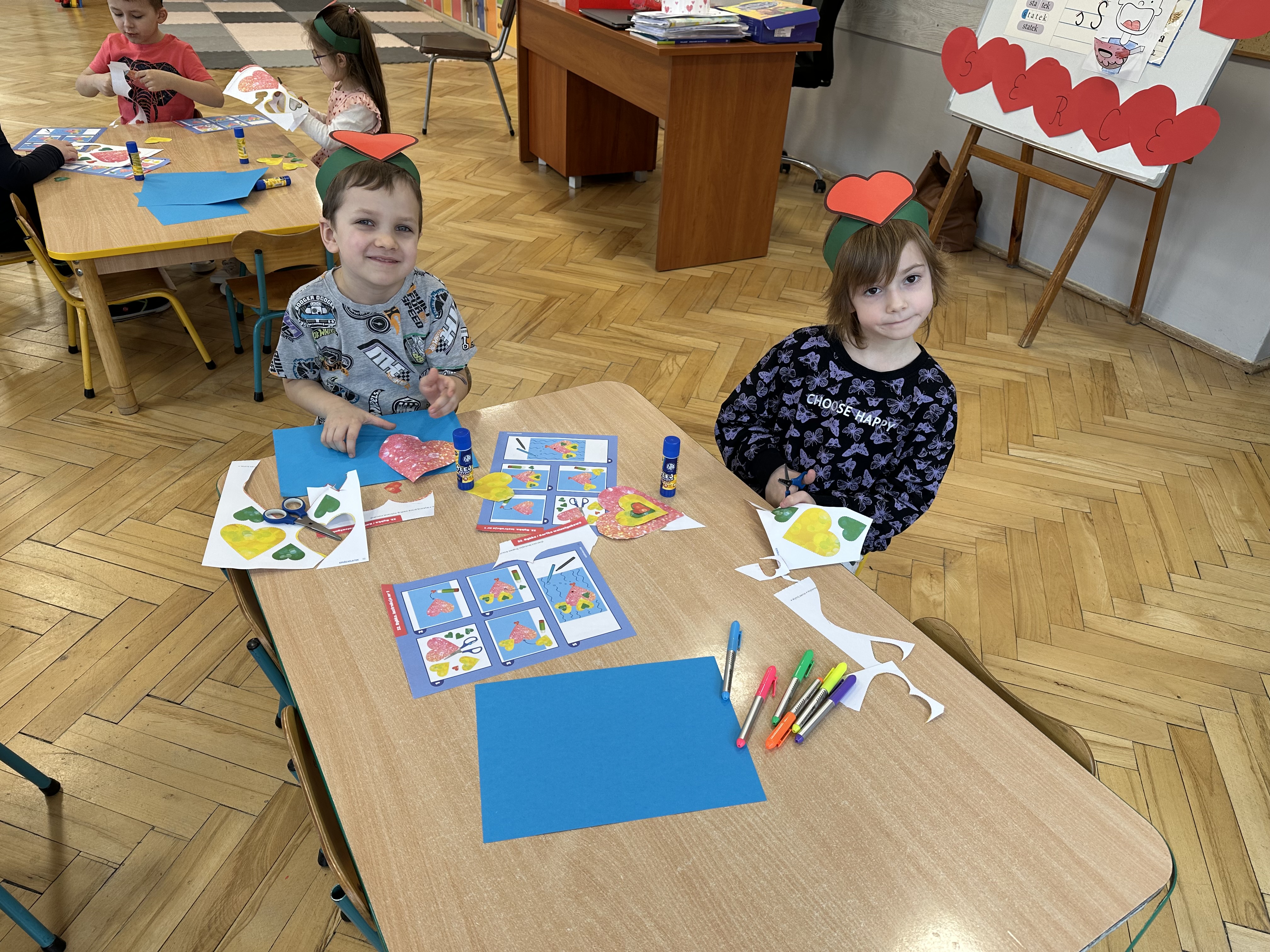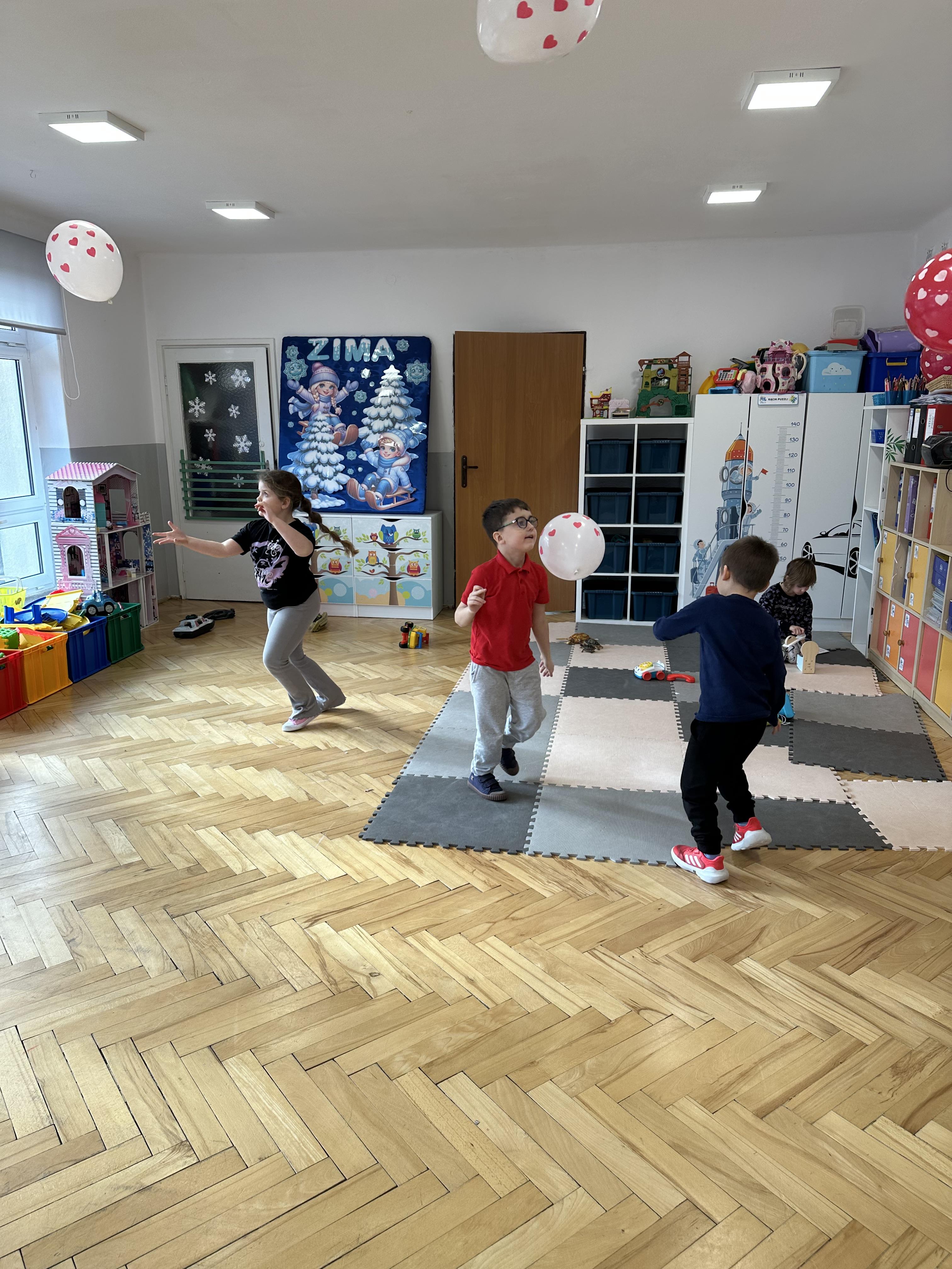 w kalamburach, doskonaliły umiejętność niewerbalnego wyrażania uczuć, rozwijały logiczne myślenie i równowagę. Podczas zabaw przy stolikach dzieci kształtowały umiejętność rozpoznawania i nazywania uczuć i emocji, ćwiczyły ruchy dłoni i rozwiązywały zadania. We wtorek przedszkolaki dowiedziały się, czym jest rym i podały jego przykłady. Poznały literę „s” małą i wielką, drukowaną i pisaną, dzieliły na sylaby słowo ,,serce” i przeliczały je, wysłuchiwały pierwszą głoskę w tym słowie i ją powtarzały, a także odtwarzały słyszalny rytm dźwiękowy. Dodatkowo dzieci samodzielnie układały schemat głoskowy i wymieniały imiona rozpoczynające się głoską s. W środę podczas zabawy „Smaczne i zdrowe” dzieci wychwytywały daną sekwencję