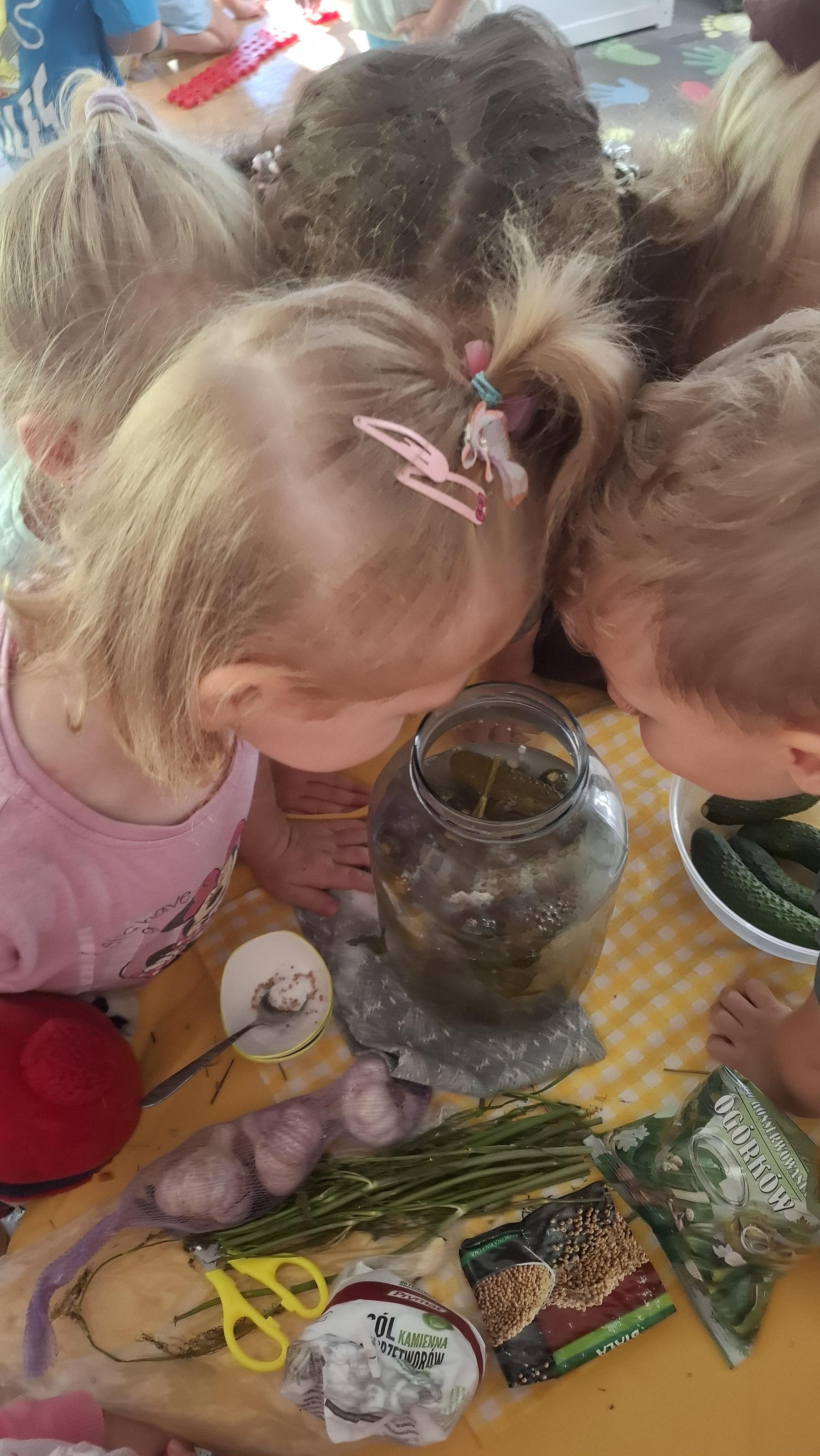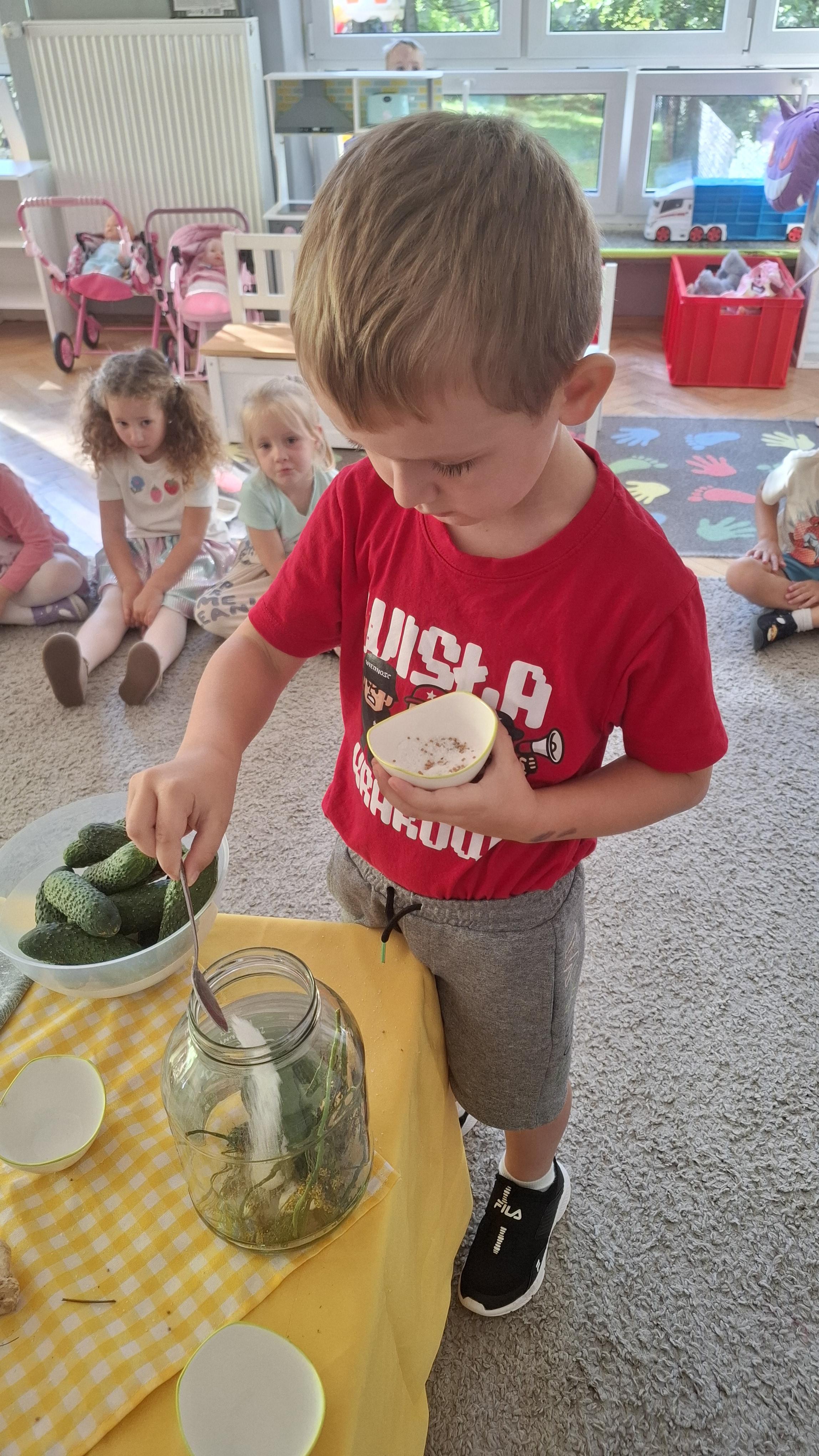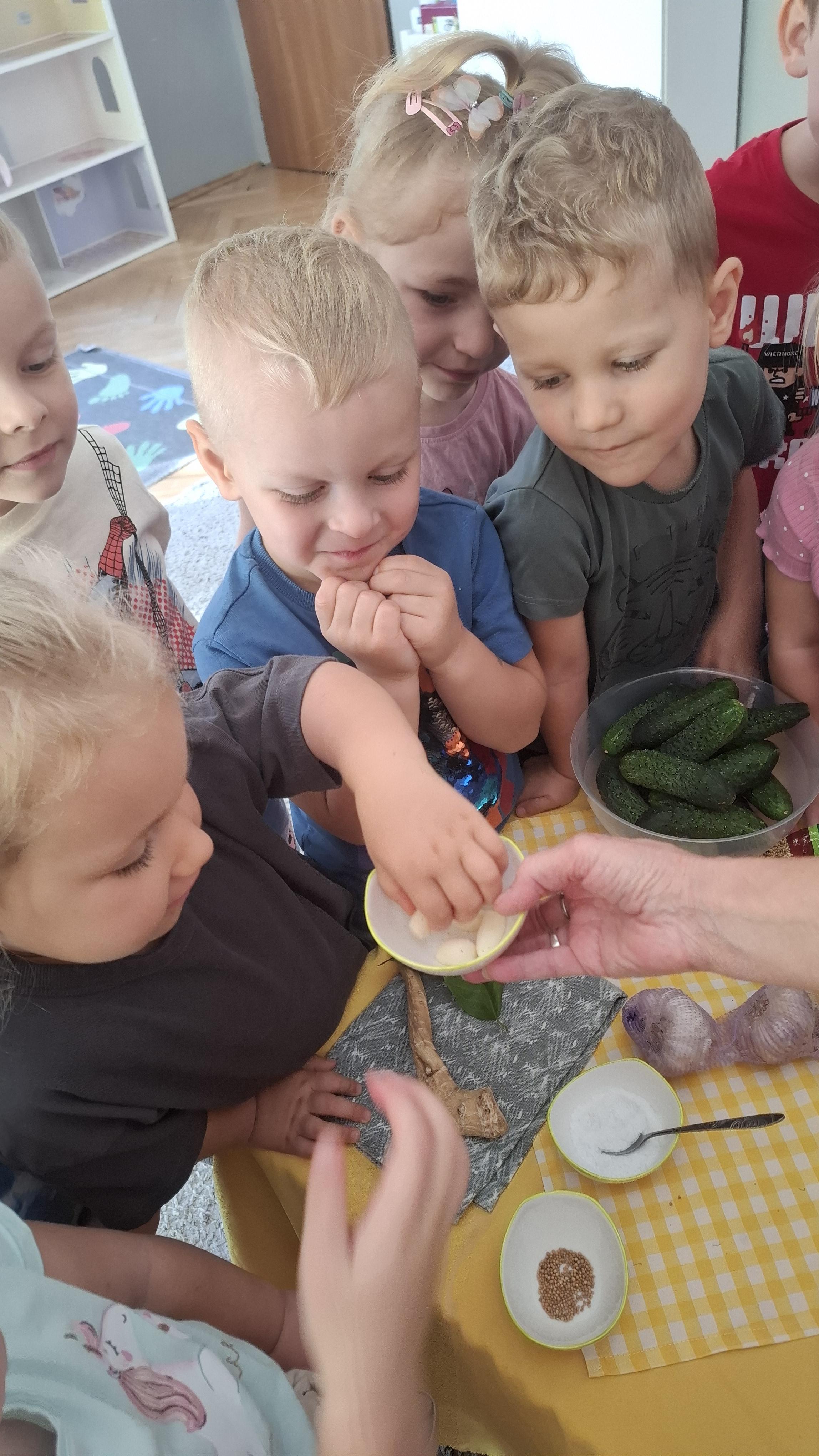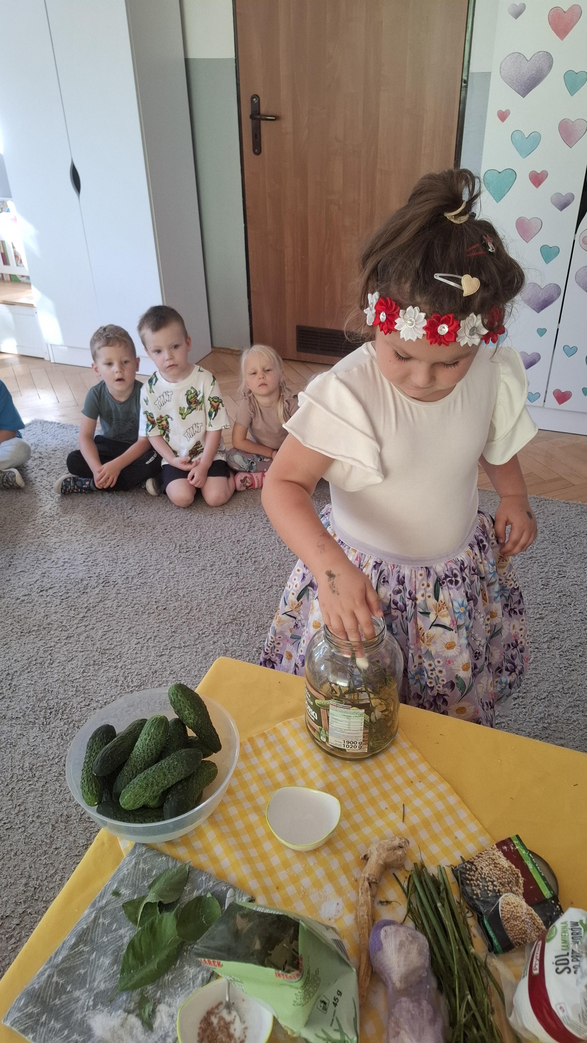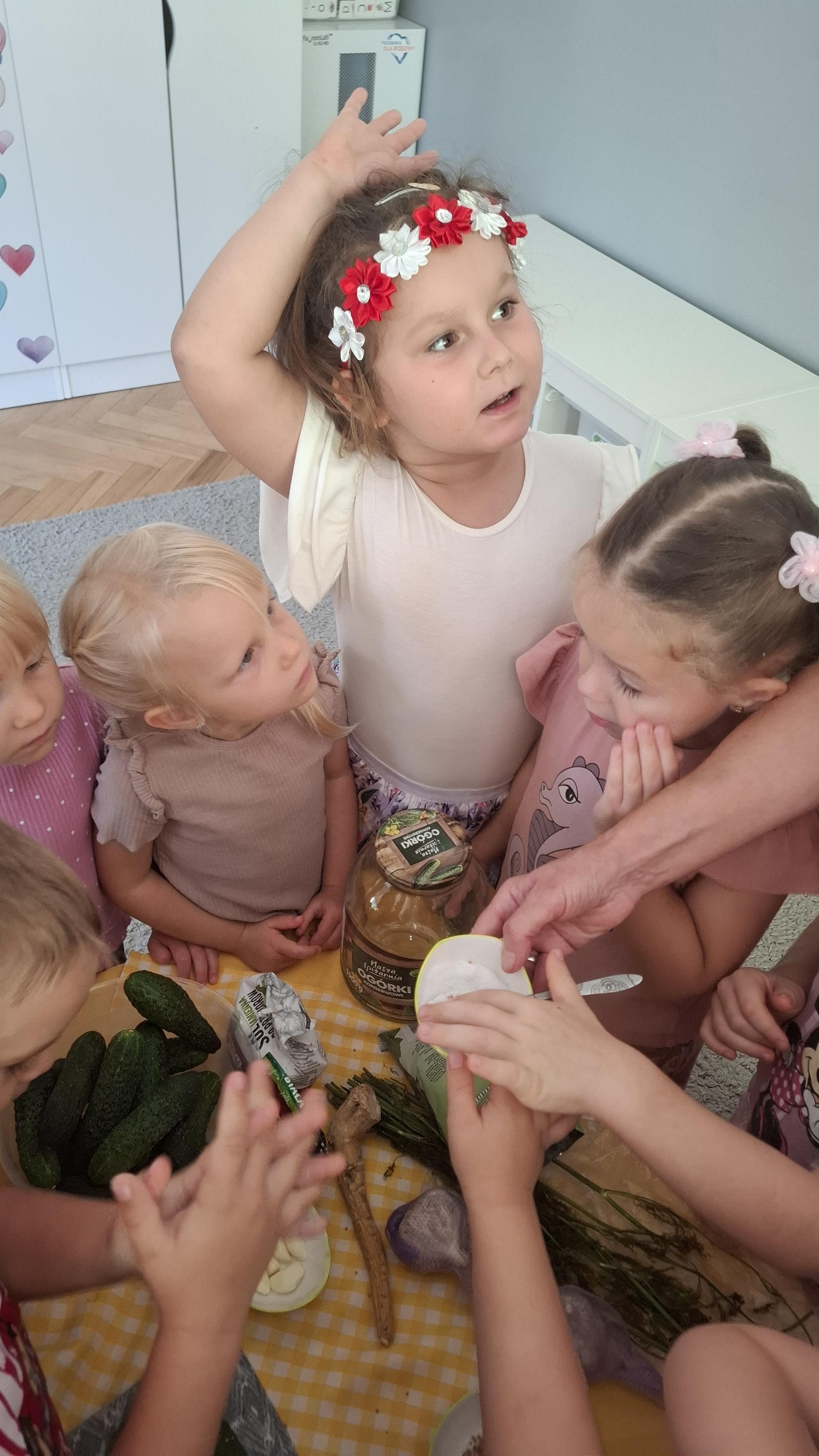 W świat tajników kiszenia warzyw wprowadziła dzieci pani Basia, która krok po kroku pokazała, jak przygotować ogórki do kiszenia. Przedszkolaki dowiedziały się, jakie składniki są potrzebne, by powstała pyszna, zdrowa i ekologiczna przekąska, a następnie samodzielnie przygotowały własny słoik z ogórkami.