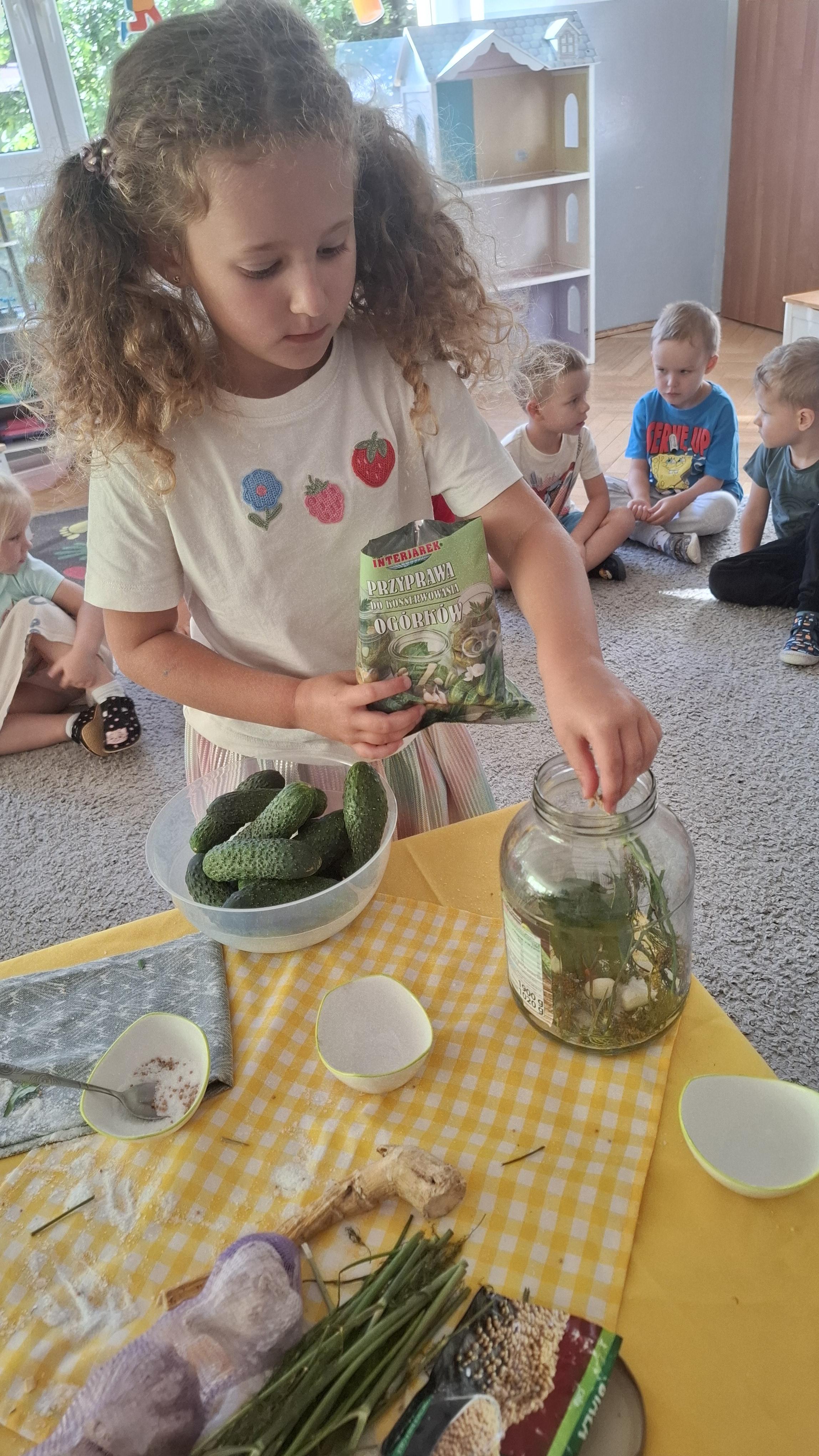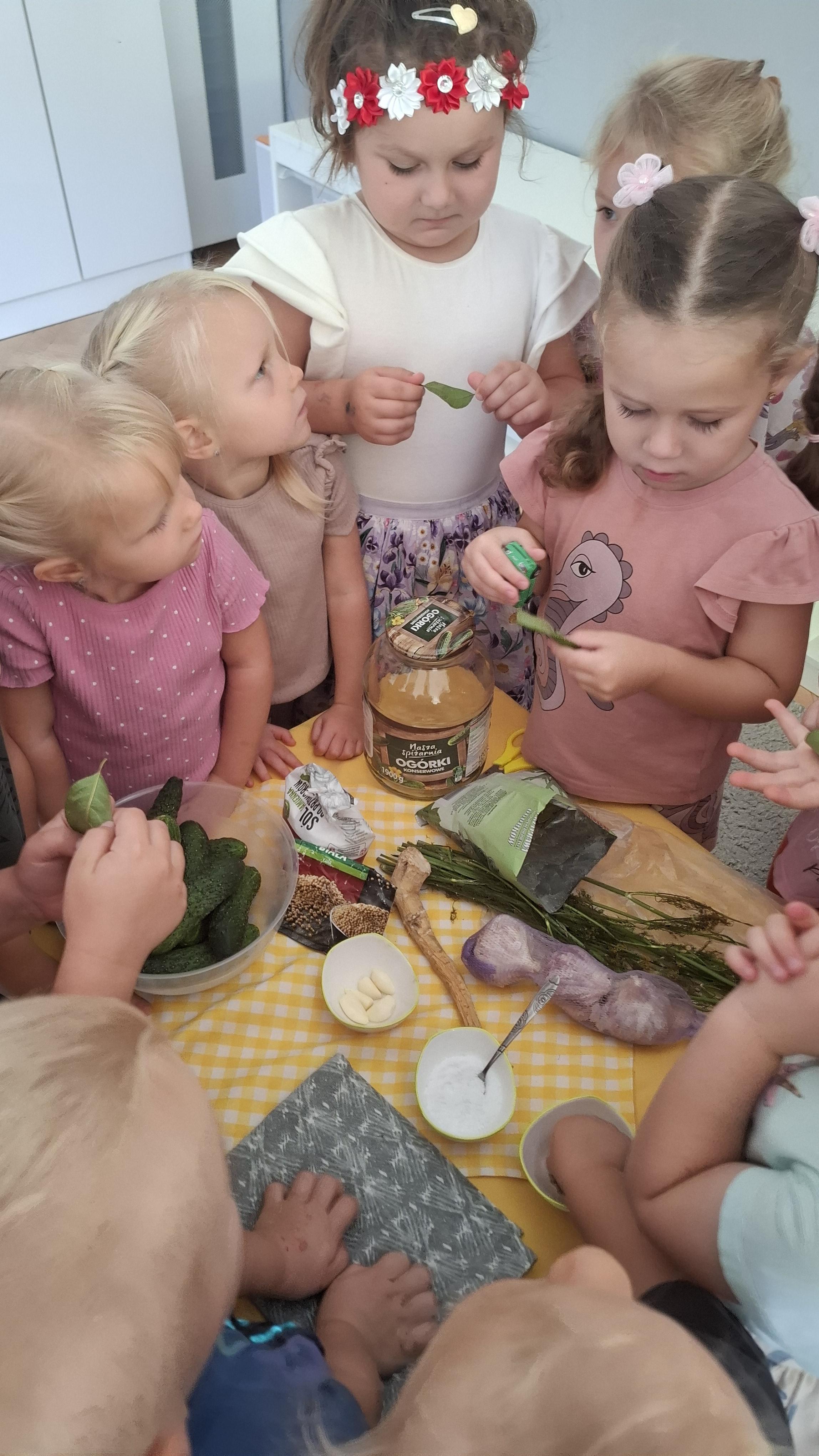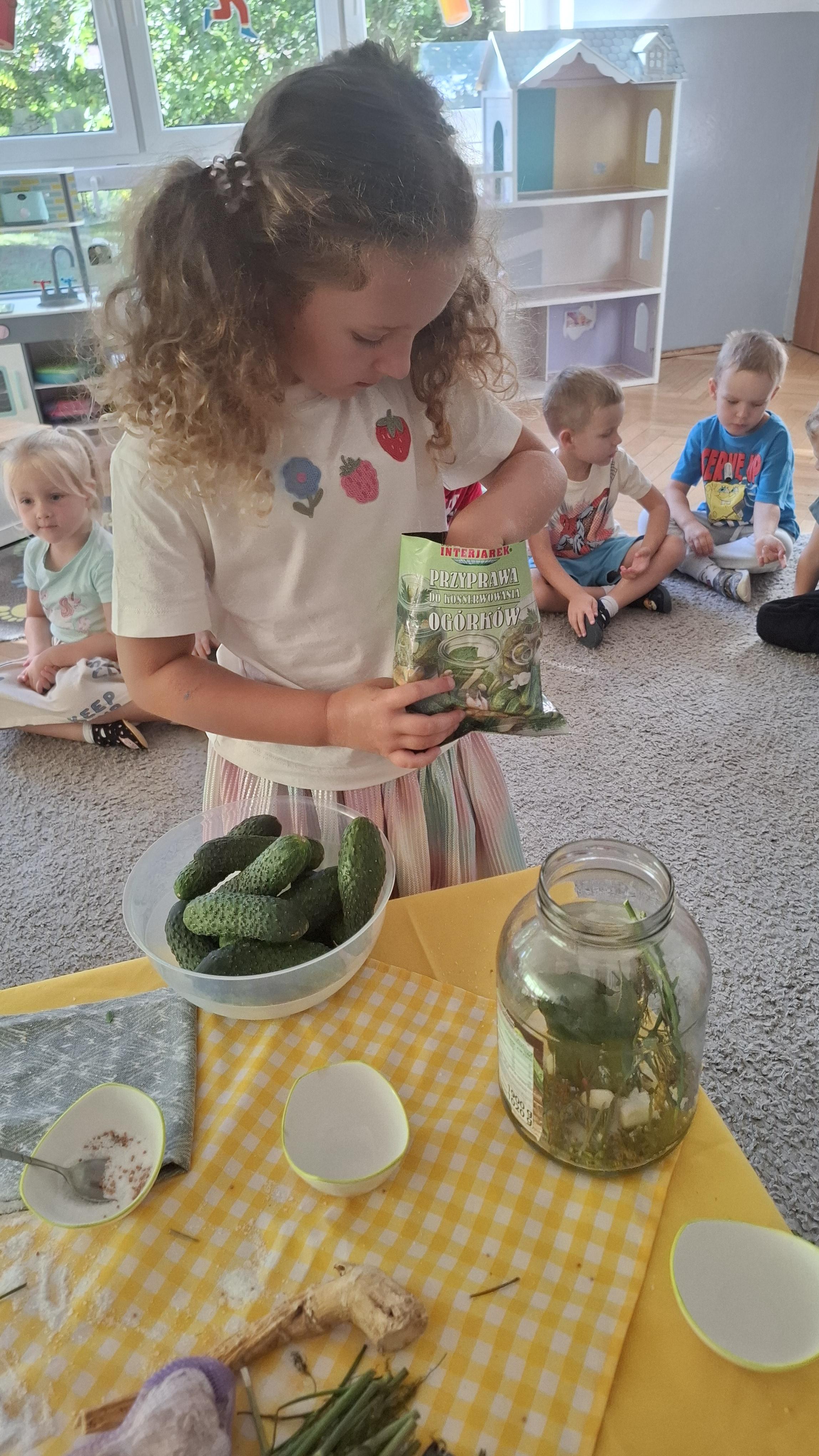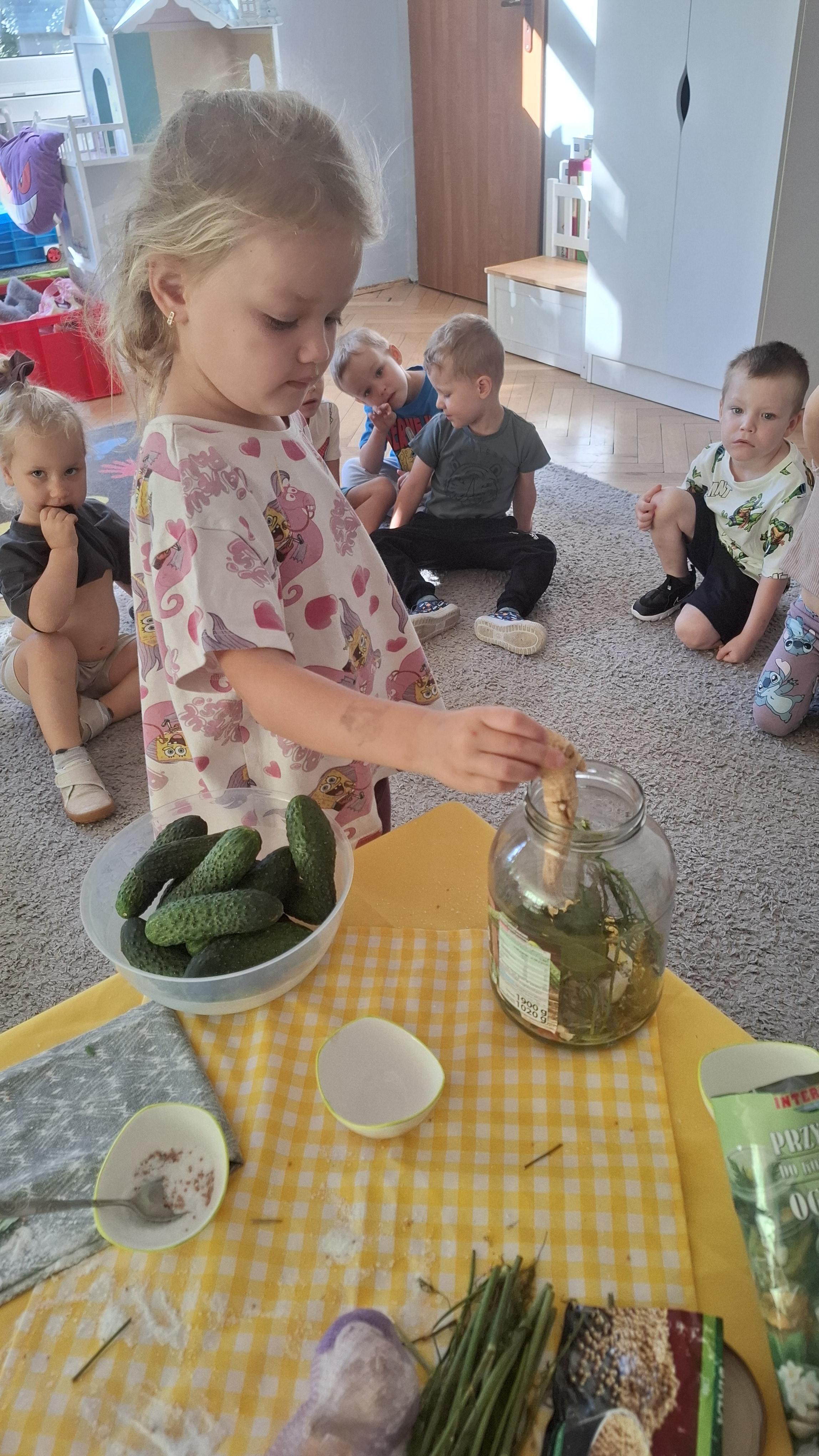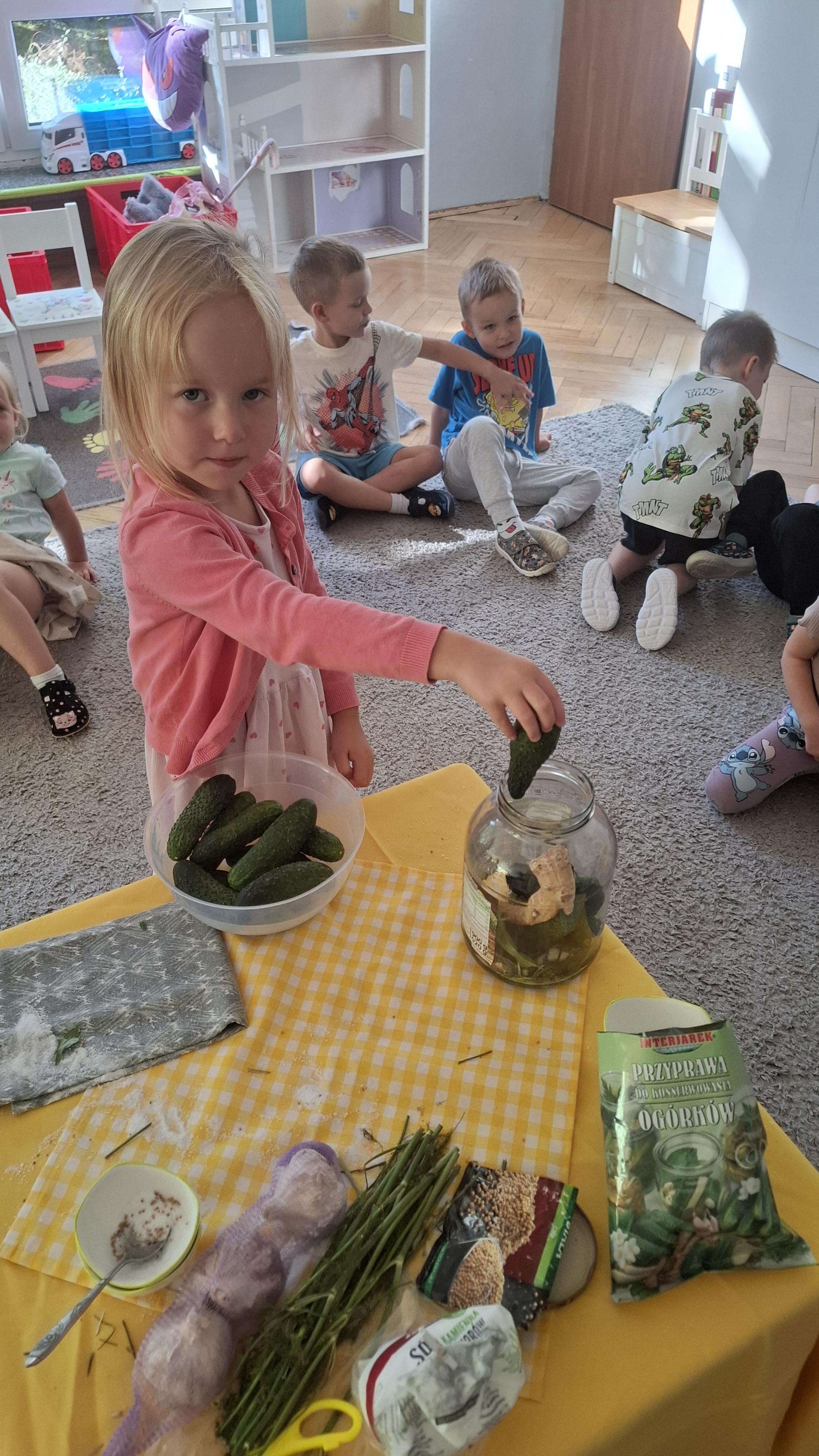 W świat tajników kiszenia warzyw wprowadziła dzieci pani Basia, która krok po kroku pokazała, jak przygotować ogórki do kiszenia. Przedszkolaki dowiedziały się, jakie składniki są potrzebne, by powstała pyszna, zdrowa i ekologiczna przekąska, a następnie samodzielnie przygotowały własny słoik z ogórkami.