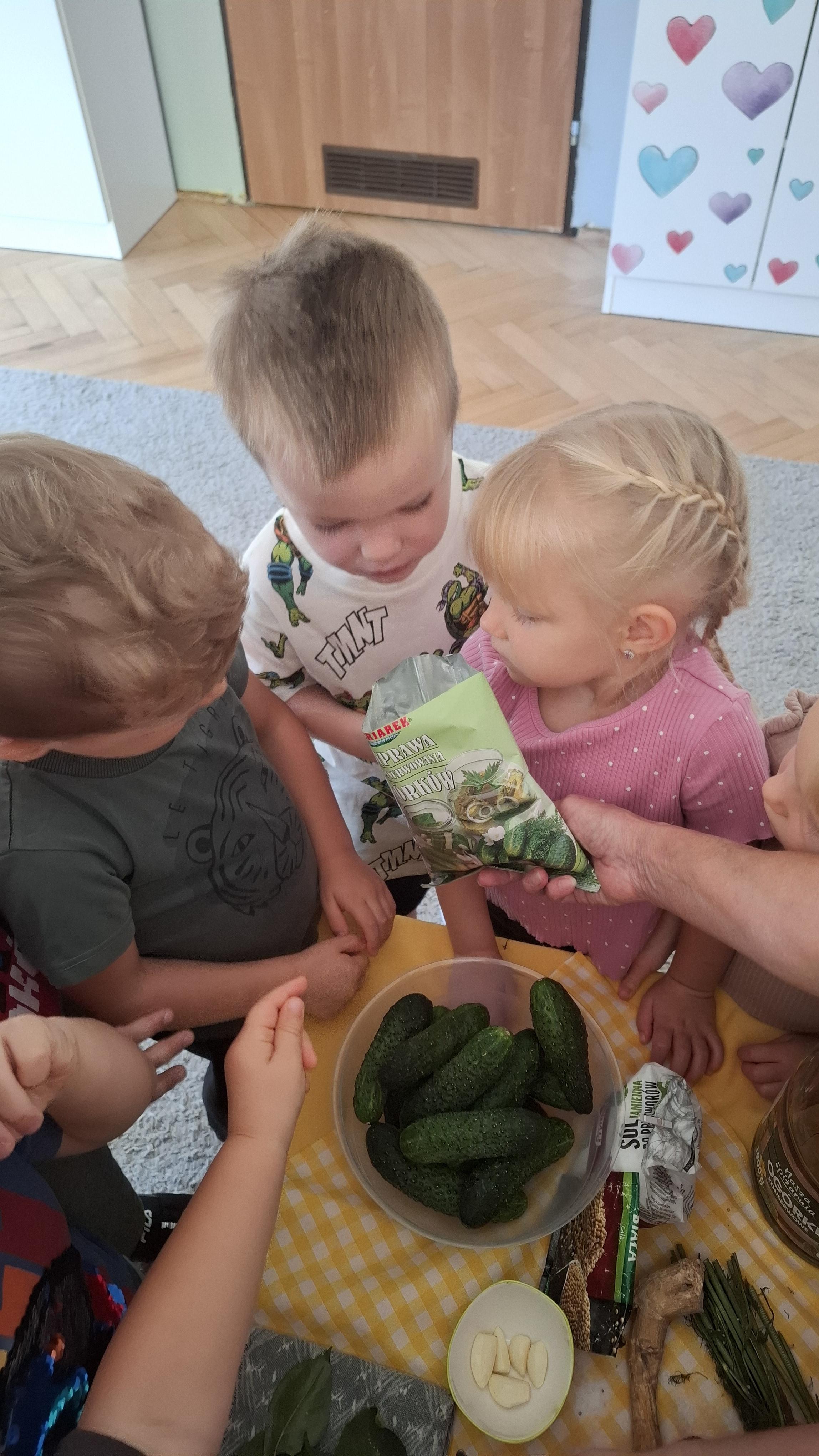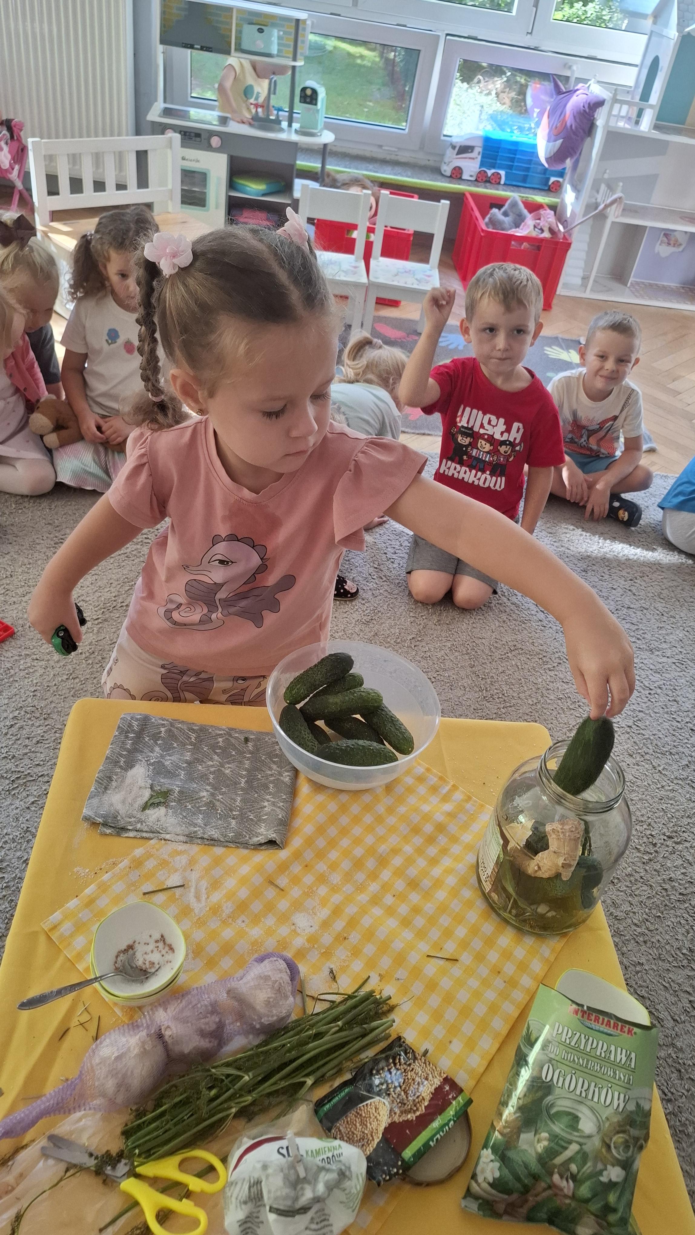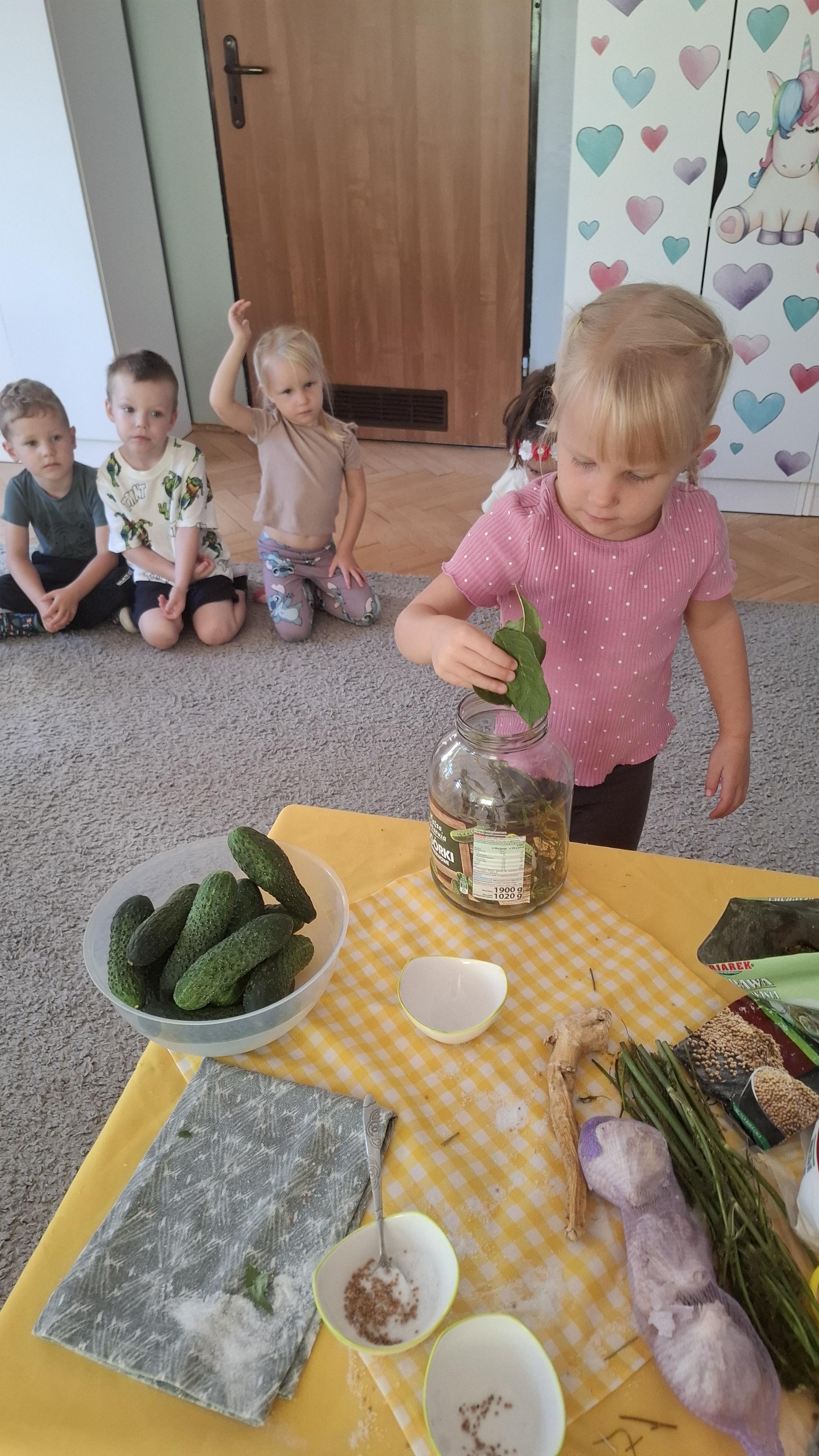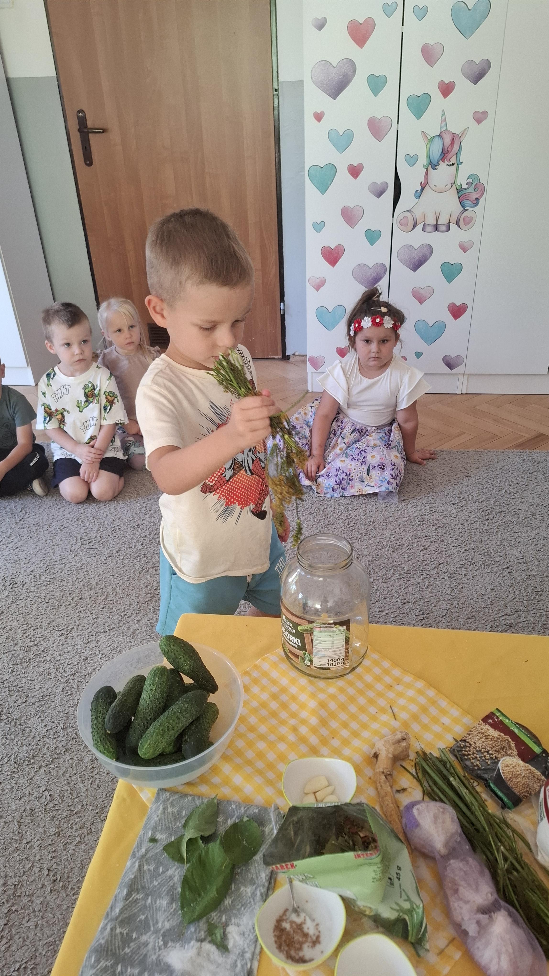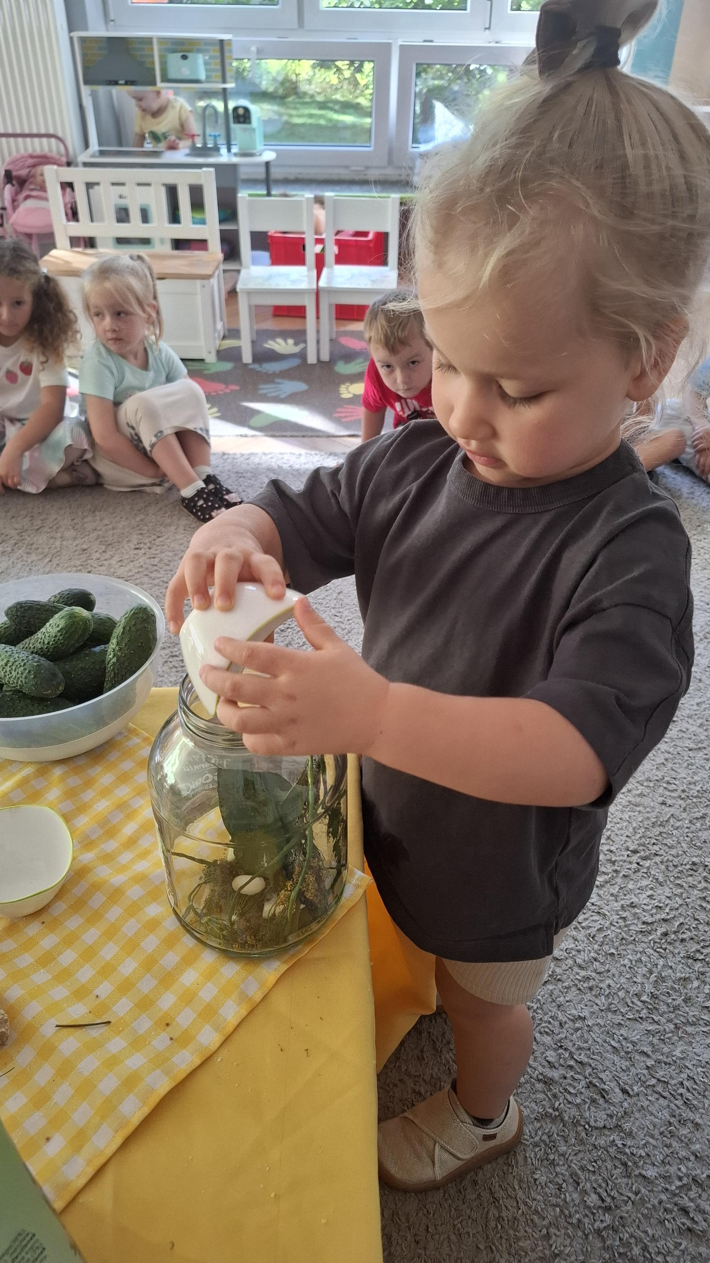 W świat tajników kiszenia warzyw wprowadziła dzieci pani Basia, która krok po kroku pokazała, jak przygotować ogórki do kiszenia. Przedszkolaki dowiedziały się, jakie składniki są potrzebne, by powstała pyszna, zdrowa i ekologiczna przekąska, a następnie samodzielnie przygotowały własny słoik z ogórkami.