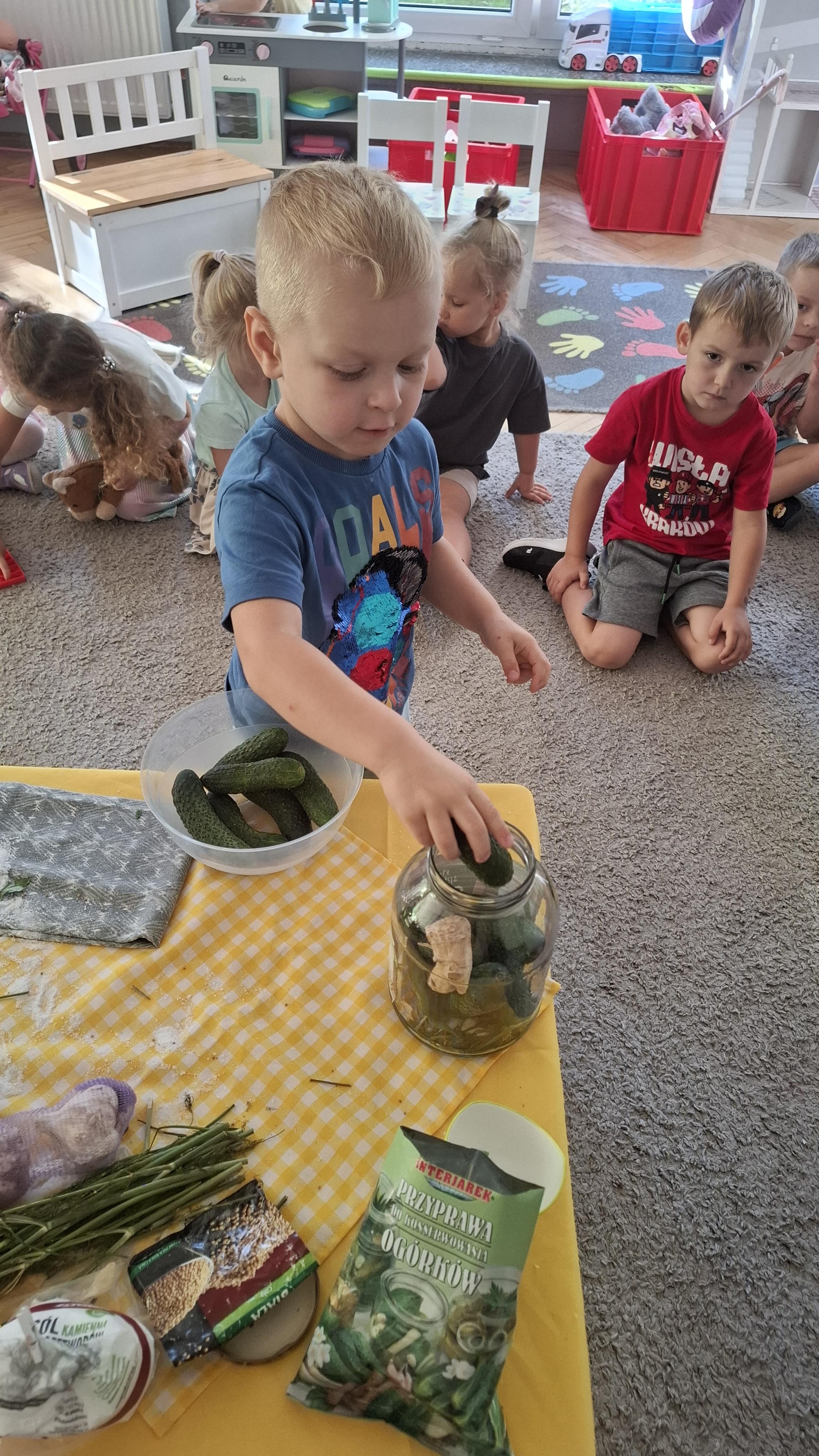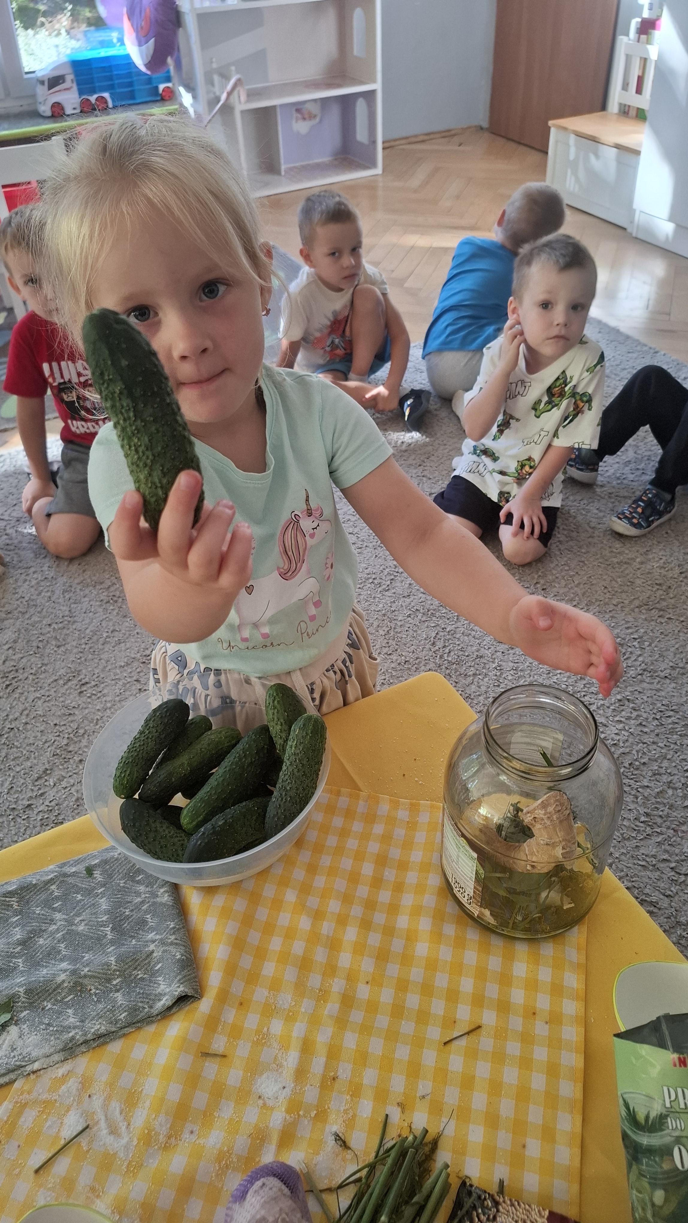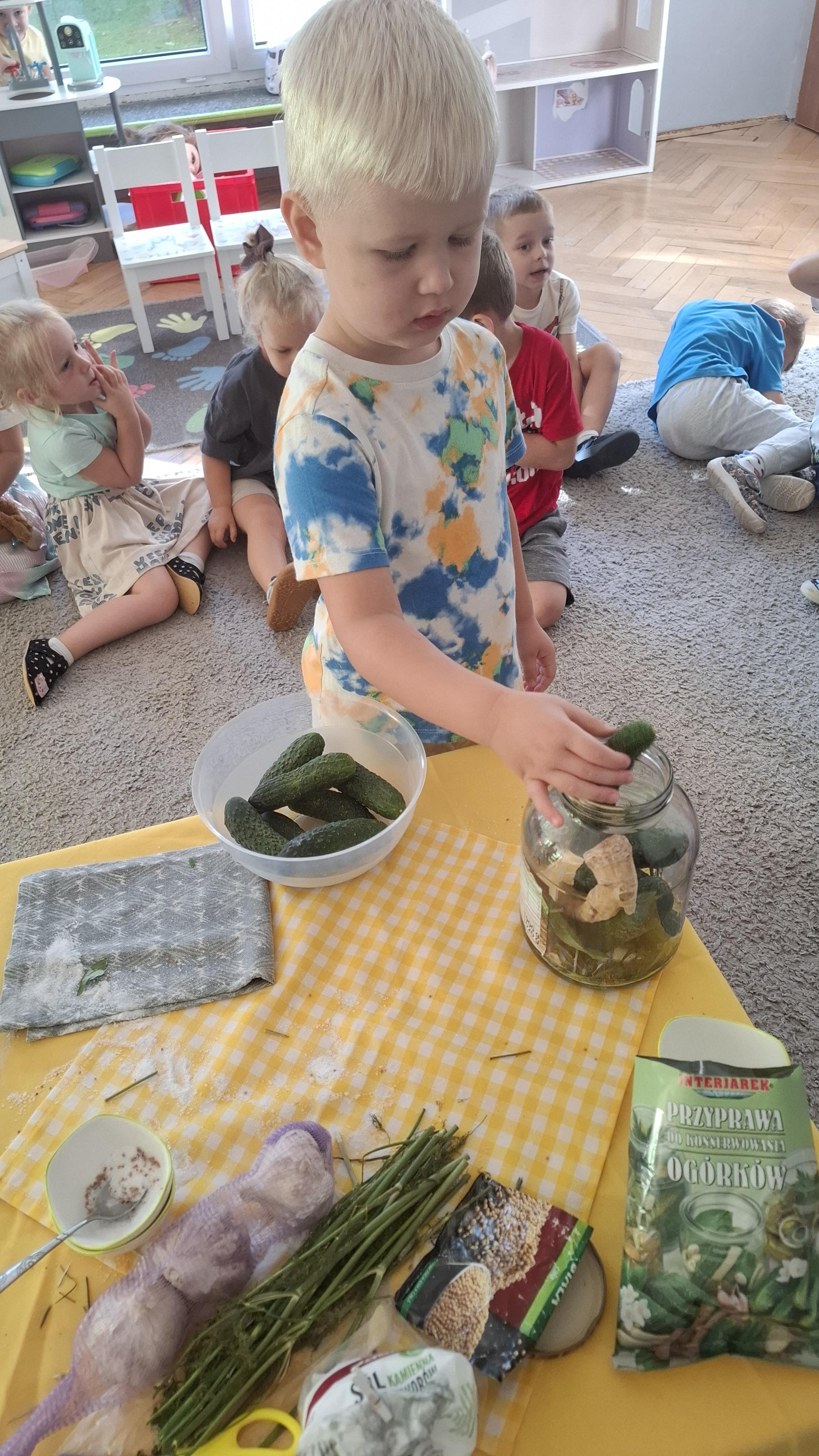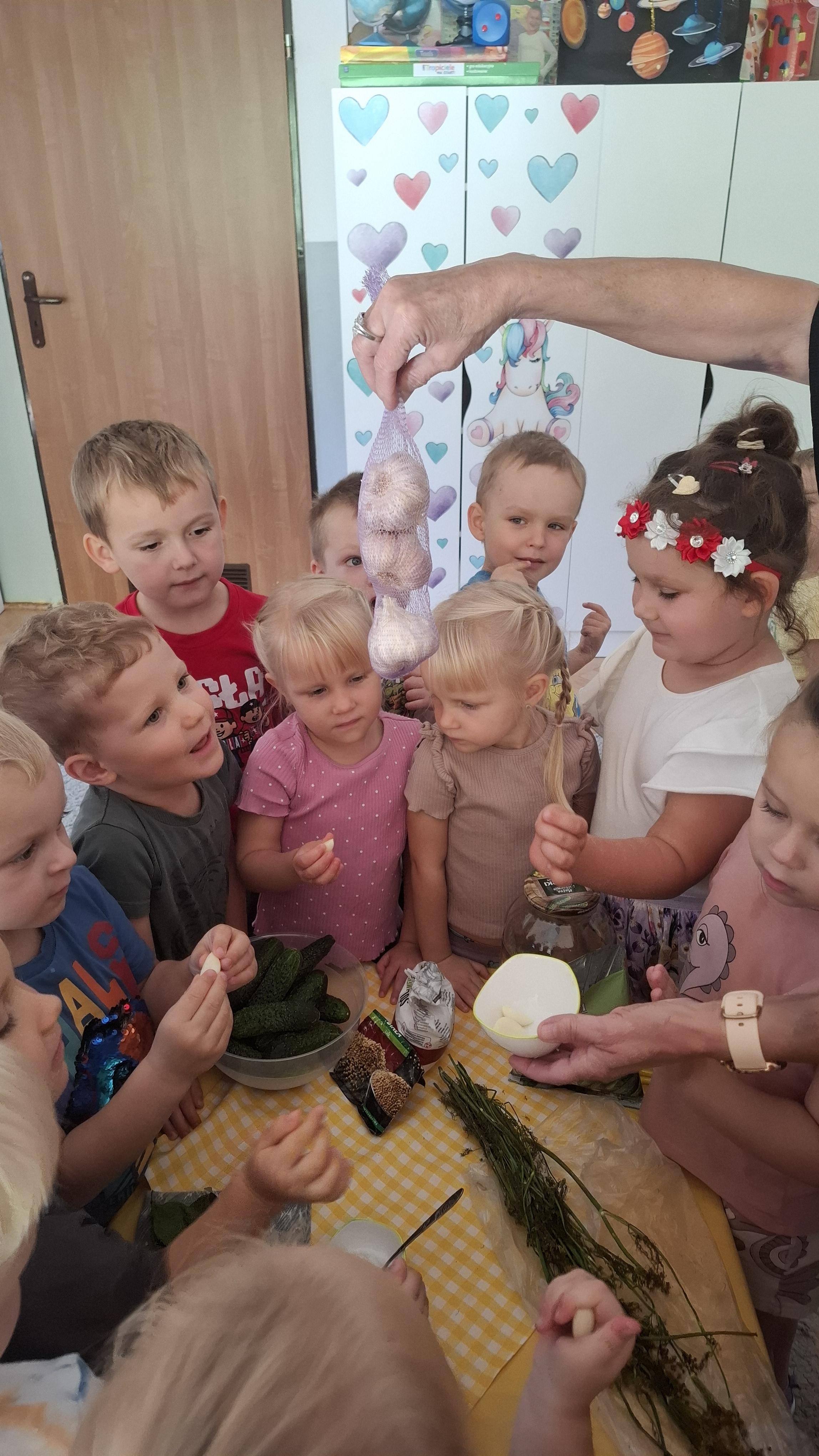 W świat tajników kiszenia warzyw wprowadziła dzieci pani Basia, która krok po kroku pokazała, jak przygotować ogórki do kiszenia. Przedszkolaki dowiedziały się, jakie składniki są potrzebne, by powstała pyszna, zdrowa i ekologiczna przekąska, a następnie samodzielnie przygotowały własny słoik z ogórkami.