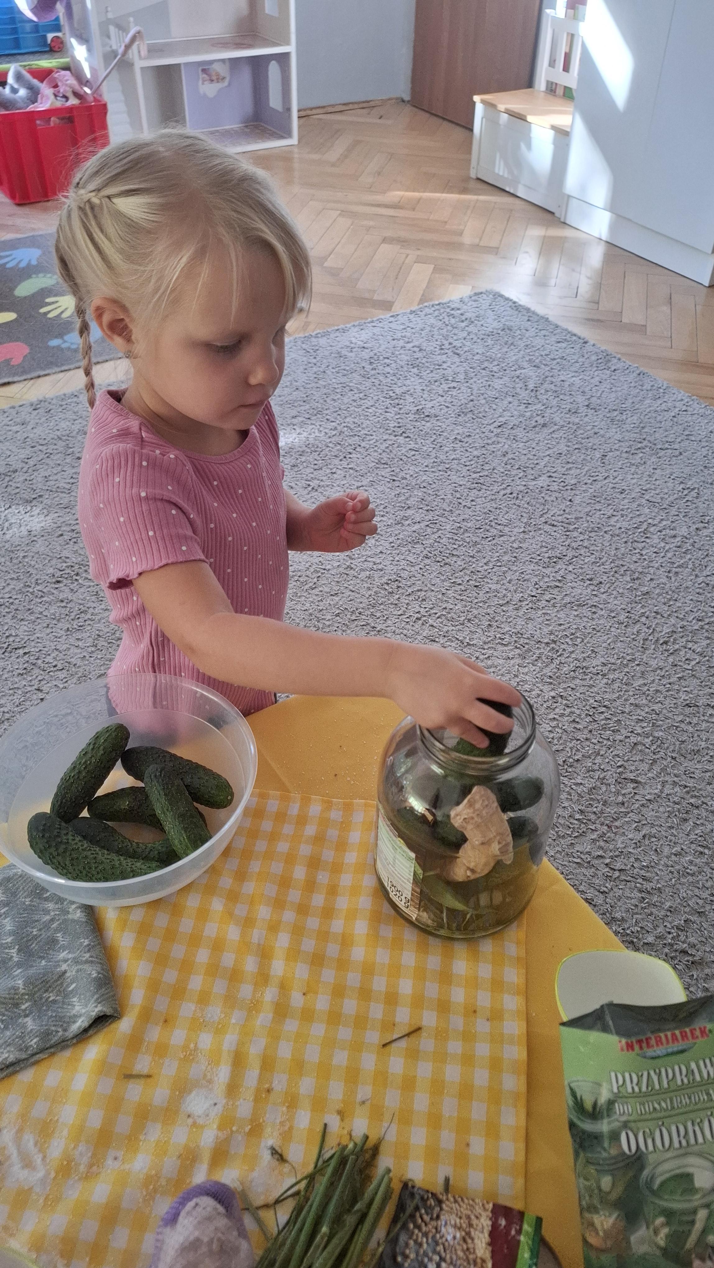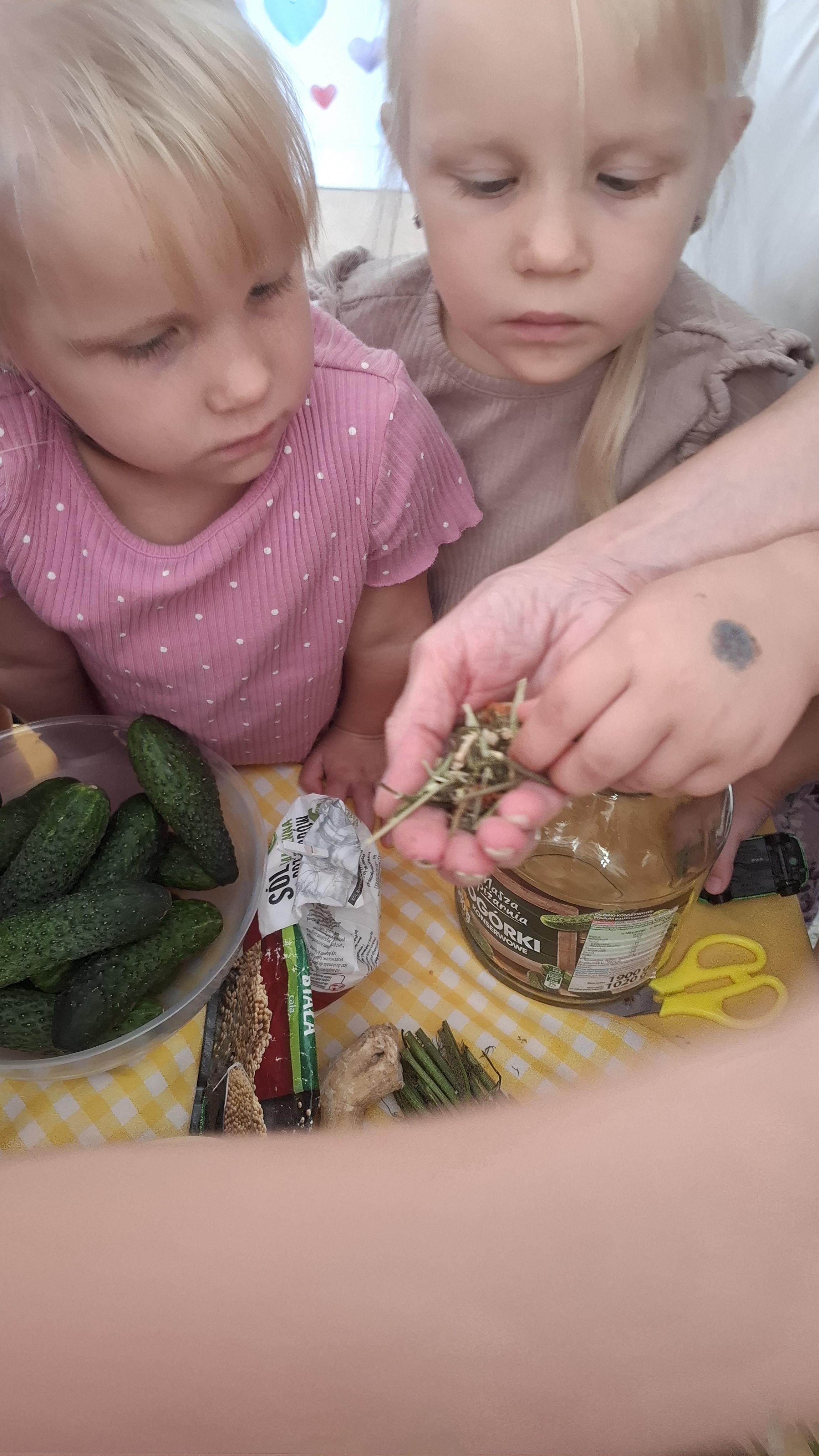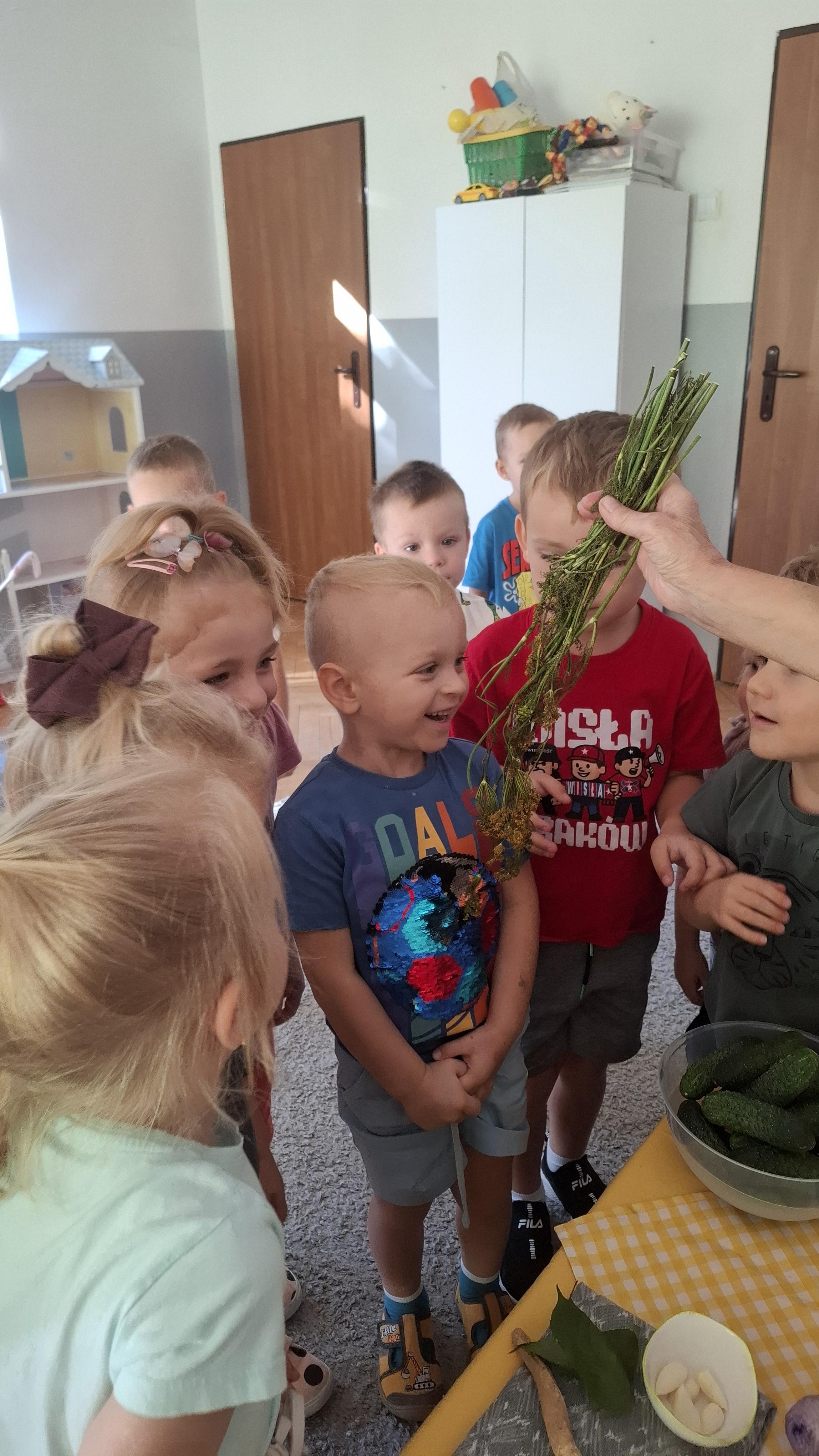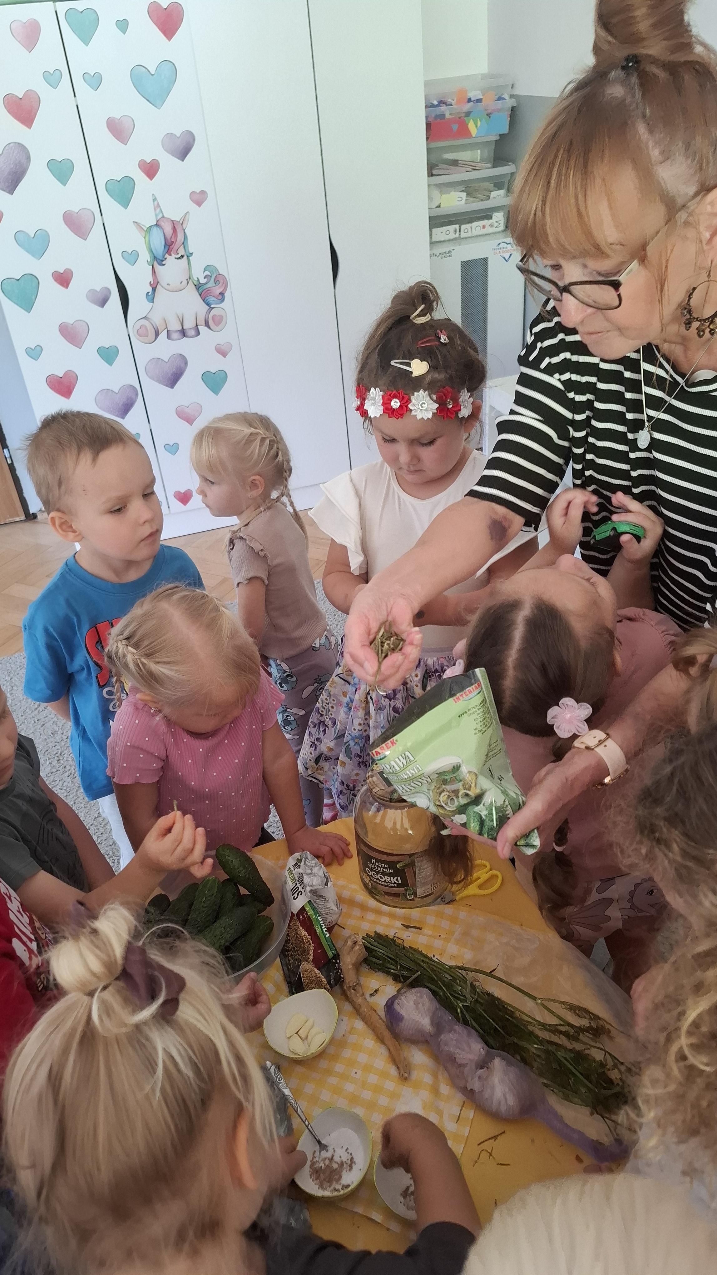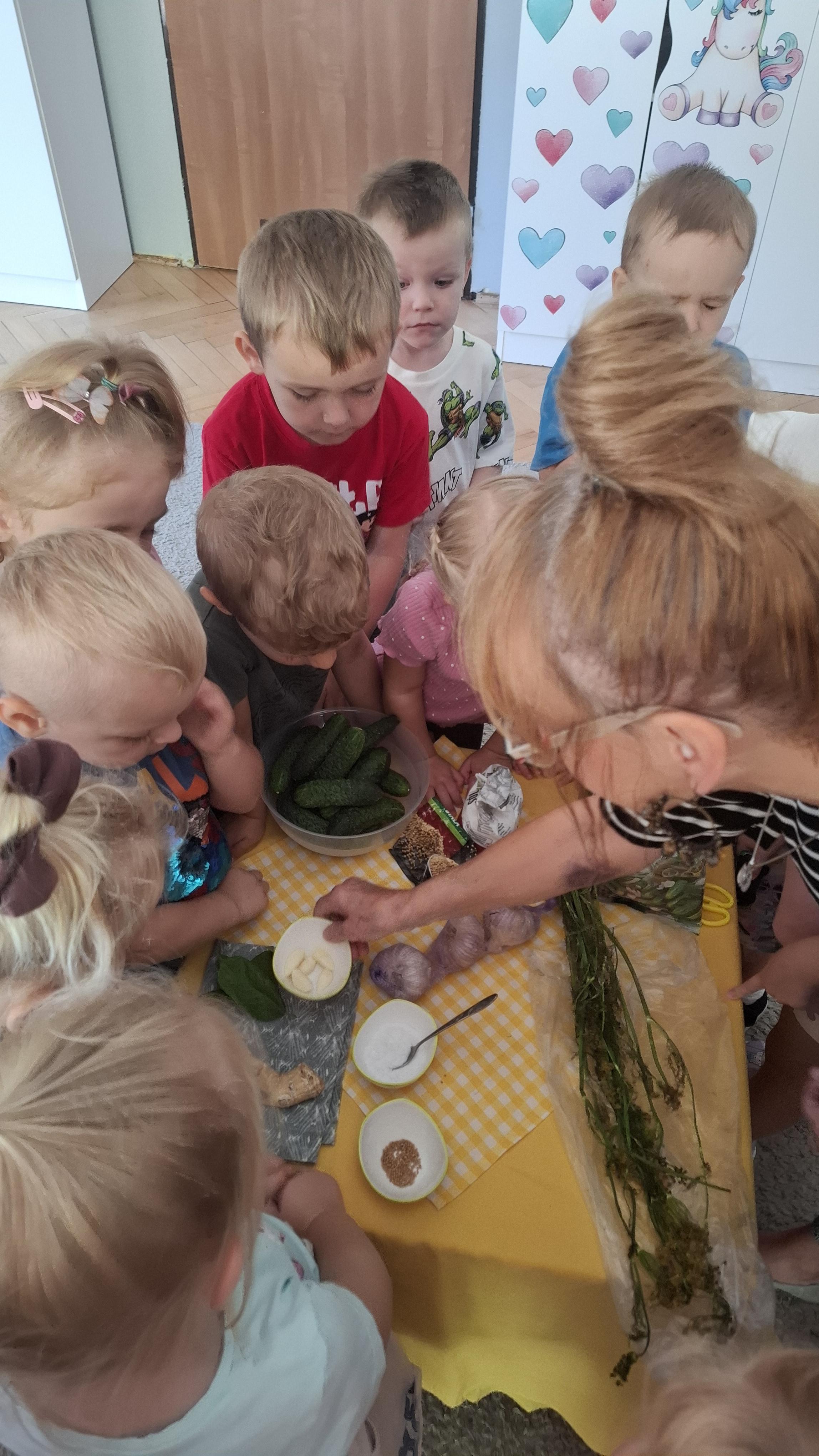 W świat tajników kiszenia warzyw wprowadziła dzieci pani Basia, która krok po kroku pokazała, jak przygotować ogórki do kiszenia. Przedszkolaki dowiedziały się, jakie składniki są potrzebne, by powstała pyszna, zdrowa i ekologiczna przekąska, a następnie samodzielnie przygotowały własny słoik z ogórkami.