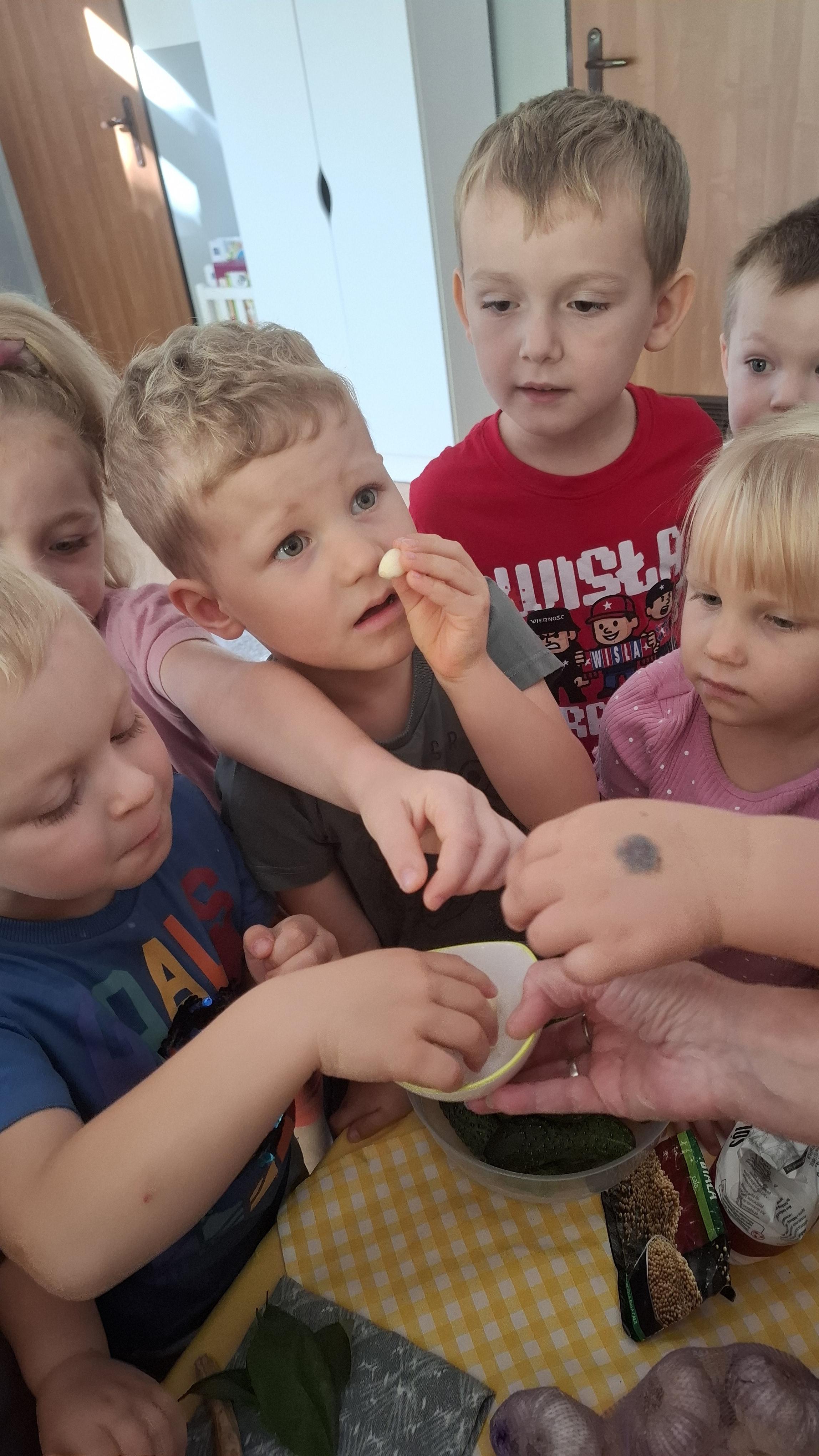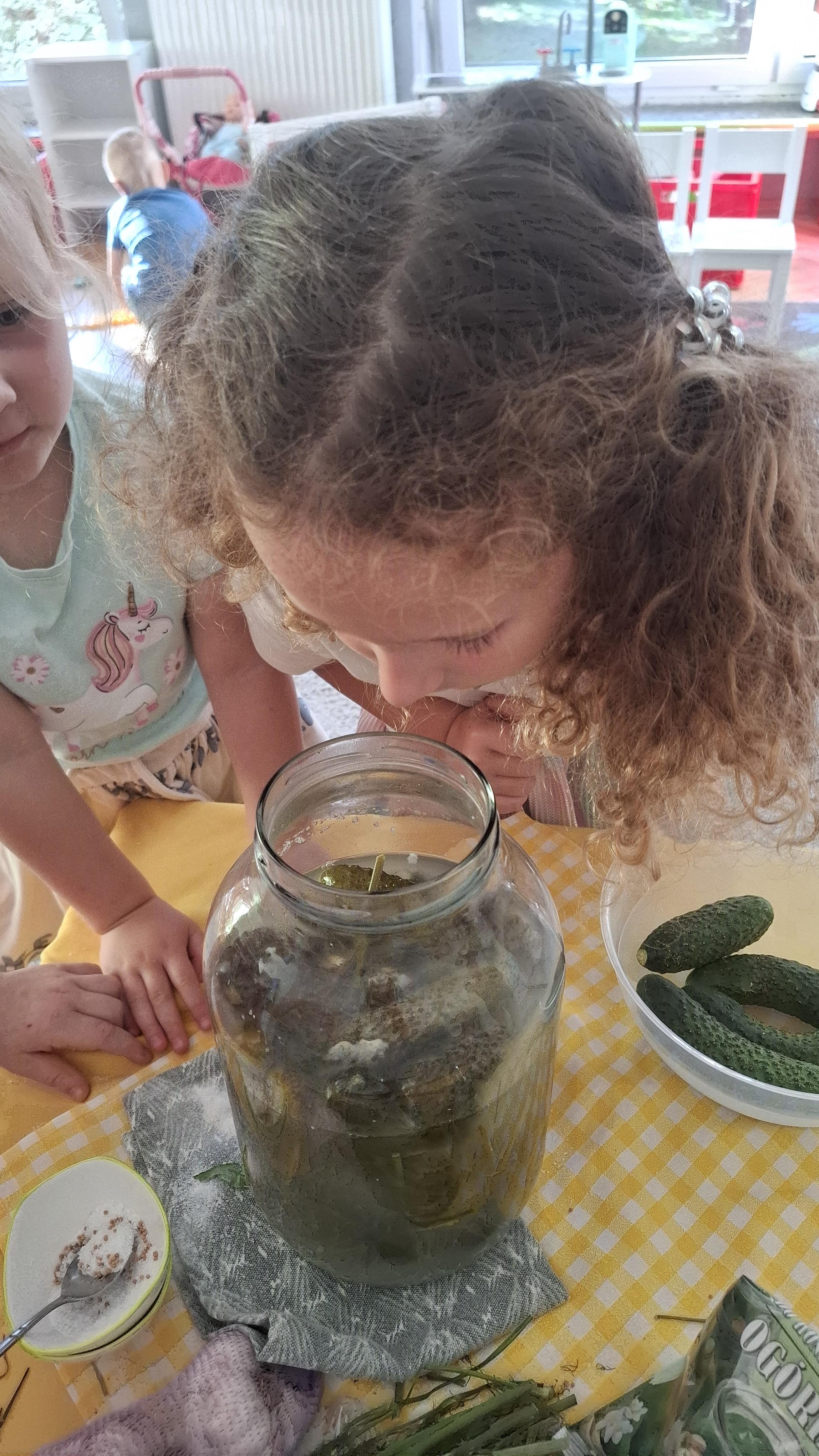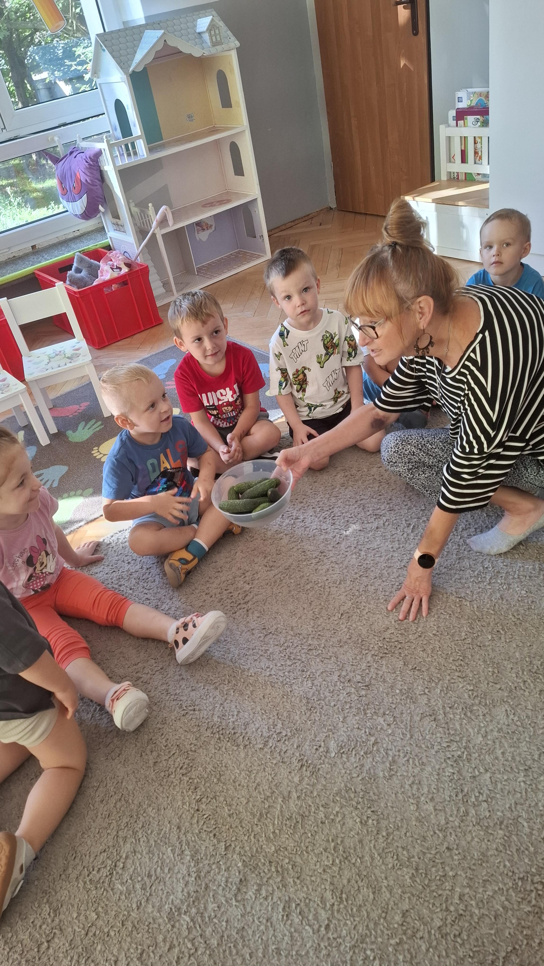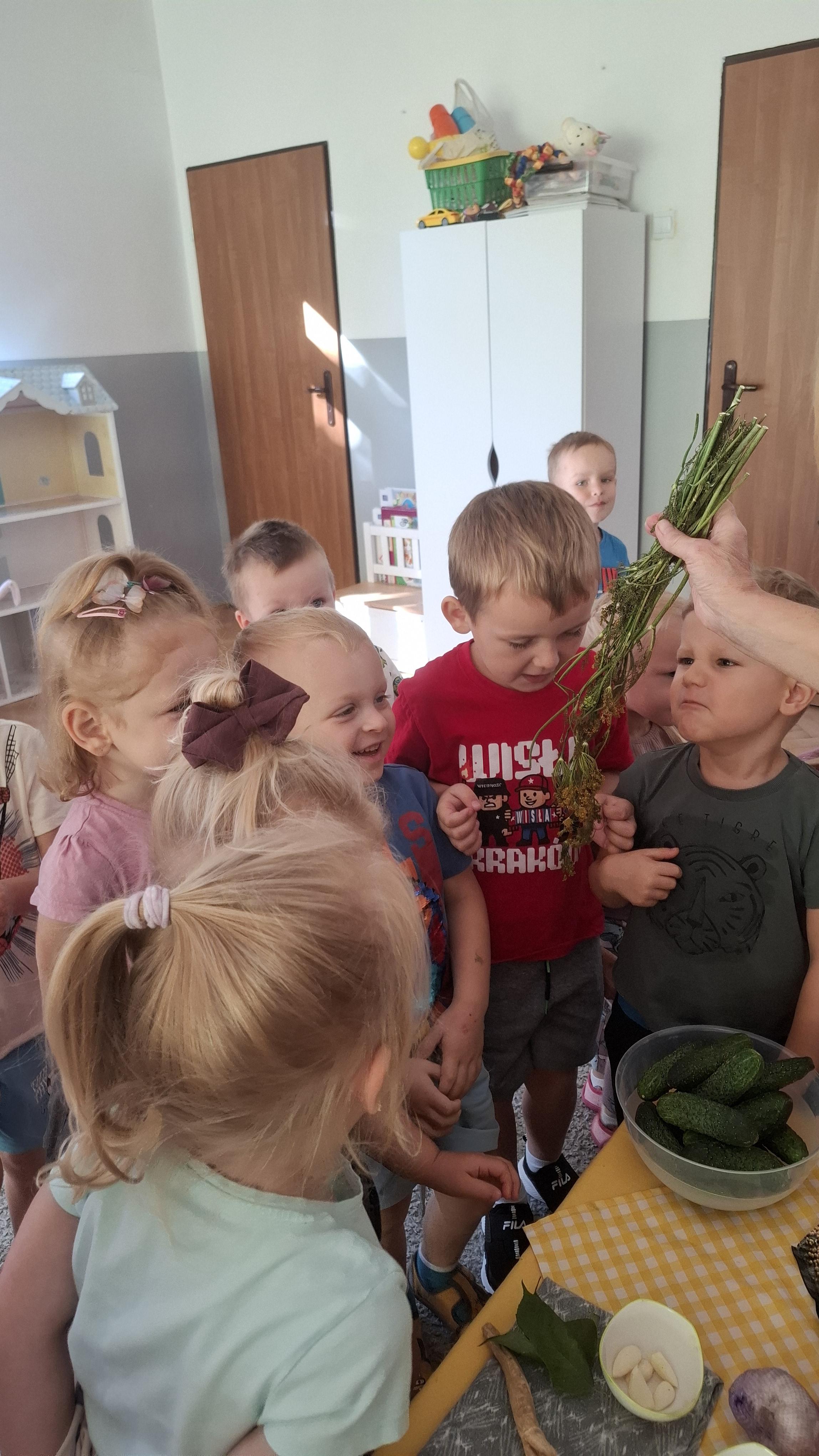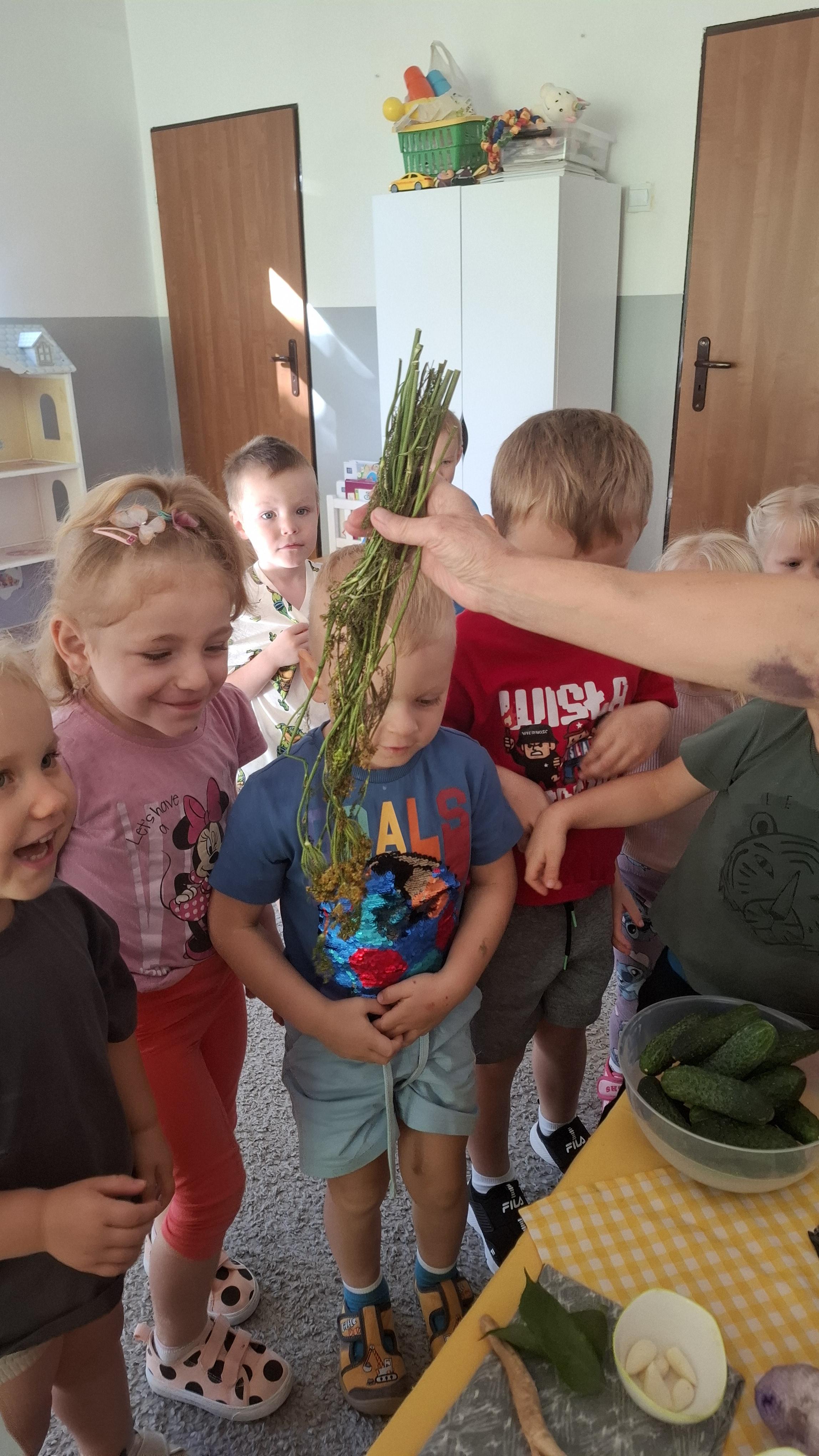 W świat tajników kiszenia warzyw wprowadziła dzieci pani Basia, która krok po kroku pokazała, jak przygotować ogórki do kiszenia. Przedszkolaki dowiedziały się, jakie składniki są potrzebne, by powstała pyszna, zdrowa i ekologiczna przekąska, a następnie samodzielnie przygotowały własny słoik z ogórkami.
