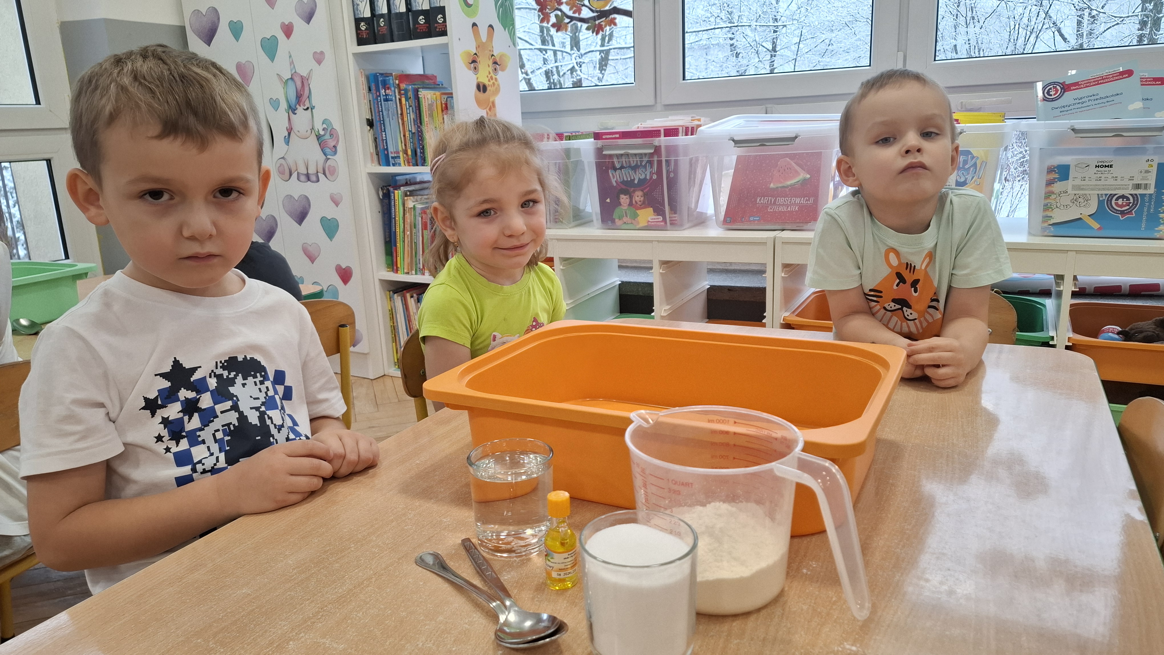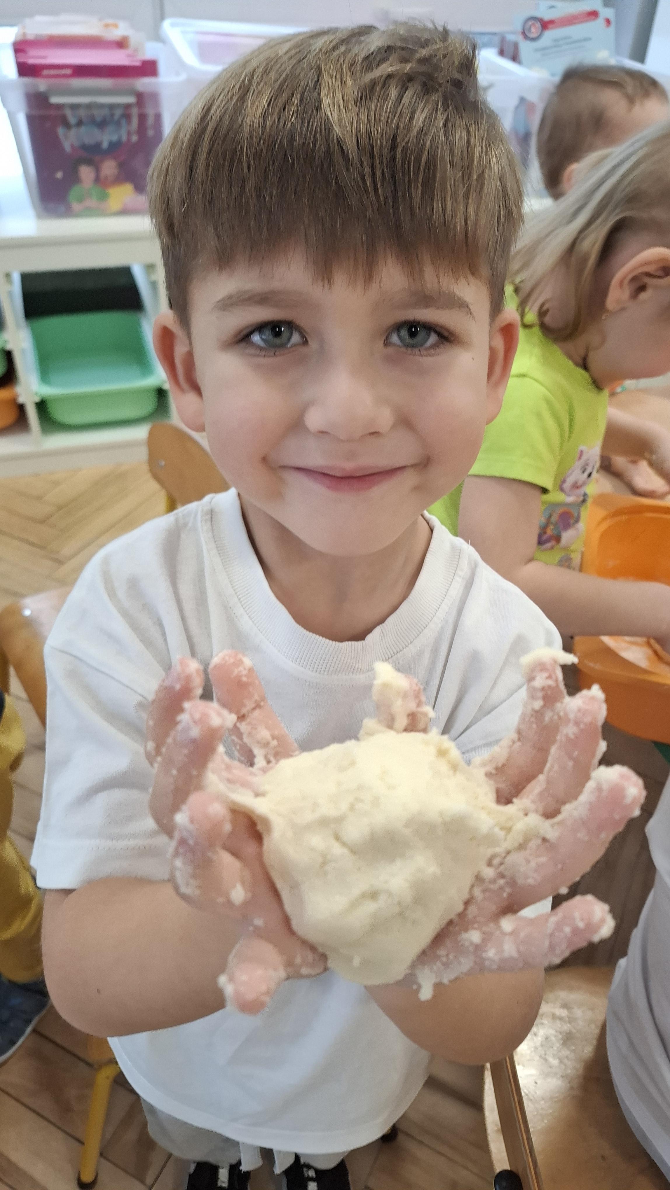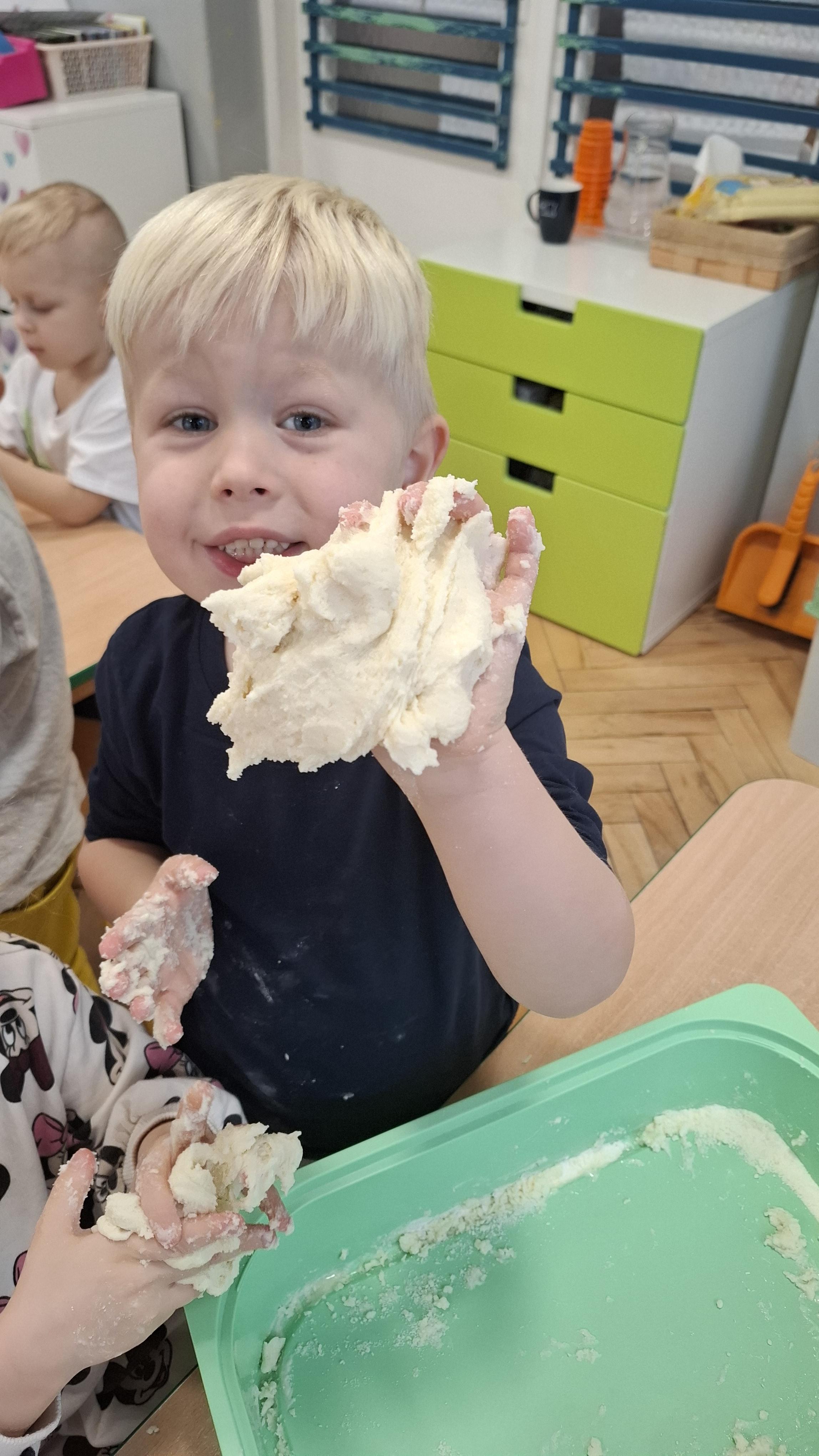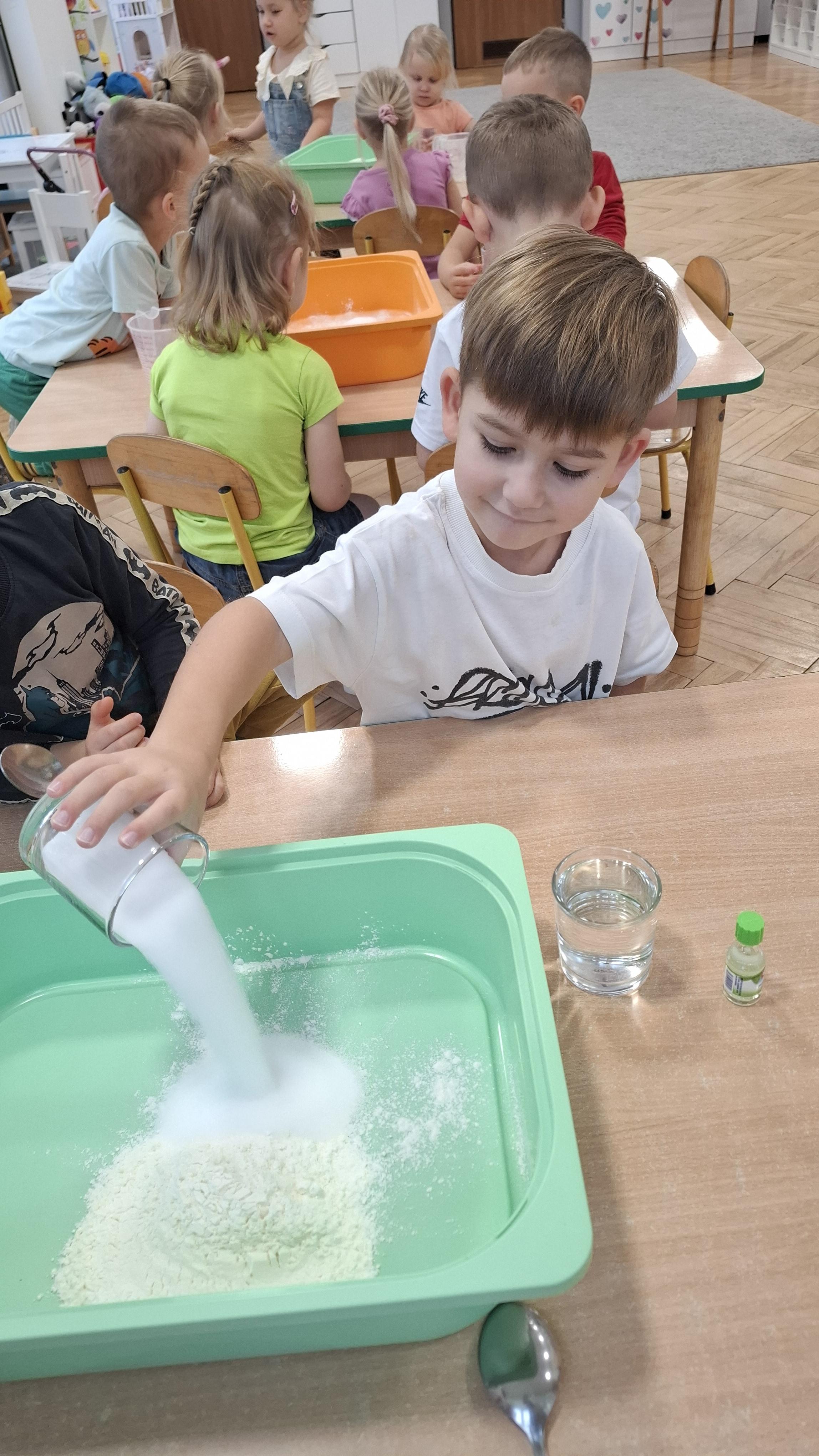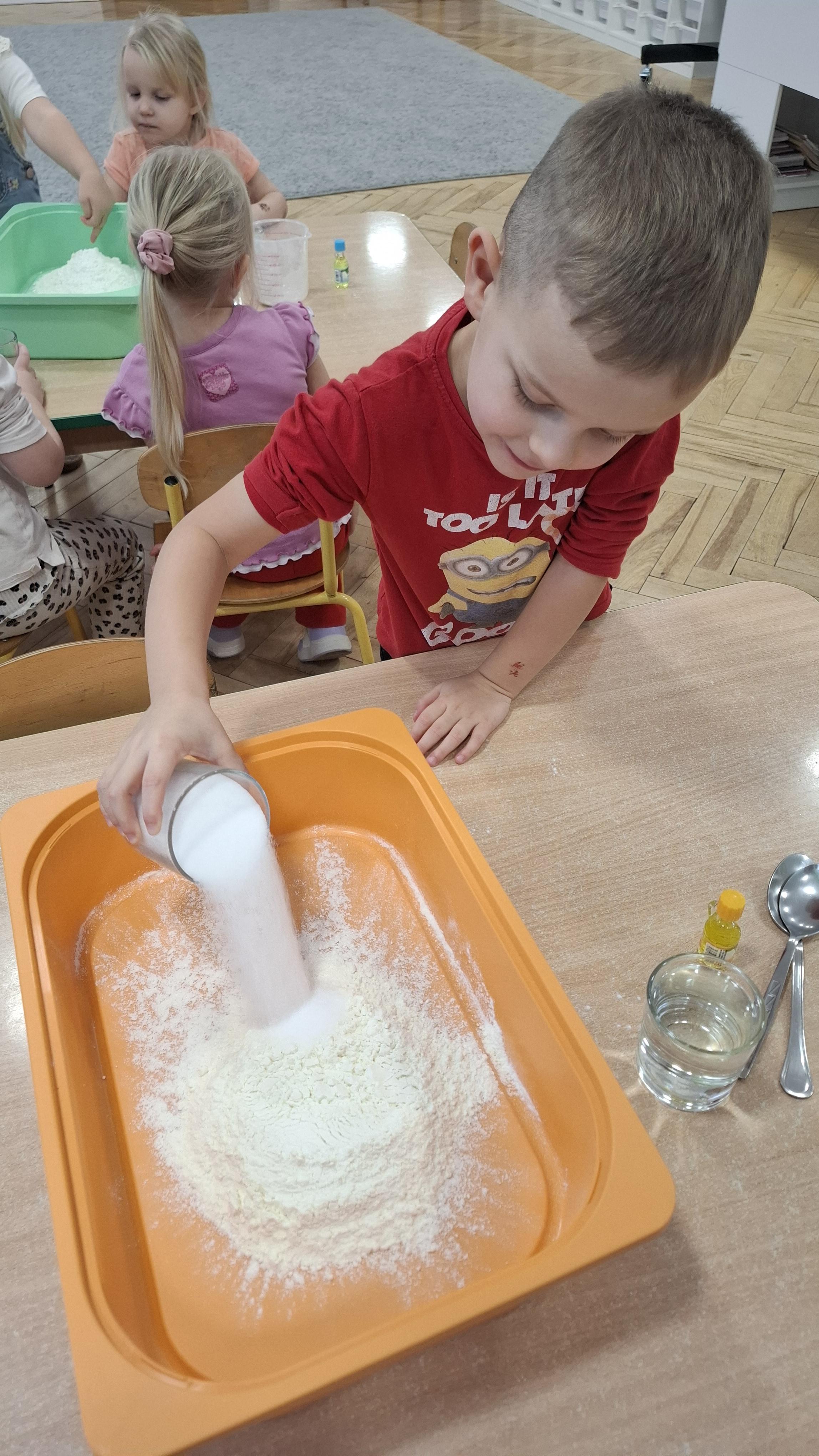 Do wykonania masy wykorzystaliśmy prosty przepis, zawierający: wodę, sól, mąkę oraz olej. Następnie dzieci wzbogacały plastelinę o aromatyczne dodatki. Wśród zastosowanych zapachów znalazły się: