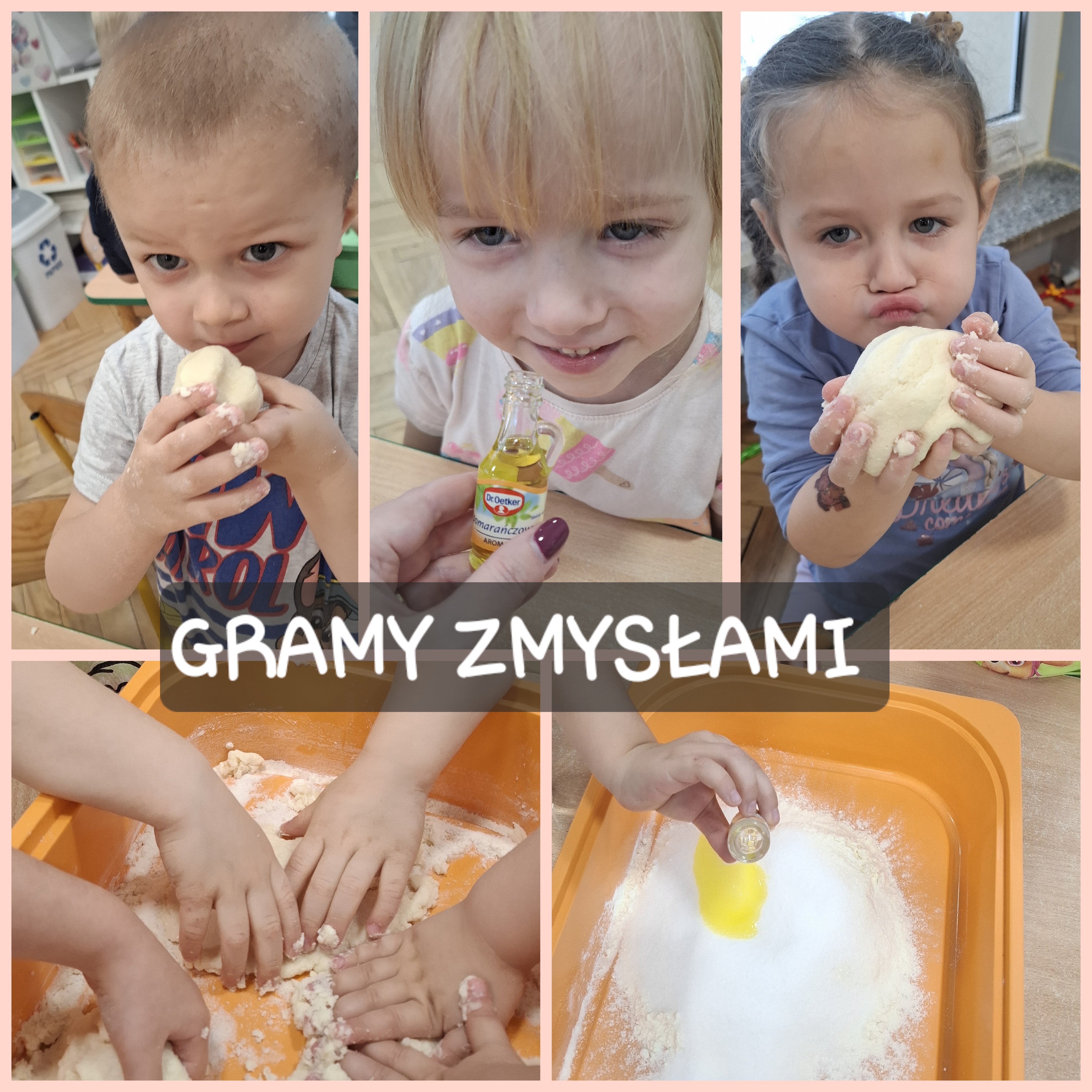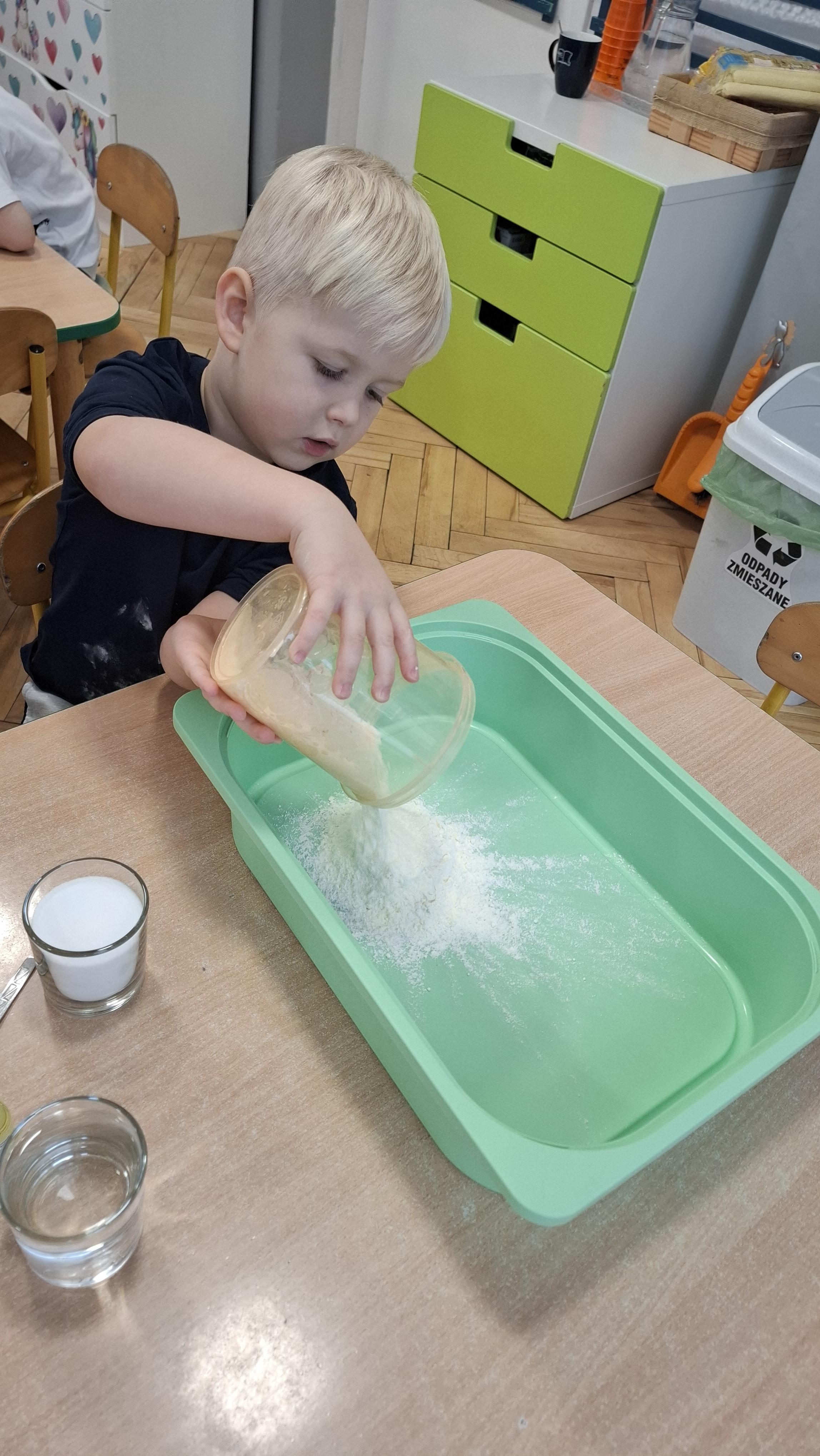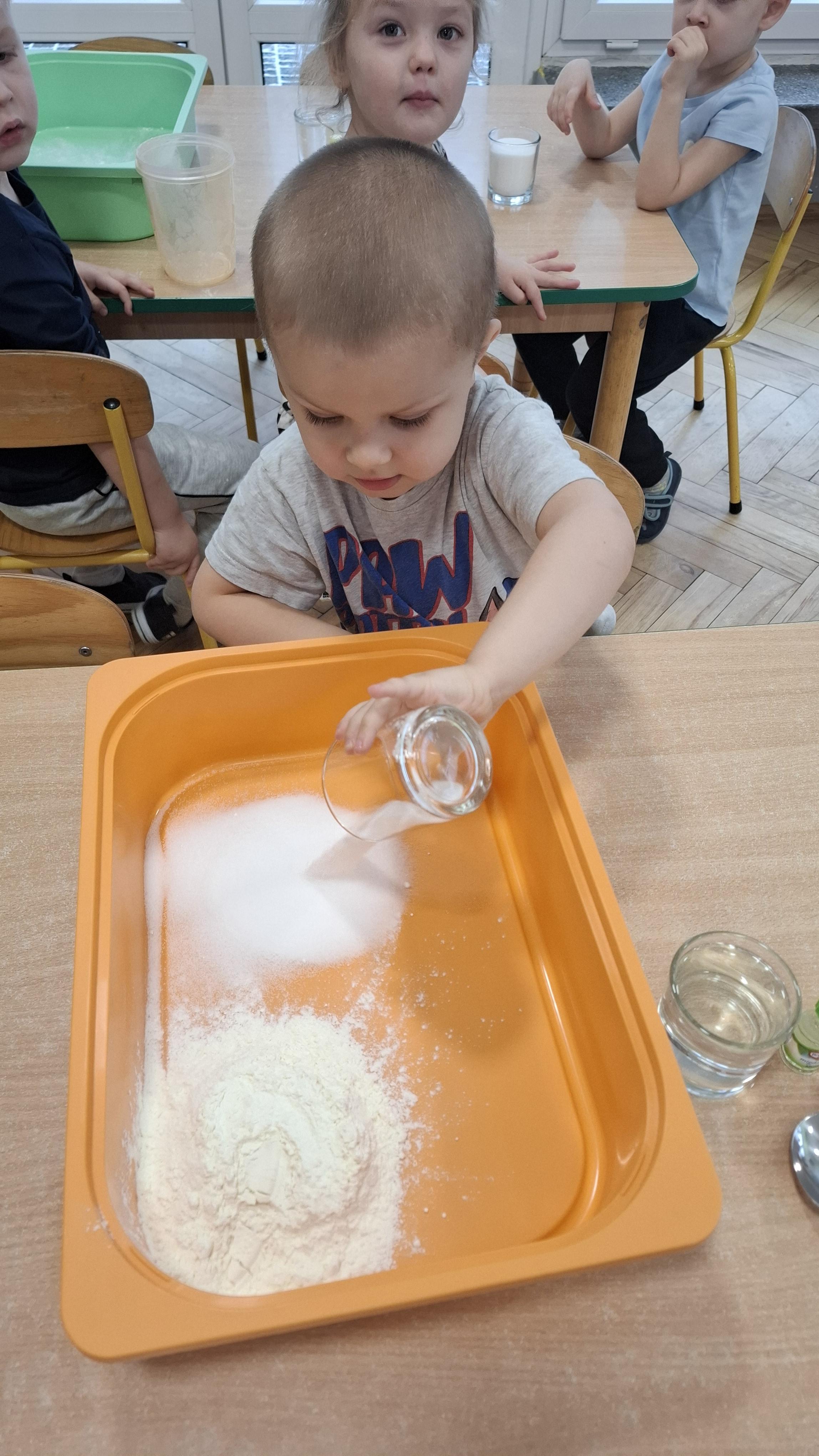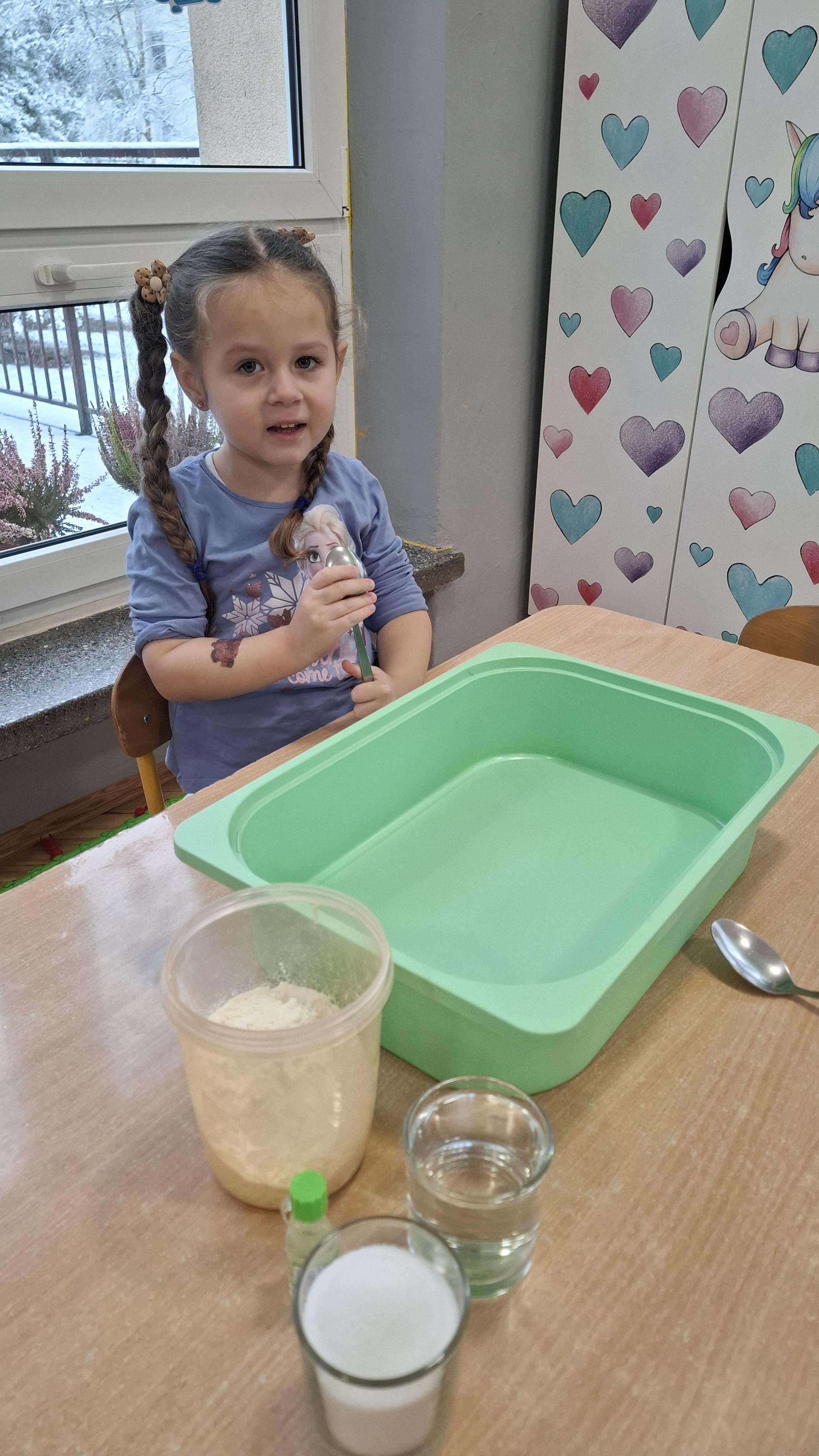 Do wykonania masy wykorzystaliśmy prosty przepis, zawierający: wodę, sól, mąkę oraz olej. Następnie dzieci wzbogacały plastelinę o aromatyczne dodatki. Wśród zastosowanych zapachów znalazły się: