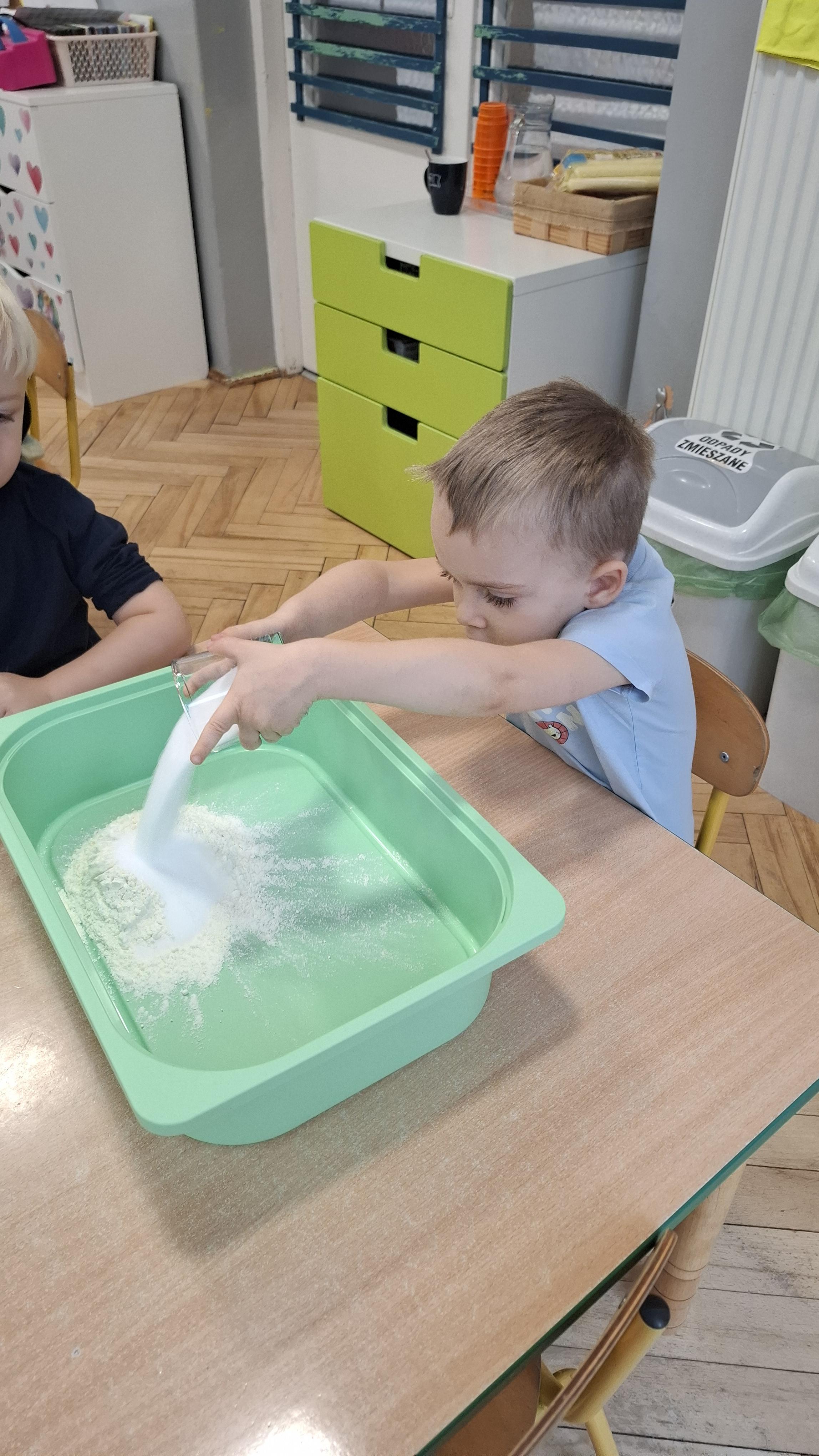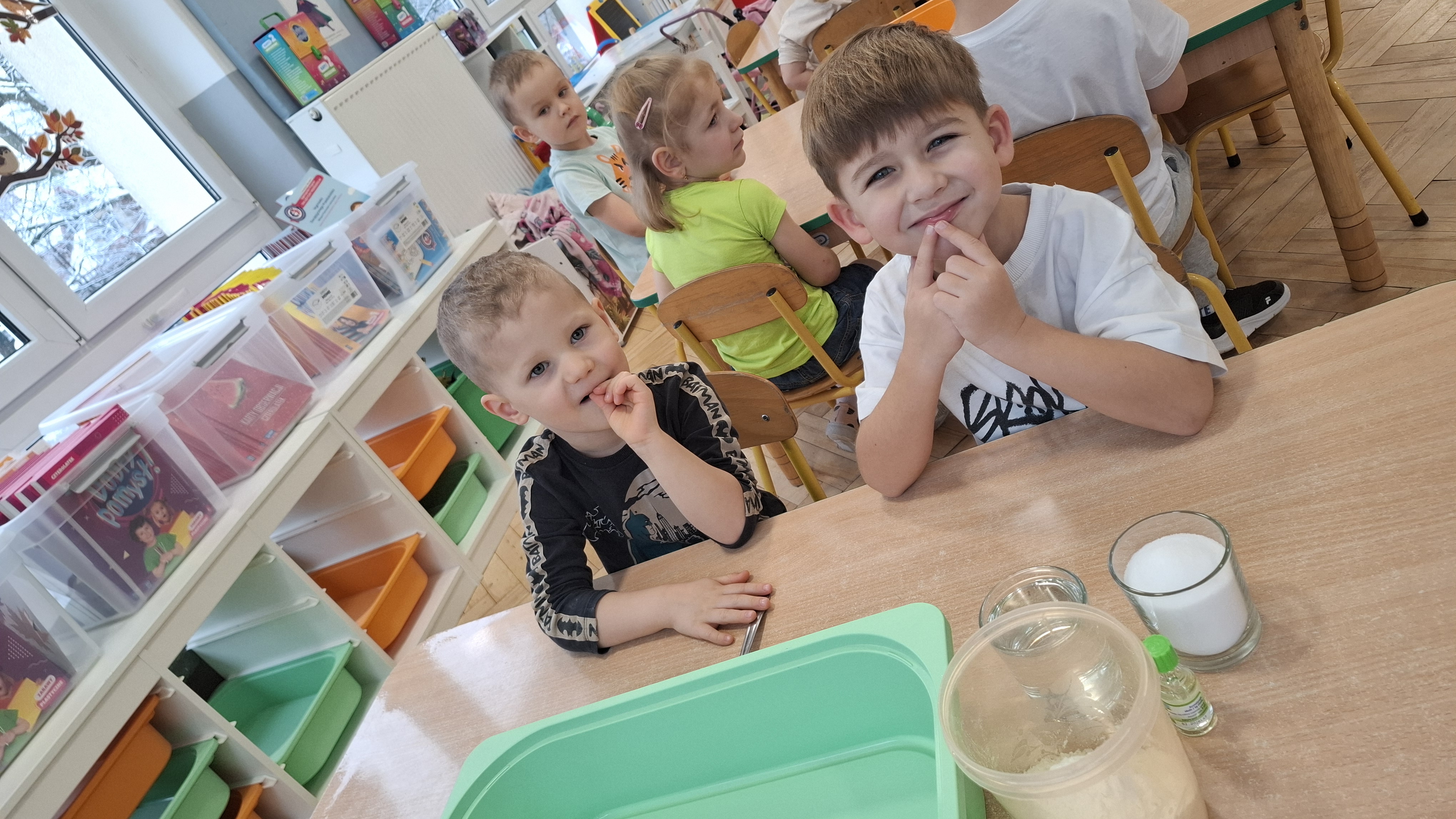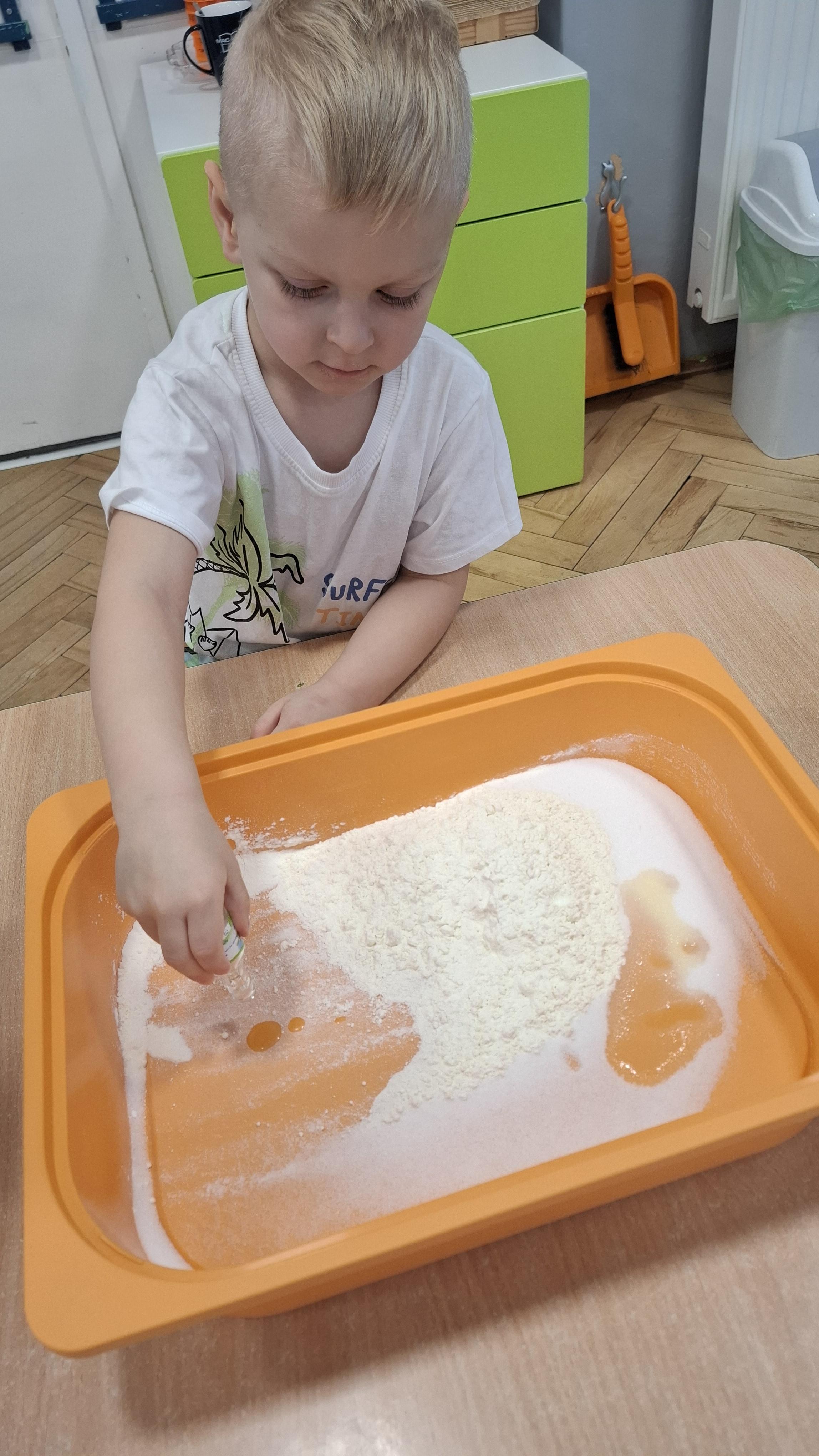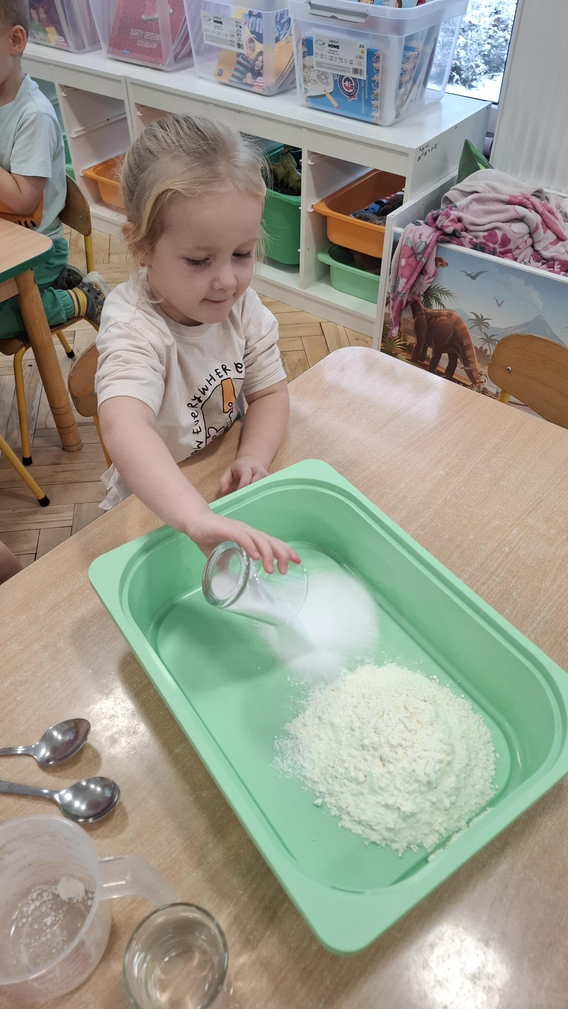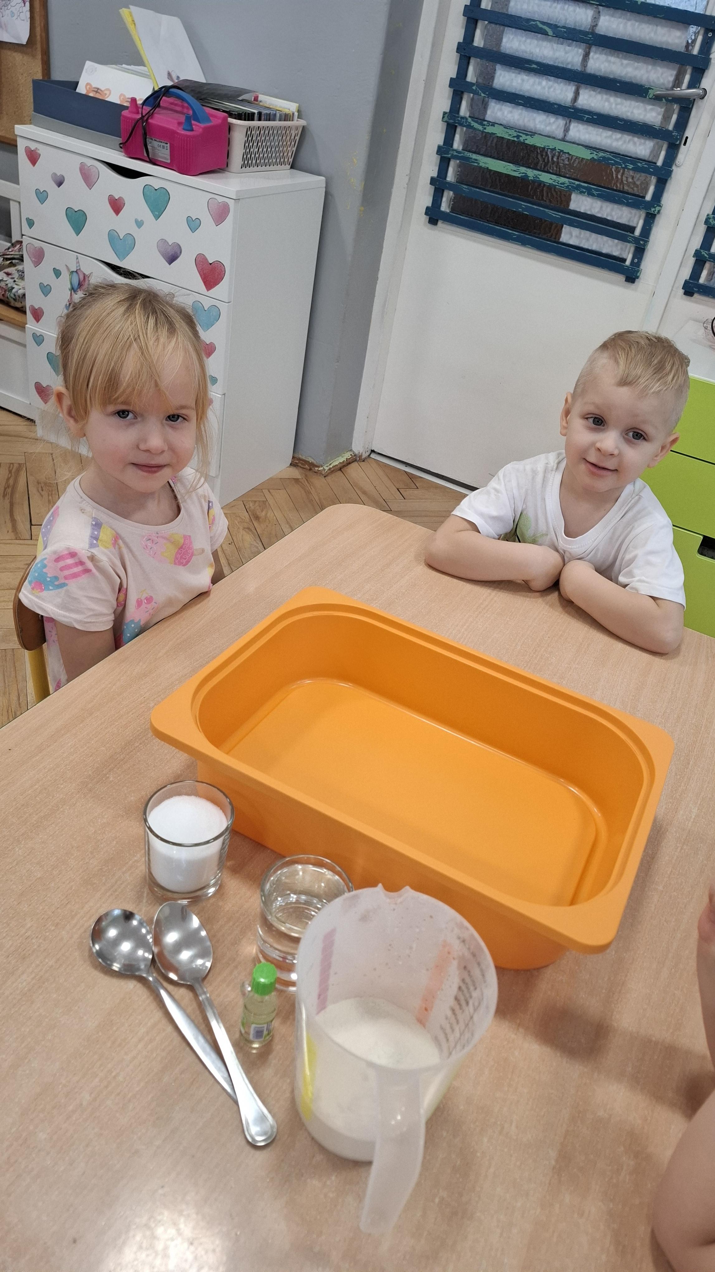 Do wykonania masy wykorzystaliśmy prosty przepis, zawierający: wodę, sól, mąkę oraz olej. Następnie dzieci wzbogacały plastelinę o aromatyczne dodatki. Wśród zastosowanych zapachów znalazły się: