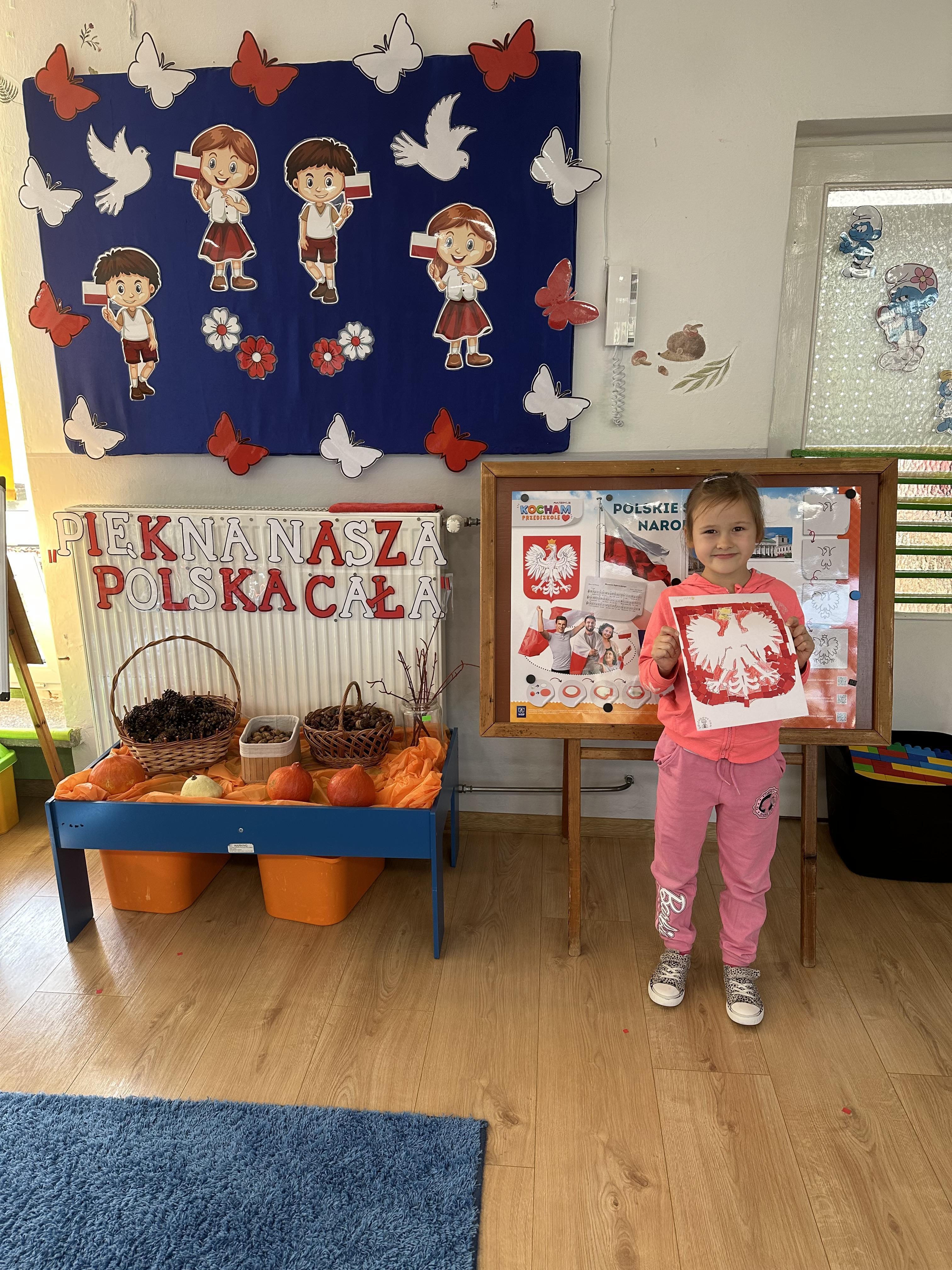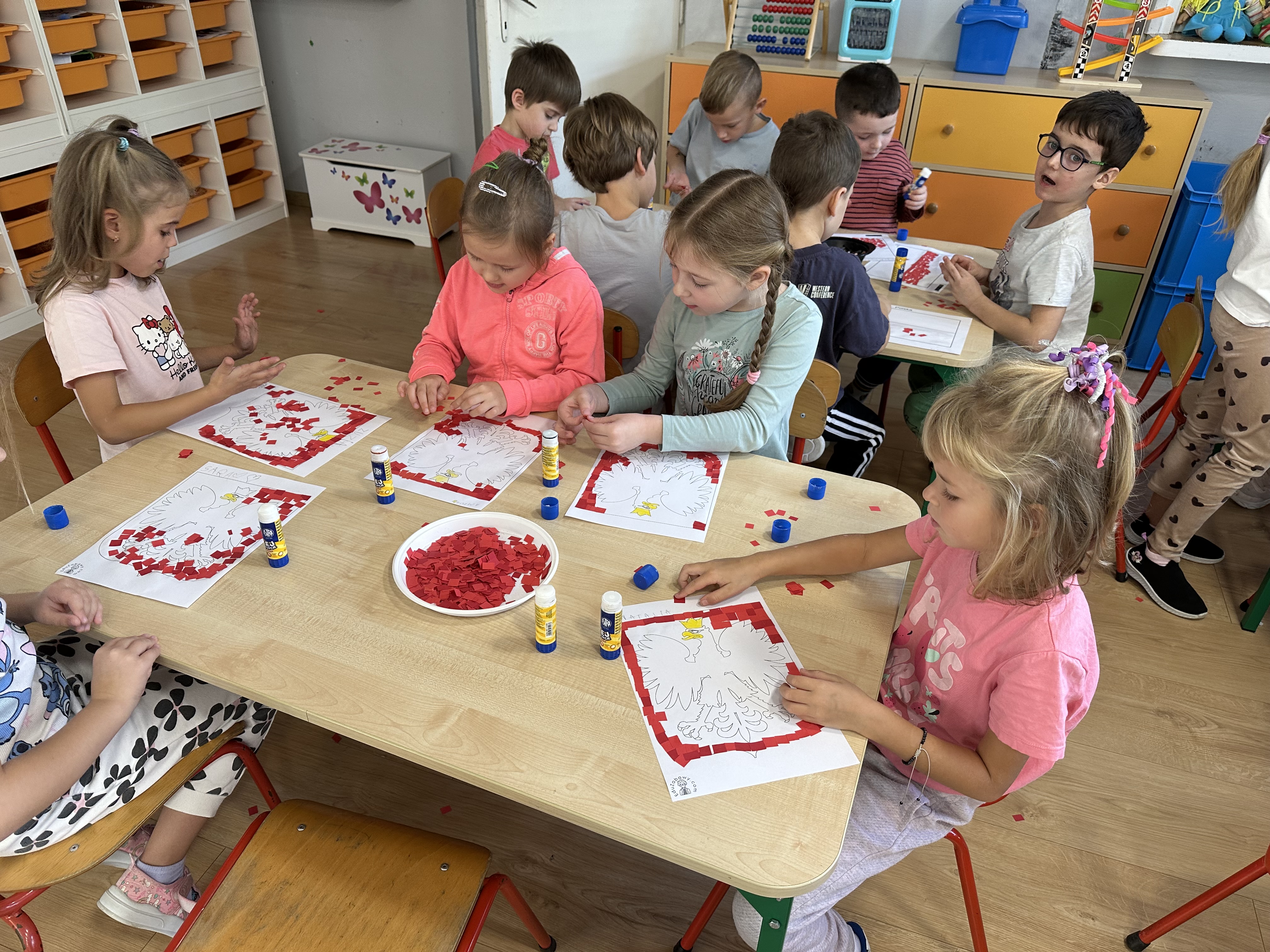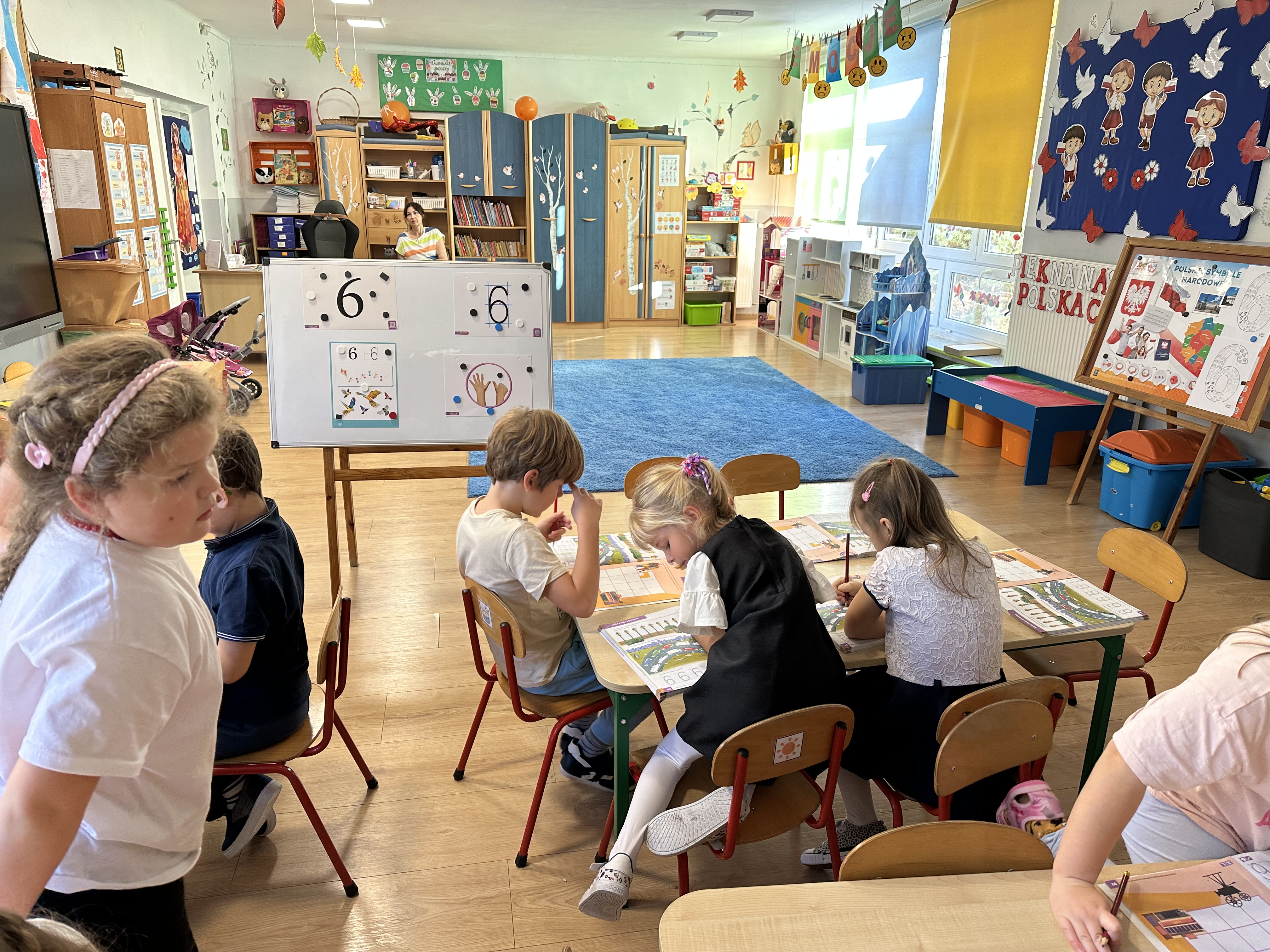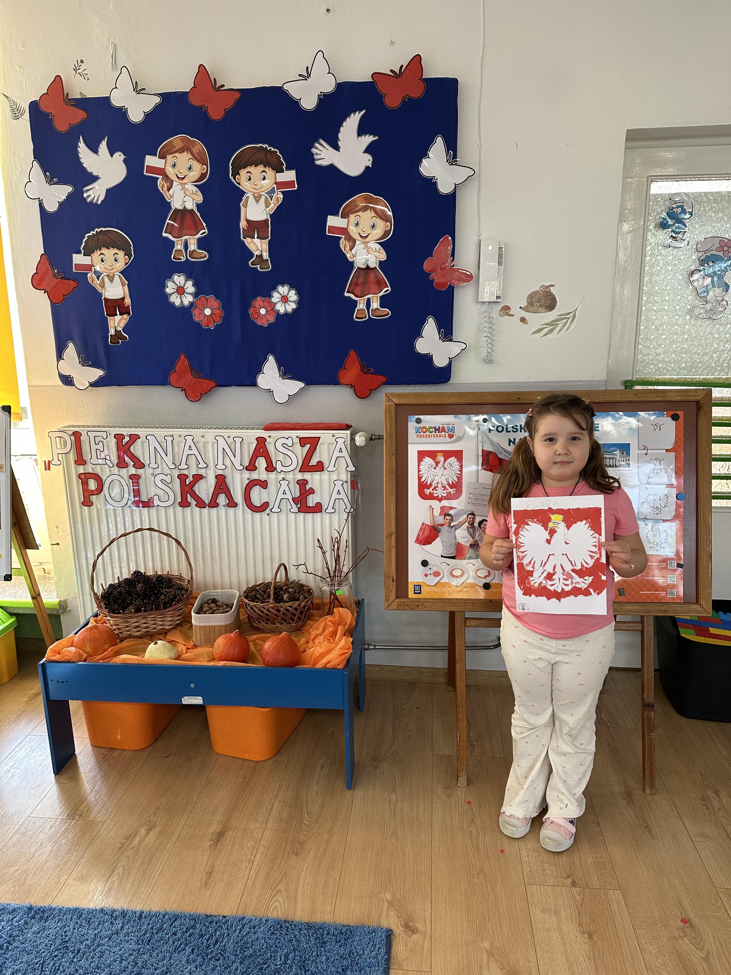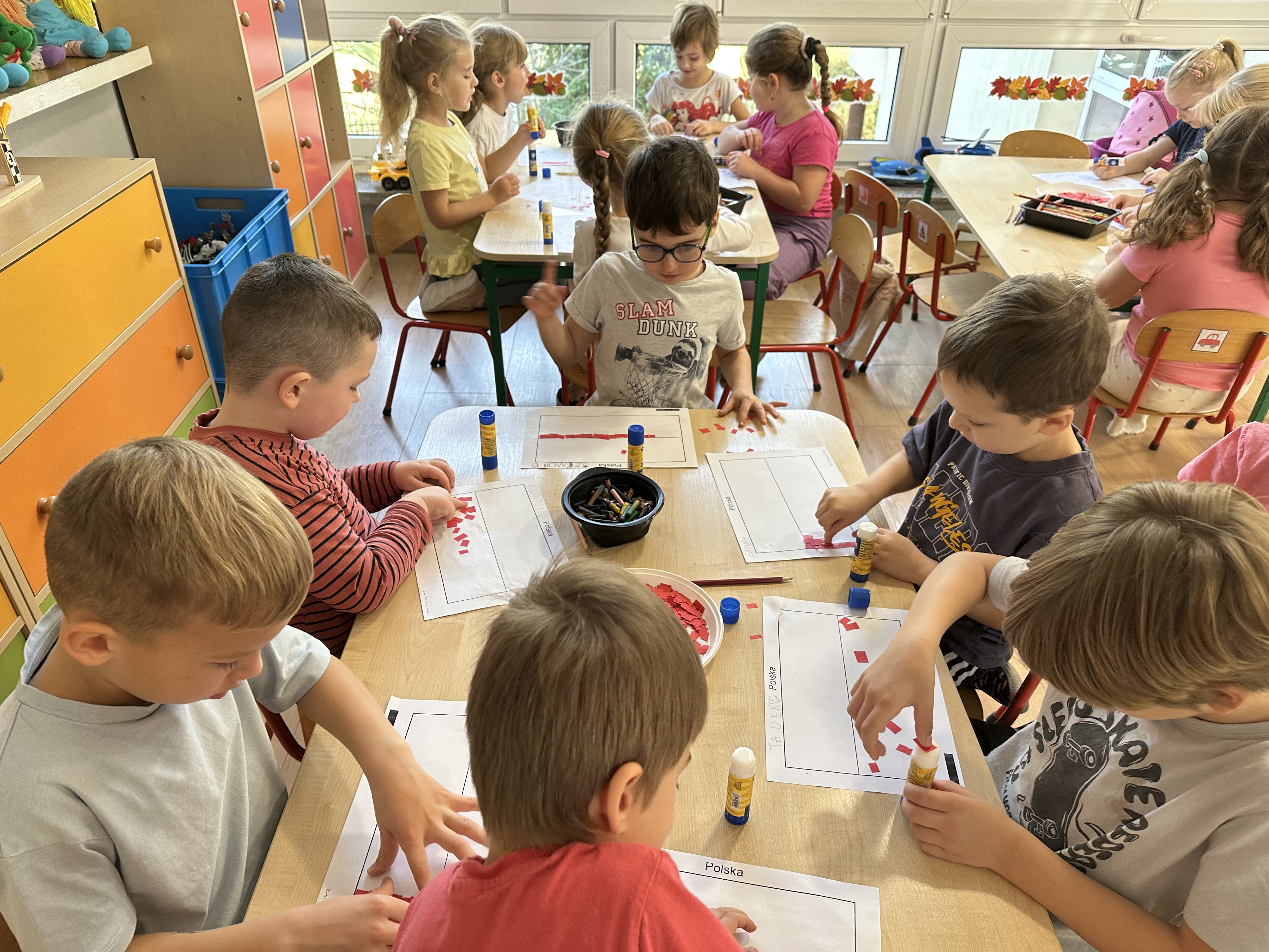 W poniedziałek dzieci wykonywały ćwiczenia rozciągające i rozluźniające oraz rozwijały małe partie mięśniowe. Opowiadanie Marii Pawlisz ,,Polska to nasz dom” stanowiło punkt wyjścia do wspólnej rozmowy o świętach państwowych. Dzieci zastanawiały się, w jaki sposób można dbać o nasz kraj i co robić, aby być przykładnym Polakiem. Kształtowały tym samym świadomość społeczną i obywatelską. Podczas zabaw: „Polskie święta narodowe”, „Świętujemy”, „Co świętujemy?” dzieci poznały, jakie święta obchodzimy w kraju i wyjaśniły, czym się różnią święta narodowe od pozostałych. Uczyły się współpracy i się integrowały. W zabawach przy stolikach kształtowały umiejętność rozszyfrowywania emocji i wyjaśniania ich przyczyn. Pod koniec dnia w trakcie zabawy „Święto narodowe czy rodzinne?” podsumowały wszystkie wiadomości. We wtorek po wysłuchaniu wiersza ,,Dzieciom” Antoniego Słomińskiego przedszkolaki zastanawiały się, jak mogą przysłużyć się innym ludziom oraz poznały nowy frazeologizm ,,wolny jak ptak”. W dalszej części dnia poszerzały wiedzę językową, nauczyły się wielkiej i małej litery D, d, dokonywały analizy i syntezy słuchowej słowa ,,dom”, wyróżniały głoskę d w nagłosie i rysowały literę w powietrzu palcem wskazującym. Dzieci wyszły również na dwór, aby pobawić się ruchowo na świeżym powietrzu. Podczas zabaw: „Na stacji D”, „Ułóż małe d” i „Szybka reakcja” utrwalały znajomość nowo poznanej litery. W środę po wprowadzającej do tematu dnia zabawie „W mieście” zapoznały się z liczbą 6. W trakcie zabaw: „Jedziemy tramwajem”, „W tramwaju”, „O jedno więcej” i „Jak wygląda szóstka?” rozwijały swoje kompetencje matematyczne, uczyły się przeliczania do 6, poznały obraz graficzny 6 i układały go z kartoników. Podczas zabaw posługiwały się liczbą 6 w aspekcie kardynalnym, porządkowym i miarowym. Rozwijały małą motorykę podczas lepienia cyfry 6 z plasteliny. Przy stolikach kształtowały umiejętność kodowania. Zakończyły dzień wykonaniem pracy plastycznej. Czwartek poświęcony był kształtowaniu umiejętności podawania nazw zwierząt gospodarskich i ich młodych w czasie zabawy „Zwierzęta i ich młode” (wraz z głoskowaniem). W trakcie zabaw „Na wsi i w okolicy” i „Wyprawa na wieś” dzieci zapoznały się z wiejskim krajobrazem oraz ćwiczyły pamięć wzrokową i spostrzegawczość. W tym dniu pobudzały ciekawość przyrodniczą, dzieliły się swoimi skojarzeniami związanymi z wsią i rozszyfrowywały odgłosy wiejskich zwierząt w odpowiedniej kolejności. W piątek dzieci podczas zabawy „Podobne czy różne?” sprawdzały, ile zapamiętały z wcześniejszych zajęć i czy dostrzegają różnice pomiędzy świętami narodowymi a innymi. Po zabawie „O co chodzi w hymnie?” potrafiły wyjaśnić znaczenie słów w polskim hymnie narodowym oraz to, w jakich okolicznościach powstał, przypomniały sobie jego słowa i wysłuchały wspólnie melodii hymnu. Zakończyły dzień wspólnym odśpiewaniem hymnu i nauczeniem się kolejnych jego zwrotek.