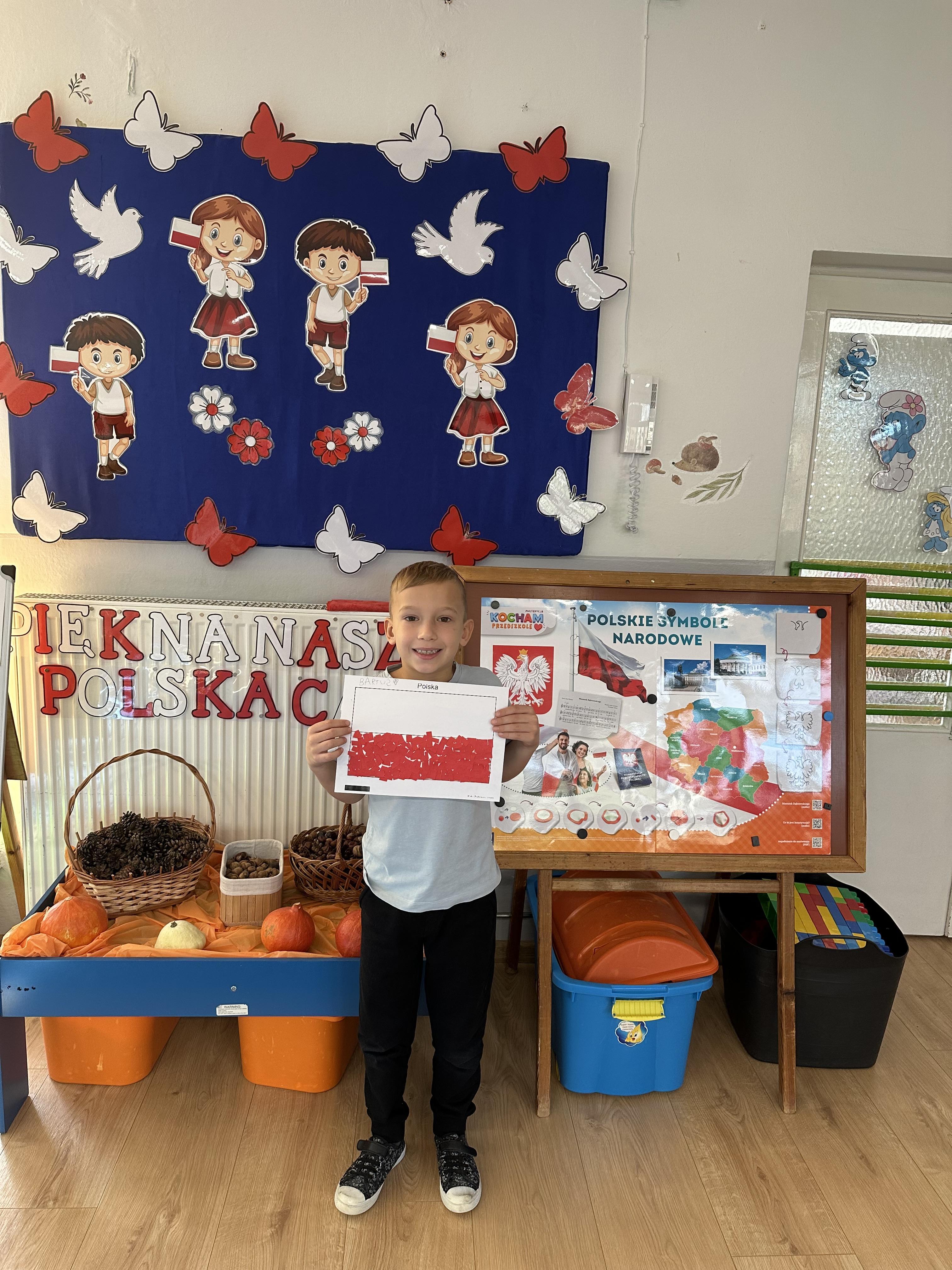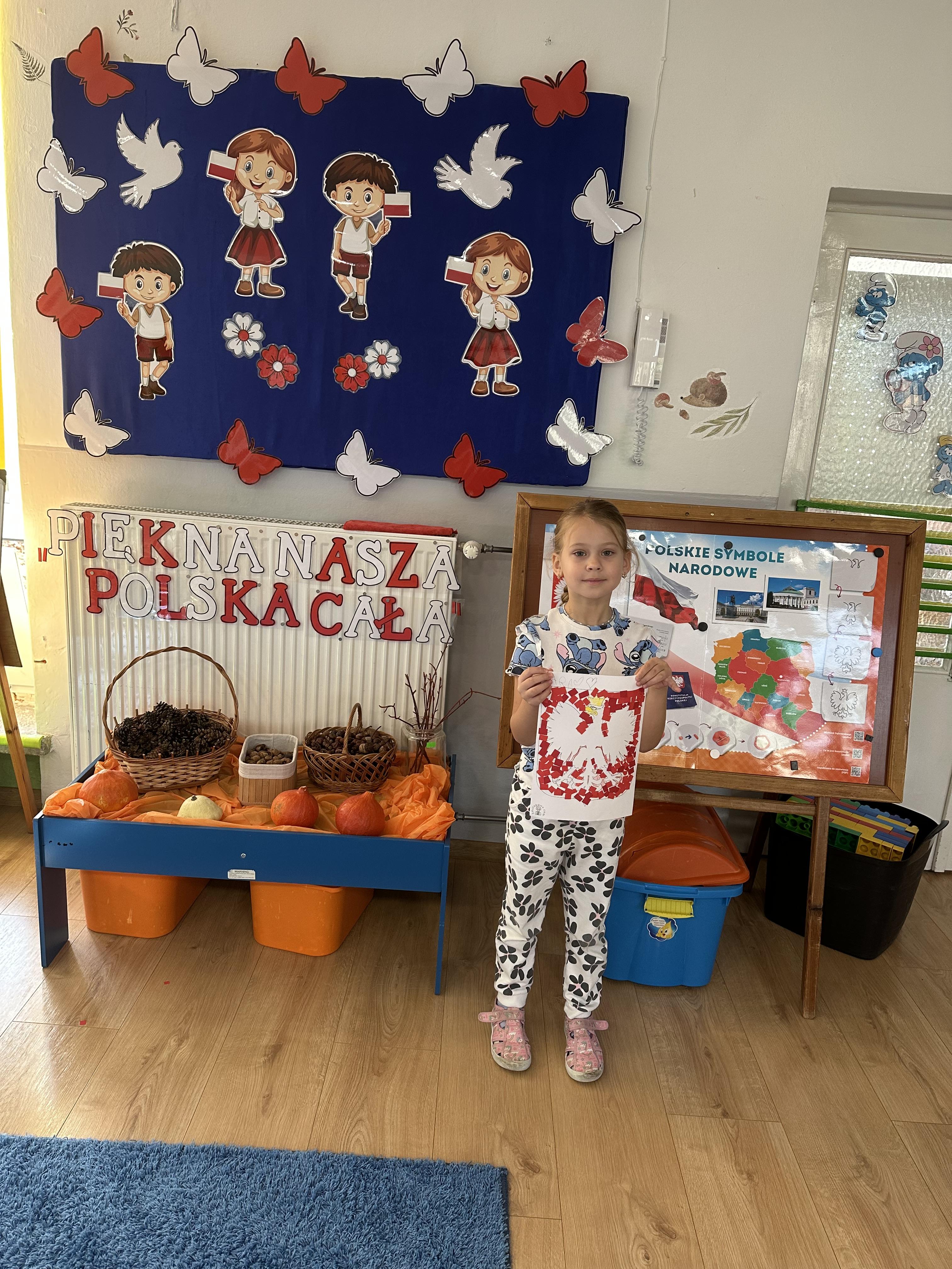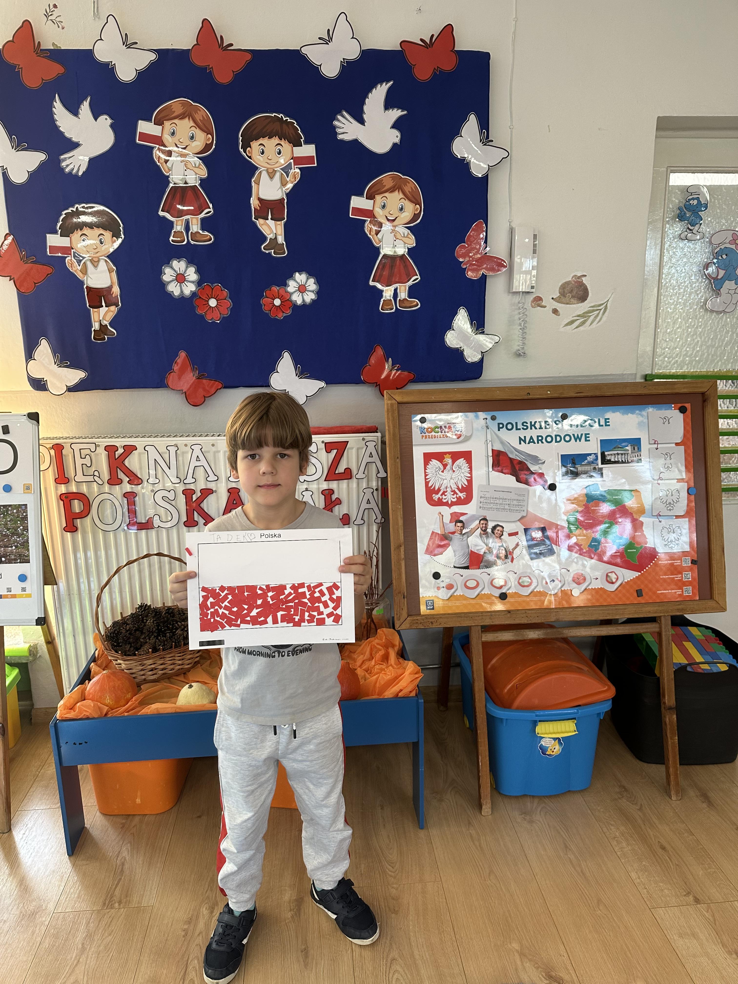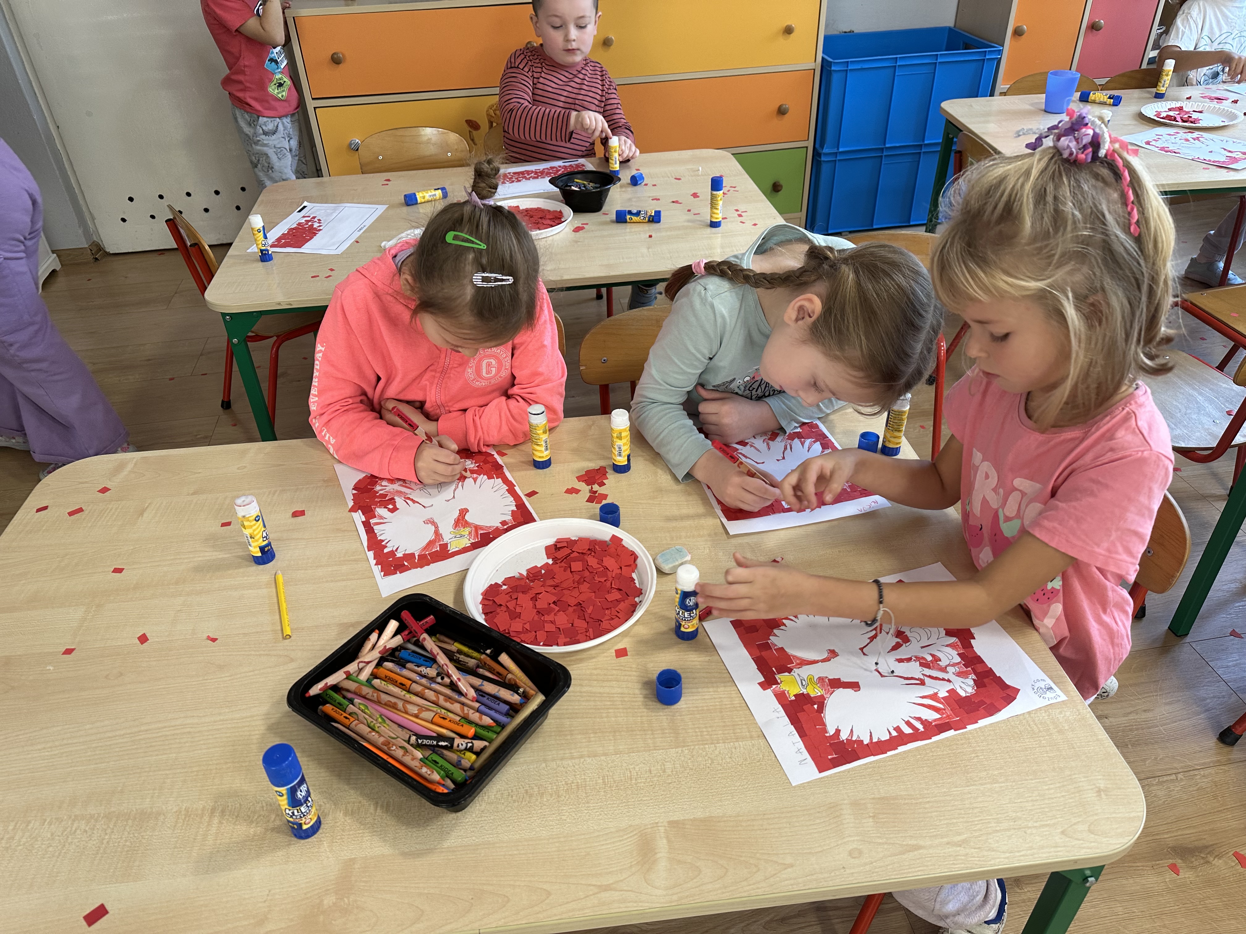 W poniedziałek dzieci wykonywały ćwiczenia rozciągające i rozluźniające oraz rozwijały małe partie mięśniowe. Opowiadanie Marii Pawlisz ,,Polska to nasz dom” stanowiło punkt wyjścia do wspólnej rozmowy o świętach państwowych. Dzieci zastanawiały się, w jaki sposób można dbać o nasz kraj i co robić, aby być przykładnym Polakiem. Kształtowały tym samym świadomość społeczną i obywatelską. Podczas zabaw: „Polskie święta narodowe”, „Świętujemy”, „Co świętujemy?” dzieci poznały, jakie święta obchodzimy w kraju i wyjaśniły, czym się różnią święta narodowe od pozostałych. Uczyły się współpracy i się integrowały. W zabawach przy stolikach kształtowały umiejętność rozszyfrowywania emocji i wyjaśniania ich przyczyn. Pod koniec dnia w trakcie zabawy „Święto narodowe czy rodzinne?” podsumowały wszystkie wiadomości. We wtorek po wysłuchaniu wiersza ,,Dzieciom” Antoniego Słomińskiego przedszkolaki zastanawiały się, jak mogą przysłużyć się innym ludziom oraz poznały nowy frazeologizm ,,wolny jak ptak”. W dalszej części dnia poszerzały wiedzę językową, nauczyły się wielkiej i małej litery D, d, dokonywały analizy i syntezy słuchowej słowa ,,dom”, wyróżniały głoskę d w nagłosie i rysowały literę w powietrzu palcem wskazującym. Dzieci wyszły również na dwór, aby pobawić się ruchowo na świeżym powietrzu. Podczas zabaw: „Na stacji D”, „Ułóż małe d” i „Szybka reakcja” utrwalały znajomość nowo poznanej litery. W środę po wprowadzającej do tematu dnia zabawie „W mieście” zapoznały się z liczbą 6. W trakcie zabaw: „Jedziemy tramwajem”, „W tramwaju”, „O jedno więcej” i „Jak wygląda szóstka?” rozwijały swoje kompetencje matematyczne, uczyły się przeliczania do 6, poznały obraz graficzny 6 i układały go z kartoników. Podczas zabaw posługiwały się liczbą 6 w aspekcie kardynalnym, porządkowym i miarowym. Rozwijały małą motorykę podczas lepienia cyfry 6 z plasteliny. Przy stolikach kształtowały umiejętność kodowania. Zakończyły dzień wykonaniem pracy plastycznej. Czwartek poświęcony był kształtowaniu umiejętności podawania nazw zwierząt gospodarskich i ich młodych w czasie zabawy „Zwierzęta i ich młode” (wraz z głoskowaniem). W trakcie zabaw „Na wsi i w okolicy” i „Wyprawa na wieś” dzieci zapoznały się z wiejskim krajobrazem oraz ćwiczyły pamięć wzrokową i spostrzegawczość. W tym dniu pobudzały ciekawość przyrodniczą, dzieliły się swoimi skojarzeniami związanymi z wsią i rozszyfrowywały odgłosy wiejskich zwierząt w odpowiedniej kolejności. W piątek dzieci podczas zabawy „Podobne czy różne?” sprawdzały, ile zapamiętały z wcześniejszych zajęć i czy dostrzegają różnice pomiędzy świętami narodowymi a innymi. Po zabawie „O co chodzi w hymnie?” potrafiły wyjaśnić znaczenie słów w polskim hymnie narodowym oraz to, w jakich okolicznościach powstał, przypomniały sobie jego słowa i wysłuchały wspólnie melodii hymnu. Zakończyły dzień wspólnym odśpiewaniem hymnu i nauczeniem się kolejnych jego zwrotek.