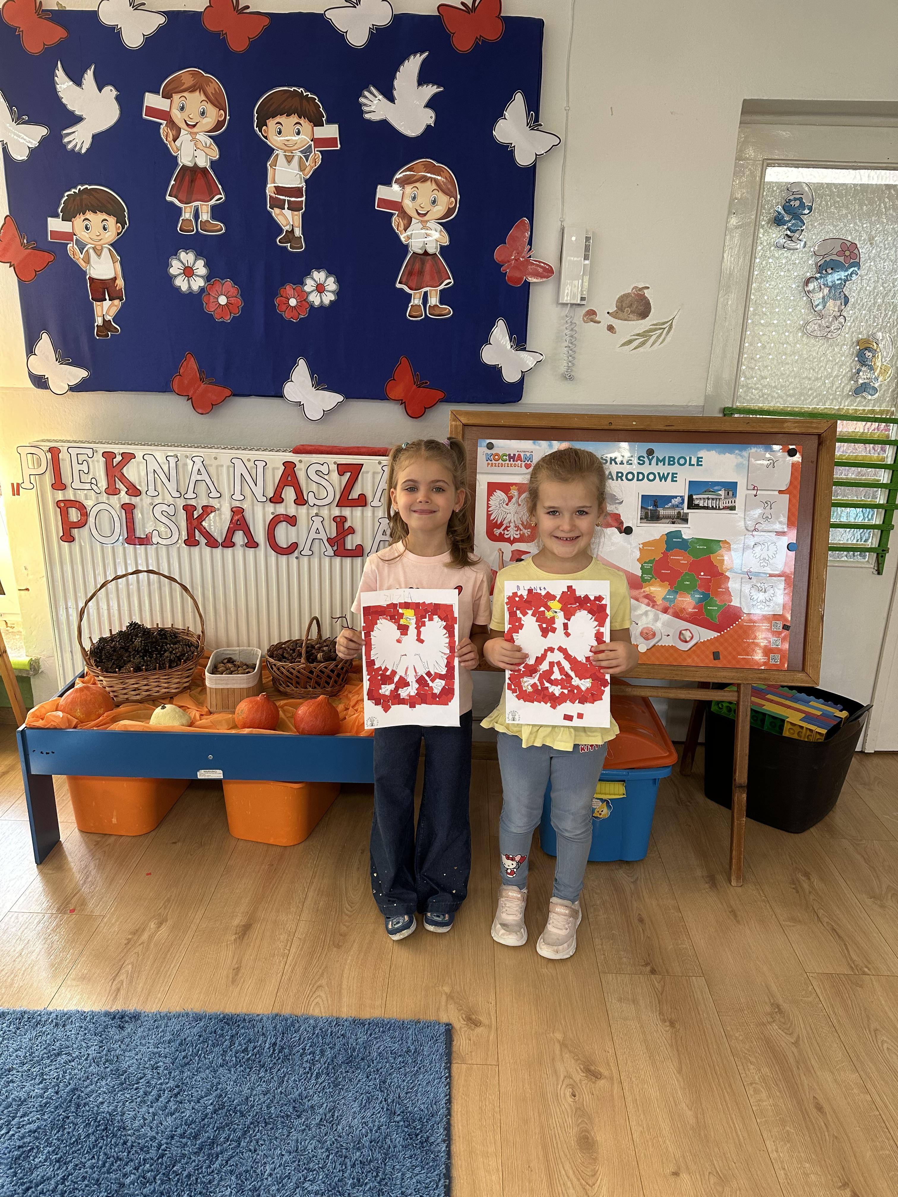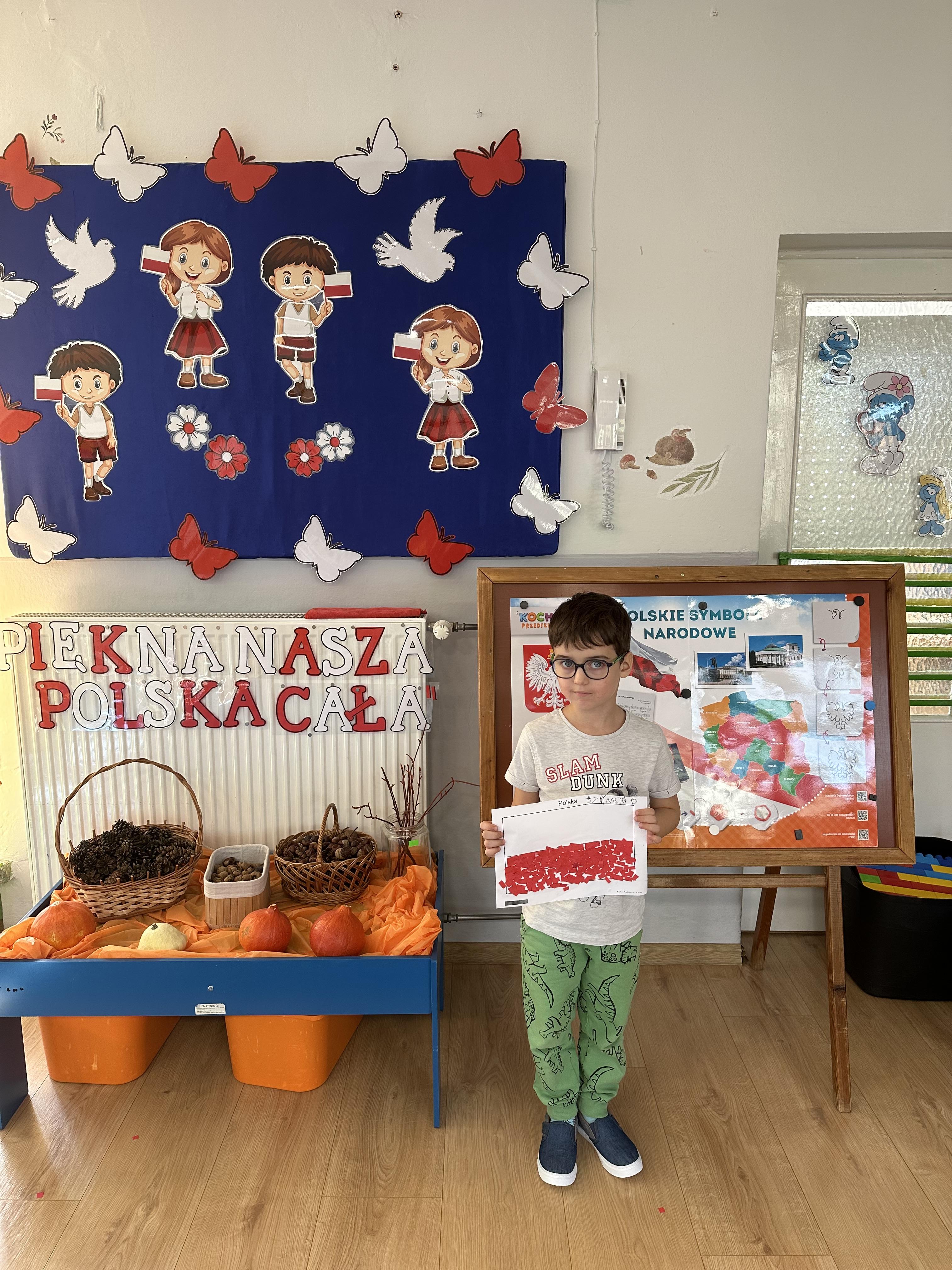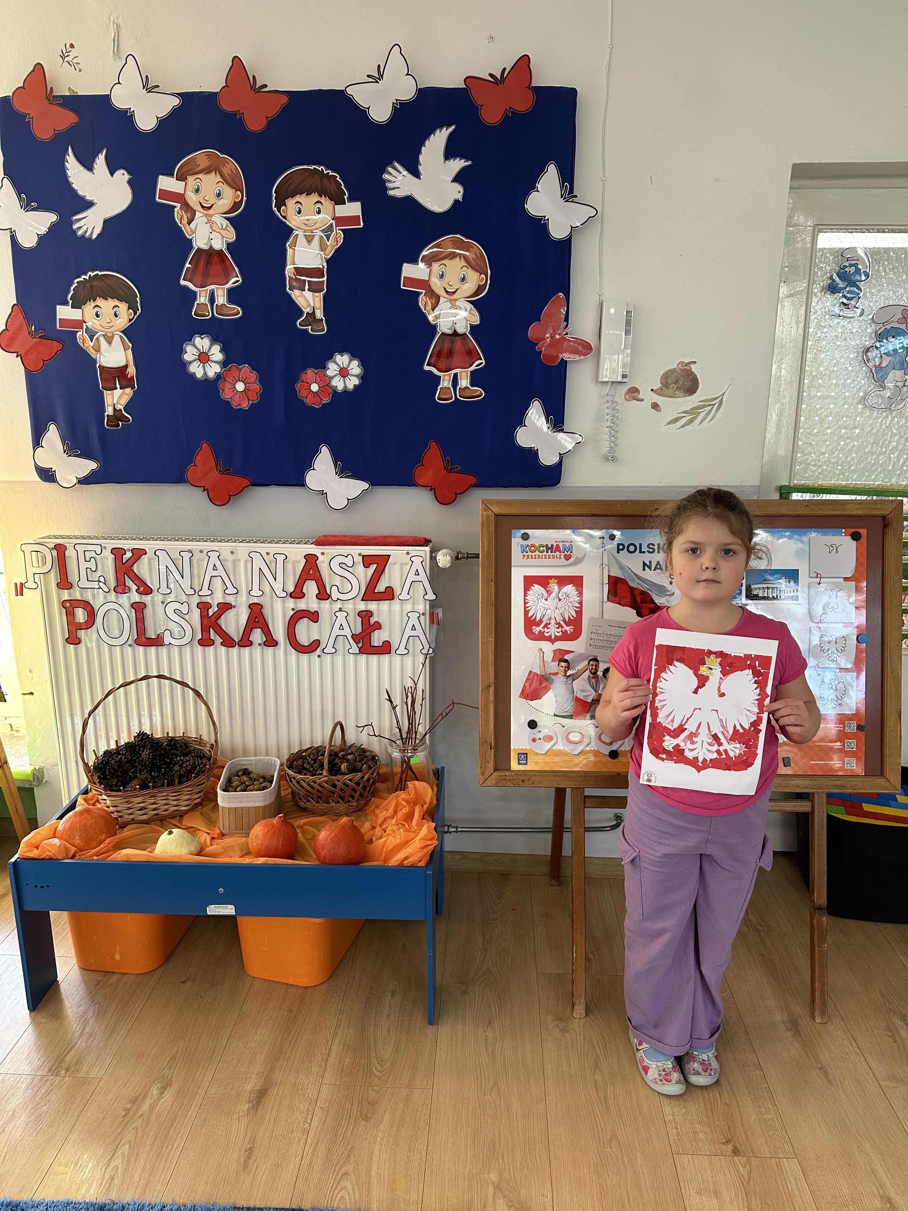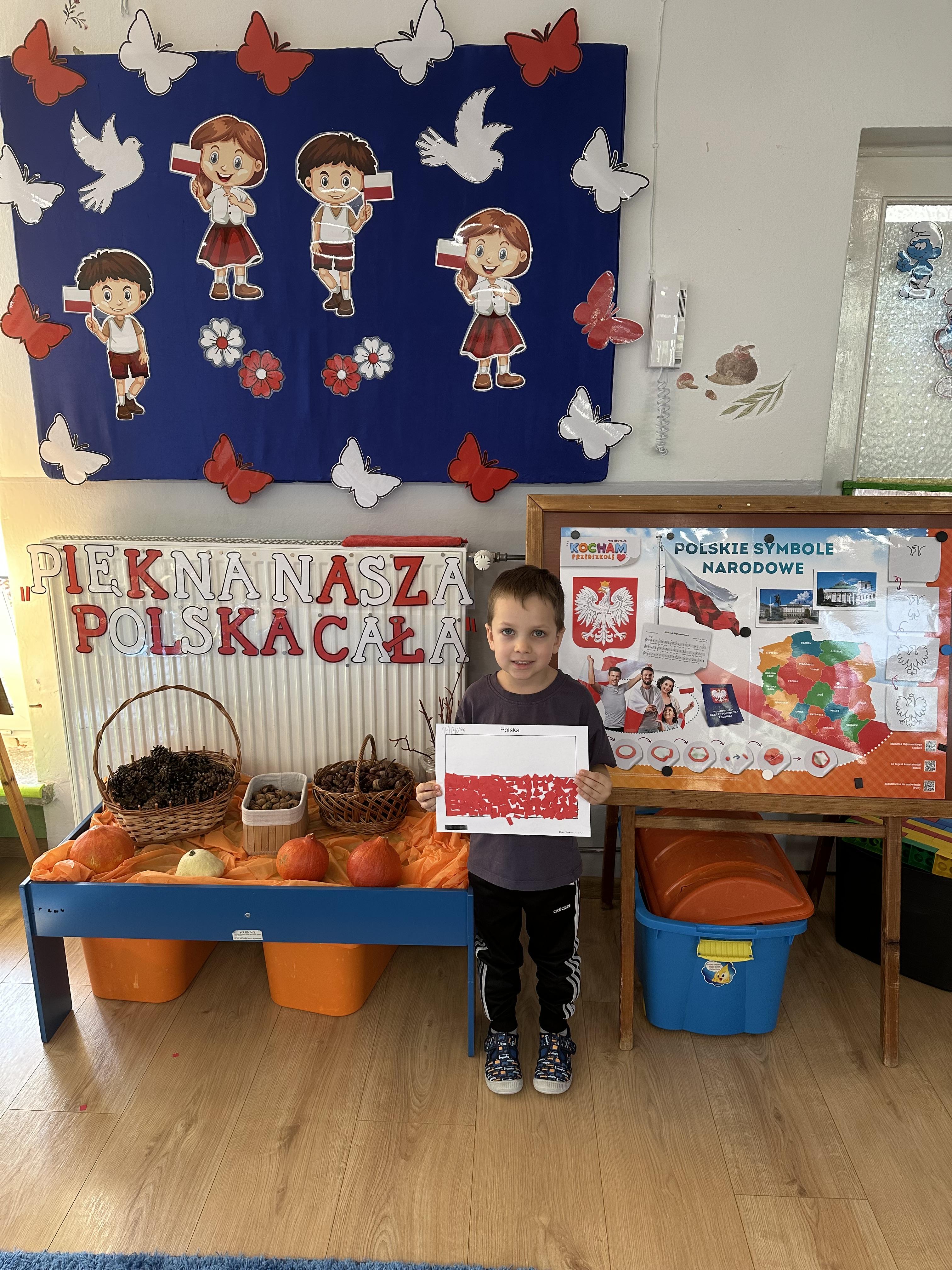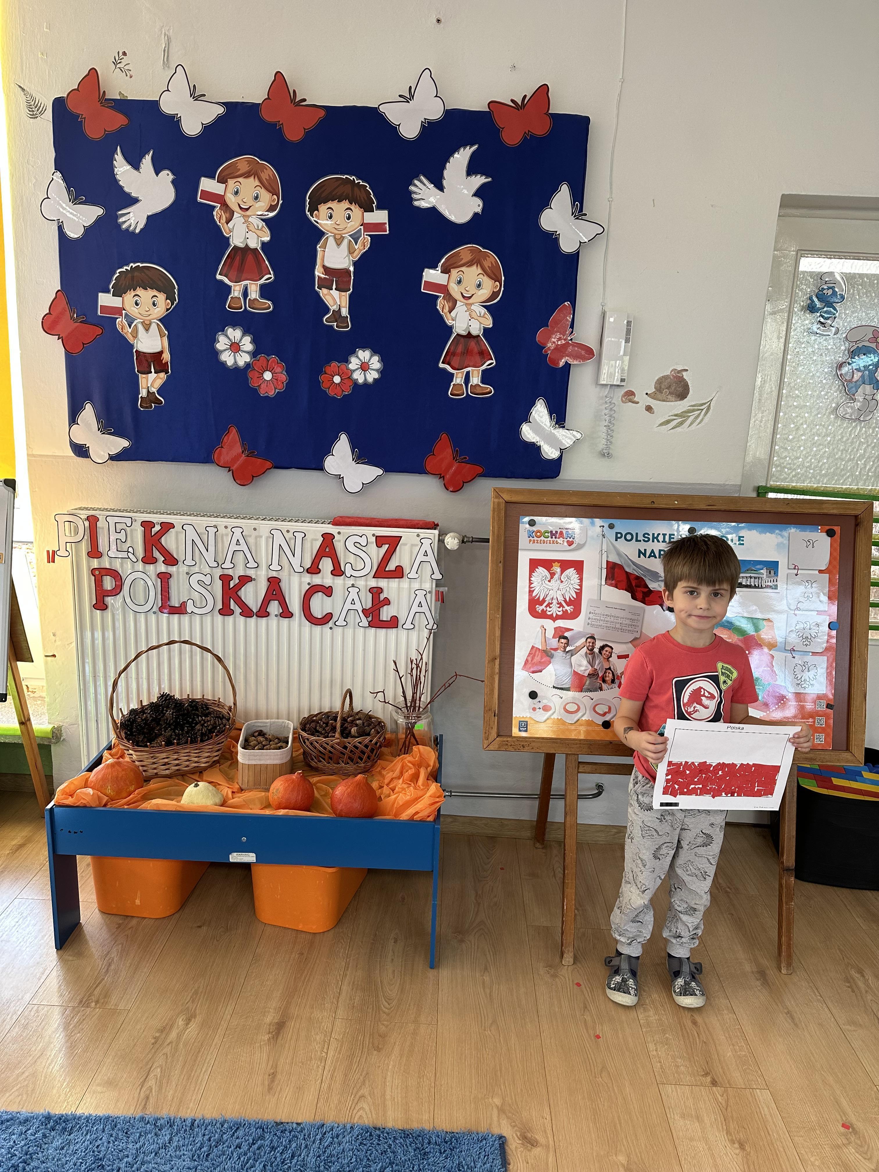 W poniedziałek dzieci wykonywały ćwiczenia rozciągające i rozluźniające oraz rozwijały małe partie mięśniowe. Opowiadanie Marii Pawlisz ,,Polska to nasz dom” stanowiło punkt wyjścia do wspólnej rozmowy o świętach państwowych. Dzieci zastanawiały się, w jaki sposób można dbać o nasz kraj i co robić, aby być przykładnym Polakiem. Kształtowały tym samym świadomość społeczną i obywatelską. Podczas zabaw: „Polskie święta narodowe”, „Świętujemy”, „Co świętujemy?” dzieci poznały, jakie święta obchodzimy w kraju i wyjaśniły, czym się różnią święta narodowe od pozostałych. Uczyły się współpracy i się integrowały. W zabawach przy stolikach kształtowały umiejętność rozszyfrowywania emocji i wyjaśniania ich przyczyn. Pod koniec dnia w trakcie zabawy „Święto narodowe czy rodzinne?” podsumowały wszystkie wiadomości. We wtorek po wysłuchaniu wiersza ,,Dzieciom” Antoniego Słomińskiego przedszkolaki zastanawiały się, jak mogą przysłużyć się innym ludziom oraz poznały nowy frazeologizm ,,wolny jak ptak”. W dalszej części dnia poszerzały wiedzę językową, nauczyły się wielkiej i małej litery D, d, dokonywały analizy i syntezy słuchowej słowa ,,dom”, wyróżniały głoskę d w nagłosie i rysowały literę w powietrzu palcem wskazującym. Dzieci wyszły również na dwór, aby pobawić się ruchowo na świeżym powietrzu. Podczas zabaw: „Na stacji D”, „Ułóż małe d” i „Szybka reakcja” utrwalały znajomość nowo poznanej litery. W środę po wprowadzającej do tematu dnia zabawie „W mieście” zapoznały się z liczbą 6. W trakcie zabaw: „Jedziemy tramwajem”, „W tramwaju”, „O jedno więcej” i „Jak wygląda szóstka?” rozwijały swoje kompetencje matematyczne, uczyły się przeliczania do 6, poznały obraz graficzny 6 i układały go z kartoników. Podczas zabaw posługiwały się liczbą 6 w aspekcie kardynalnym, porządkowym i miarowym. Rozwijały małą motorykę podczas lepienia cyfry 6 z plasteliny. Przy stolikach kształtowały umiejętność kodowania. Zakończyły dzień wykonaniem pracy plastycznej. Czwartek poświęcony był kształtowaniu umiejętności podawania nazw zwierząt gospodarskich i ich młodych w czasie zabawy „Zwierzęta i ich młode” (wraz z głoskowaniem). W trakcie zabaw „Na wsi i w okolicy” i „Wyprawa na wieś” dzieci zapoznały się z wiejskim krajobrazem oraz ćwiczyły pamięć wzrokową i spostrzegawczość. W tym dniu pobudzały ciekawość przyrodniczą, dzieliły się swoimi skojarzeniami związanymi z wsią i rozszyfrowywały odgłosy wiejskich zwierząt w odpowiedniej kolejności. W piątek dzieci podczas zabawy „Podobne czy różne?” sprawdzały, ile zapamiętały z wcześniejszych zajęć i czy dostrzegają różnice pomiędzy świętami narodowymi a innymi. Po zabawie „O co chodzi w hymnie?” potrafiły wyjaśnić znaczenie słów w polskim hymnie narodowym oraz to, w jakich okolicznościach powstał, przypomniały sobie jego słowa i wysłuchały wspólnie melodii hymnu. Zakończyły dzień wspólnym odśpiewaniem hymnu i nauczeniem się kolejnych jego zwrotek.