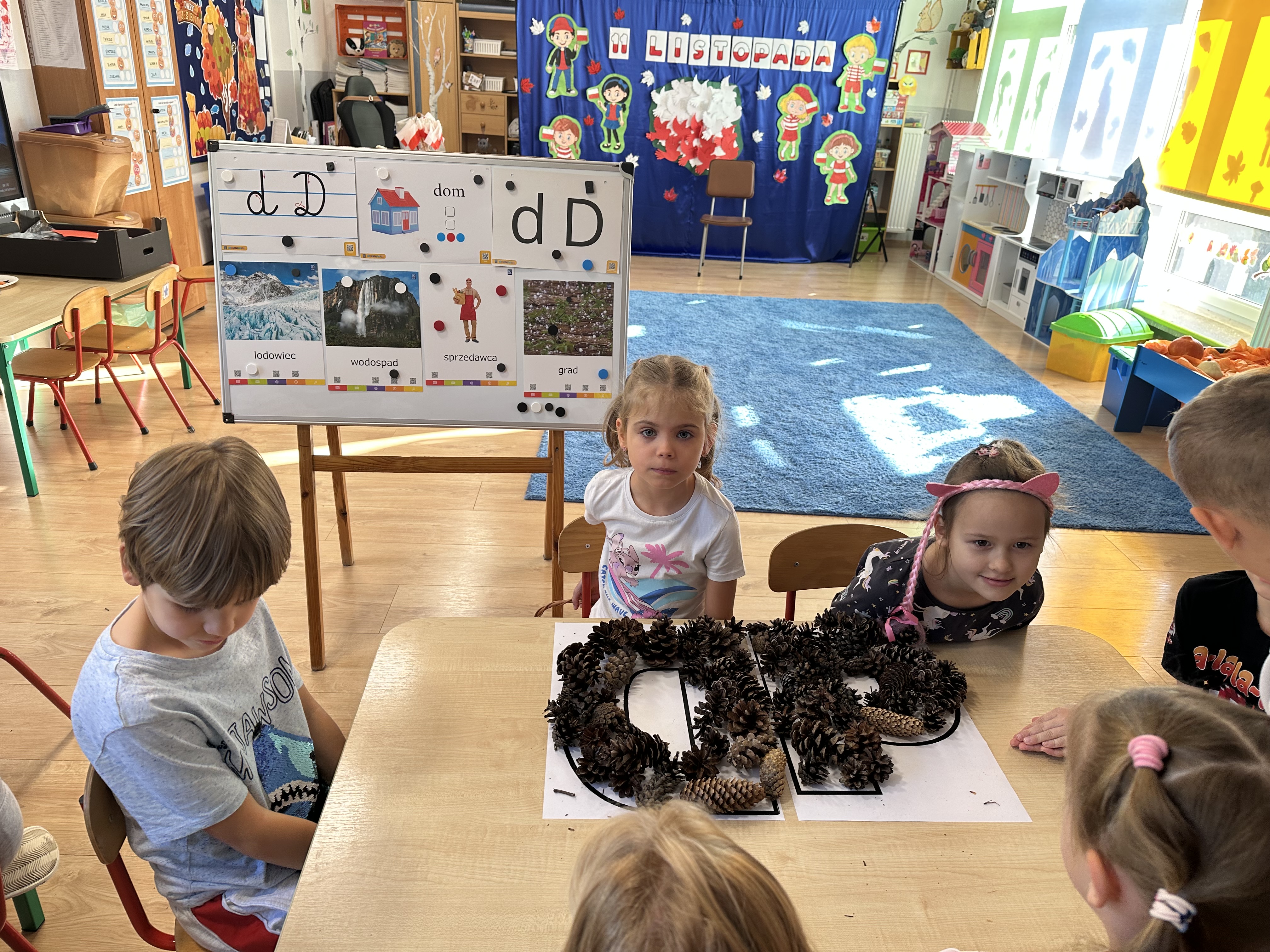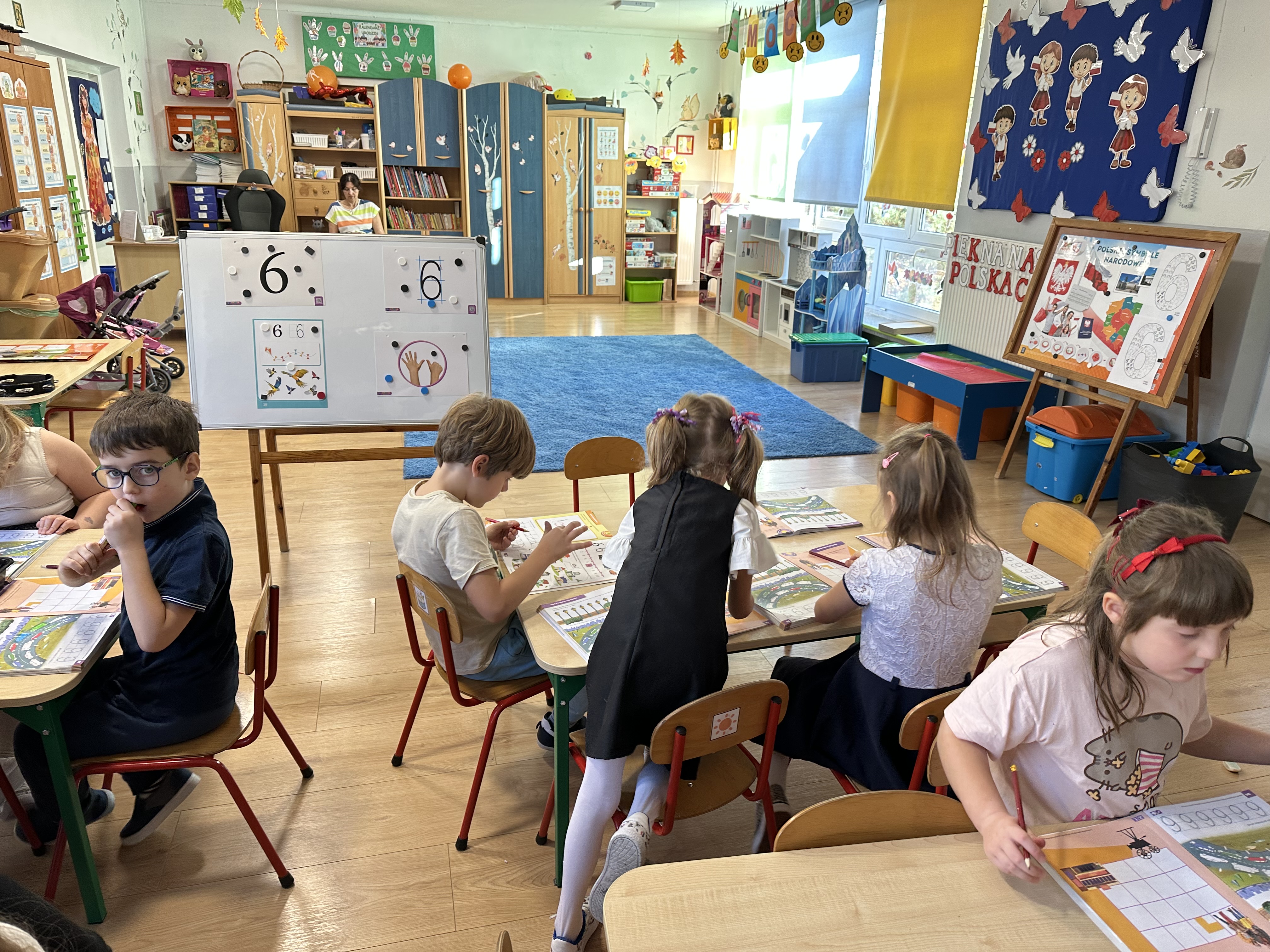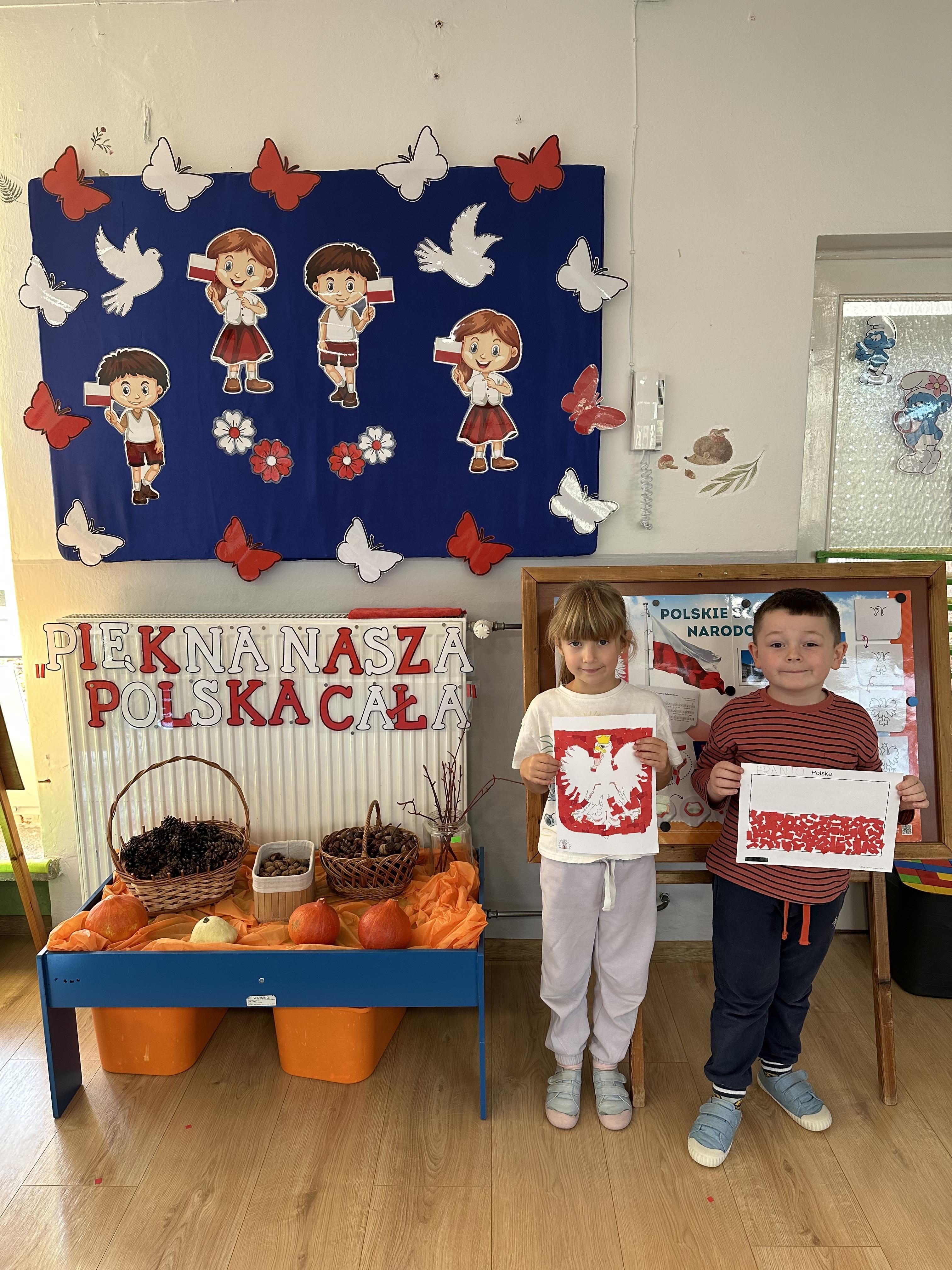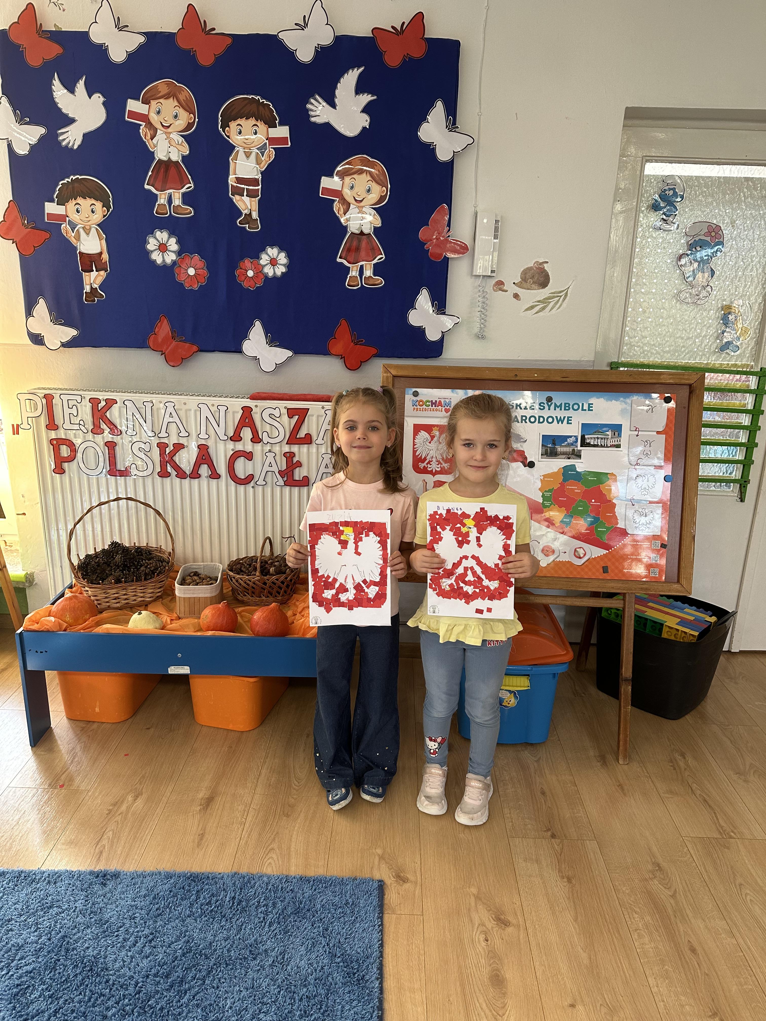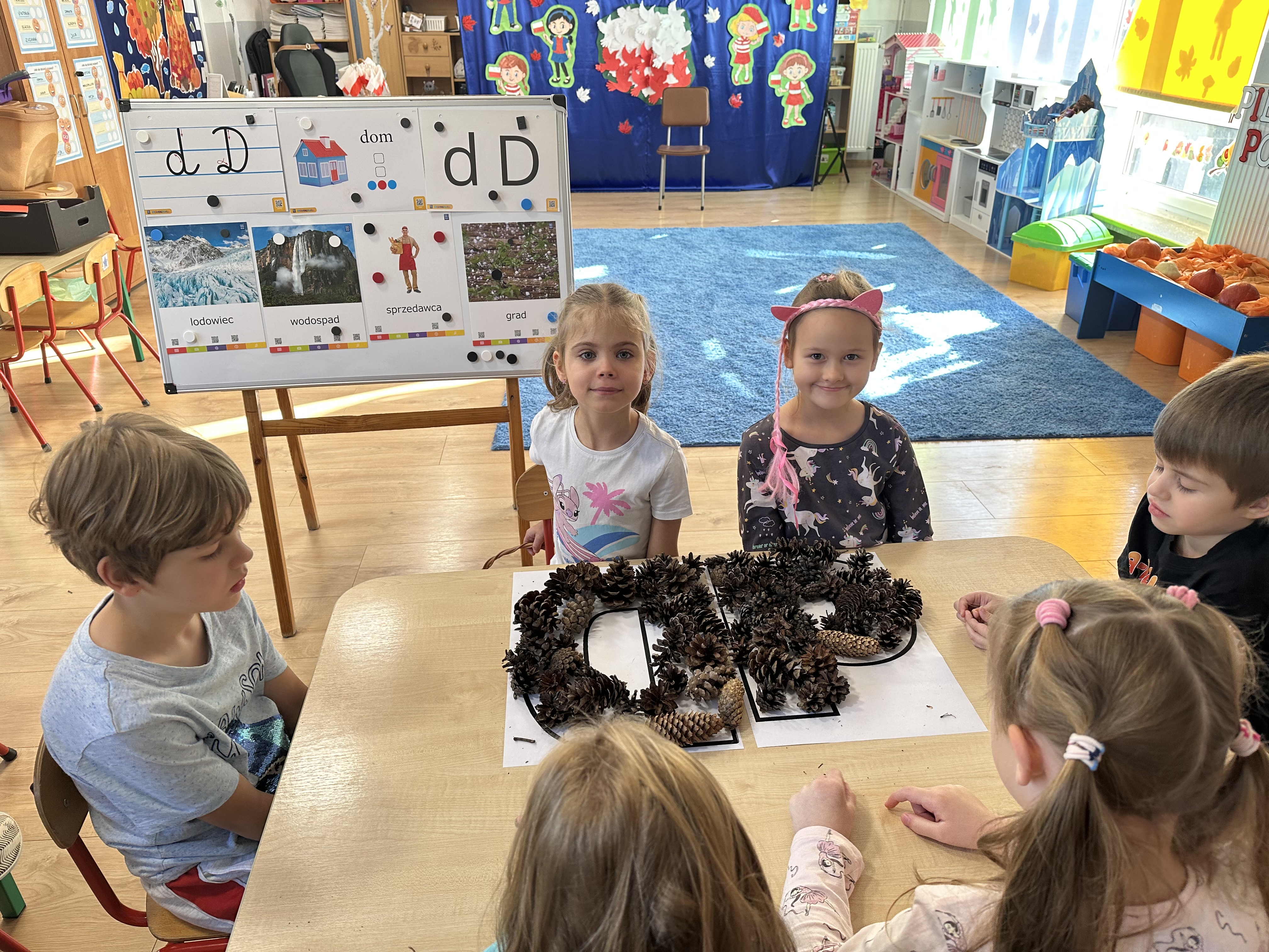 W poniedziałek dzieci wykonywały ćwiczenia rozciągające i rozluźniające oraz rozwijały małe partie mięśniowe. Opowiadanie Marii Pawlisz ,,Polska to nasz dom” stanowiło punkt wyjścia do wspólnej rozmowy o świętach państwowych. Dzieci zastanawiały się, w jaki sposób można dbać o nasz kraj i co robić, aby być przykładnym Polakiem. Kształtowały tym samym świadomość społeczną i obywatelską. Podczas zabaw: „Polskie święta narodowe”, „Świętujemy”, „Co świętujemy?” dzieci poznały, jakie święta obchodzimy w kraju i wyjaśniły, czym się różnią święta narodowe od pozostałych. Uczyły się współpracy i się integrowały. W zabawach przy stolikach kształtowały umiejętność rozszyfrowywania emocji i wyjaśniania ich przyczyn. Pod koniec dnia w trakcie zabawy „Święto narodowe czy rodzinne?” podsumowały wszystkie wiadomości. We wtorek po wysłuchaniu wiersza ,,Dzieciom” Antoniego Słomińskiego przedszkolaki zastanawiały się, jak mogą przysłużyć się innym ludziom oraz poznały nowy frazeologizm ,,wolny jak ptak”. W dalszej części dnia poszerzały wiedzę językową, nauczyły się wielkiej i małej litery D, d, dokonywały analizy i syntezy słuchowej słowa ,,dom”, wyróżniały głoskę d w nagłosie i rysowały literę w powietrzu palcem wskazującym. Dzieci wyszły również na dwór, aby pobawić się ruchowo na świeżym powietrzu. Podczas zabaw: „Na stacji D”, „Ułóż małe d” i „Szybka reakcja” utrwalały znajomość nowo poznanej litery. W środę po wprowadzającej do tematu dnia zabawie „W mieście” zapoznały się z liczbą 6. W trakcie zabaw: „Jedziemy tramwajem”, „W tramwaju”, „O jedno więcej” i „Jak wygląda szóstka?” rozwijały swoje kompetencje matematyczne, uczyły się przeliczania do 6, poznały obraz graficzny 6 i układały go z kartoników. Podczas zabaw posługiwały się liczbą 6 w aspekcie kardynalnym, porządkowym i miarowym. Rozwijały małą motorykę podczas lepienia cyfry 6 z plasteliny. Przy stolikach kształtowały umiejętność kodowania. Zakończyły dzień wykonaniem pracy plastycznej. Czwartek poświęcony był kształtowaniu umiejętności podawania nazw zwierząt gospodarskich i ich młodych w czasie zabawy „Zwierzęta i ich młode” (wraz z głoskowaniem). W trakcie zabaw „Na wsi i w okolicy” i „Wyprawa na wieś” dzieci zapoznały się z wiejskim krajobrazem oraz ćwiczyły pamięć wzrokową i spostrzegawczość. W tym dniu pobudzały ciekawość przyrodniczą, dzieliły się swoimi skojarzeniami związanymi z wsią i rozszyfrowywały odgłosy wiejskich zwierząt w odpowiedniej kolejności. W piątek dzieci podczas zabawy „Podobne czy różne?” sprawdzały, ile zapamiętały z wcześniejszych zajęć i czy dostrzegają różnice pomiędzy świętami narodowymi a innymi. Po zabawie „O co chodzi w hymnie?” potrafiły wyjaśnić znaczenie słów w polskim hymnie narodowym oraz to, w jakich okolicznościach powstał, przypomniały sobie jego słowa i wysłuchały wspólnie melodii hymnu. Zakończyły dzień wspólnym odśpiewaniem hymnu i nauczeniem się kolejnych jego zwrotek.
