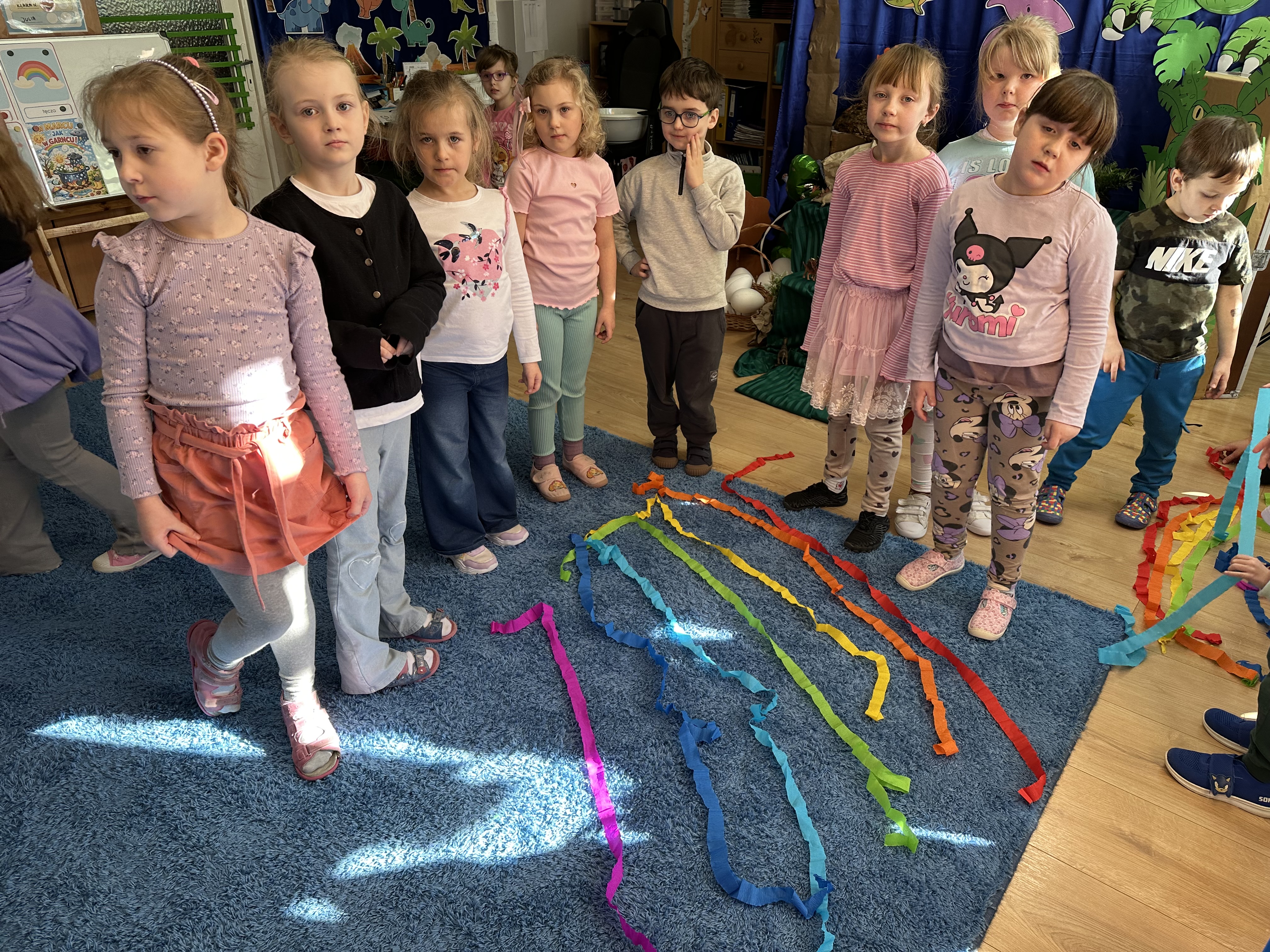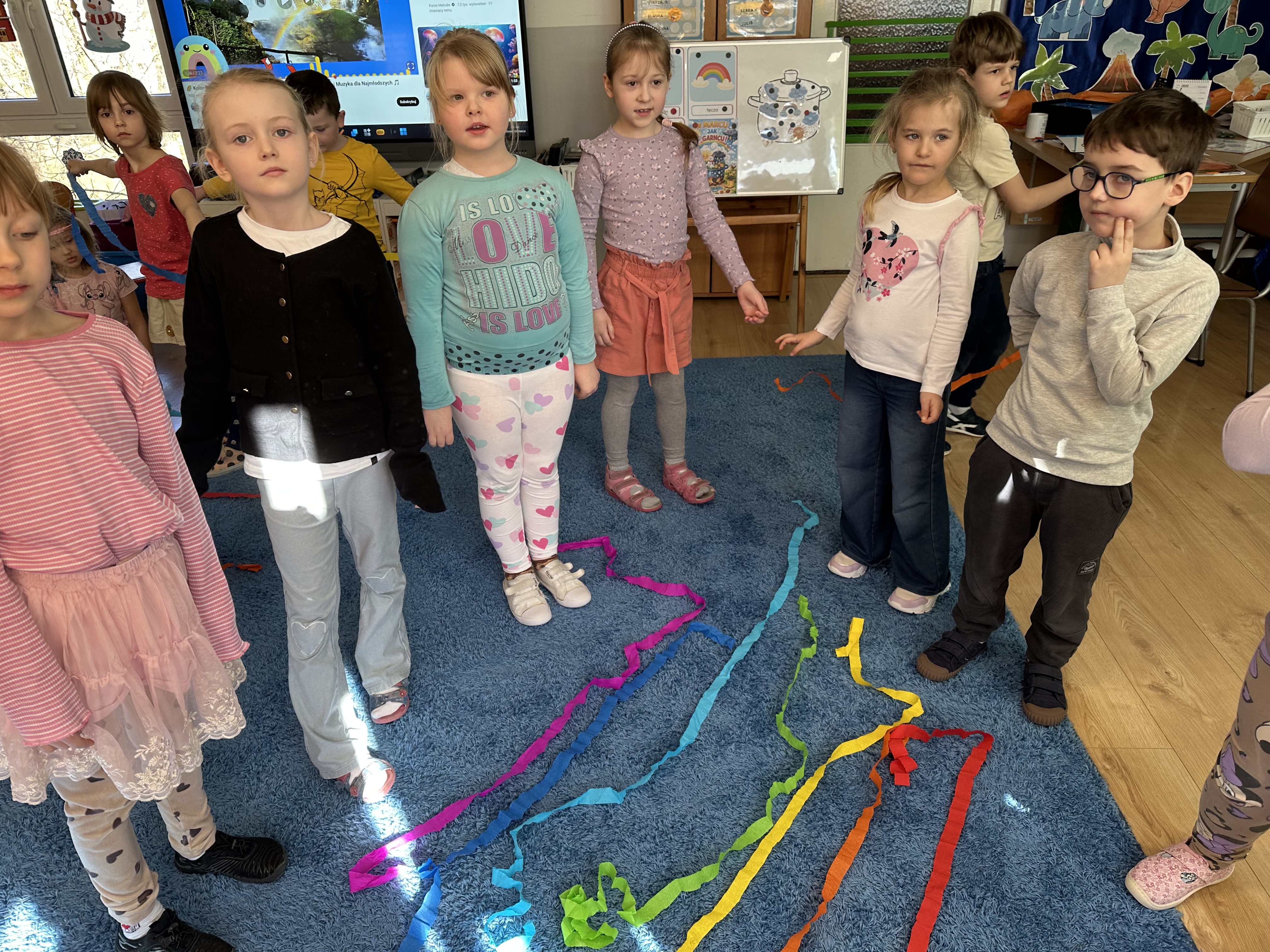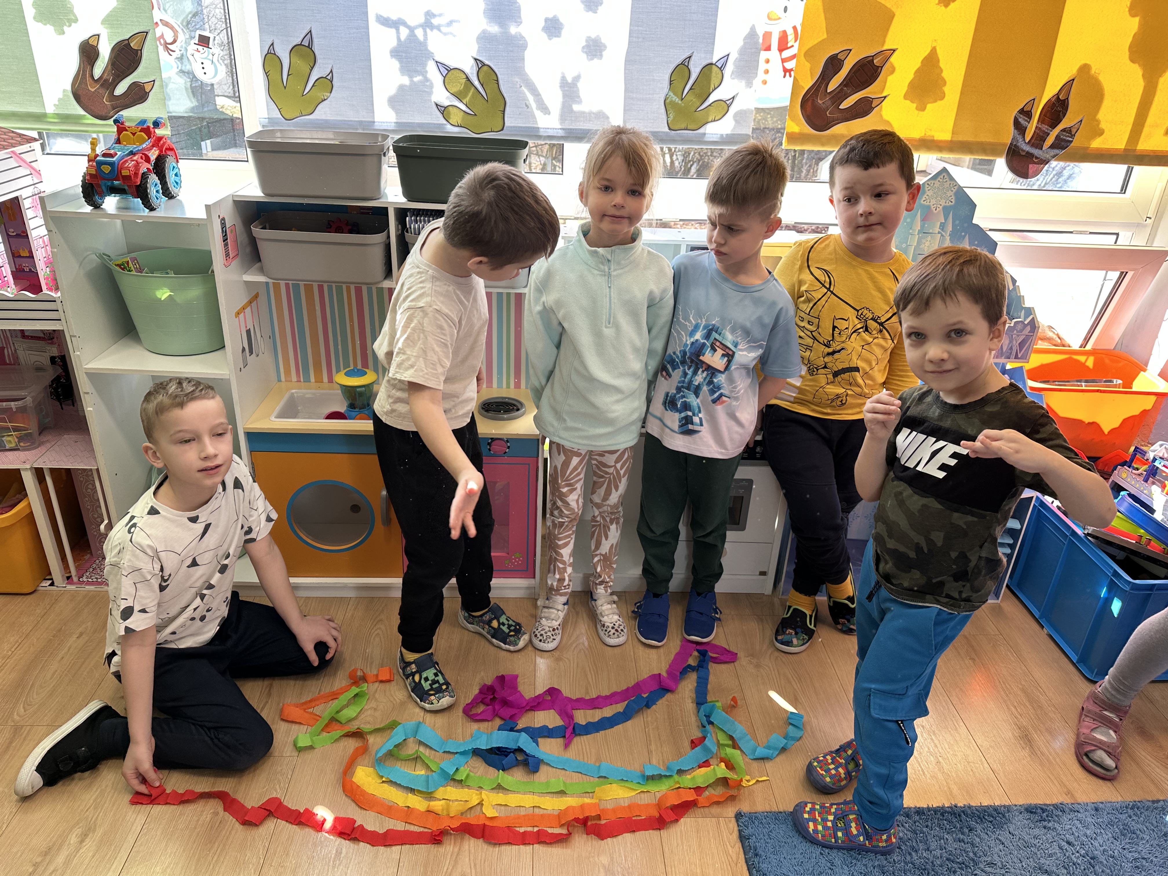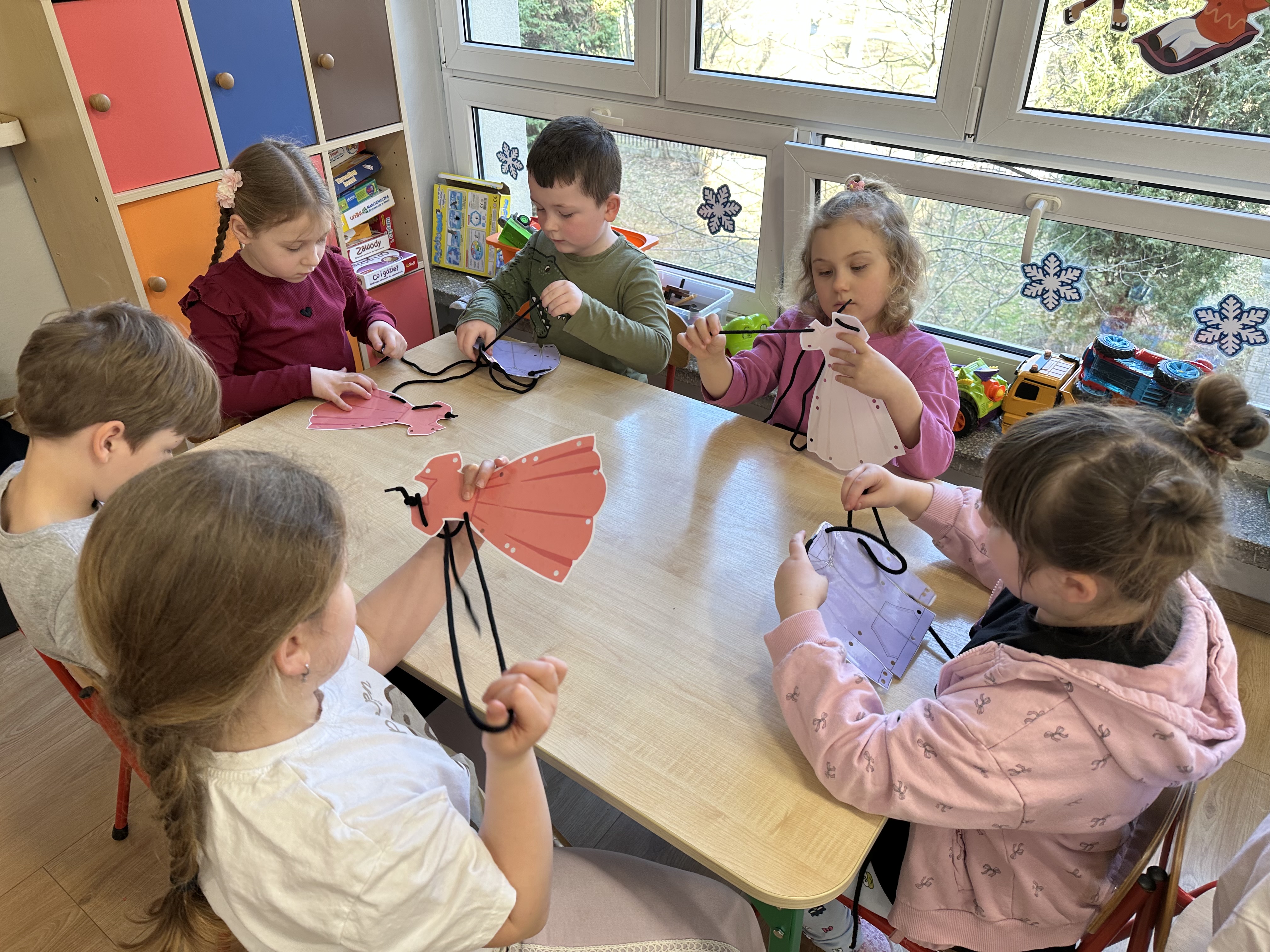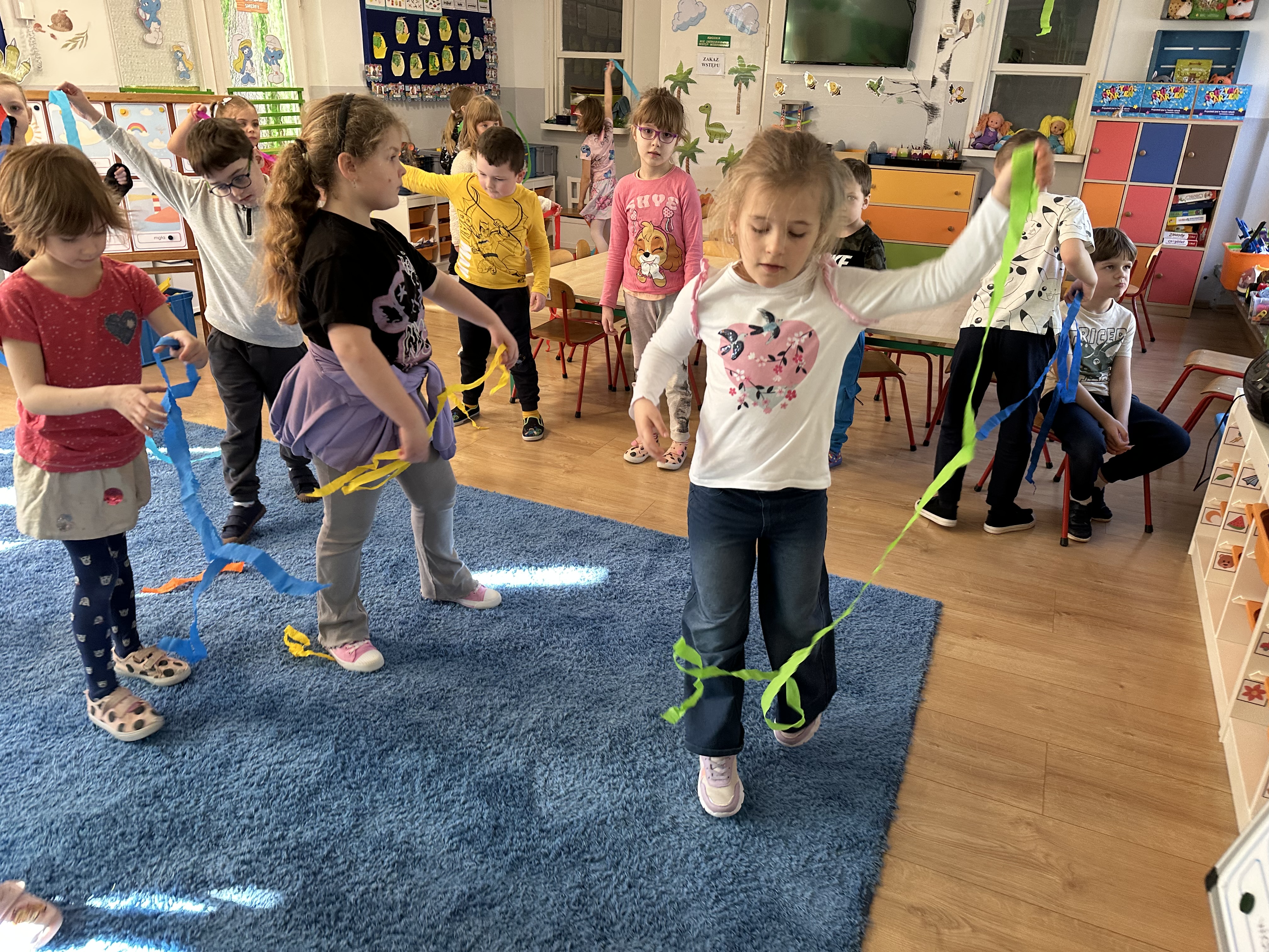 z ciekawostkami na temat budzenia się zwierząt ze snu zimowego. Nauczyły się rymowanki ,,Koncert dzięcioła”, a pod koniec dnia brały udział w „Kwiatowej zakrywajce” – grze matematycznej, podczas której rozwijały umiejętności przeliczania elementów i rozpoznawania obrazu graficznego liczb. W piątek dzieci utrwaliły nazwy i kolejność miesięcy oraz dni tygodnia. Dodatkowo przedszkolaki rozwijały również ekspresję taneczną w trakcie zabawy ,,Taniec Pani Wiosny”, a także doskonaliły analizę głoskową podczas zabawy językowej „Psotny wiatr”. Dzień zakończyły pracą plastyczną, tzn. wykonały witraż według instrukcji.