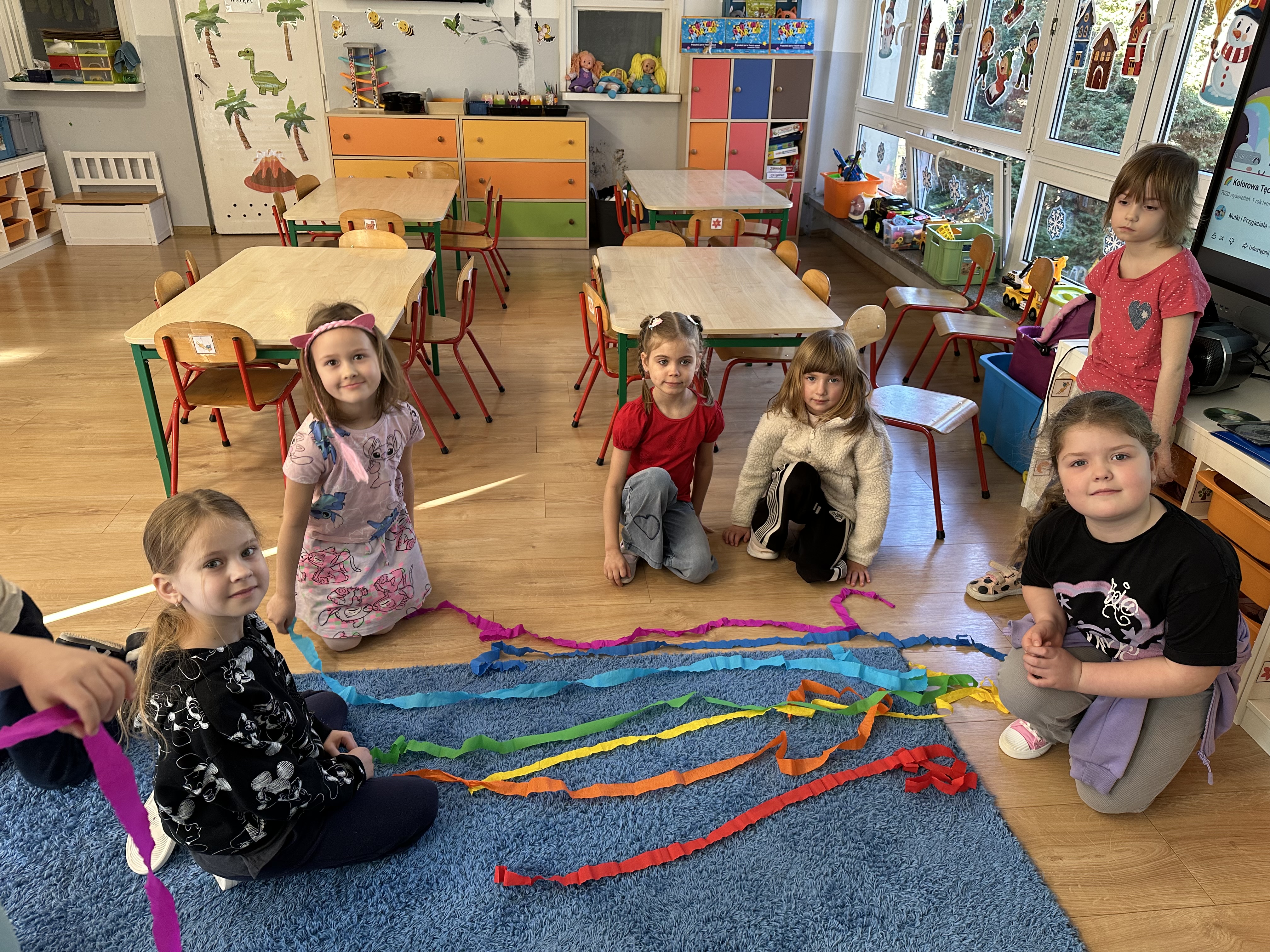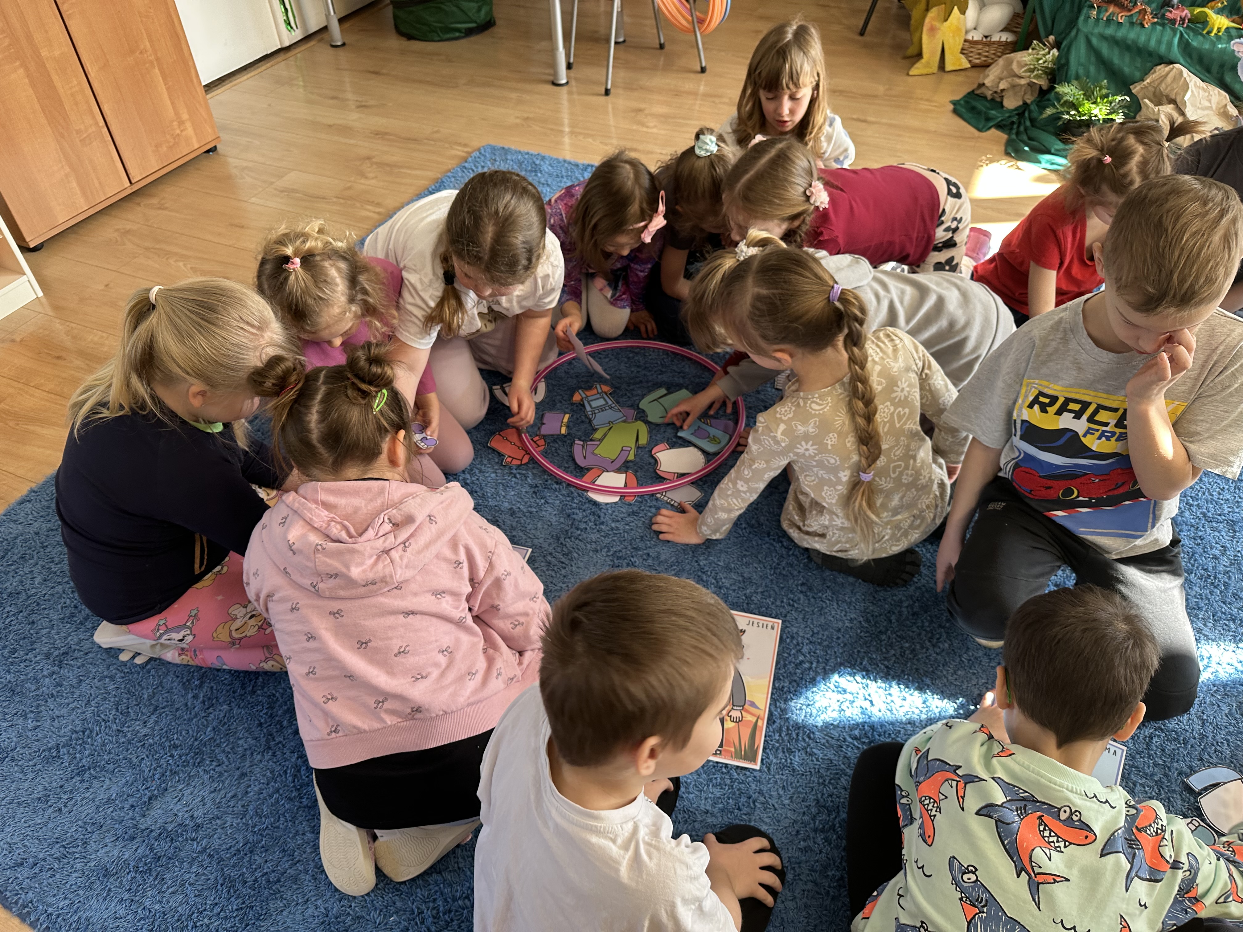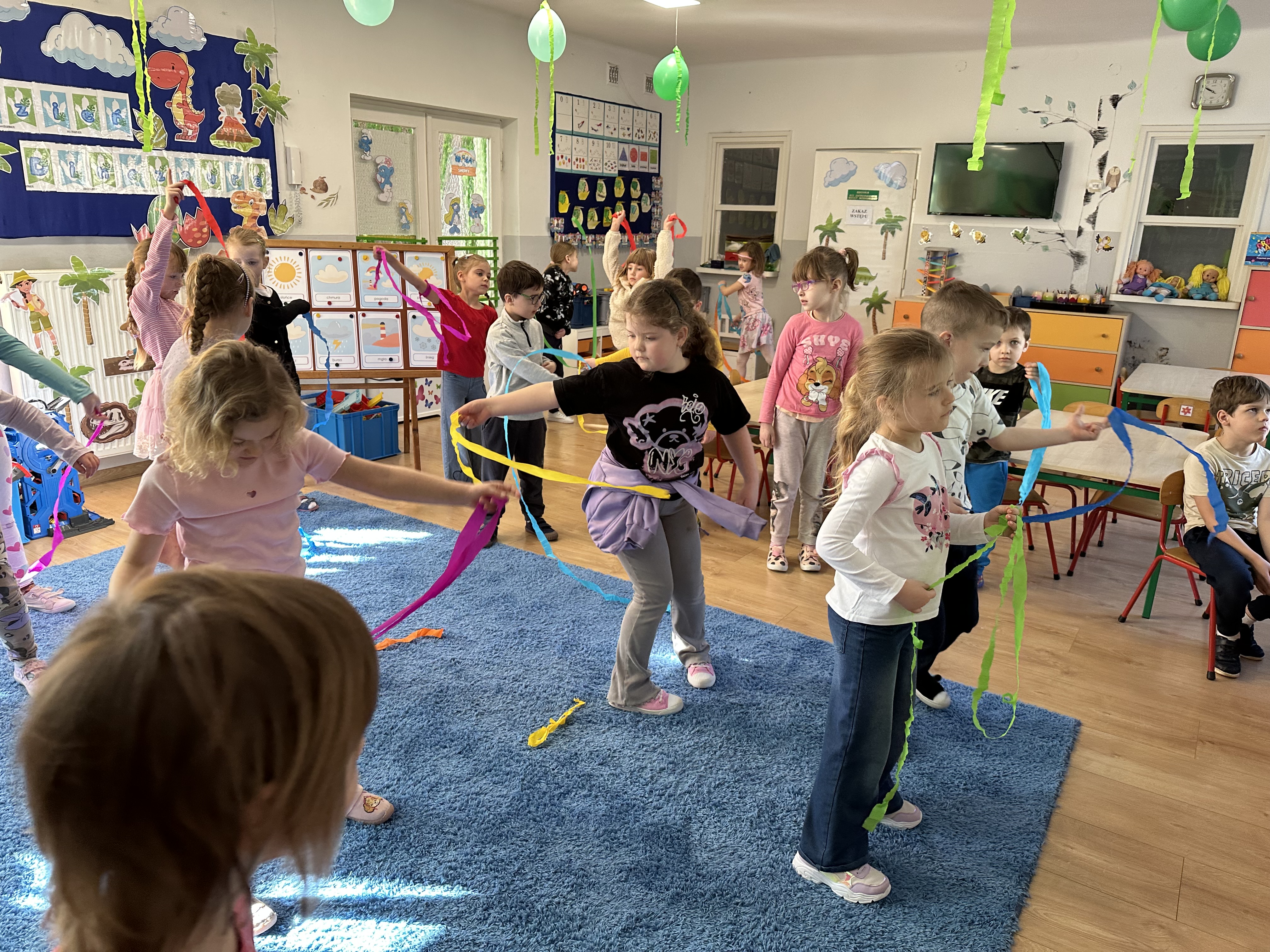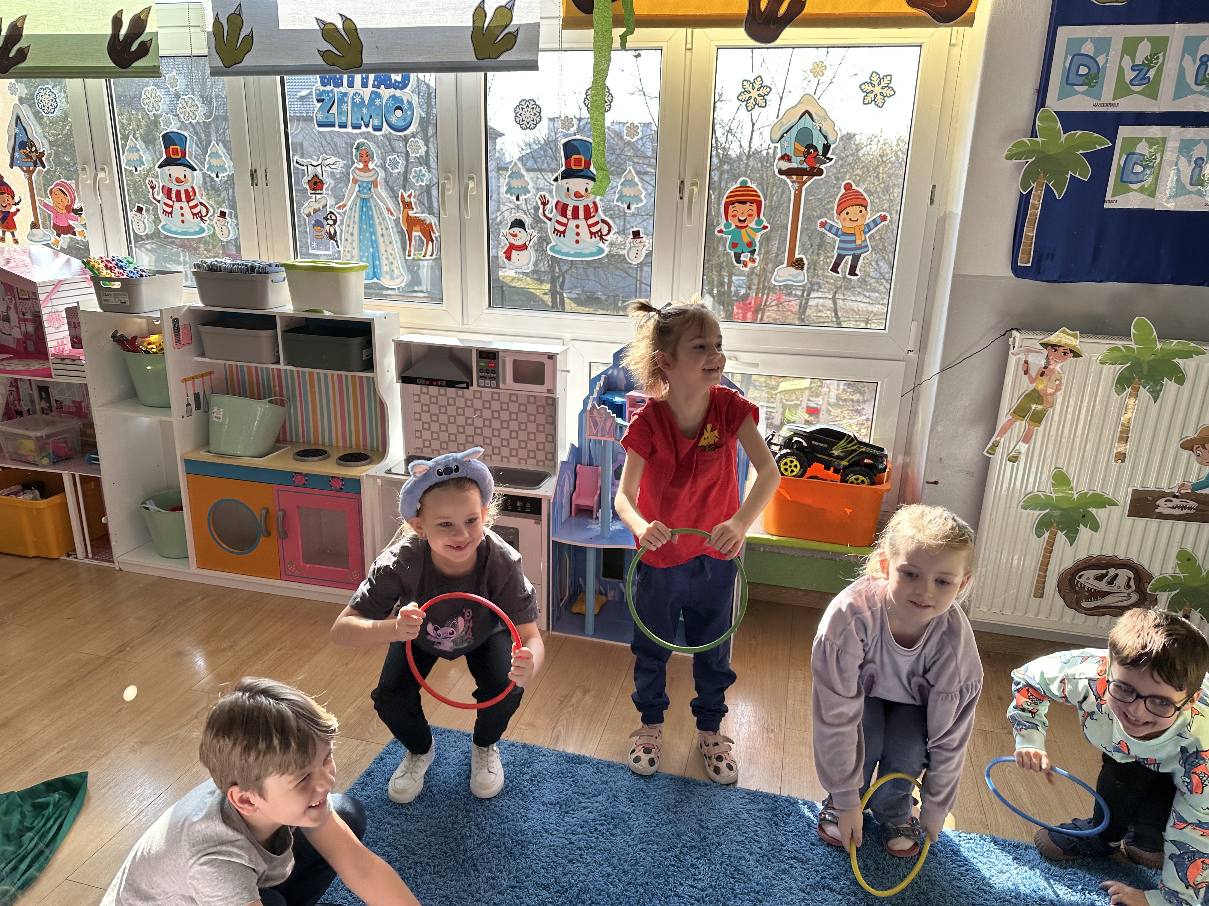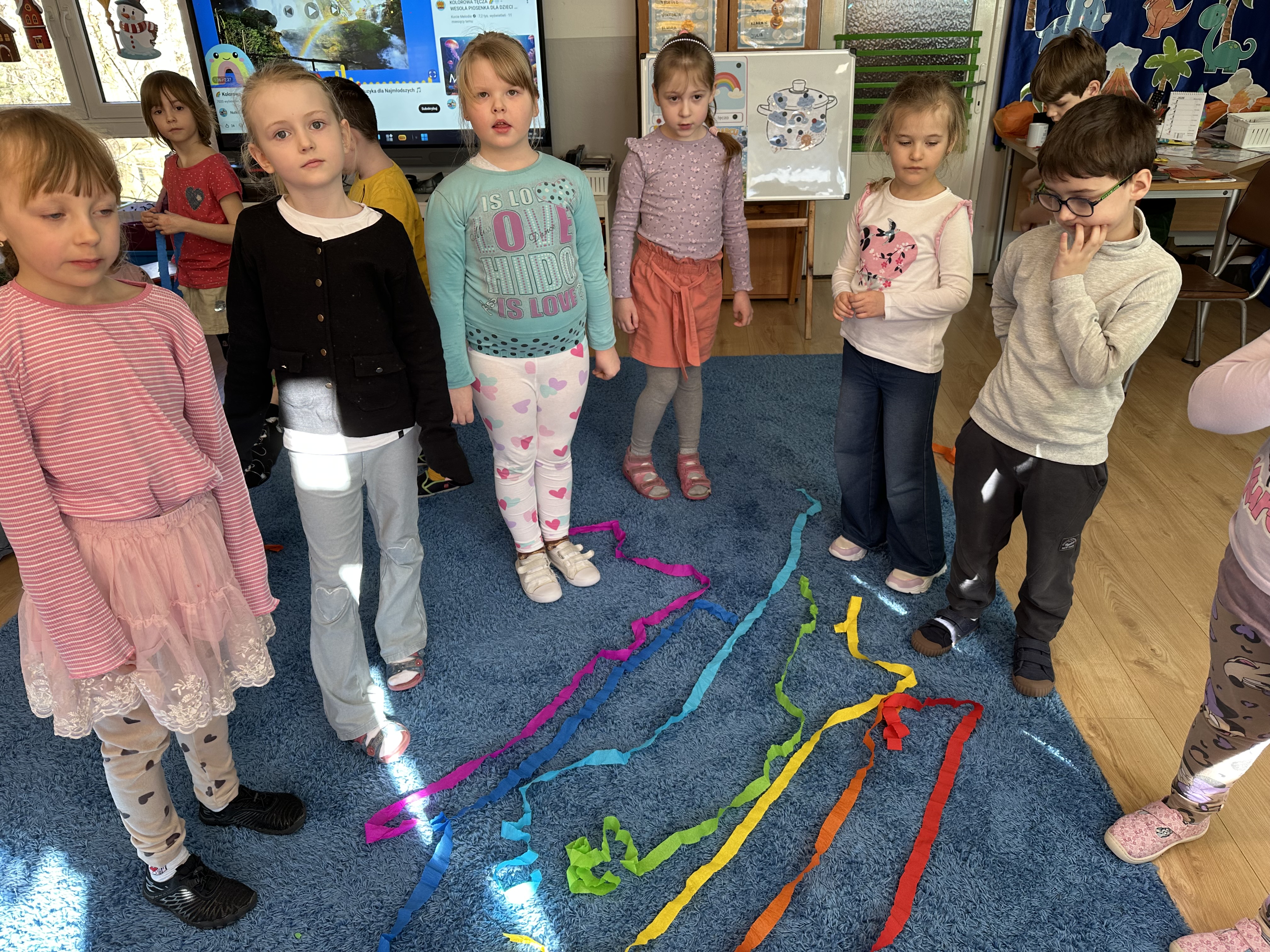 z ciekawostkami na temat budzenia się zwierząt ze snu zimowego. Nauczyły się rymowanki ,,Koncert dzięcioła”, a pod koniec dnia brały udział w „Kwiatowej zakrywajce” – grze matematycznej, podczas której rozwijały umiejętności przeliczania elementów i rozpoznawania obrazu graficznego liczb. W piątek dzieci utrwaliły nazwy i kolejność miesięcy oraz dni tygodnia. Dodatkowo przedszkolaki rozwijały również ekspresję taneczną w trakcie zabawy ,,Taniec Pani Wiosny”, a także doskonaliły analizę głoskową podczas zabawy językowej „Psotny wiatr”. Dzień zakończyły pracą plastyczną, tzn. wykonały witraż według instrukcji.